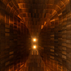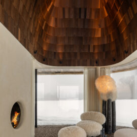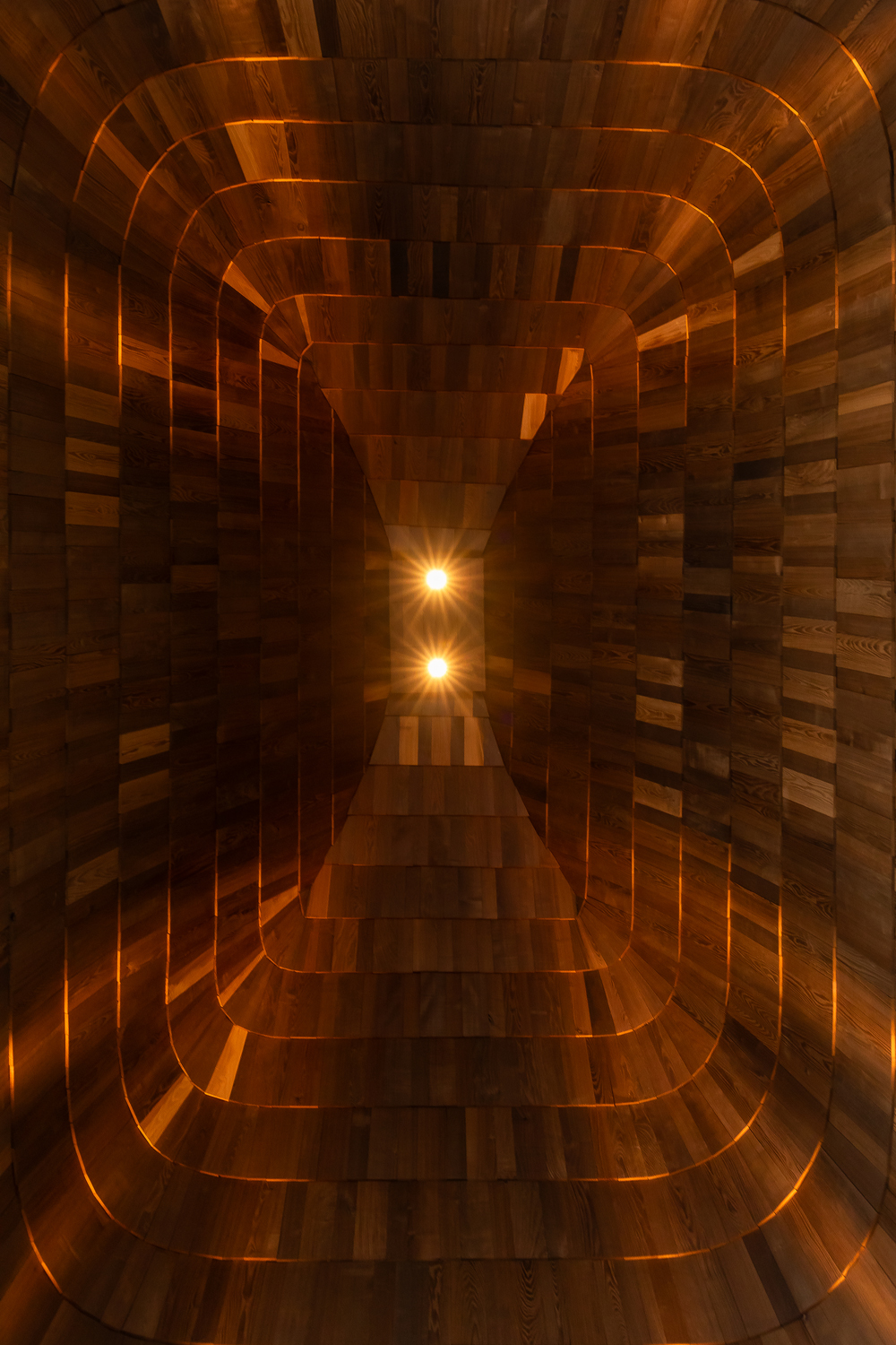 Внутрішній купол даху оздоблений дерев’яною черепицею, що імітує гонт – традиційний матеріал, яким століттями покривали дахи українських хат. Купольна конструкція, висота якої в найвищій точці – 10 метрів, наповнює простір відчуттям легкості та повітря, а також дозволяє повністю приховати інженерні системи, залишивши стіни візуально вільними та недоторканими.