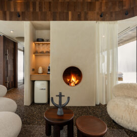 Просторова організація будинку розгортається навколо функціонального «ядра» – центрального блоку з санвузлом, конструкція якого відлита з бетону. По обидва боки від нього розташовані спальня та вітальня. У вітальні інтегровано мінімалістичний камін, який є сучасною алюзією на традиційну українську піч. Відсутність телевізора в будинку – свідоме рішення: споглядання живого вогню через круглий отвір каміну та постійний візуальний контакт із природою сприяють інформаційному детоксу та емоційному відновленню.