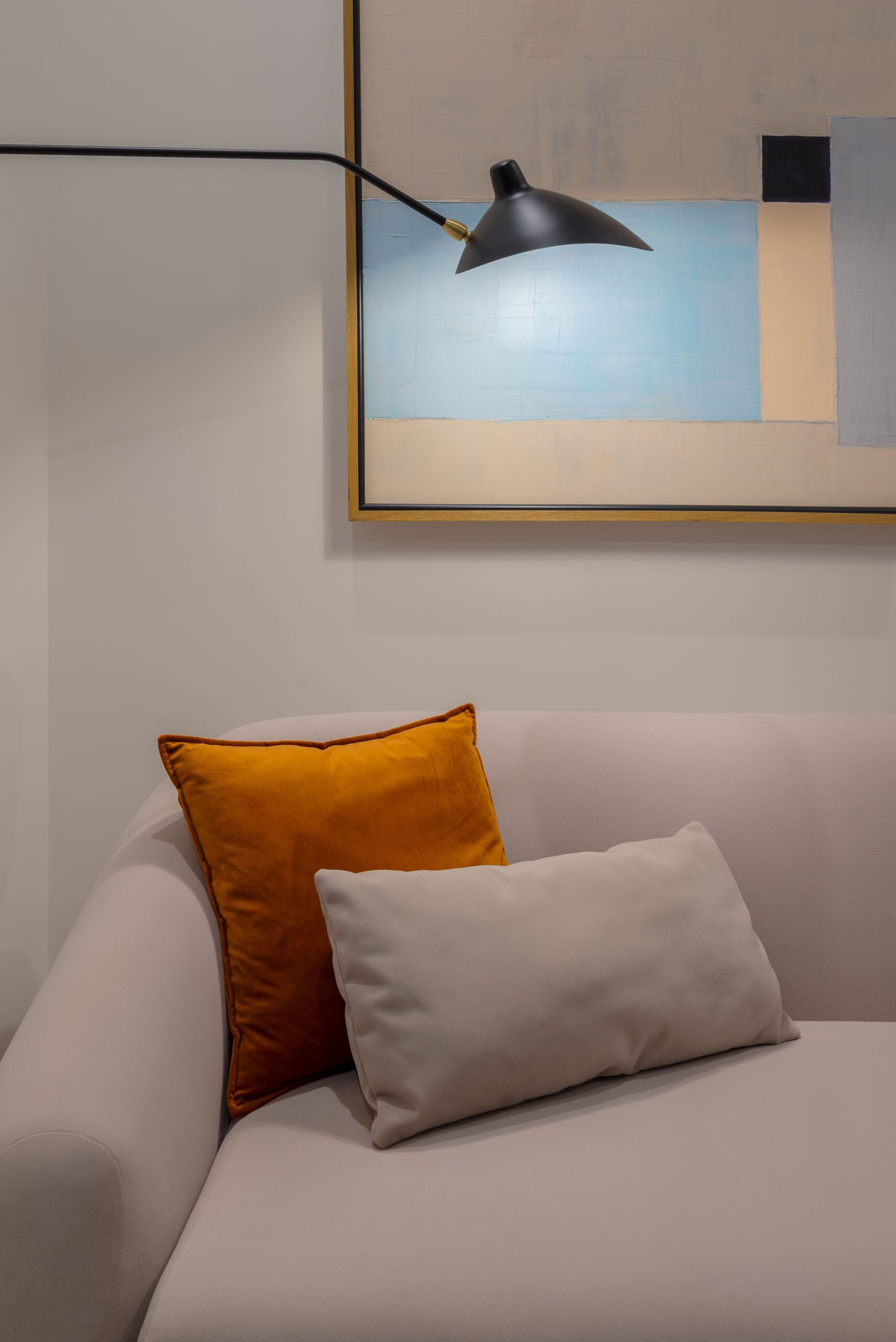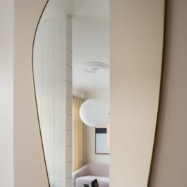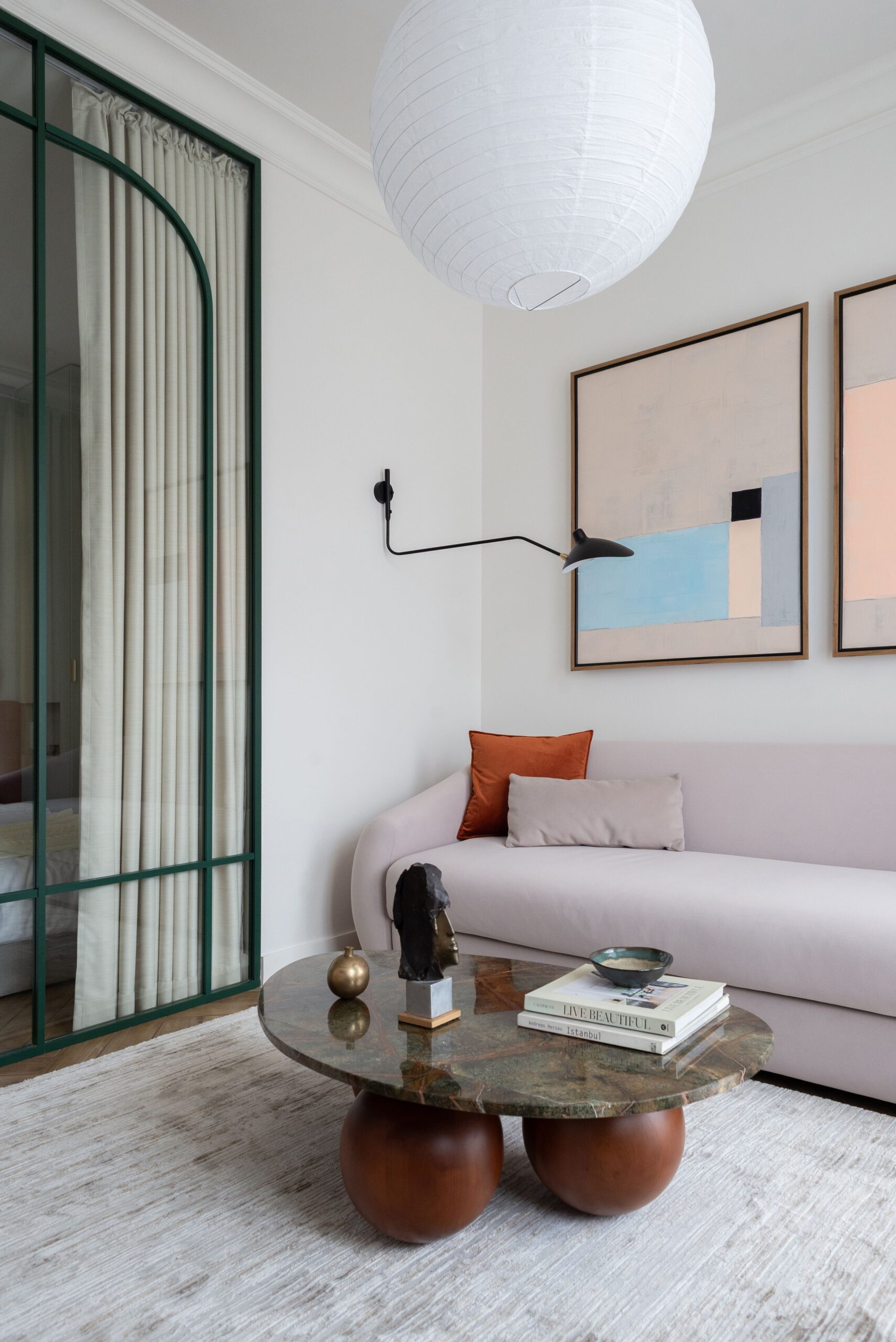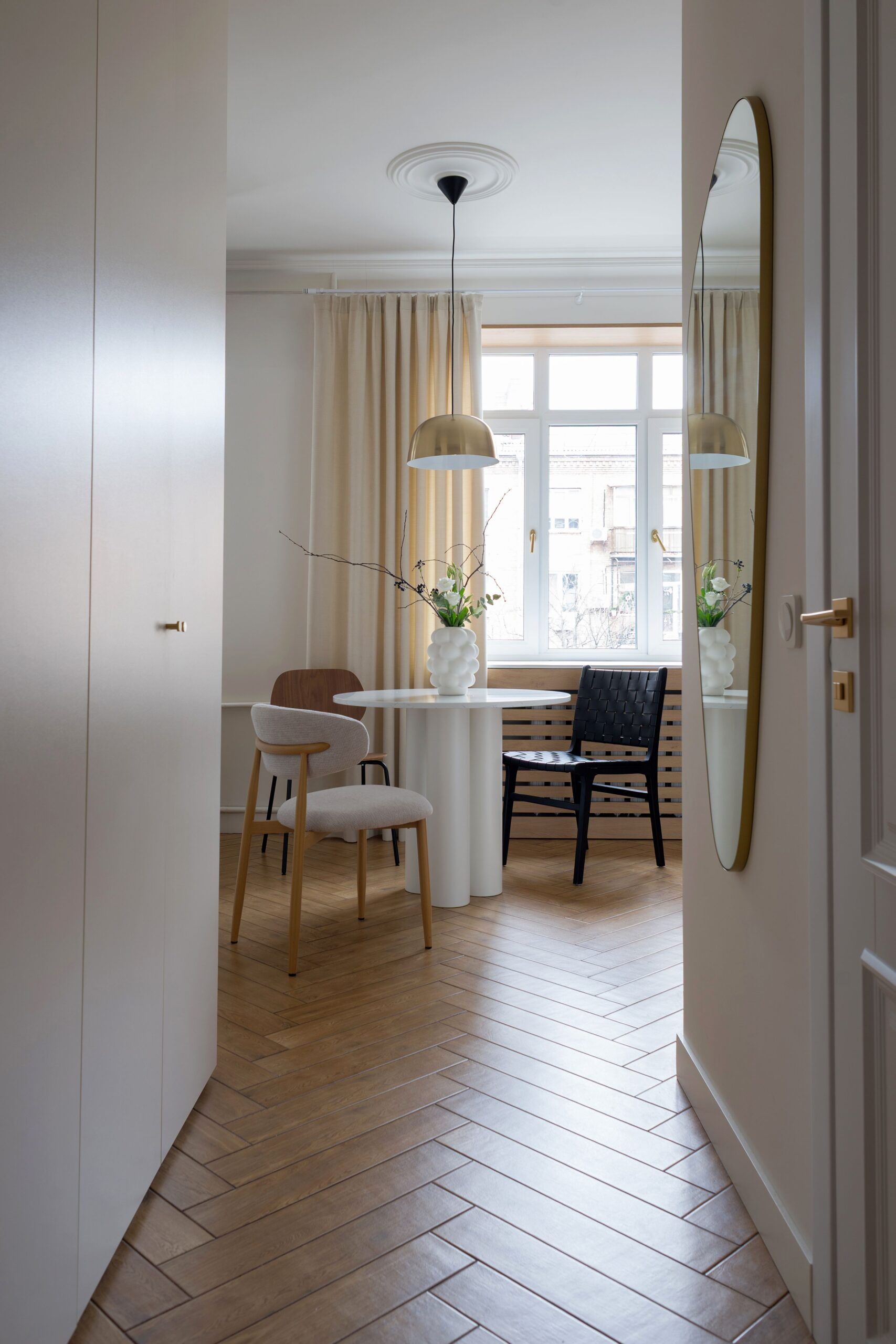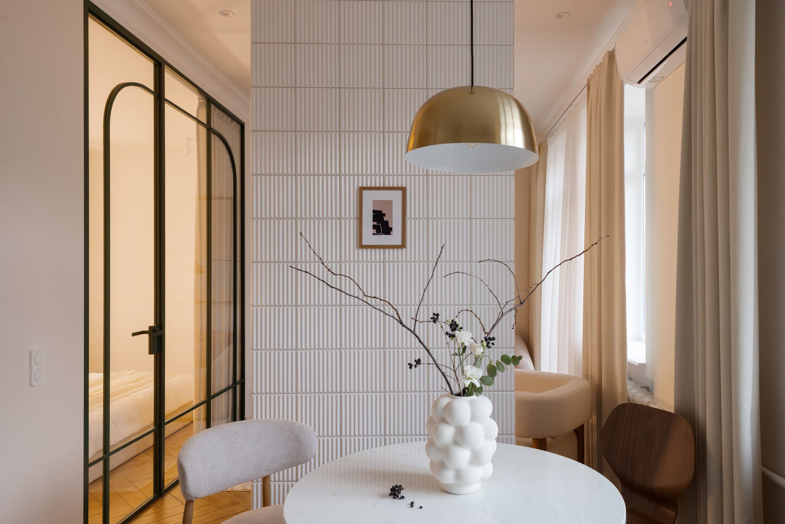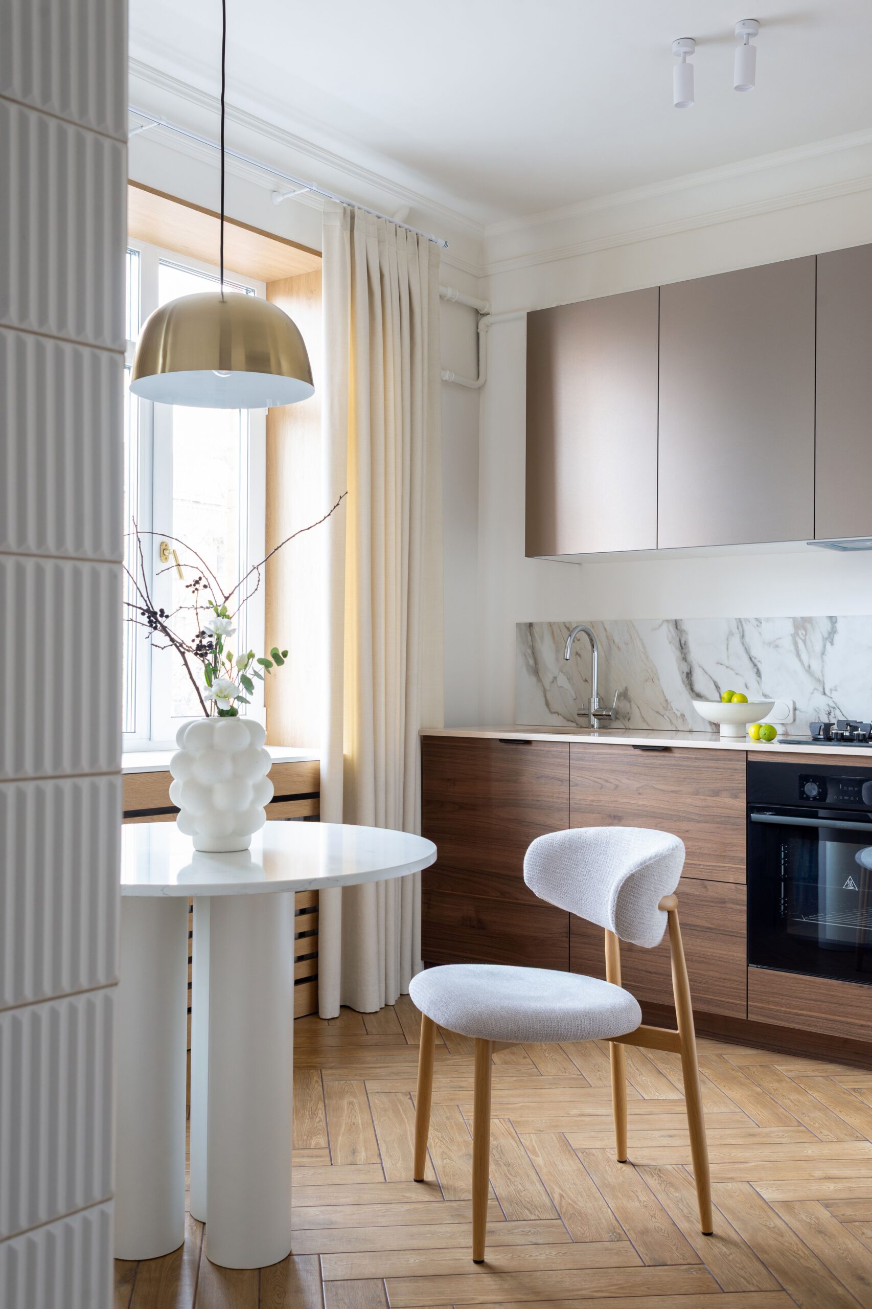 В основі проєкту — баланс між м’якою жилою естетикою та виразними дизайнерськими акцентами. Колір тут стає інструментом зонування та настрою: складні пастельні відтінки поєднуються з насиченими акцентами, створюючи відчуття затишку без візуального перевантаження. Тепле дерево, тактильний текстиль, натуральний камінь і скло працюють як єдина система, формуючи багатошаровий, «живий» простір.