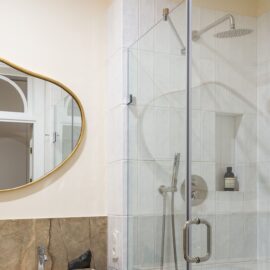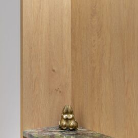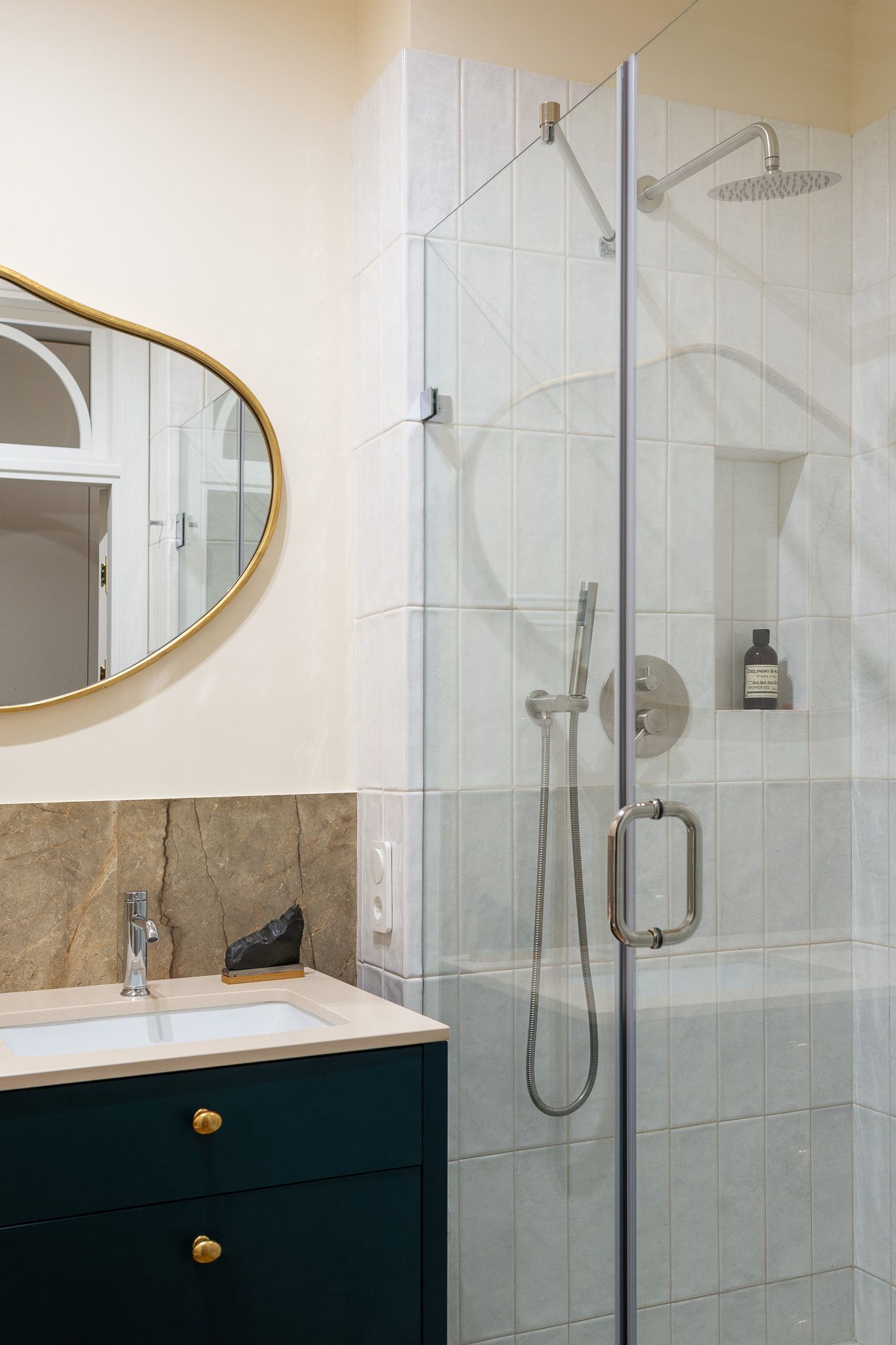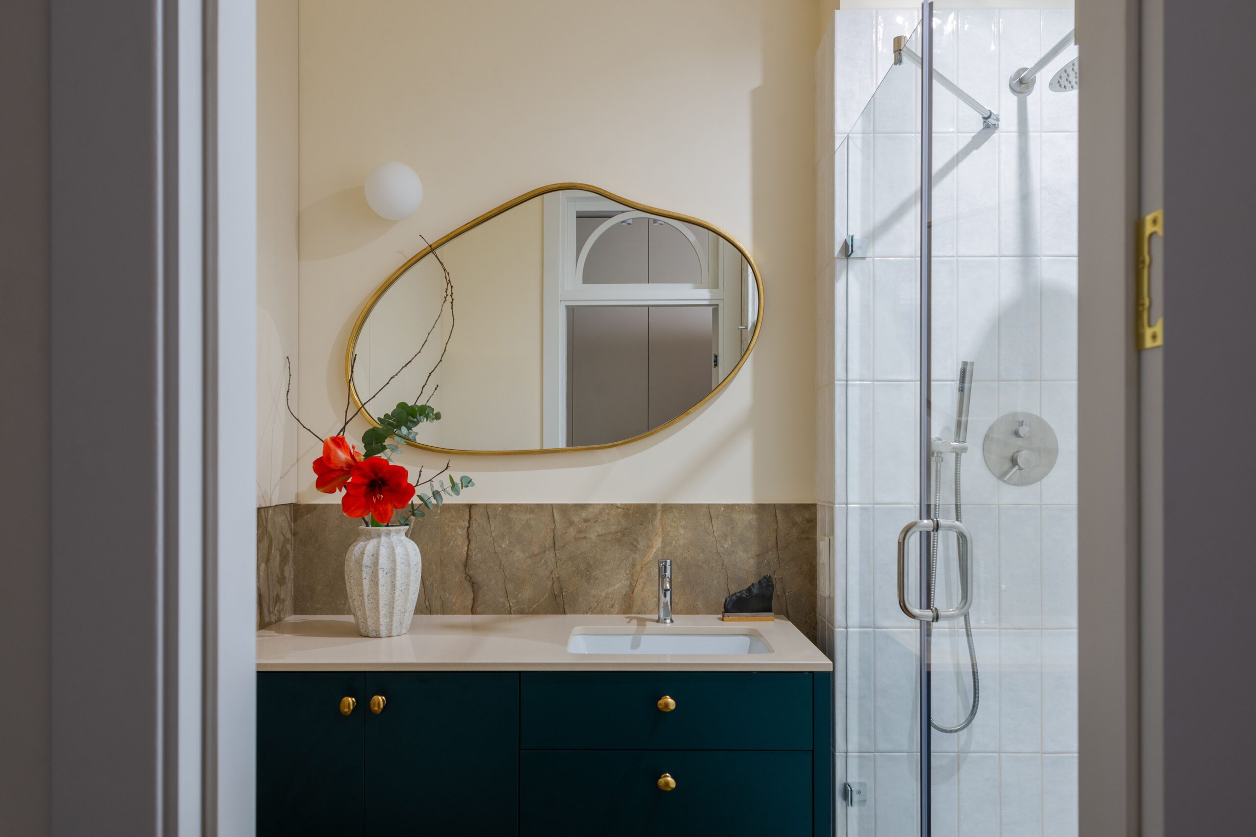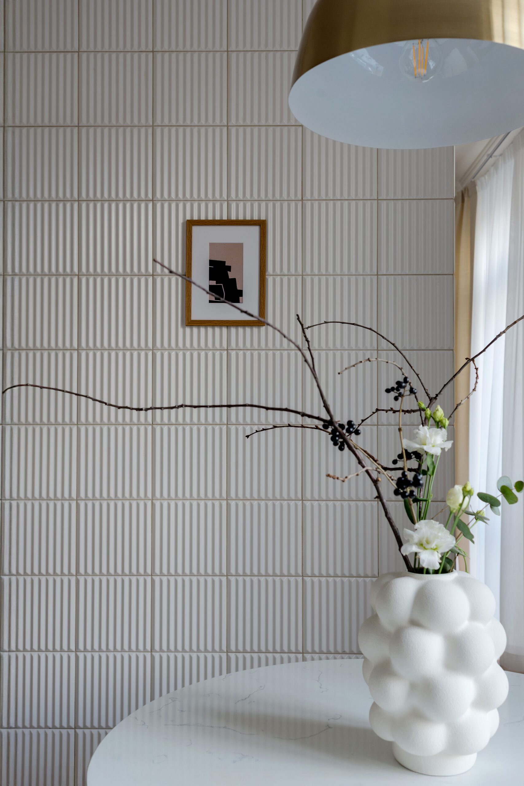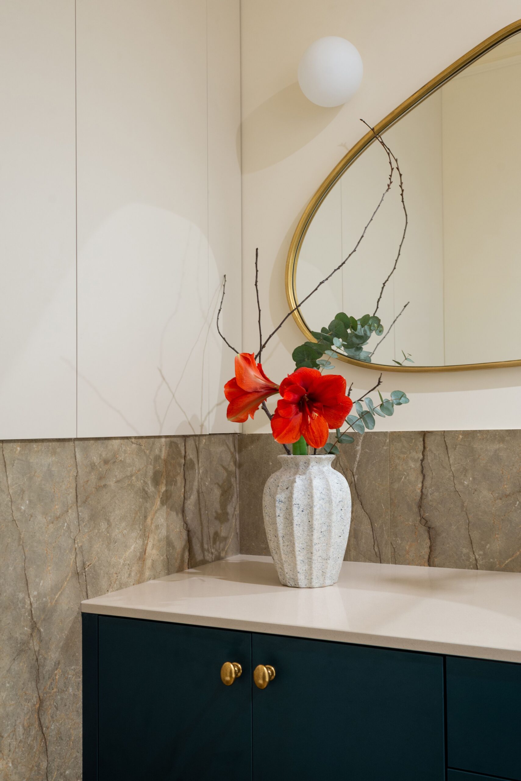В основі проєкту — баланс між м’якою жилою естетикою та виразними дизайнерськими акцентами. Колір тут стає інструментом зонування та настрою: складні пастельні відтінки поєднуються з насиченими акцентами, створюючи відчуття затишку без візуального перевантаження. Тепле дерево, тактильний текстиль, натуральний камінь і скло працюють як єдина система, формуючи багатошаровий, «живий» простір.