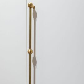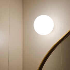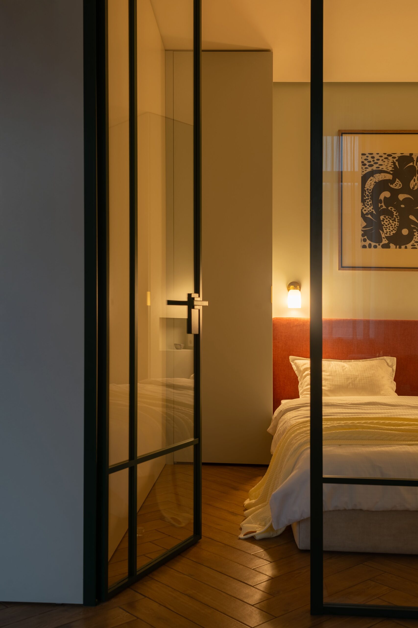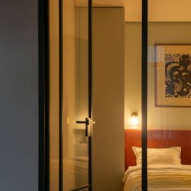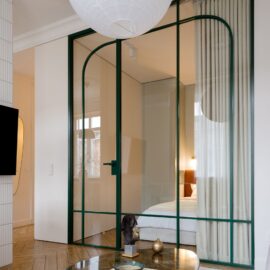 Дизайнерка Євгенія Кузнєцова, яка вже реалізувала для цього замовника три проєкти, отримала повну творчу свободу. Одним із головних викликів стало розроблення планувального рішення, яке дозволило б комфортно жити двом людям у компактному просторі. Скляна перегородка з кольоровим металевим профілем зберігає відчуття повітря й світла, водночас чітко зонує функціональні простори. Таке рішення візуально розширює квартиру та додає інтер’єру архітектурної виразності.