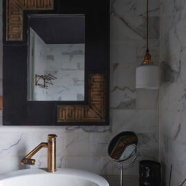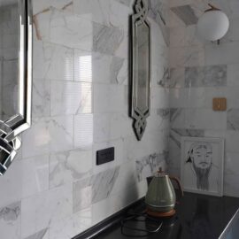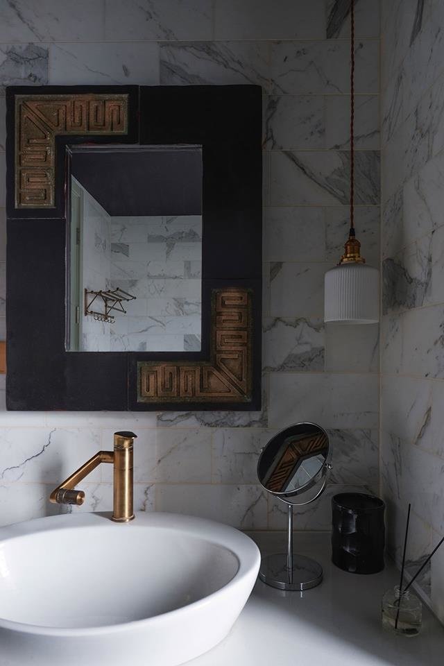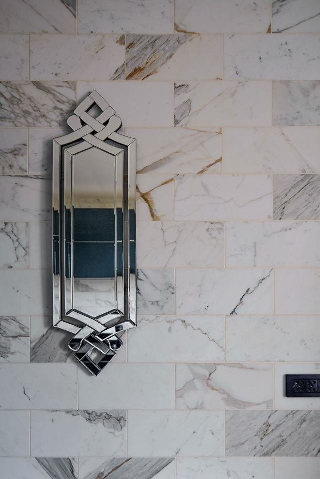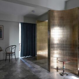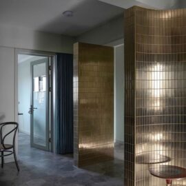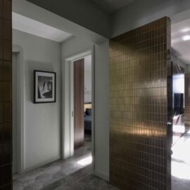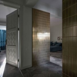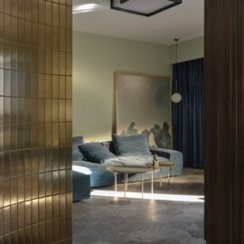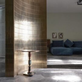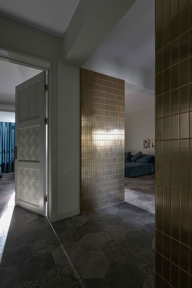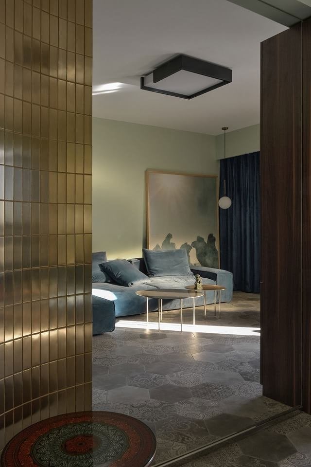 Зеркальные полотна по обеим сторонам – визуально расширяют пространство. Масштабную плоскость стены гостиной фланкируют мощные полуциркульные архитектурные элементы, покрытые такой до боли знакомой плиткой, правда – цвета старого золота.
