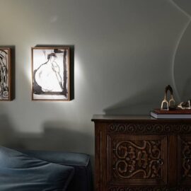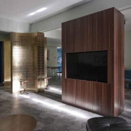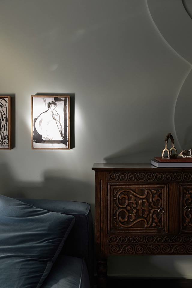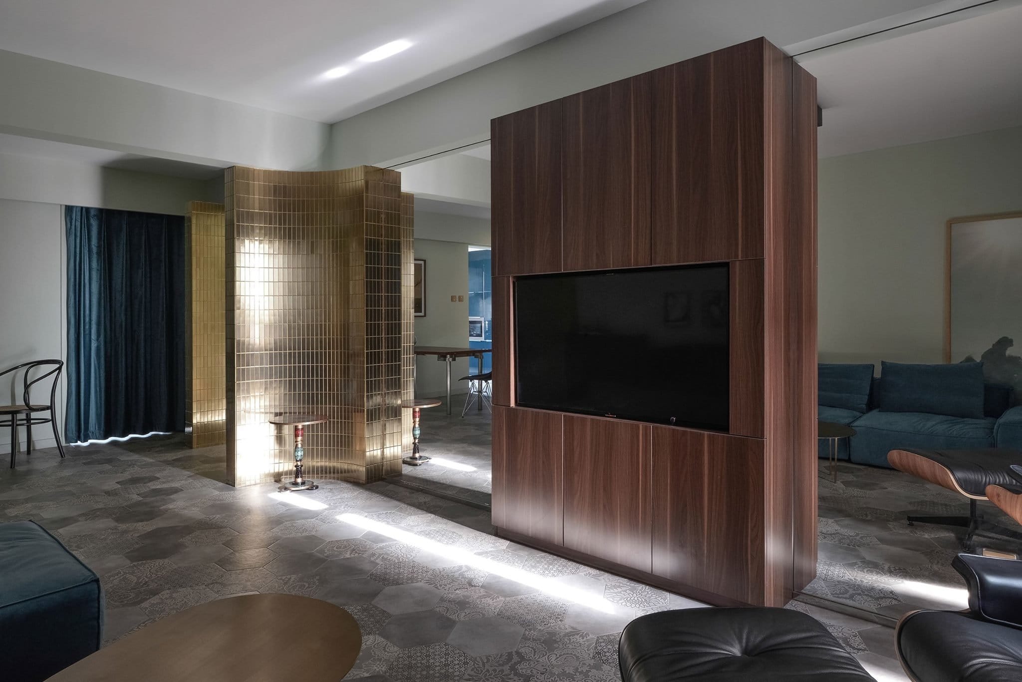 Идею оформления дизайнеры позаимствовали из творчества американского скульптора Ричарда Серра, – владельцы апартаментов являются поклонниками его таланта. Фокальным центром пространства является элегантный объем в деревянных панелях-буазери, оформляющий панель плазмы.