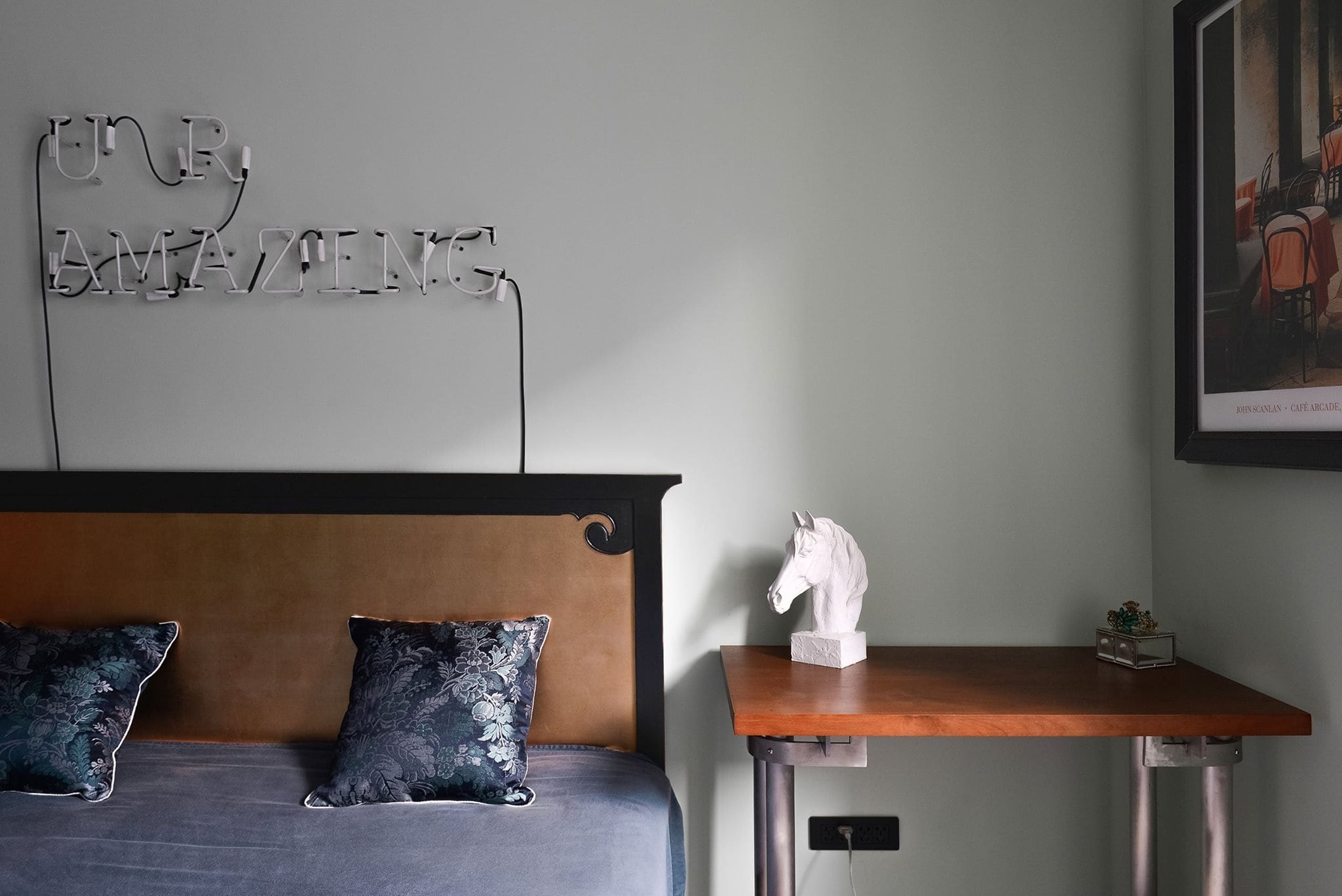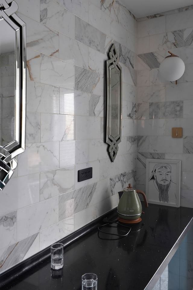 Еще один этнический элемент дизайнеры внесли в декор межкомнатных деверей, украсив их стилизованным традиционным «молоточным» орнаментом – «алхан хээ», некогда украшавшим опорные столбы монгольских юрт. Нашлось в интерьере место и главному монгольскому герою всех времен: скромный графический портрет Чингисхана притаился в кухне.