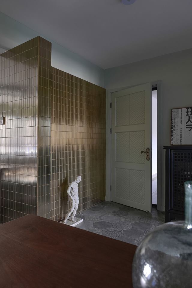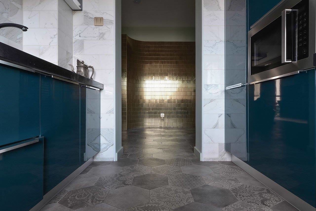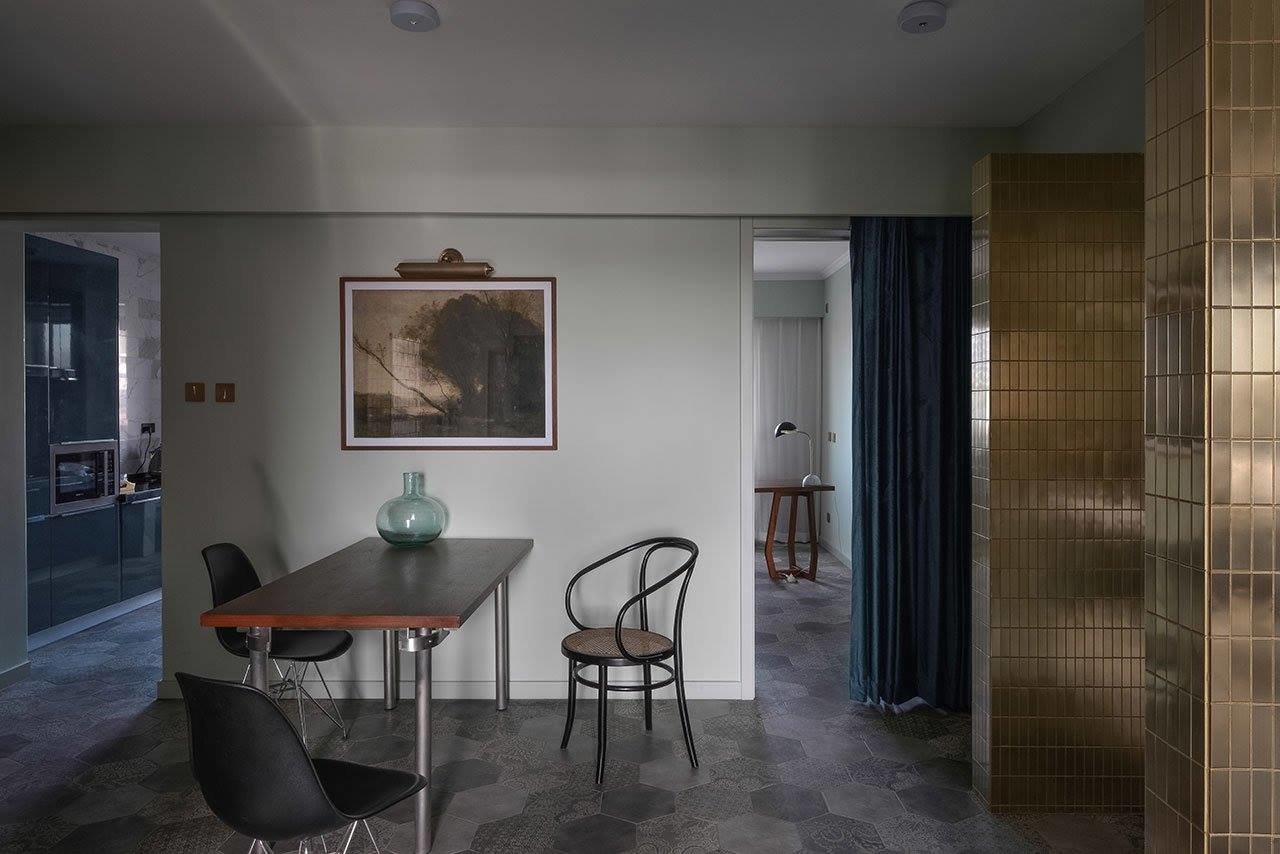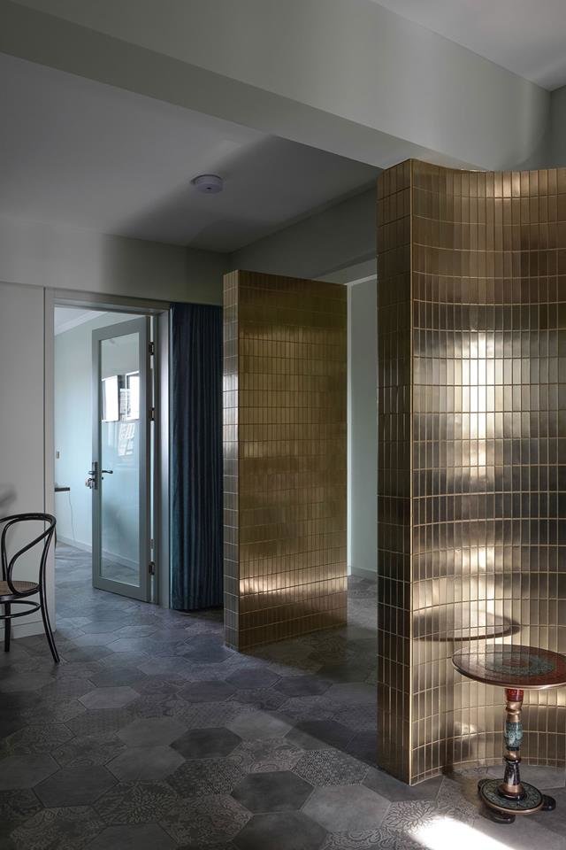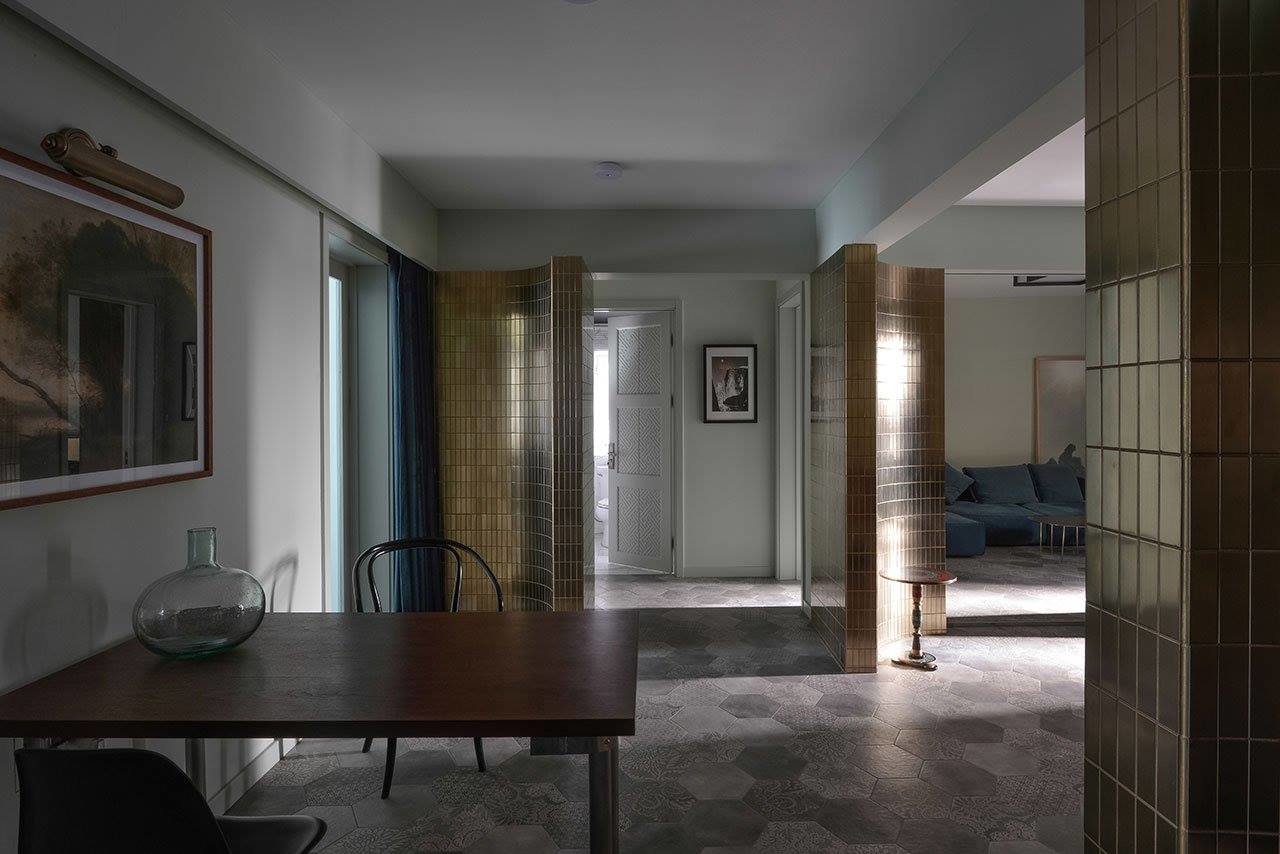 Просматриваемые из разных зон квартиры, они воспринимаются по-разному: в транзитном пространстве полукружья из сияющей плитки выглядят так же торжественно и благородно, как апсиды средневековых базилик. А выходящие в зону столовой пилонообразные объемы придают ей ощущение модернистской свежести.