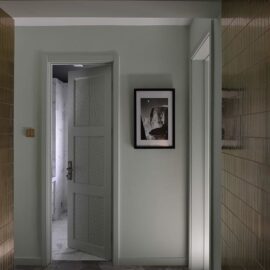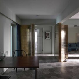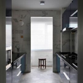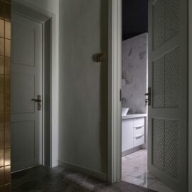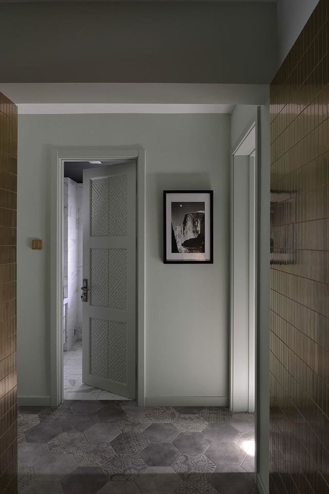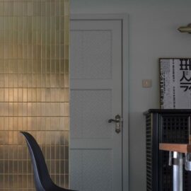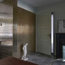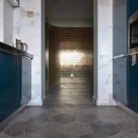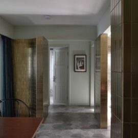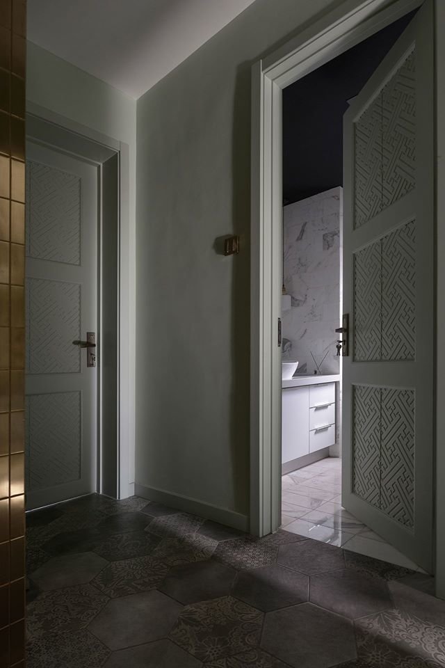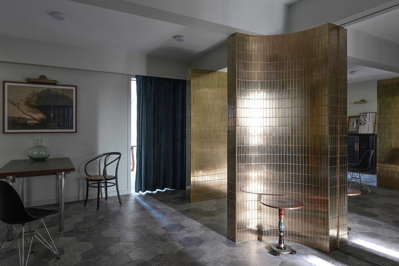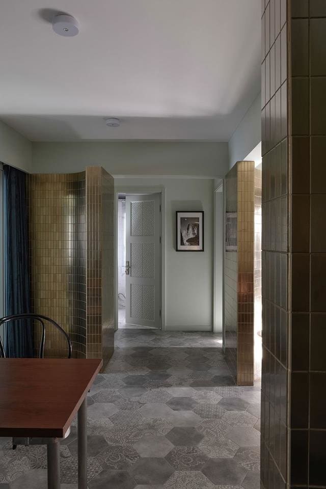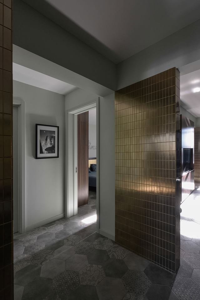 Просматриваемые из разных зон квартиры, они воспринимаются по-разному: в транзитном пространстве полукружья из сияющей плитки выглядят так же торжественно и благородно, как апсиды средневековых базилик. А выходящие в зону столовой пилонообразные объемы придают ей ощущение модернистской свежести.