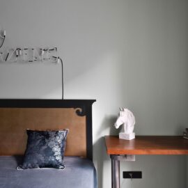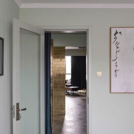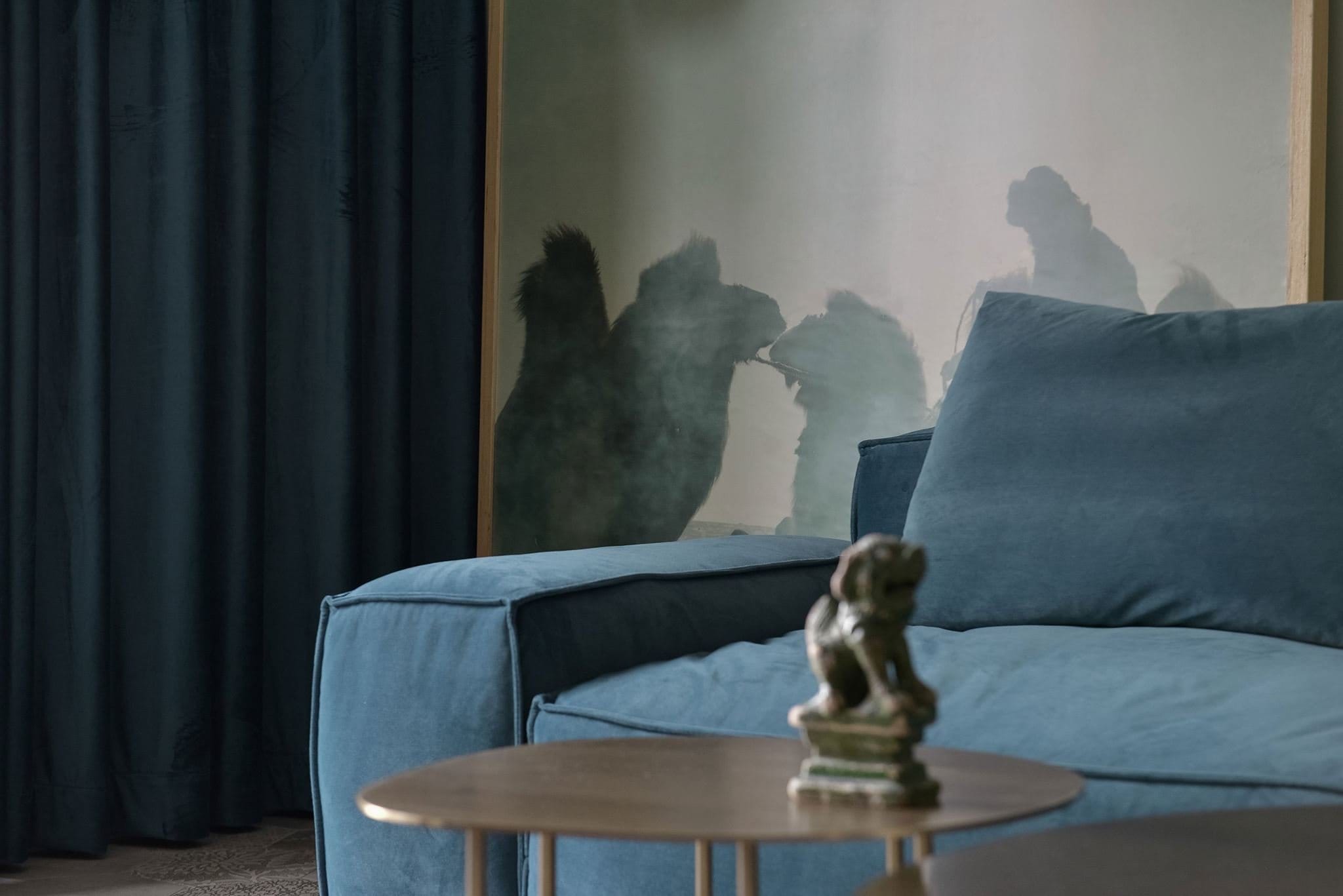 Спокойная прохладная цветовая гамма интерьера дополнена мощными всплесками синего цвета, занимающего особое место в традиционной монгольской культуре – синим поблескивают лакированные панели кухни, к ним в тон подобраны текстильные элементы и обивка большого уютного углового дивана в гостиной.