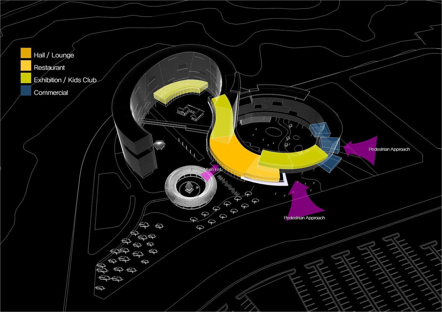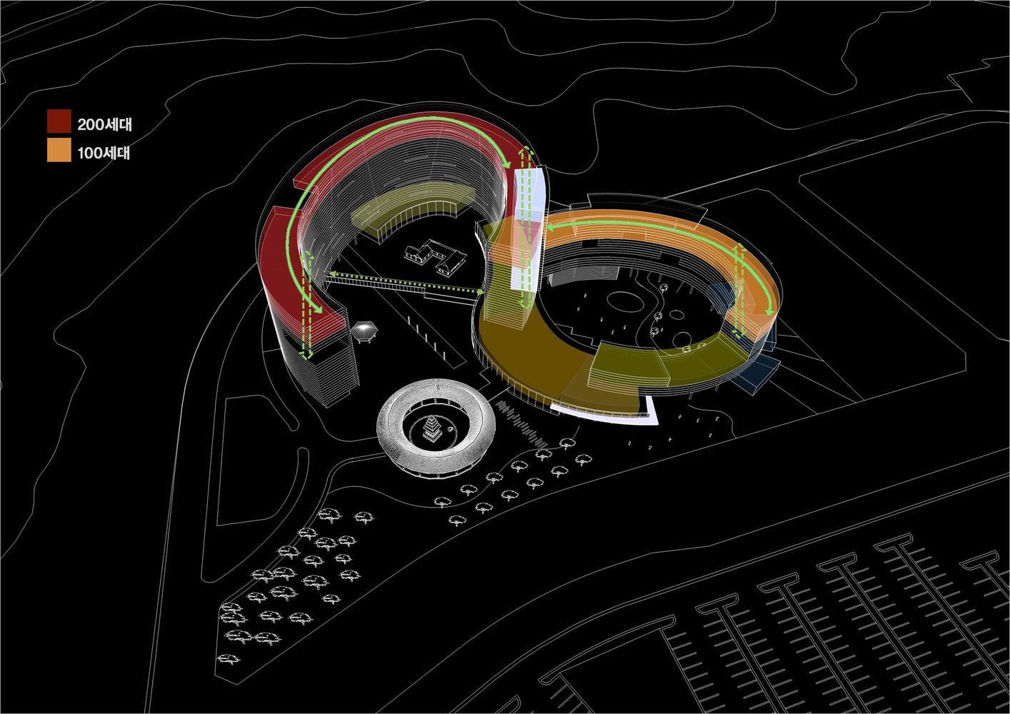 Дизайнеры стремились создать новый архитектурный язык, использовав хорошо зарекомендовавшие себя приемы и элементы исторических строений. KYWC Architects сориентировали жилые апартаменты на юг и юго-запад, а в двух внутренних дворах, выходящих на северную сторону, создали сад с галереями в национальном корейском стиле. Во дворе первого блока появился небольшой квадратный конференц-павильон, а во втором – несколько маленьких кафе, ресторан и даже мини-аквапарк.
