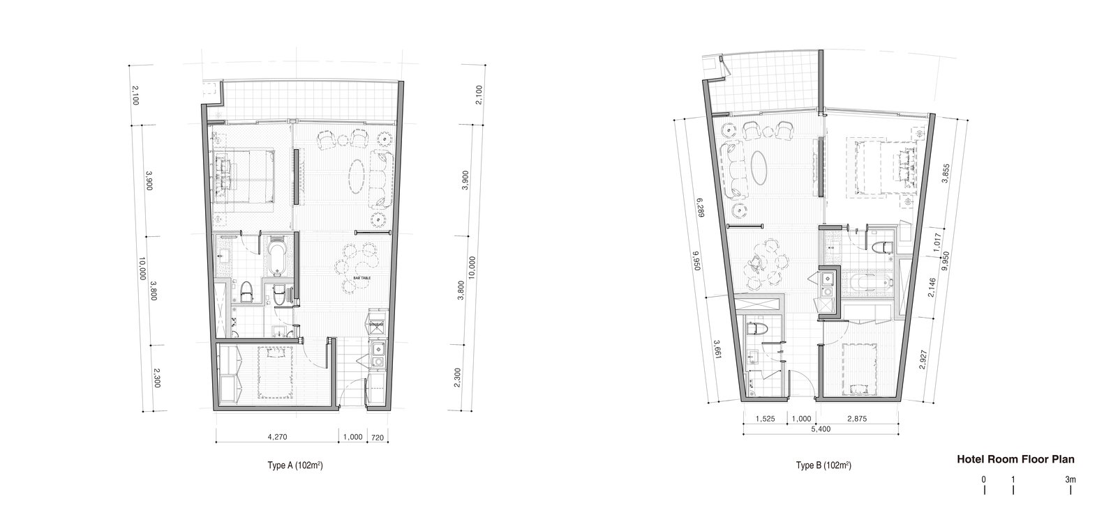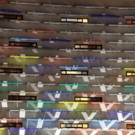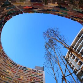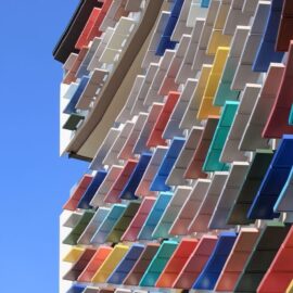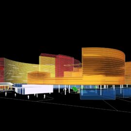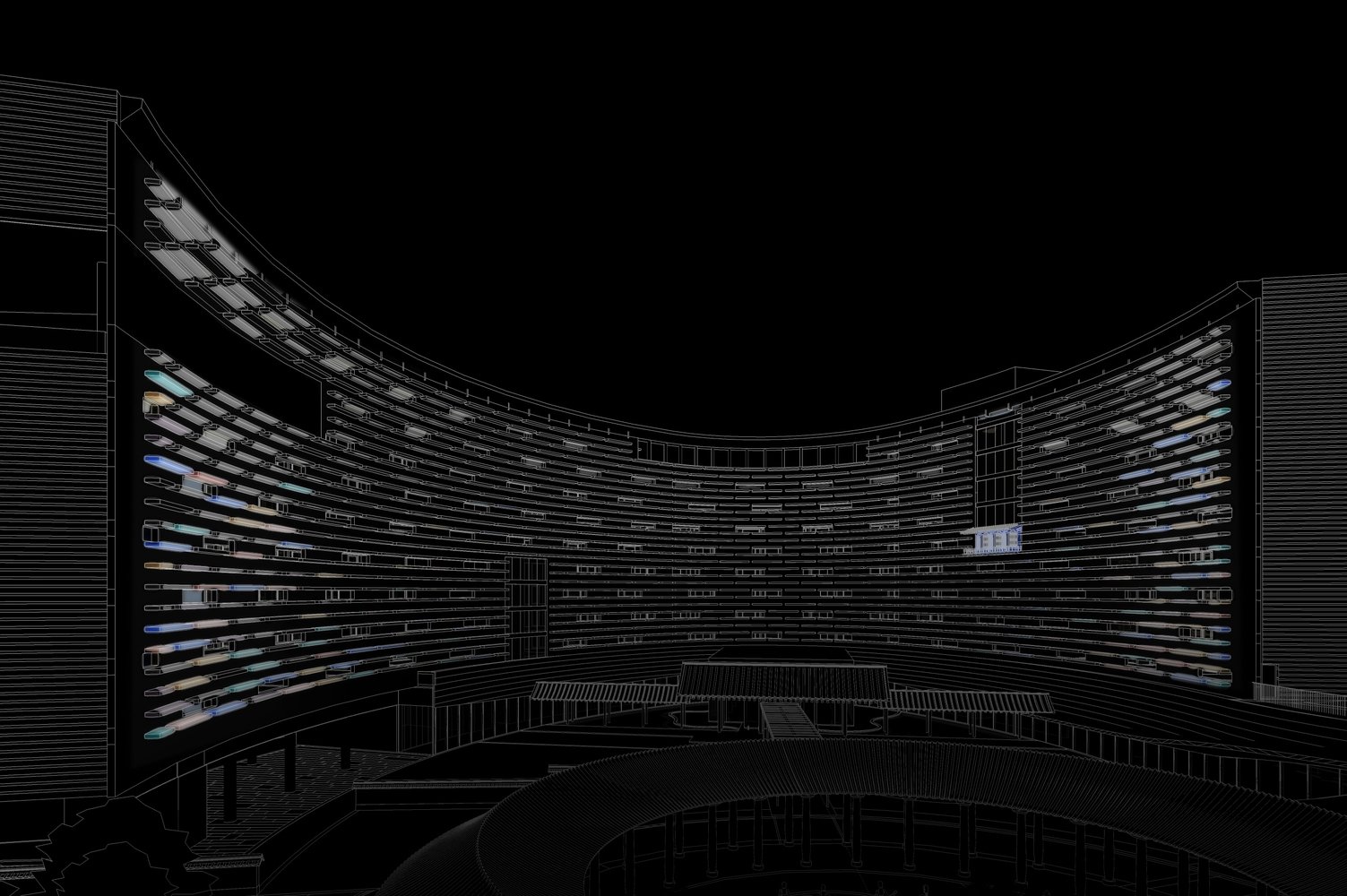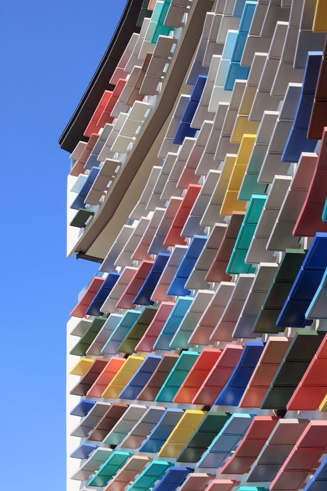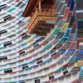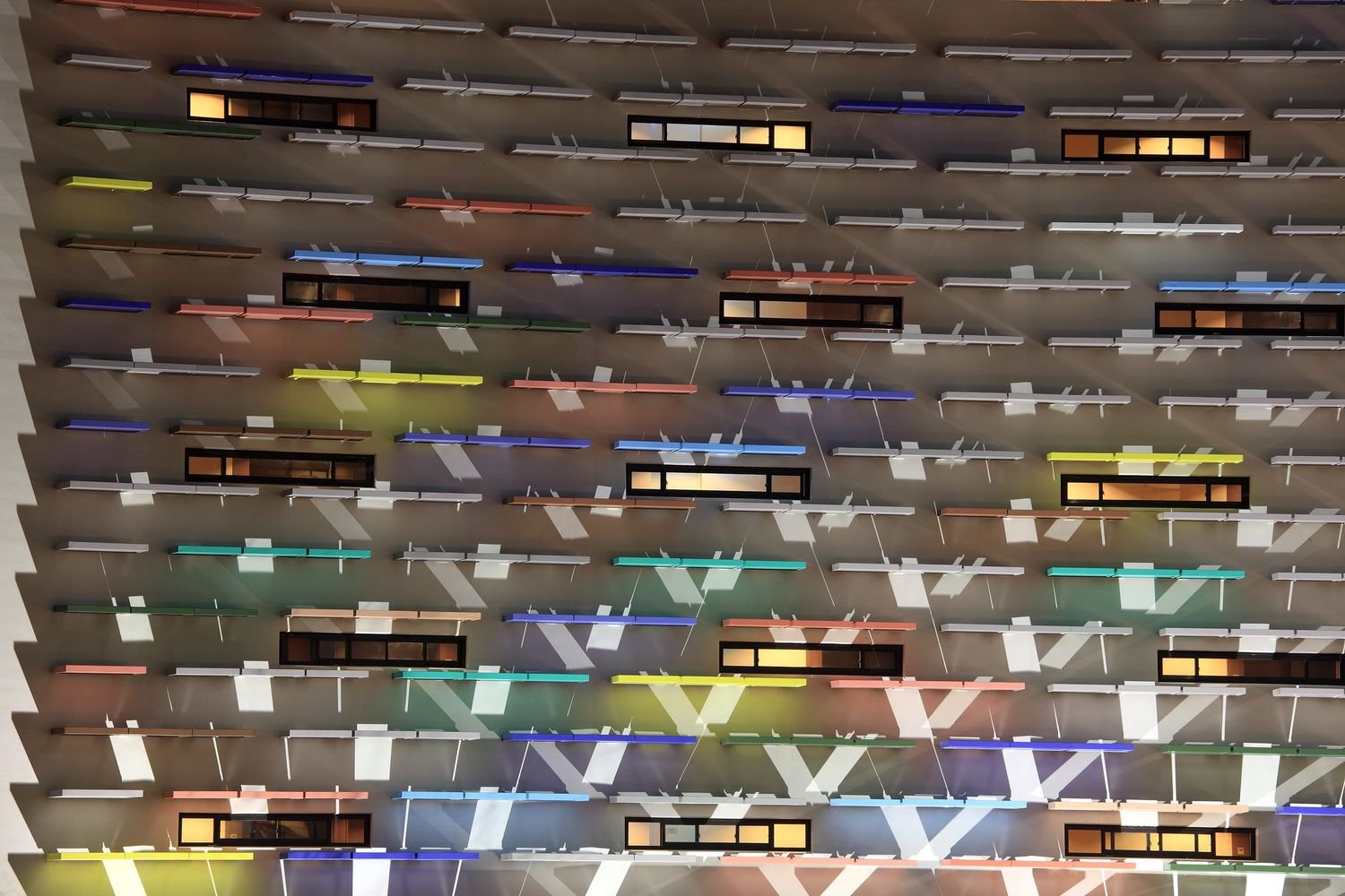 В основе самой конструкций зданий лежит жесткий железобетонный каркас из колонн и перекрытий. На первом этаже находятся фойе и публичные пространства. Остальные уровни занимают жилые апартаменты. Доступ к ним обеспечивают длинные подковообразные коридоры, протянутые вдоль внутренних фасадов зданий. Такое их расположение и организация длинных узких фасадных окон решает проблему естественного освещения и вентиляции в транзитных зонах. Более того, этот прием позволил архитекторам создать визуально глухие фасады с акцентами в виде разноцветных консолей, создающих ритмический ряд и играющих роль цветовых акцентов в архитектурной композиции комплекса.
