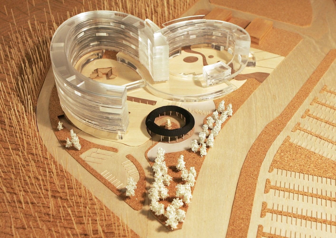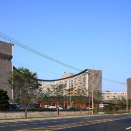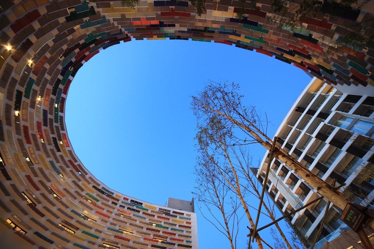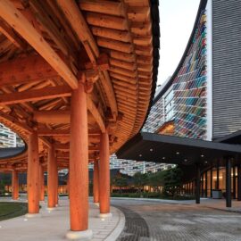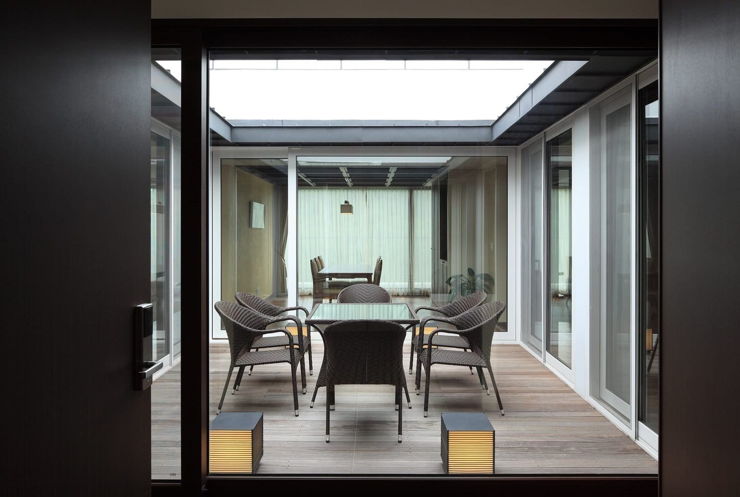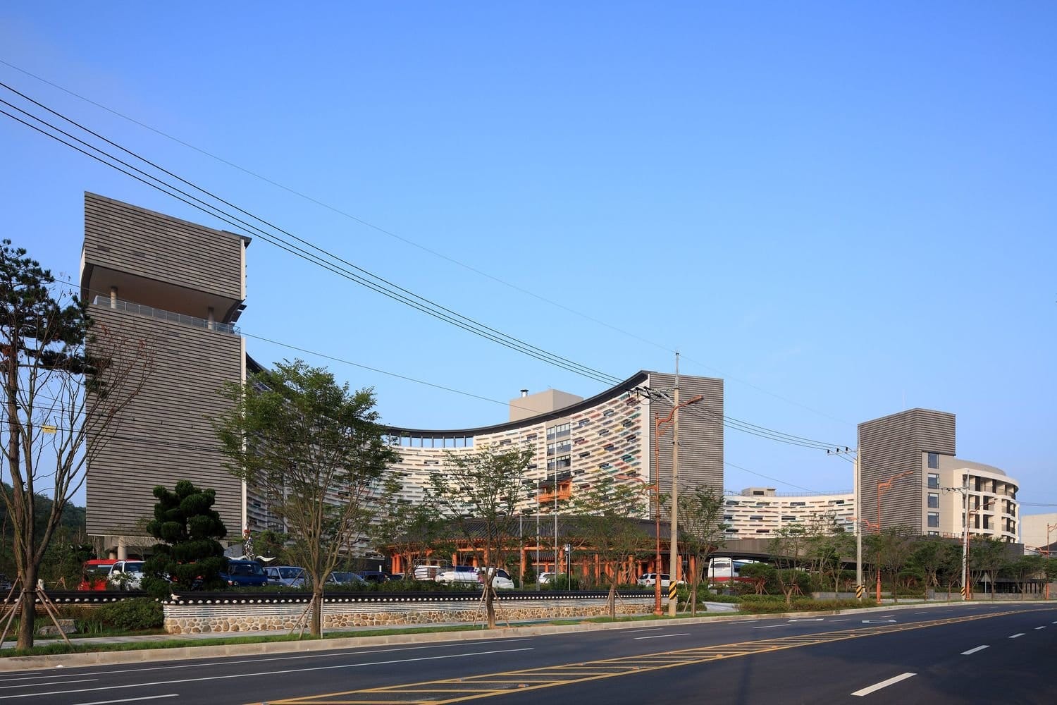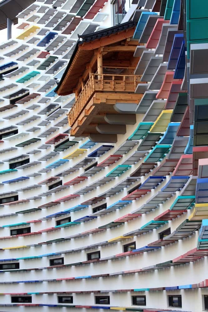 Еще одной интересной деталью является общий балкон, выполненный в традициях южнокорейского деревянного зодчества. Внешние же фасады комплекса весьма лаконичны.