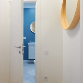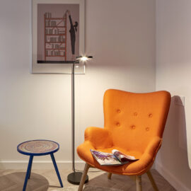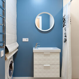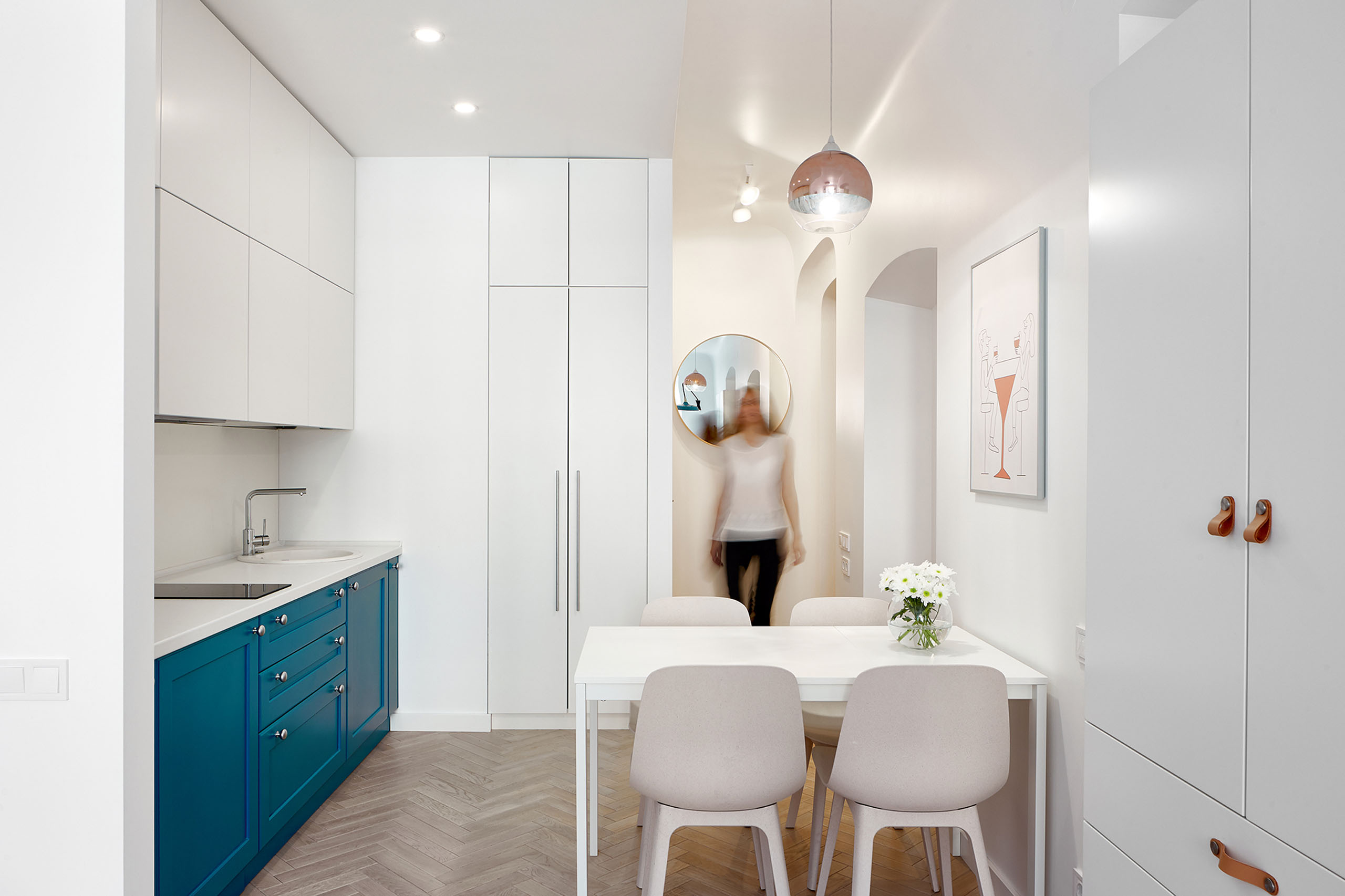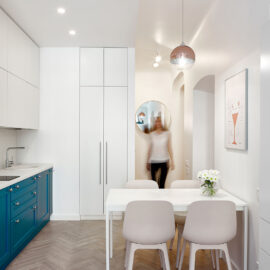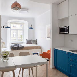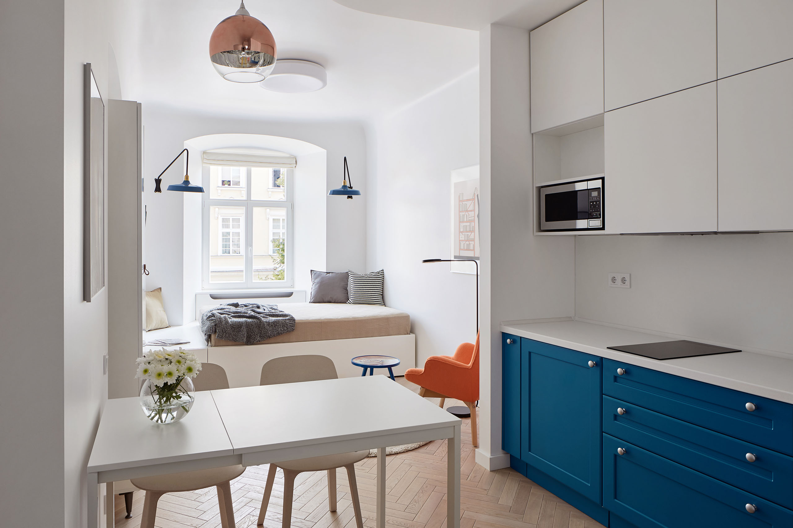 На 27 кв. м поместилось все необходимое — кухня, столовая, спальное место, санузел с душевой кабиной и стиральной машиной. Поскольку габариты помещений крайне компактны, то практически всю мебель пришлось изготовить под заказ. Кровать с дополнительной выдвижной частью установили прямо под окном. Таким образом, удалось оптимально использовать площадь, а чтобы интерьер не выглядел выхолощенным и излишне аскетичным, добавили яркие цветные акценты: нижнюю часть кухни выкрасили синим, а в углу поставили ярко-оранжевое кресло.