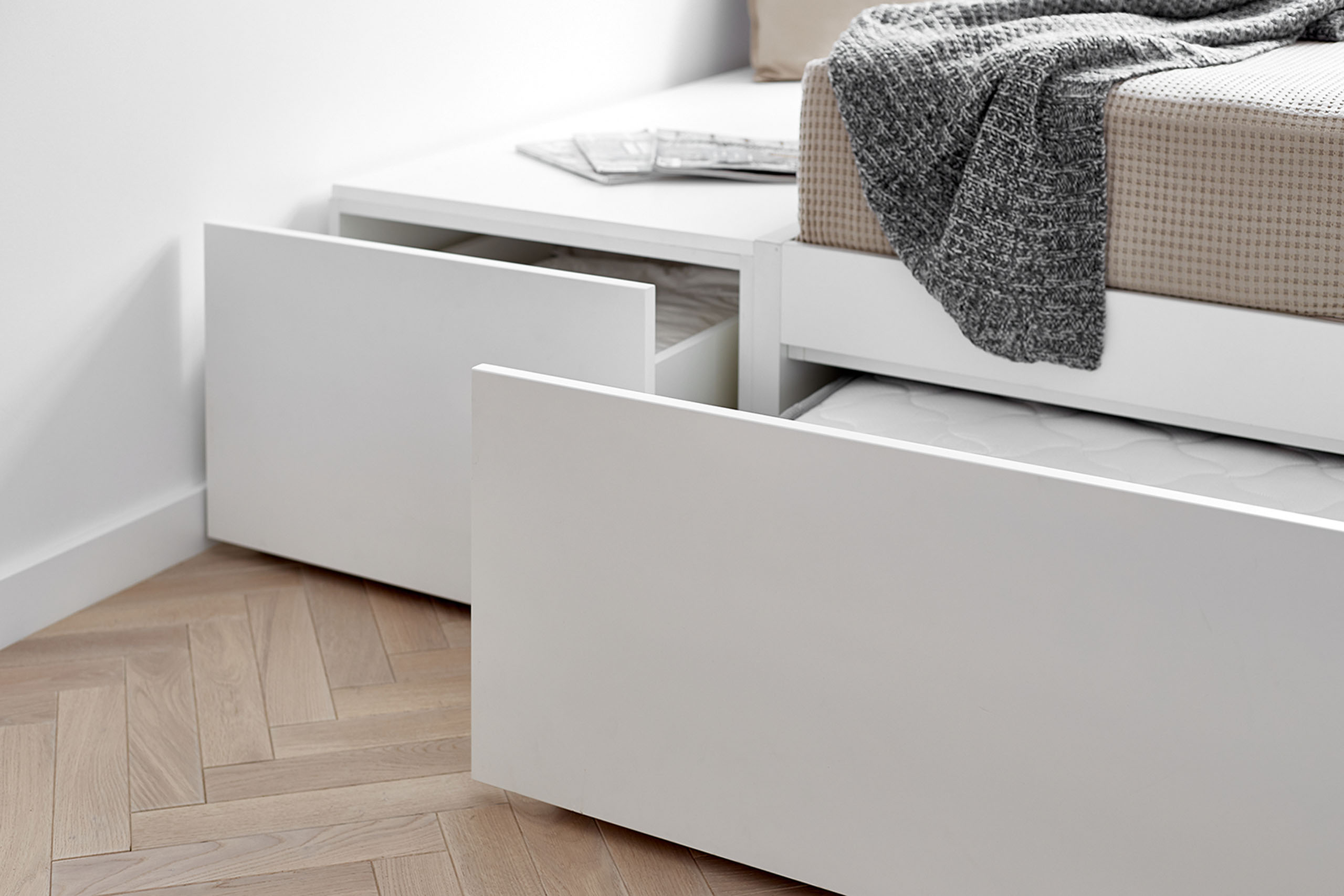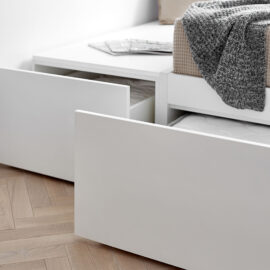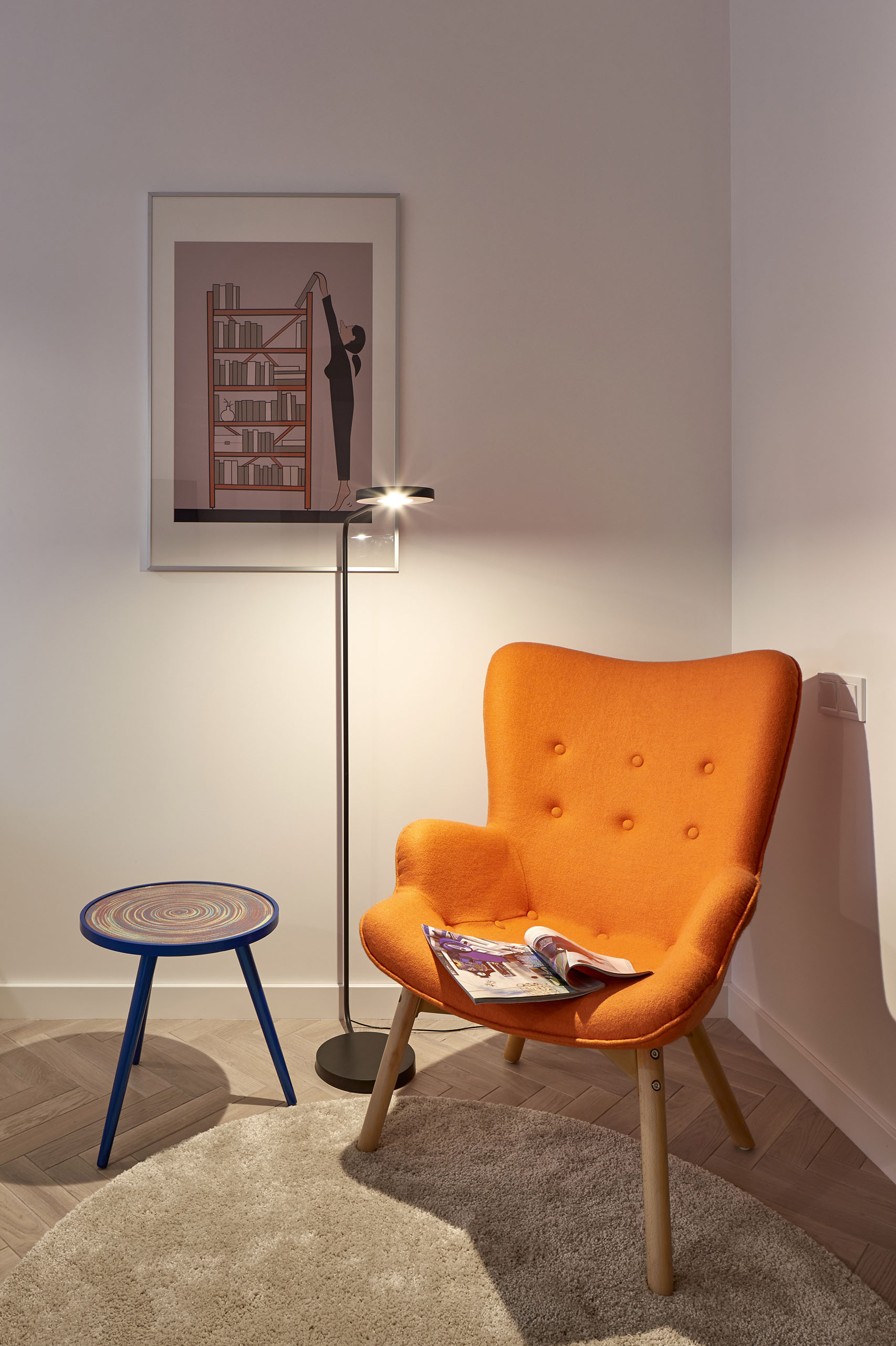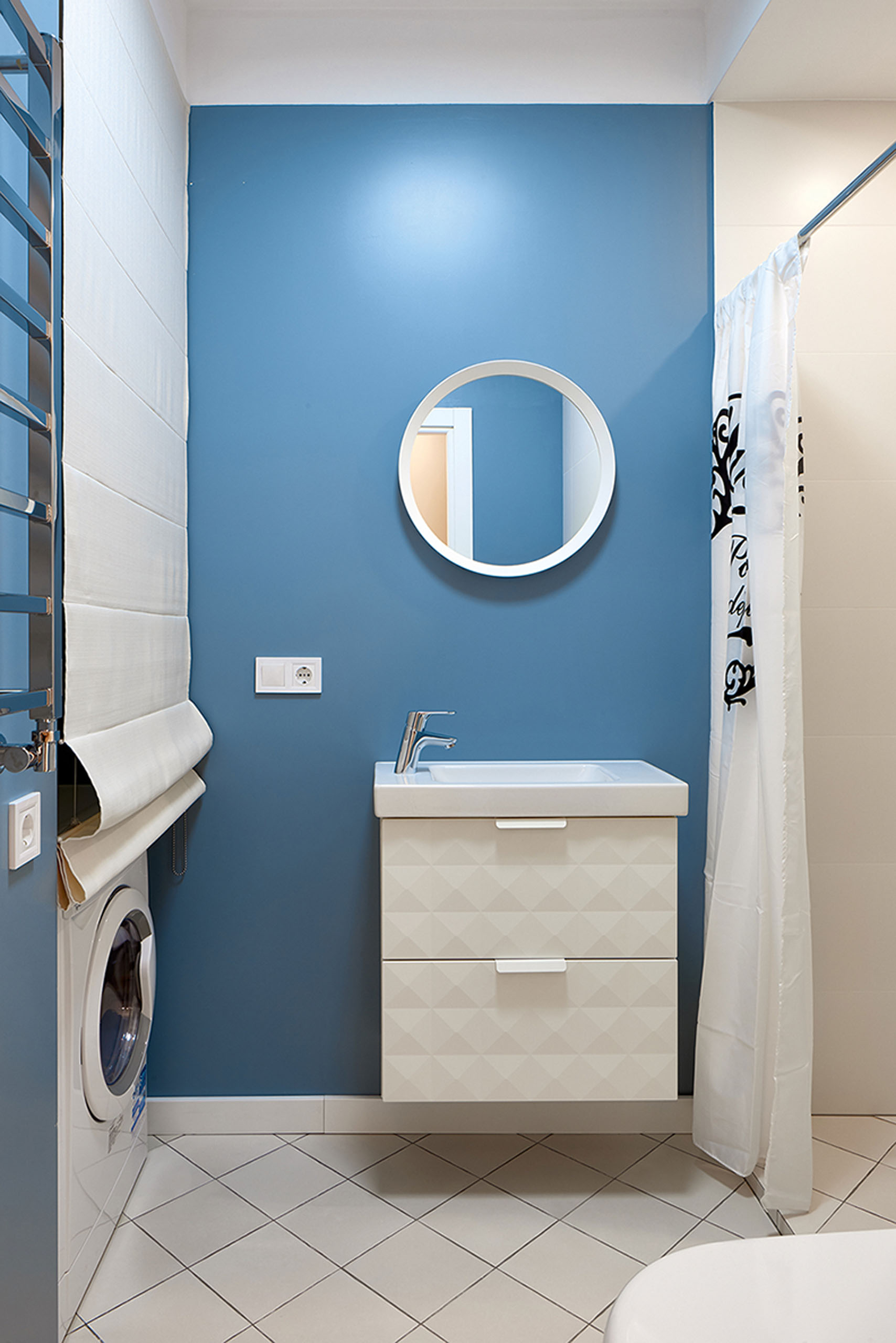 На 27 кв. м поместилось все необходимое — кухня, столовая, спальное место, санузел с душевой кабиной и стиральной машиной. Поскольку габариты помещений крайне компактны, то практически всю мебель пришлось изготовить под заказ. Кровать с дополнительной выдвижной частью установили прямо под окном. Таким образом, удалось оптимально использовать площадь, а чтобы интерьер не выглядел выхолощенным и излишне аскетичным, добавили яркие цветные акценты: нижнюю часть кухни выкрасили синим, а в углу поставили ярко-оранжевое кресло.