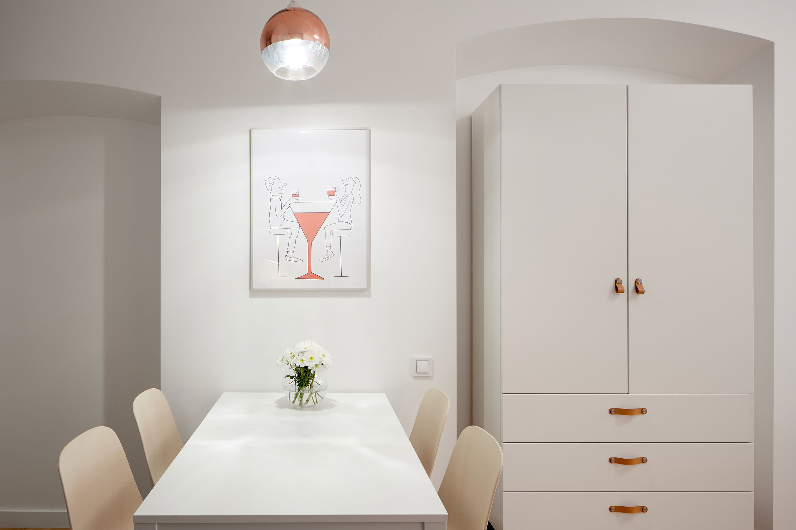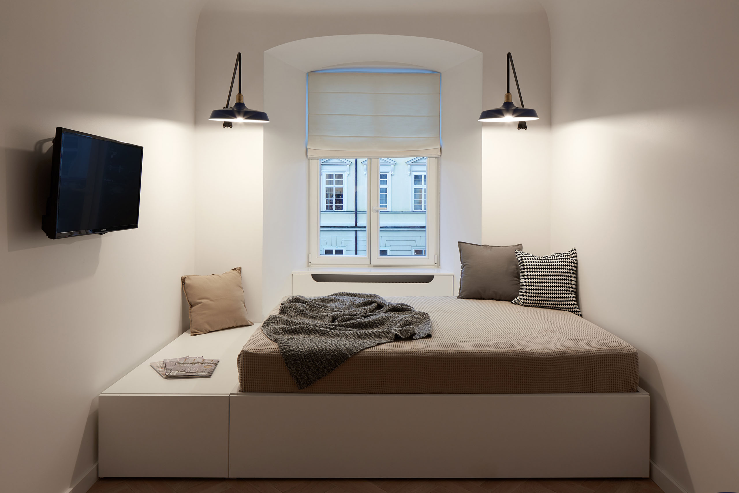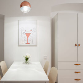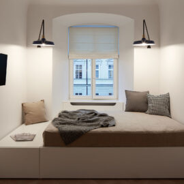 Владельцы планировали сдавать квартиру в аренду и обратились за помощью к дизайнеру Елене Трофименко для создания легкого адаптивного пространства, которое сохранило бы всю романтику старой части Львова. «Следы прежних ремонтов, хаотично организованные помещения, разваливающаяся старая печь с тянущимся через всю комнату аж до кухни дымоходом — все это вызывало ощущение беспорядка и полного отчаяния. Но, как дизайнер, ты всегда видишь потенциал пространства. А тут у него была своя весьма ощутимая пластика: в арках, в изгибах на стыке потолка и стен, в потертом дубовом паркете, а главное — в роскошном виде из окна на Ратушу», — рассказывает автор проекта.