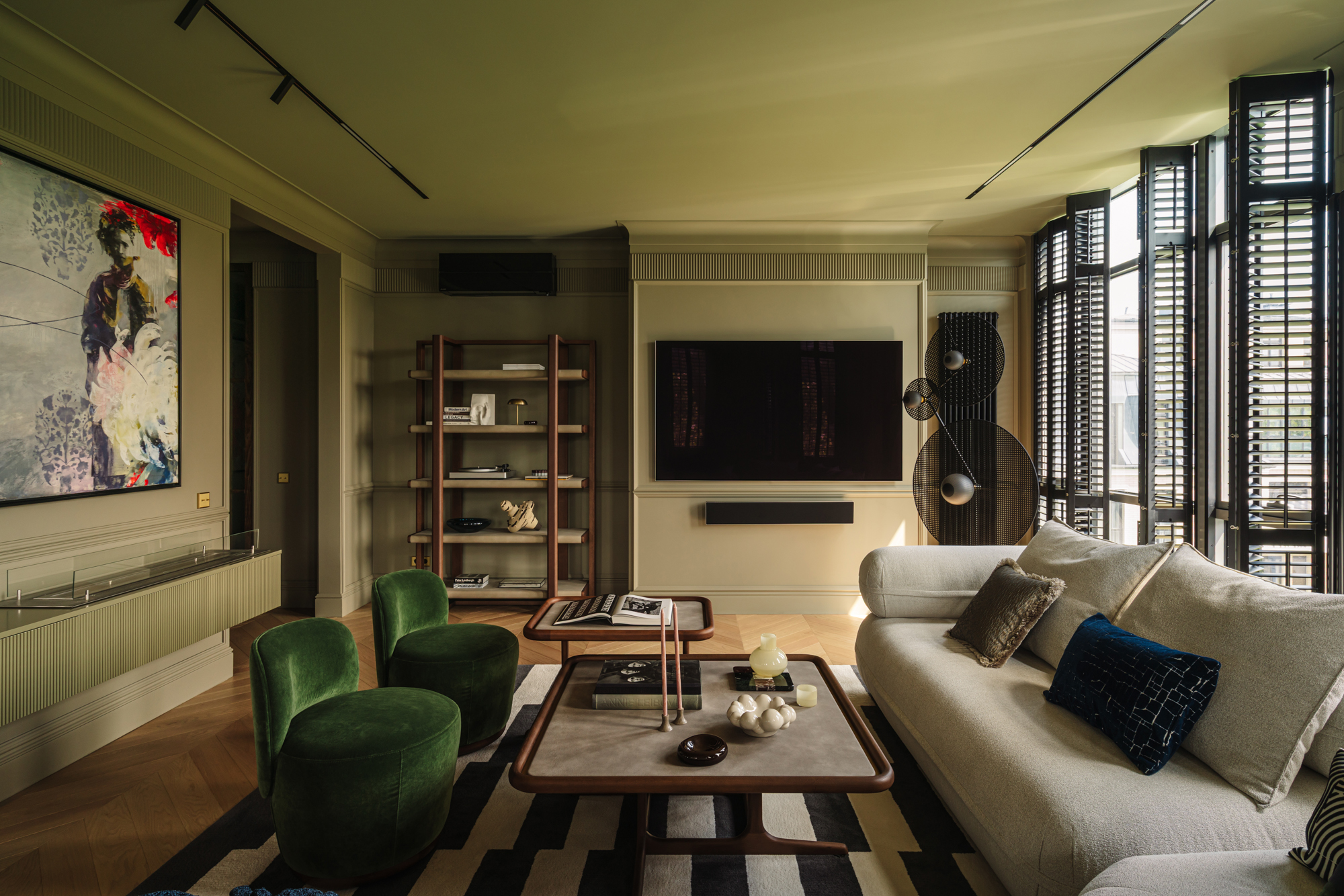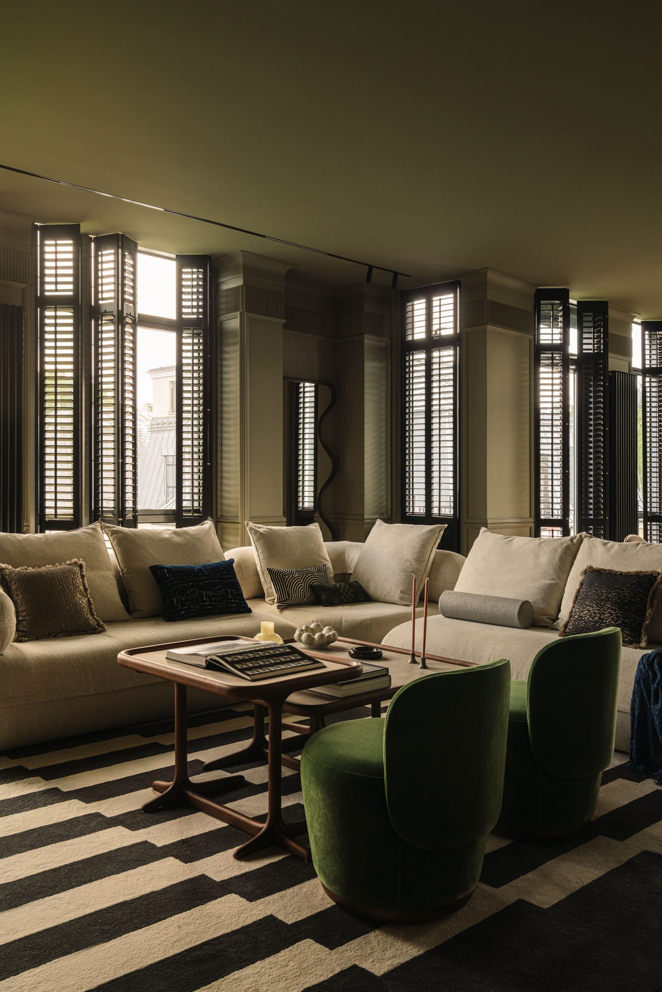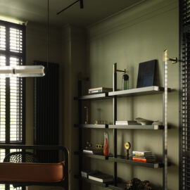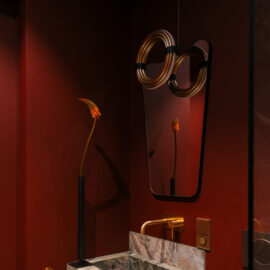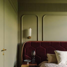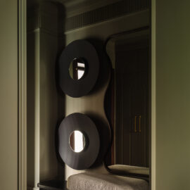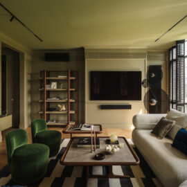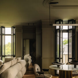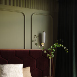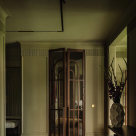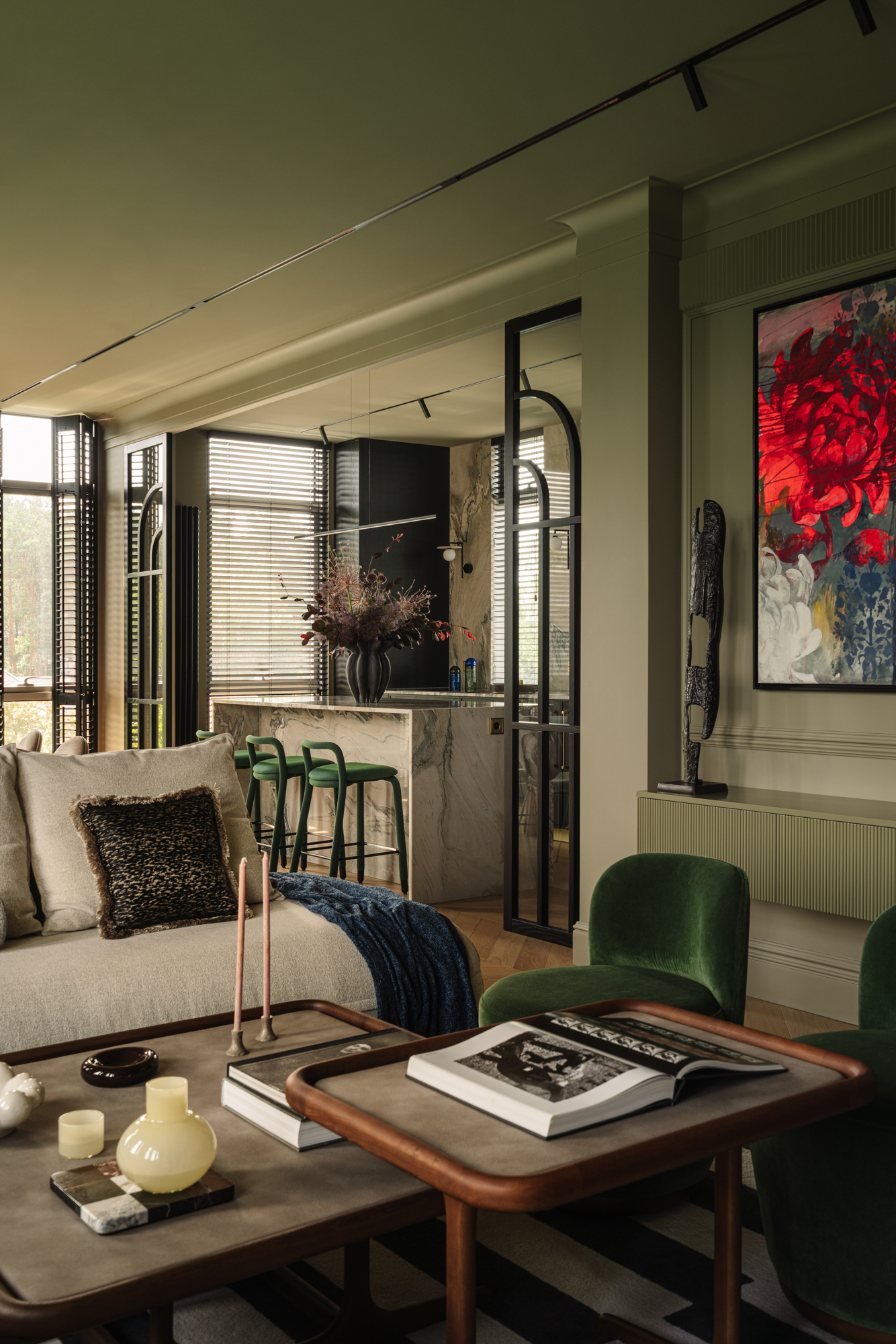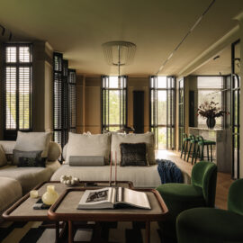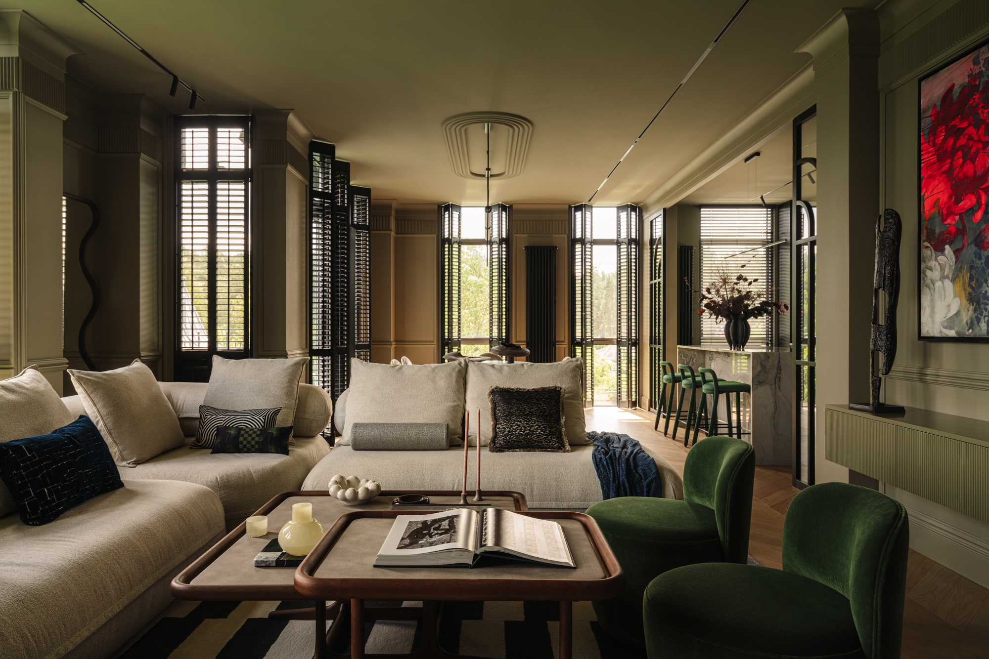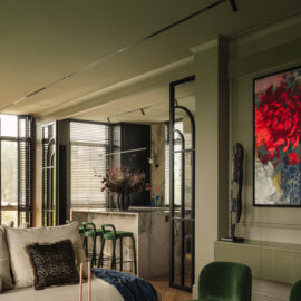 Так народився інтер’єр, наповнений гедонізмом. В оздобленні переважають глибокі земляні відтінки, що створюють відчуття інтимності та сучасної елегантності. Яскраві кольори з’являються виключно у мистецьких акцентах. У меблях, оздобленні стін, підлоги та вбудованих елементах переважають природні, спокійні тони: глибокий хакі, насичений темно-зелений, чорний, а також приглушені відтінки синього та зеленого.