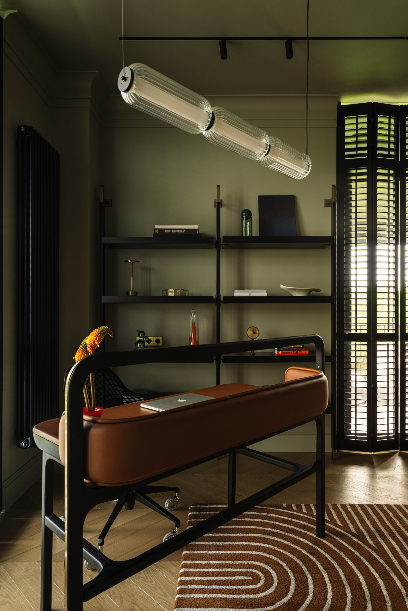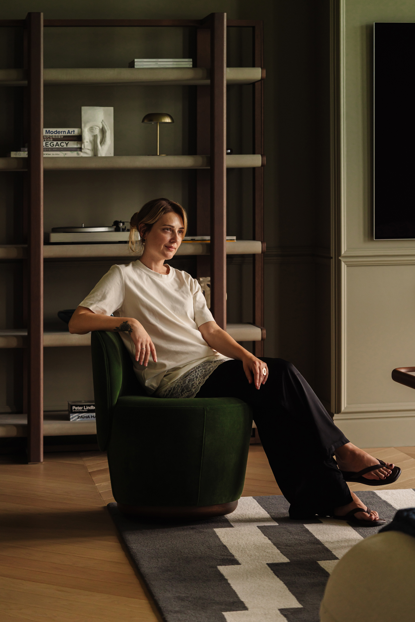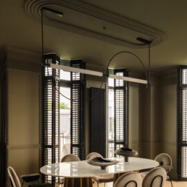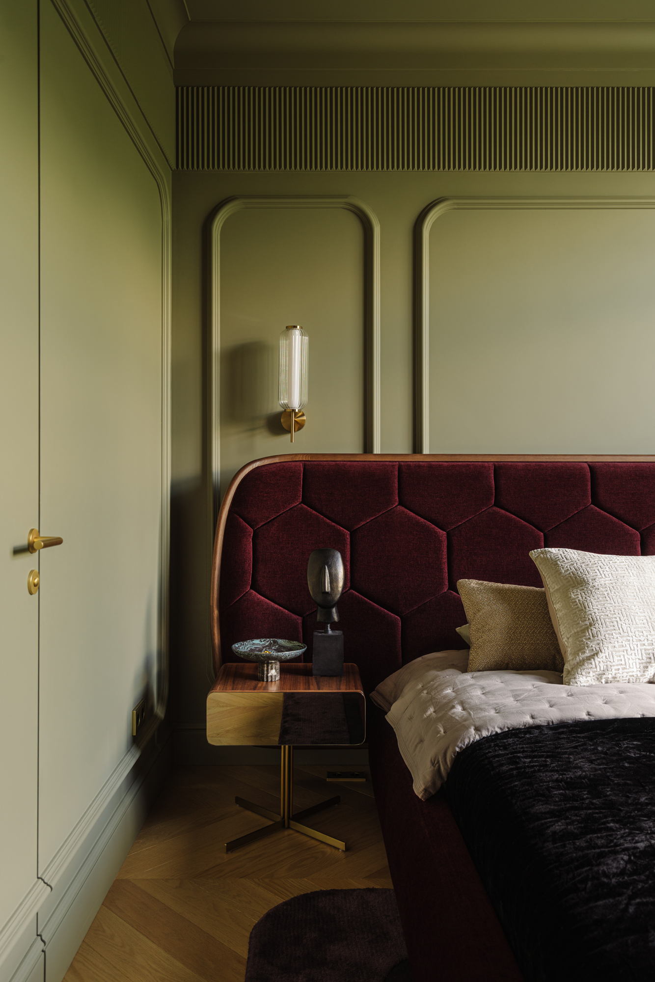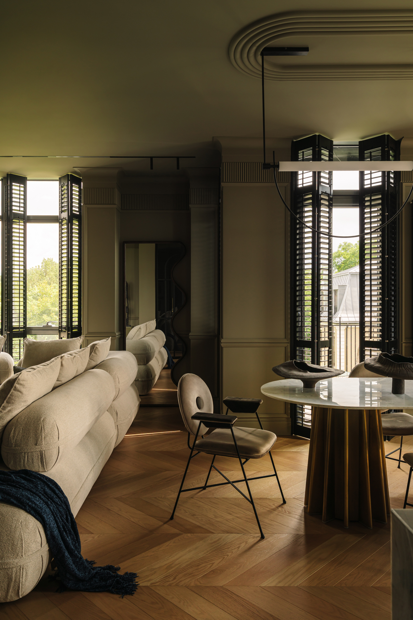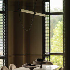 Так народився інтер’єр, наповнений гедонізмом. В оздобленні переважають глибокі земляні відтінки, що створюють відчуття інтимності та сучасної елегантності. Яскраві кольори з’являються виключно у мистецьких акцентах. У меблях, оздобленні стін, підлоги та вбудованих елементах переважають природні, спокійні тони: глибокий хакі, насичений темно-зелений, чорний, а також приглушені відтінки синього та зеленого.