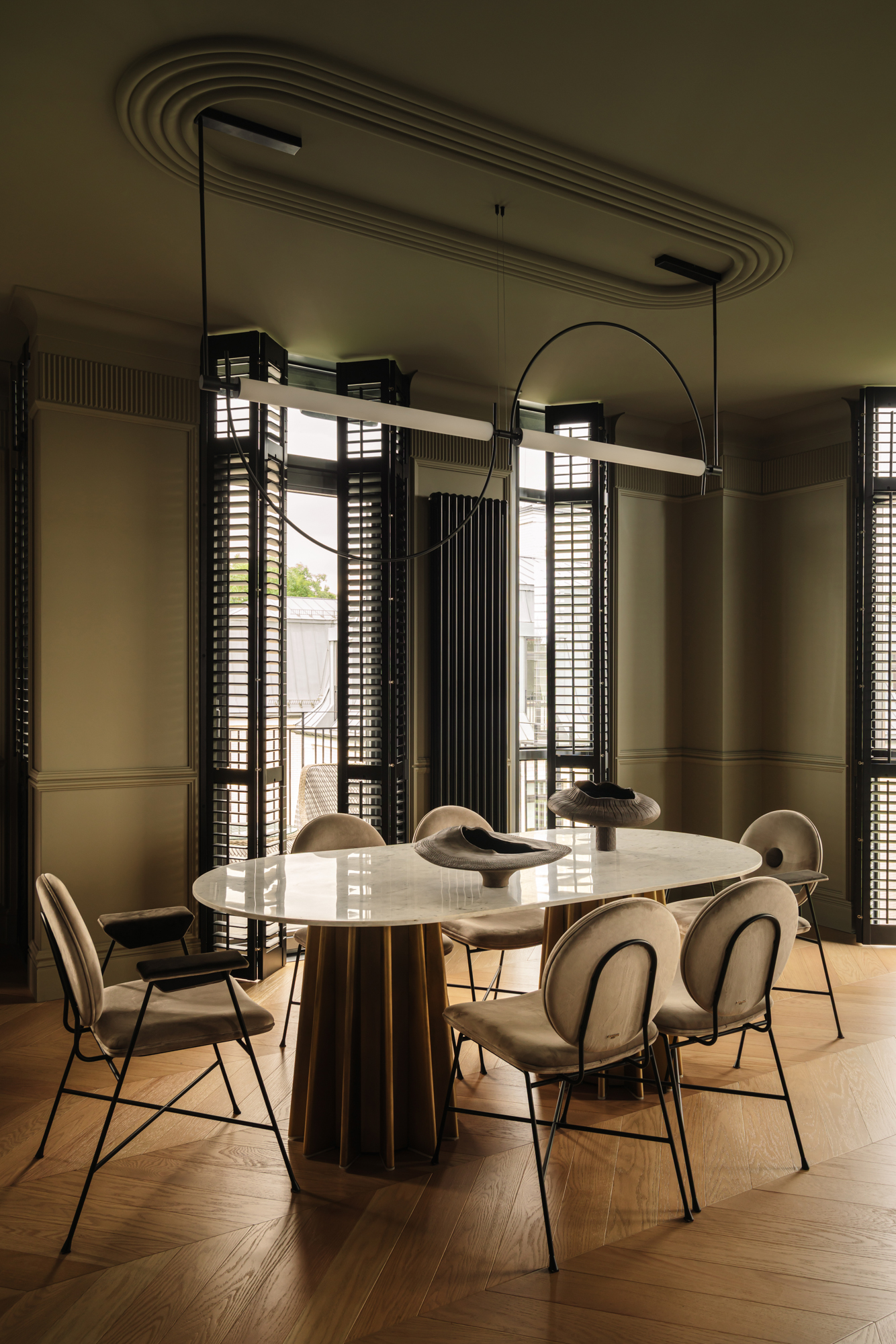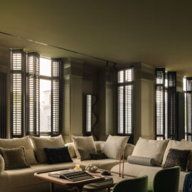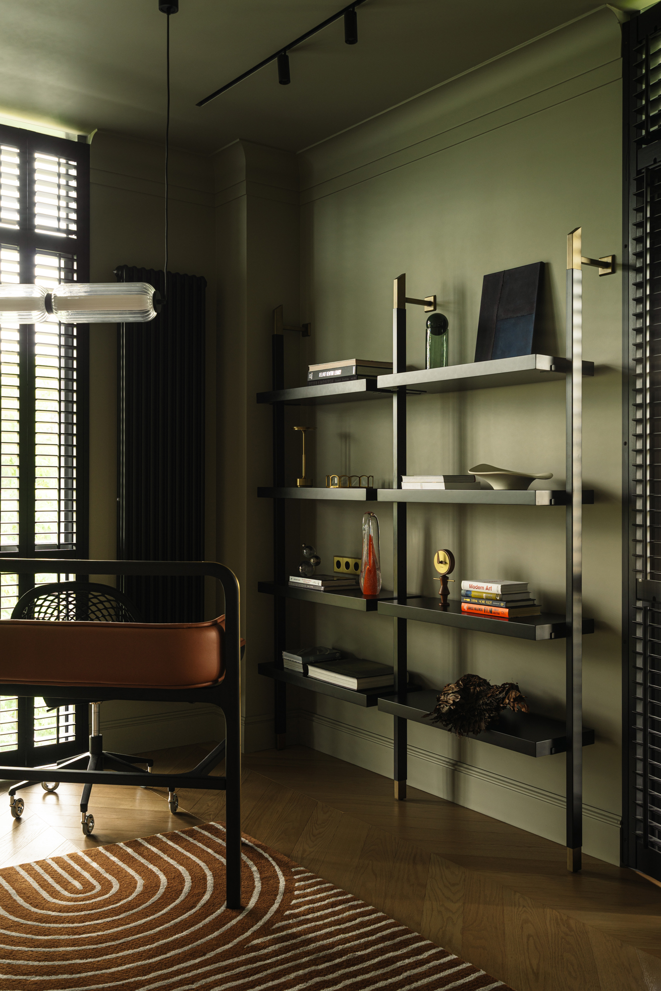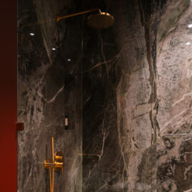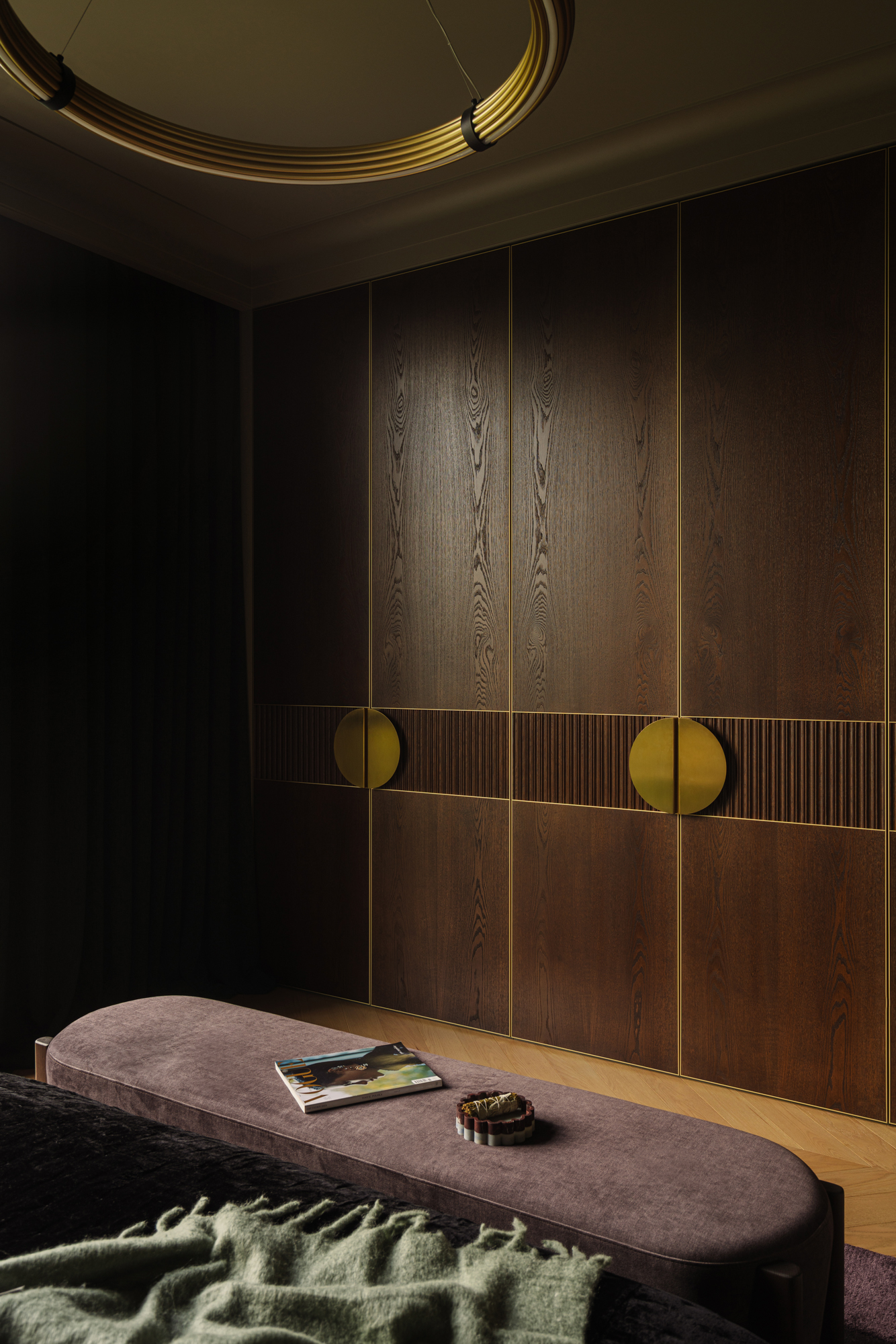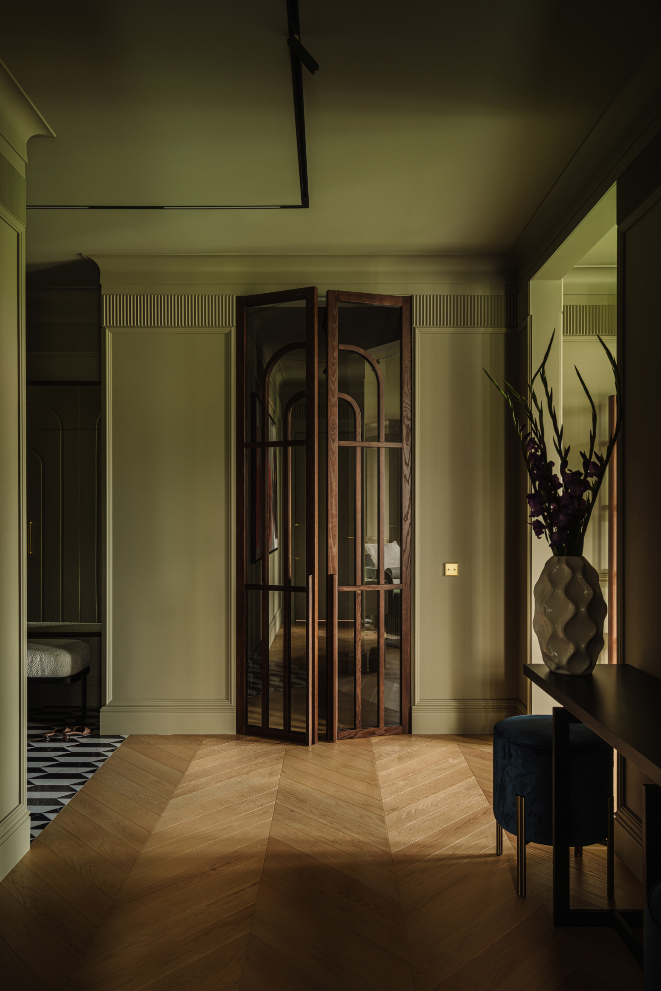 Так народився інтер’єр, наповнений гедонізмом. В оздобленні переважають глибокі земляні відтінки, що створюють відчуття інтимності та сучасної елегантності. Яскраві кольори з’являються виключно у мистецьких акцентах. У меблях, оздобленні стін, підлоги та вбудованих елементах переважають природні, спокійні тони: глибокий хакі, насичений темно-зелений, чорний, а також приглушені відтінки синього та зеленого.