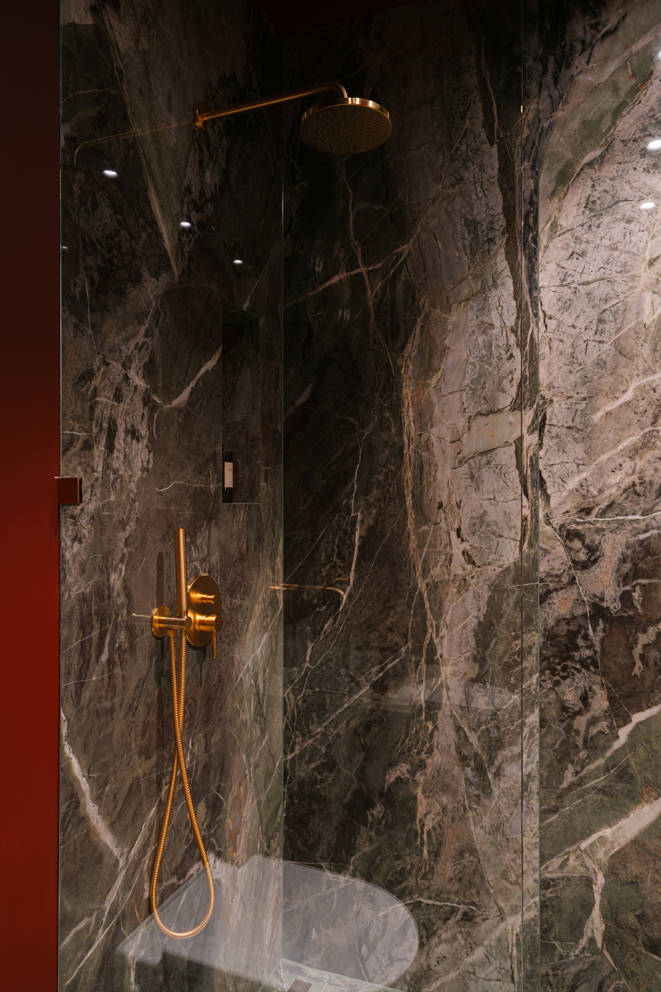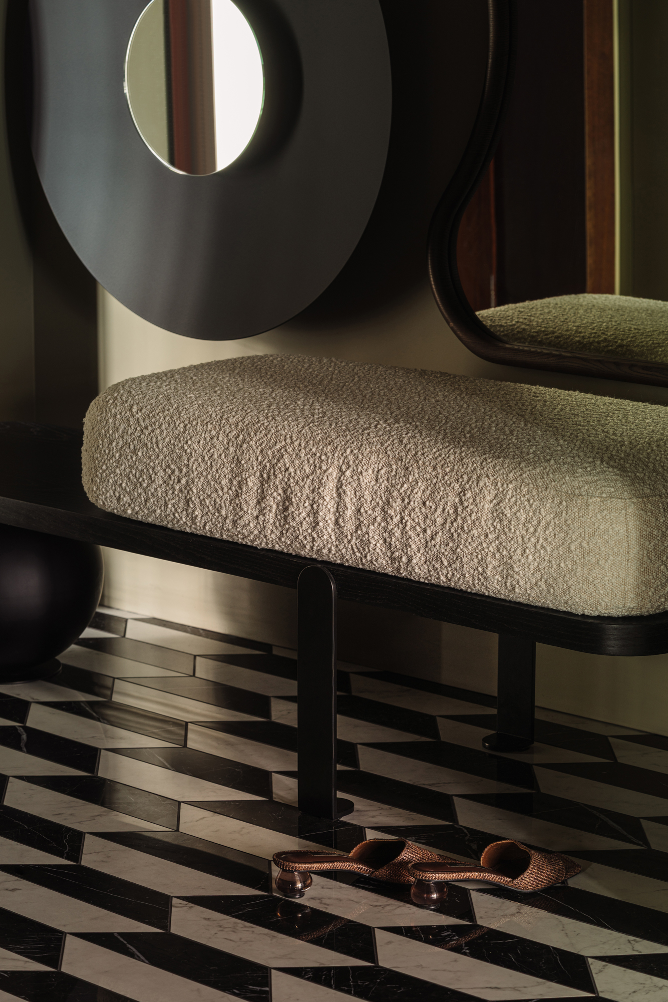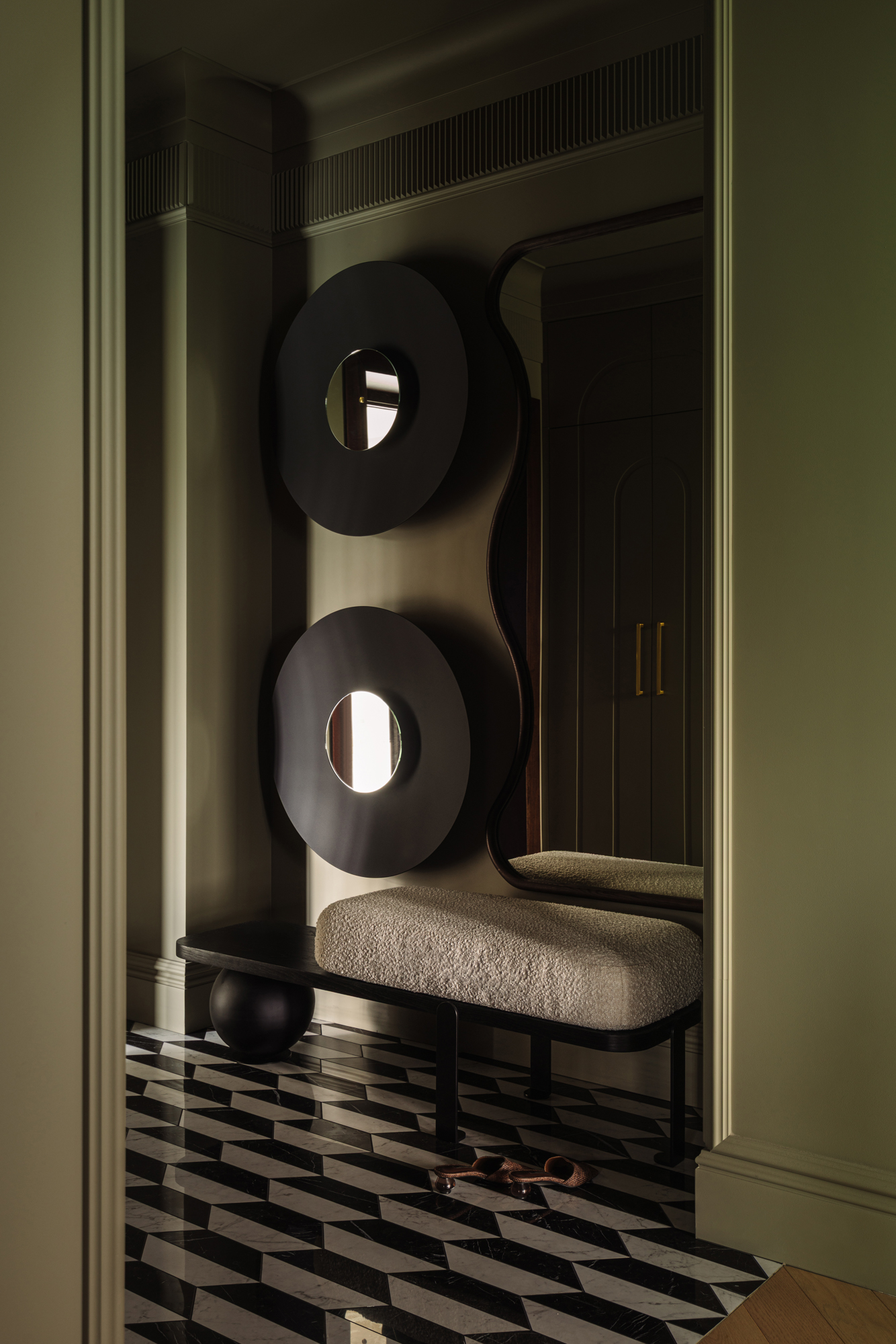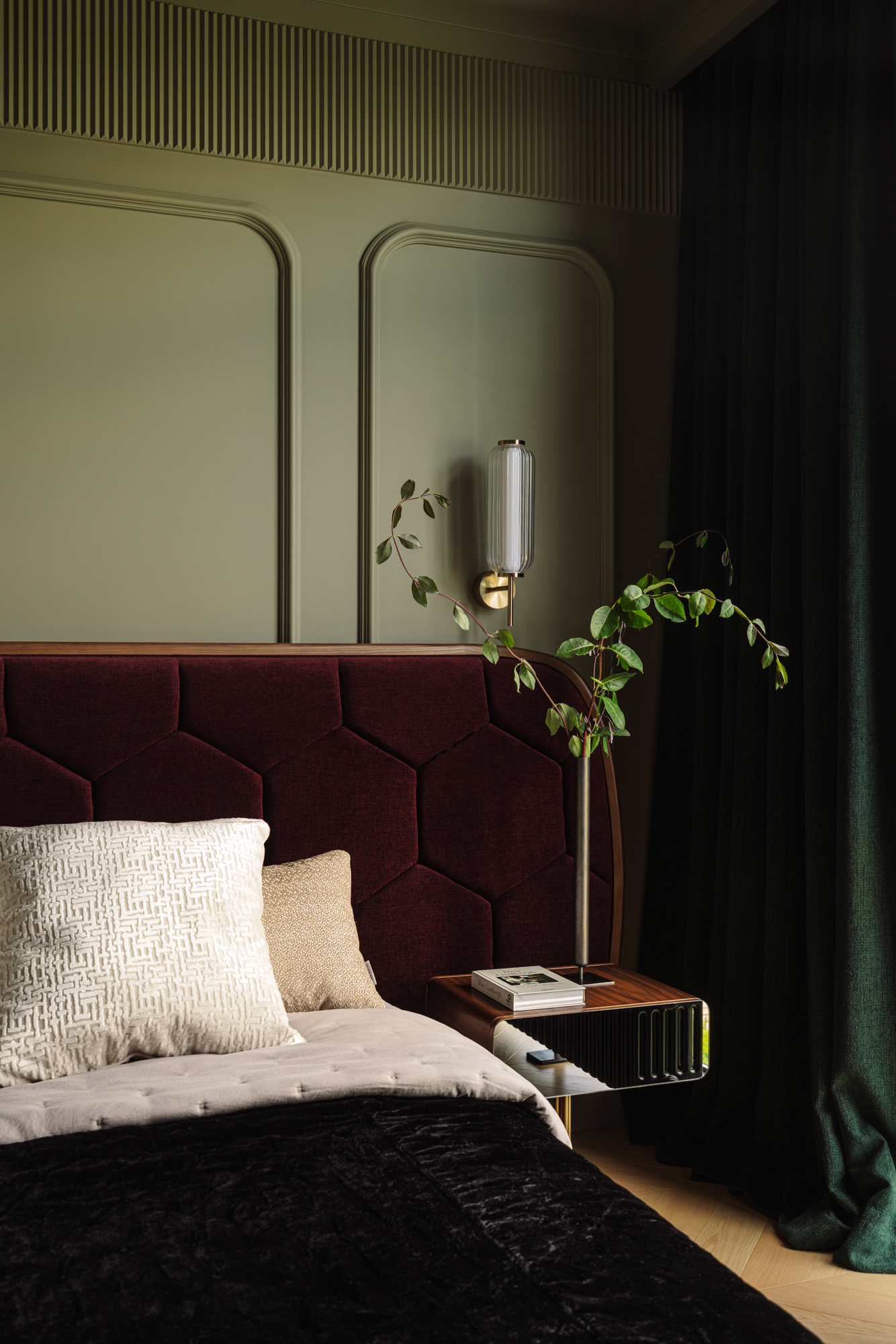 Так народився інтер’єр, наповнений гедонізмом. В оздобленні переважають глибокі земляні відтінки, що створюють відчуття інтимності та сучасної елегантності. Яскраві кольори з’являються виключно у мистецьких акцентах. У меблях, оздобленні стін, підлоги та вбудованих елементах переважають природні, спокійні тони: глибокий хакі, насичений темно-зелений, чорний, а також приглушені відтінки синього та зеленого.