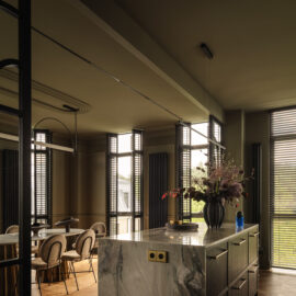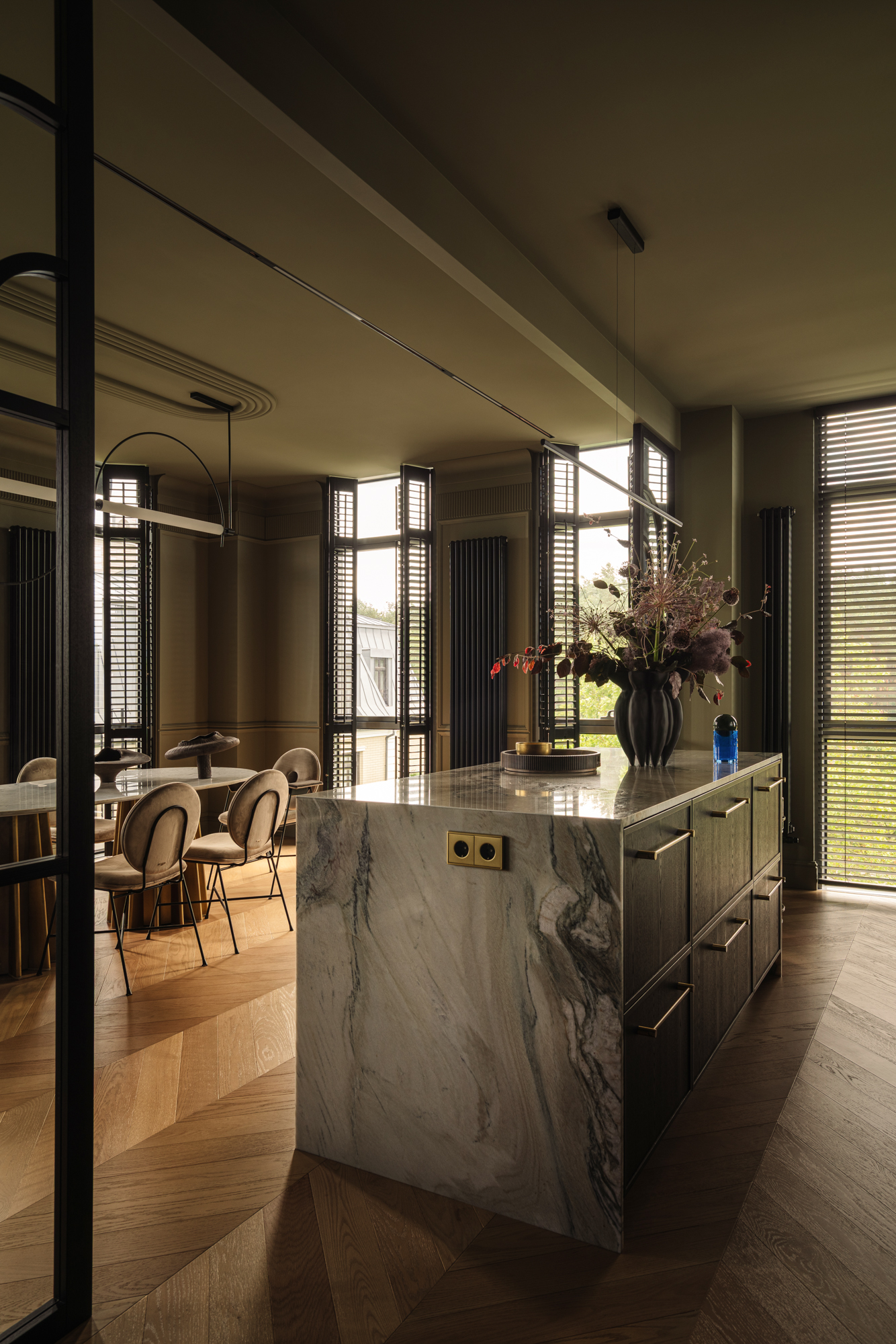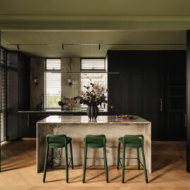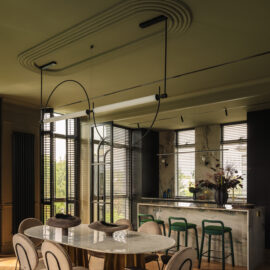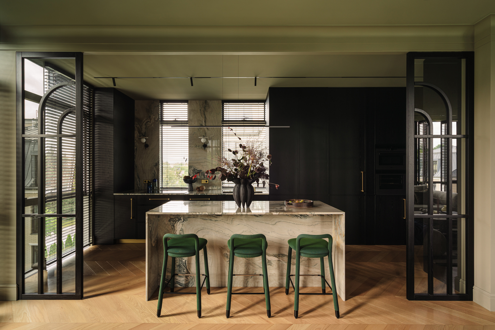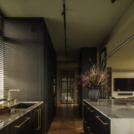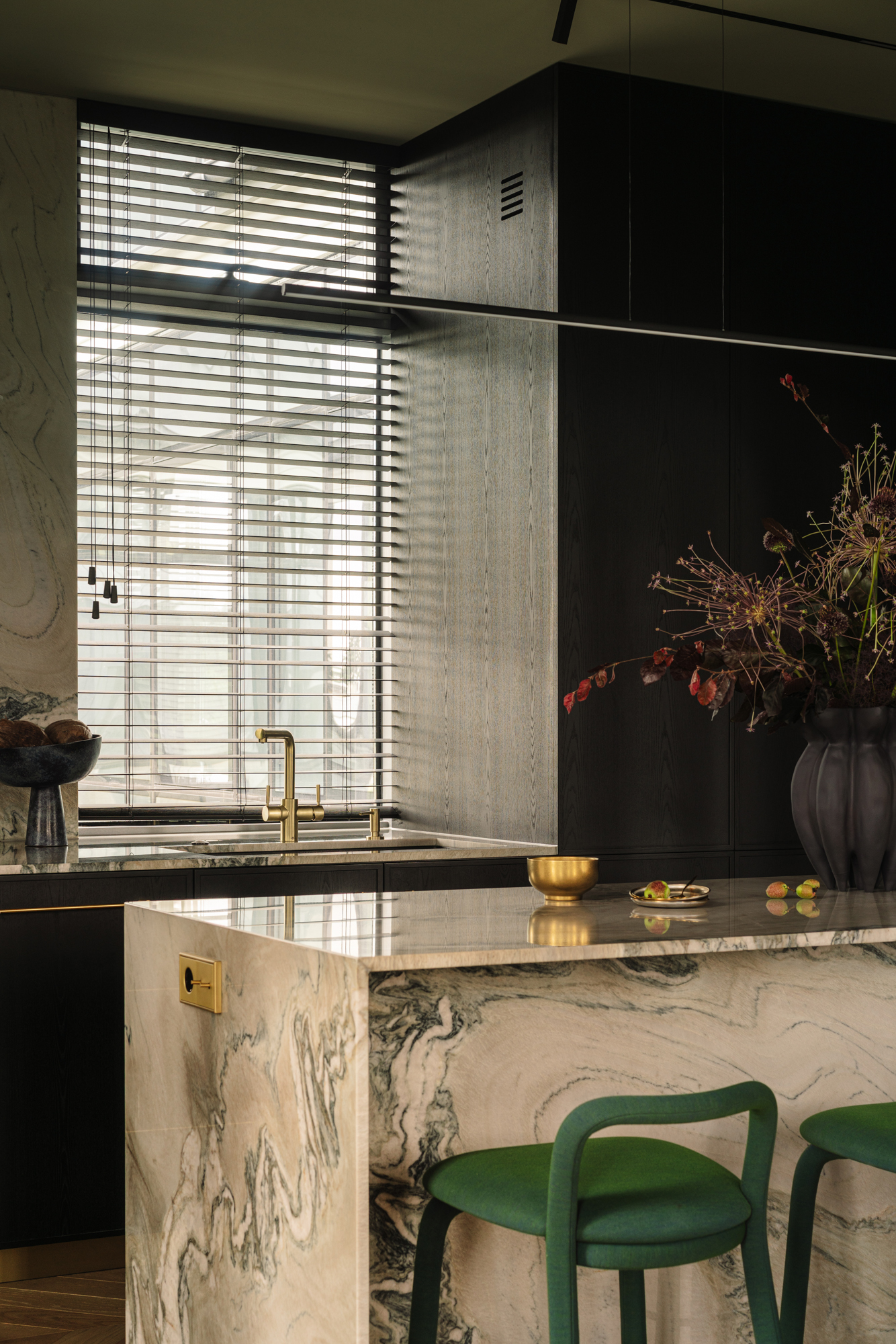 Кухня витримана у майже чорній палітрі, а гнуті меблі, виконані українськими майстрами, надають проєкту унікальності. Темні глибокі відтінки поєднуються з натуральними матеріалами – дубом, мармуром привезеним з Іспанії, натуральним шпоном і латунню. Усе це формує інтер’єр, позбавлений строкатості, але наповнений тактильністю та відчуттям довговічності.