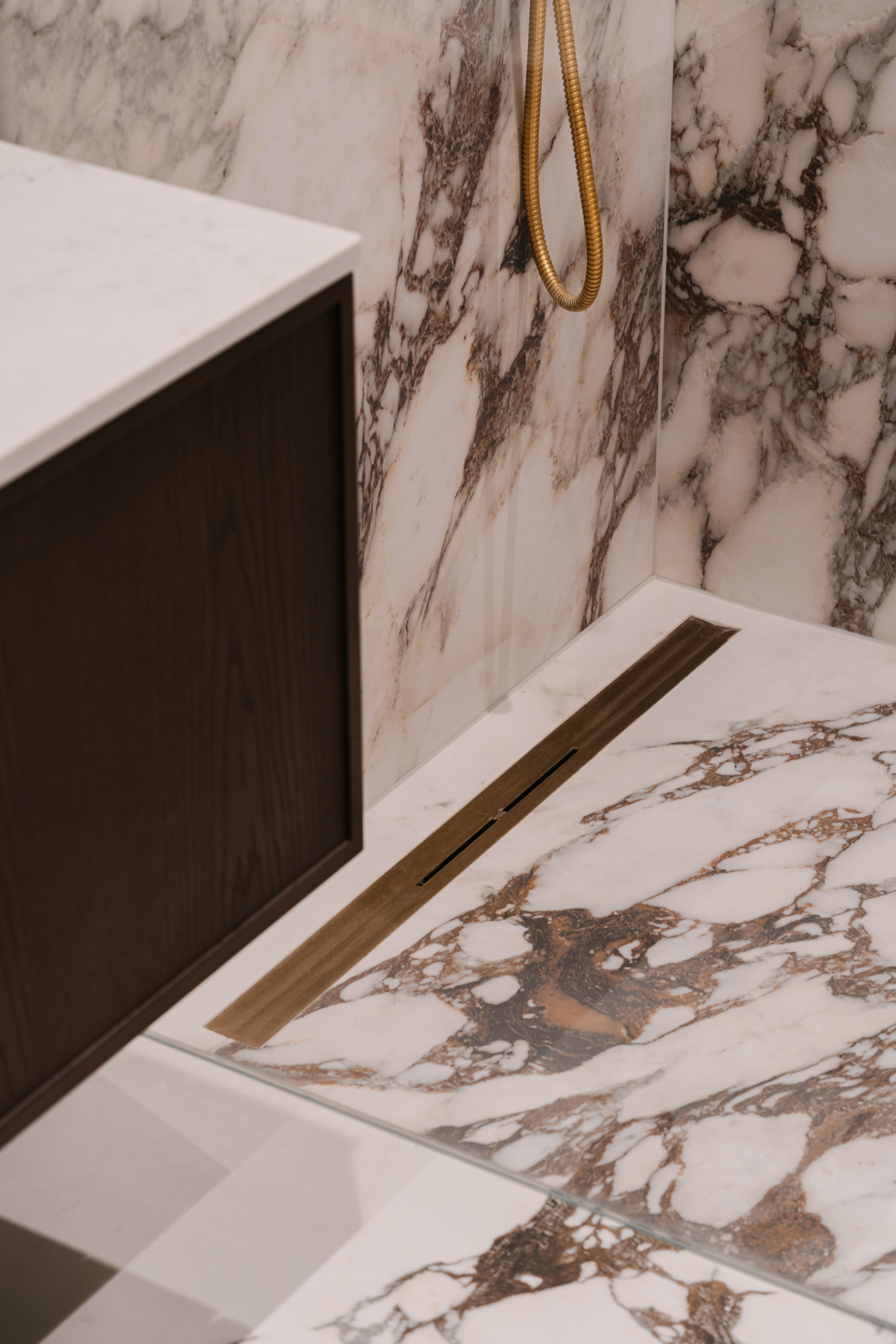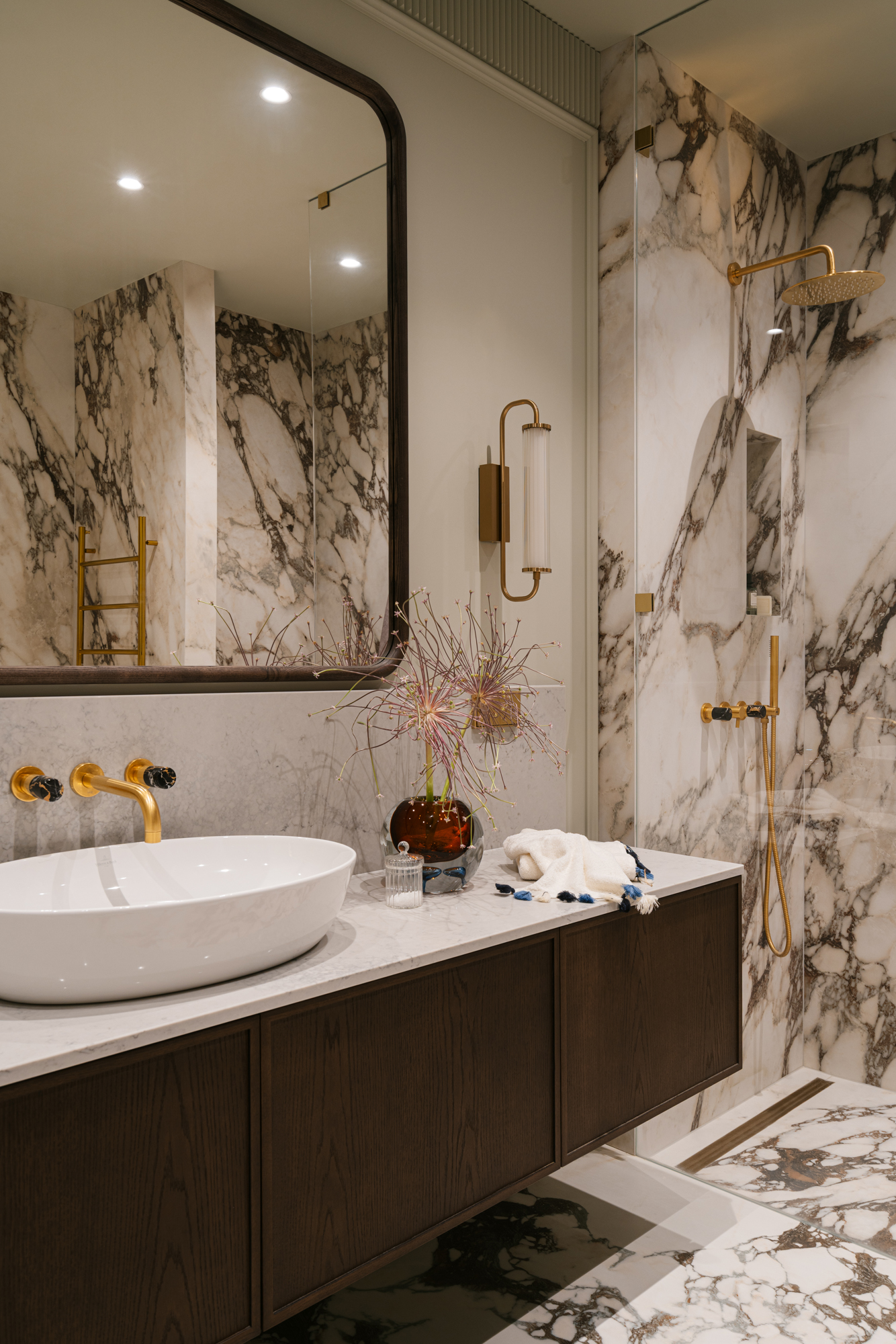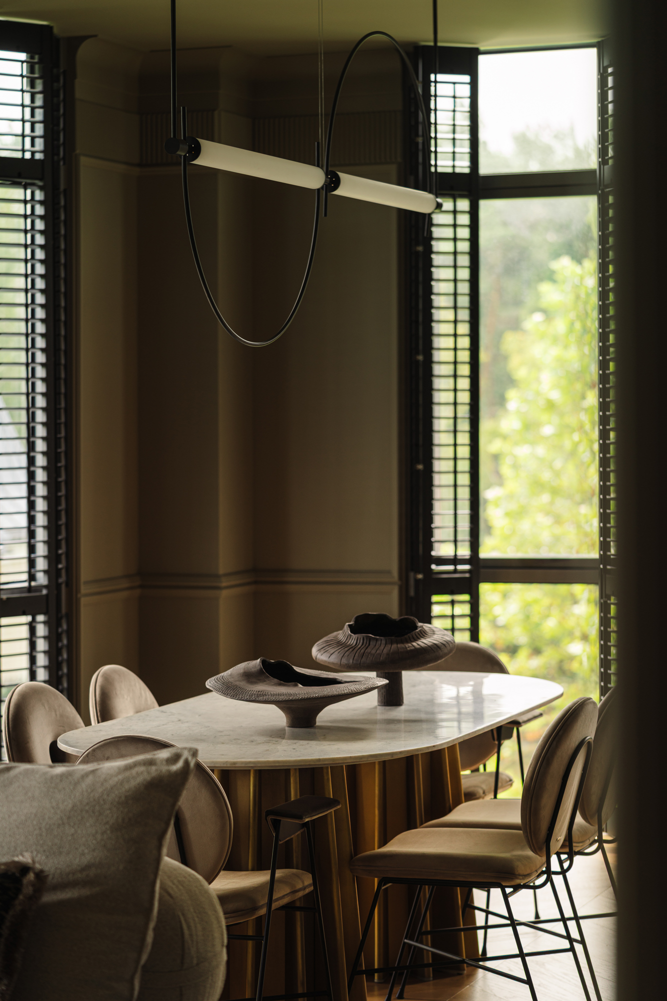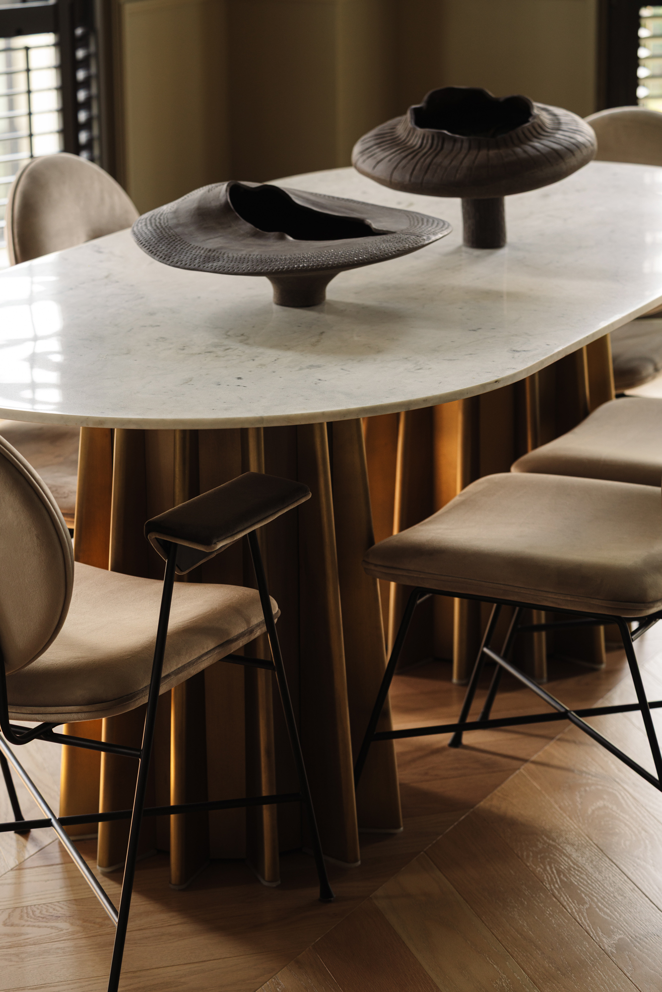 Кухня витримана у майже чорній палітрі, а гнуті меблі, виконані українськими майстрами, надають проєкту унікальності. Темні глибокі відтінки поєднуються з натуральними матеріалами – дубом, мармуром привезеним з Іспанії, натуральним шпоном і латунню. Усе це формує інтер’єр, позбавлений строкатості, але наповнений тактильністю та відчуттям довговічності.