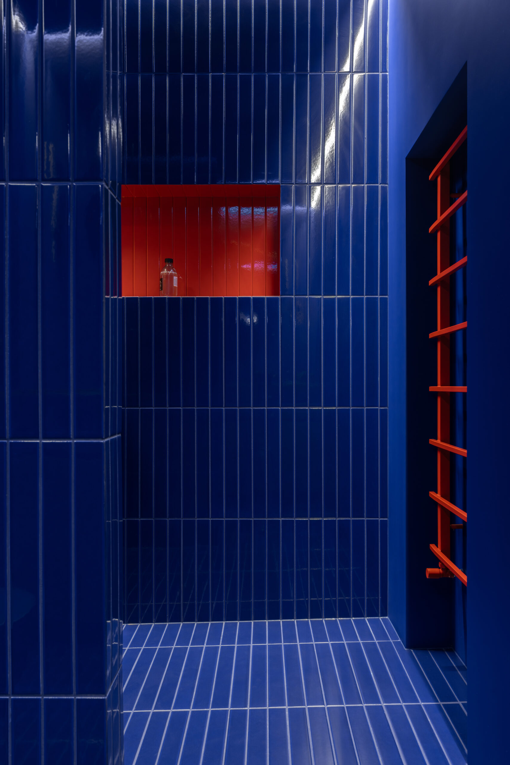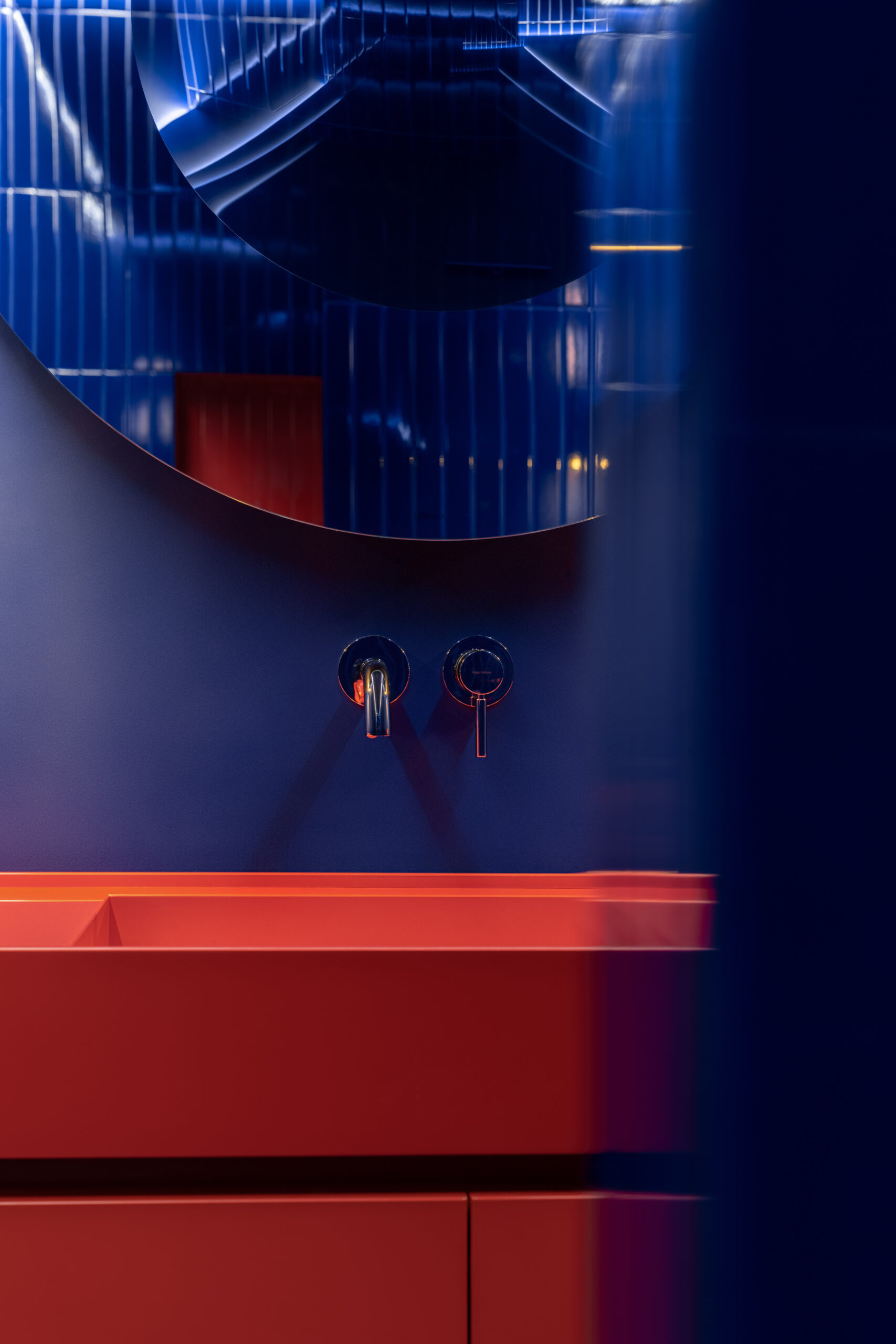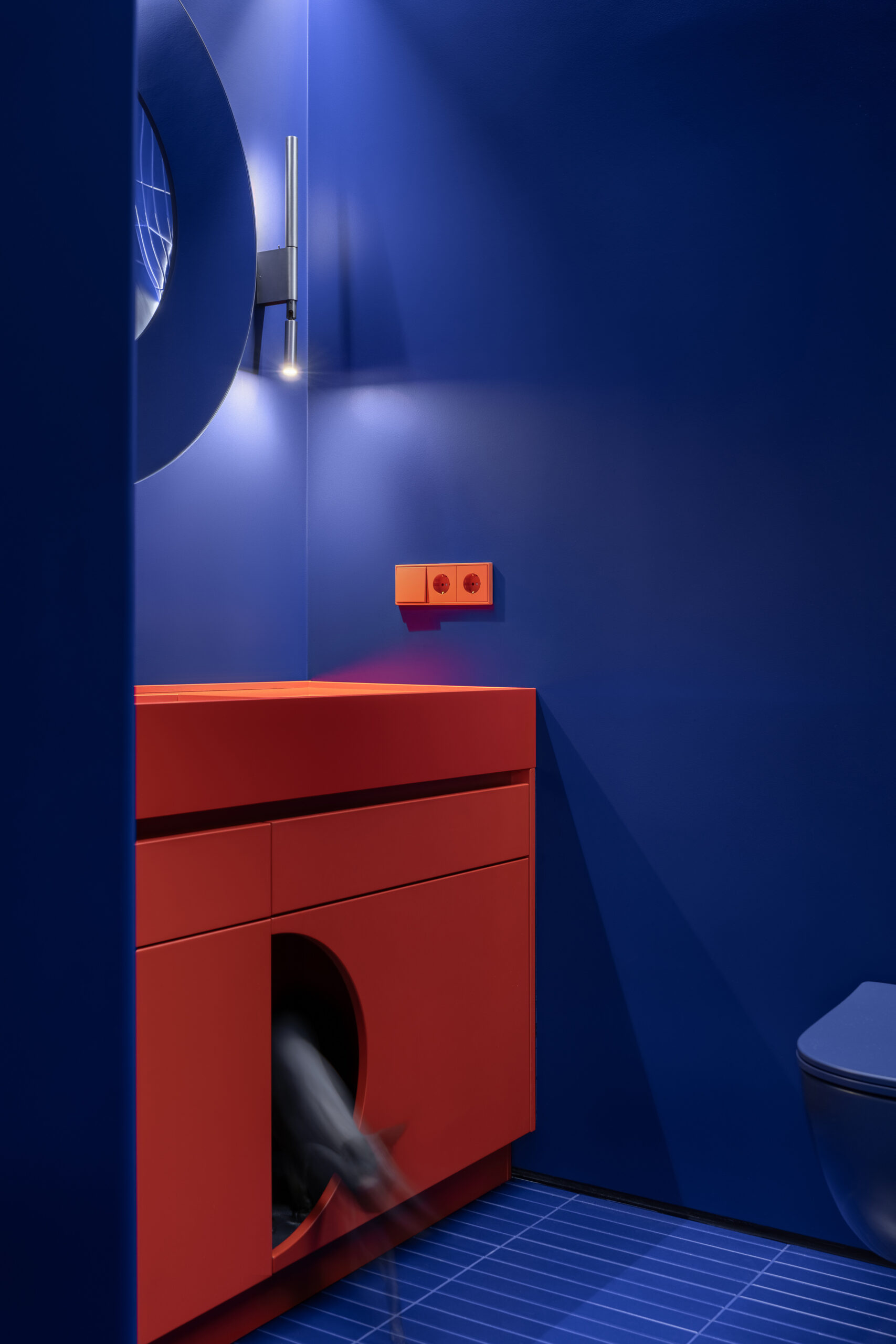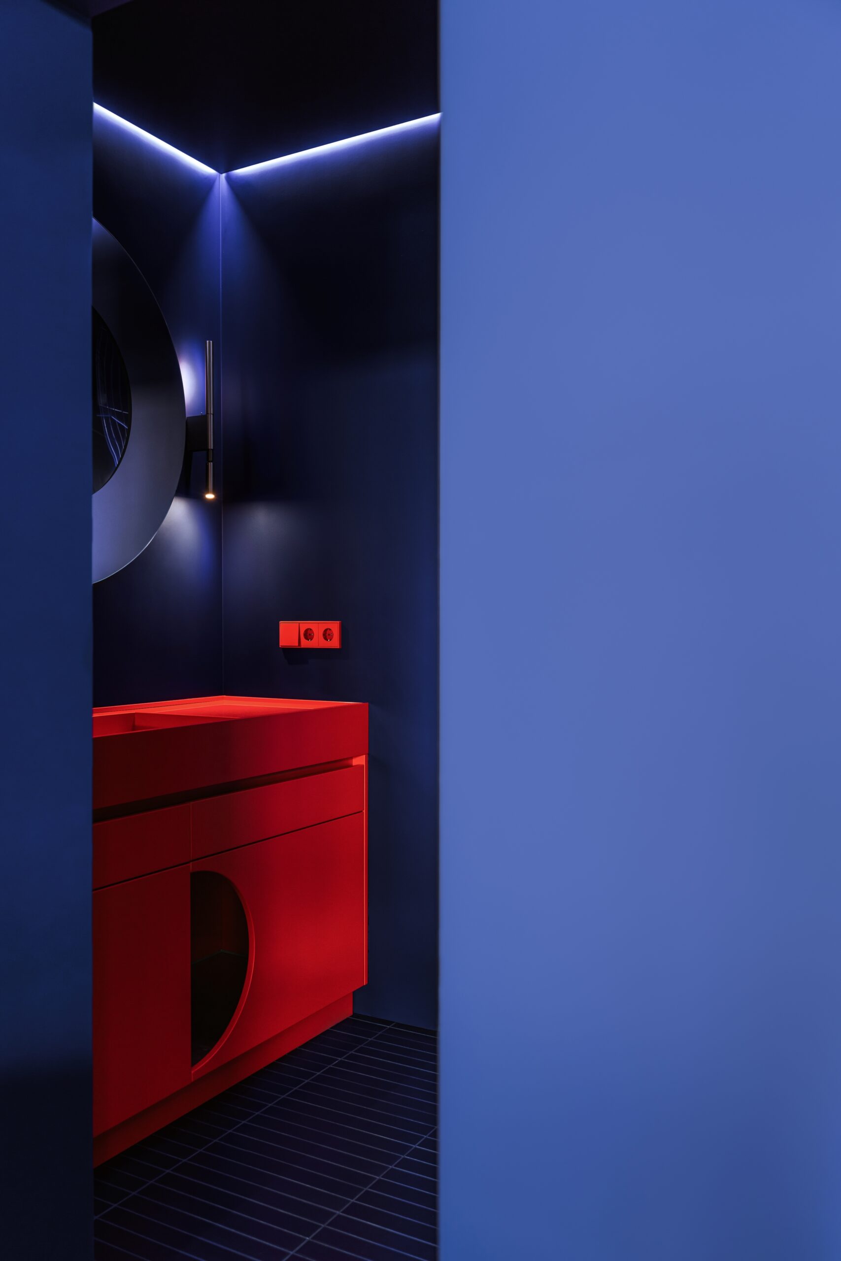 Контрастна палітра санвузла складається з кобальтово-синього та відкритого червоного відтінків. Синій простір душової розрізає по горизонталі червона ніша полички. Сині поверхні стін, підлоги та стелі доповнює червона тумба під раковиною з червоного акрилу. Отвір у формі напівкола у фасаді тумби – це вхід до котячої вбиральні.