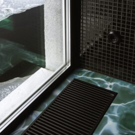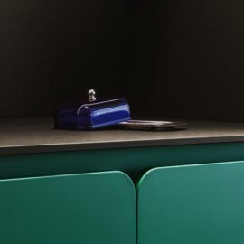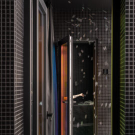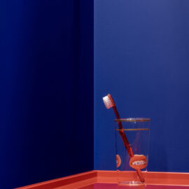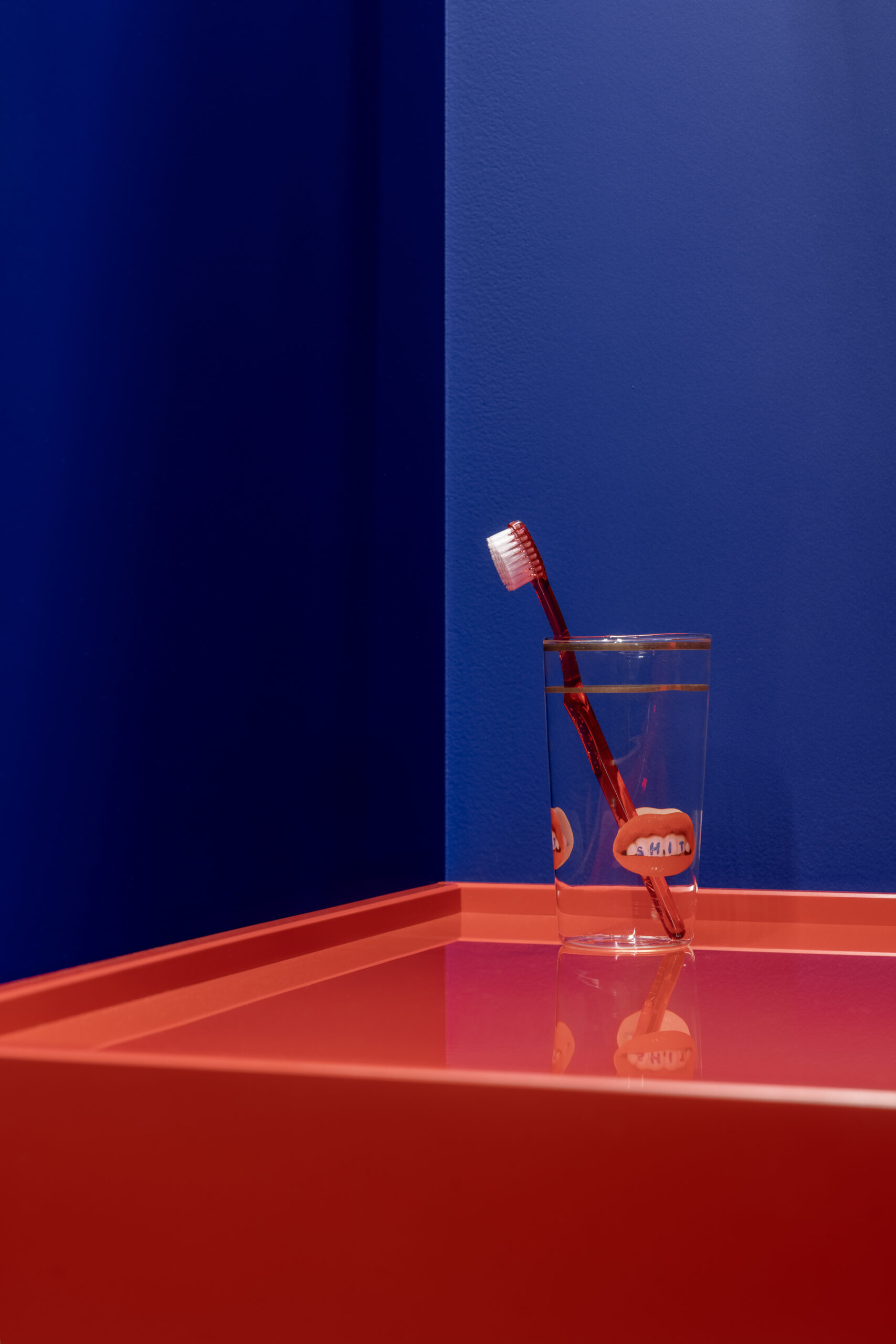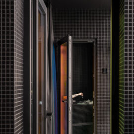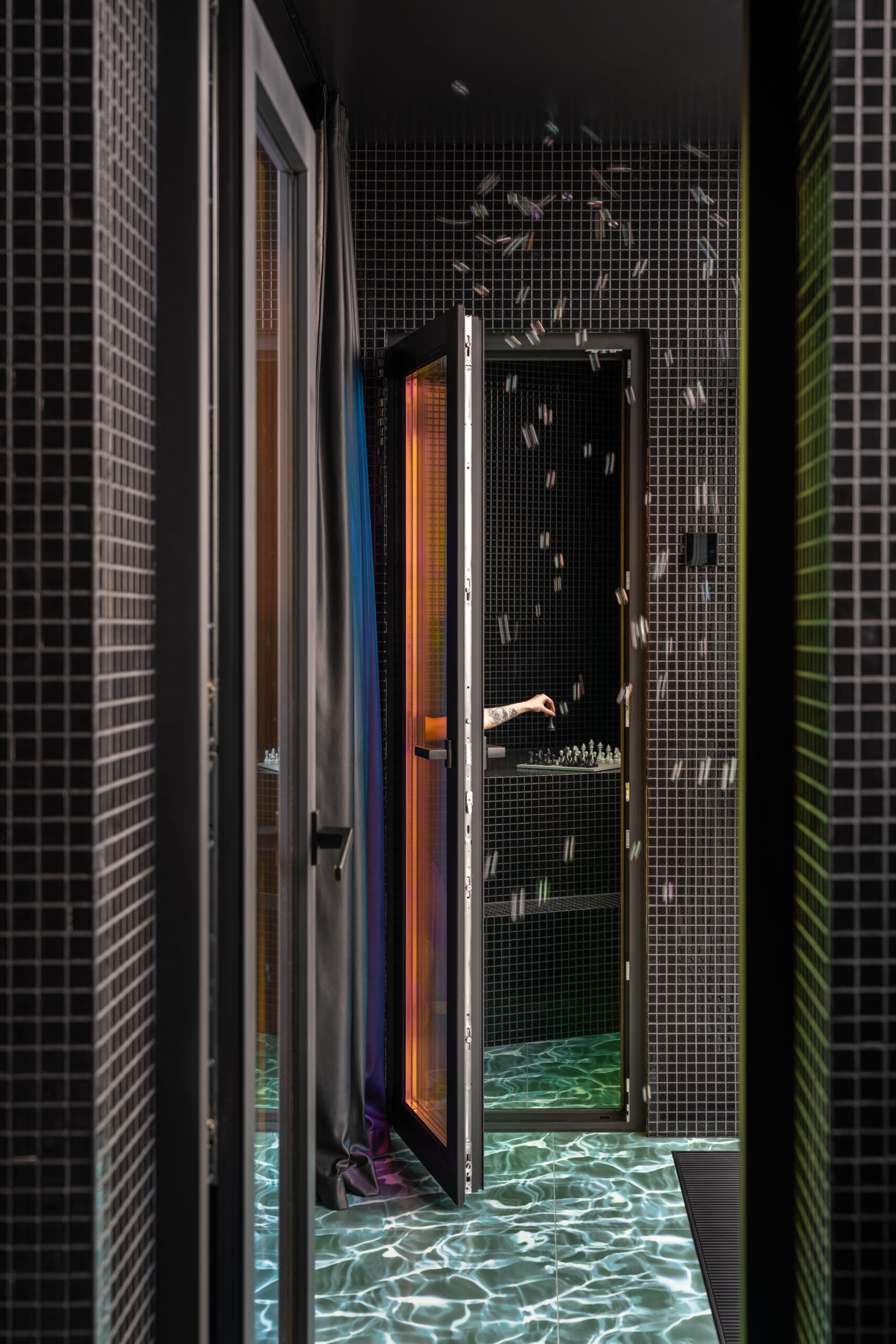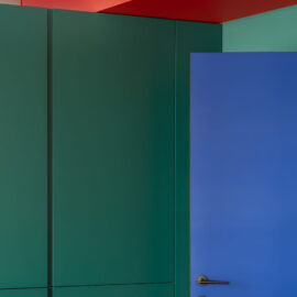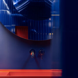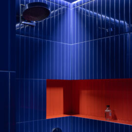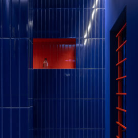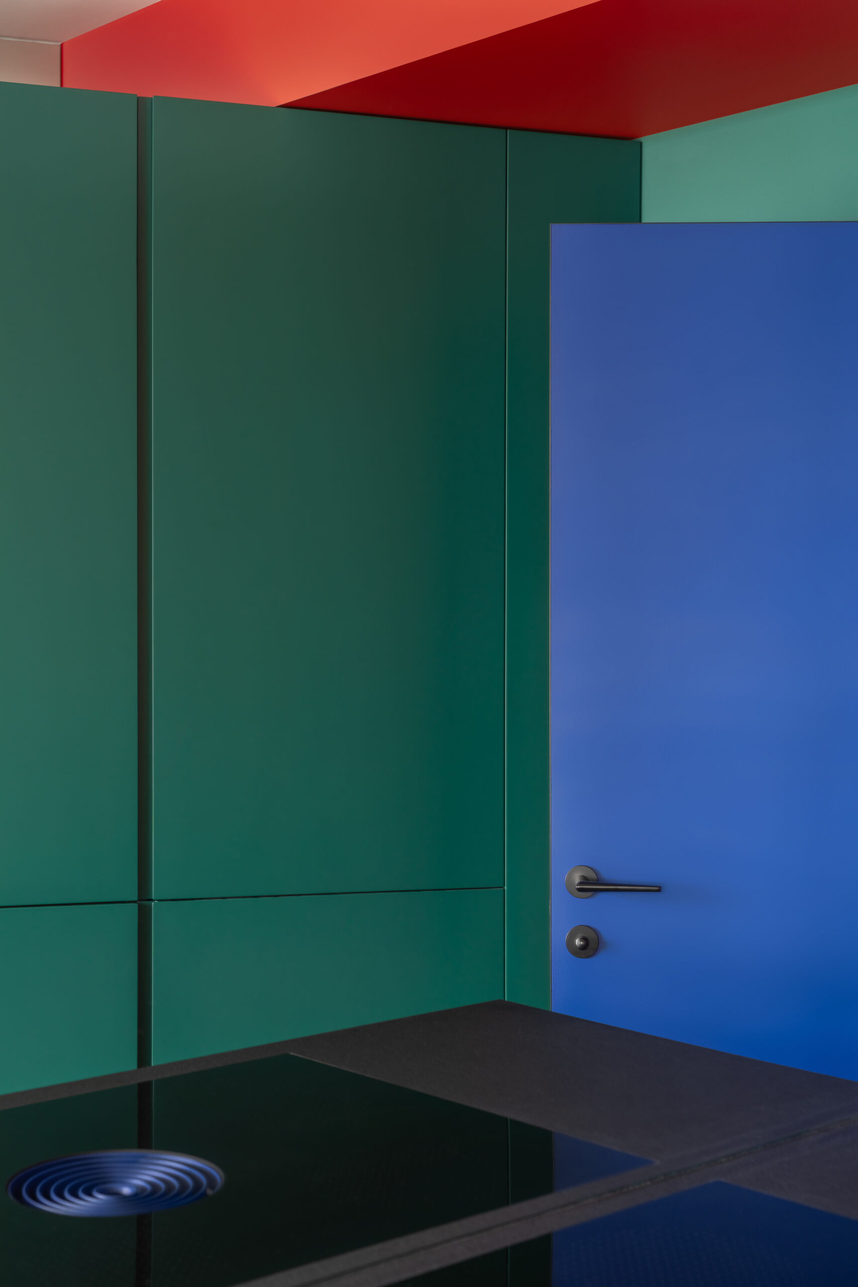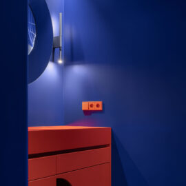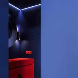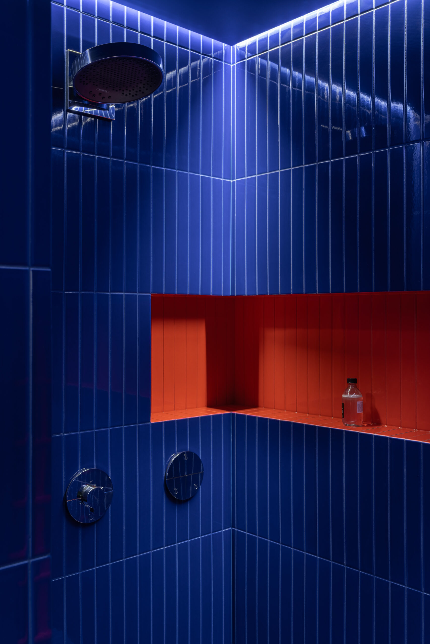 Контрастна палітра санвузла складається з кобальтово-синього та відкритого червоного відтінків. Синій простір душової розрізає по горизонталі червона ніша полички. Сині поверхні стін, підлоги та стелі доповнює червона тумба під раковиною з червоного акрилу. Отвір у формі напівкола у фасаді тумби – це вхід до котячої вбиральні.