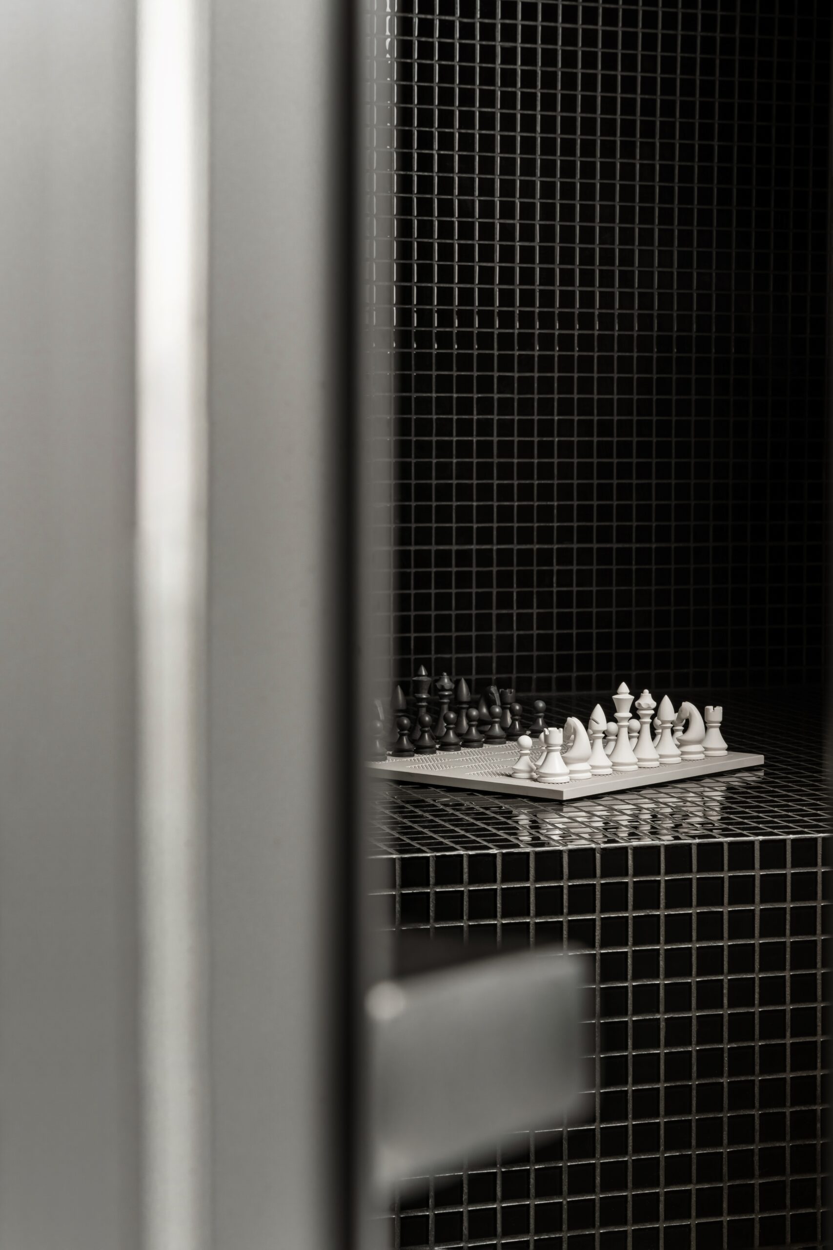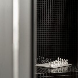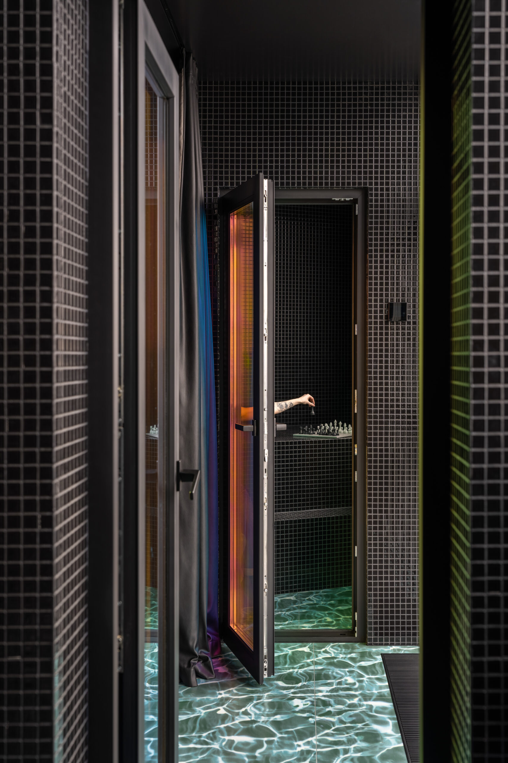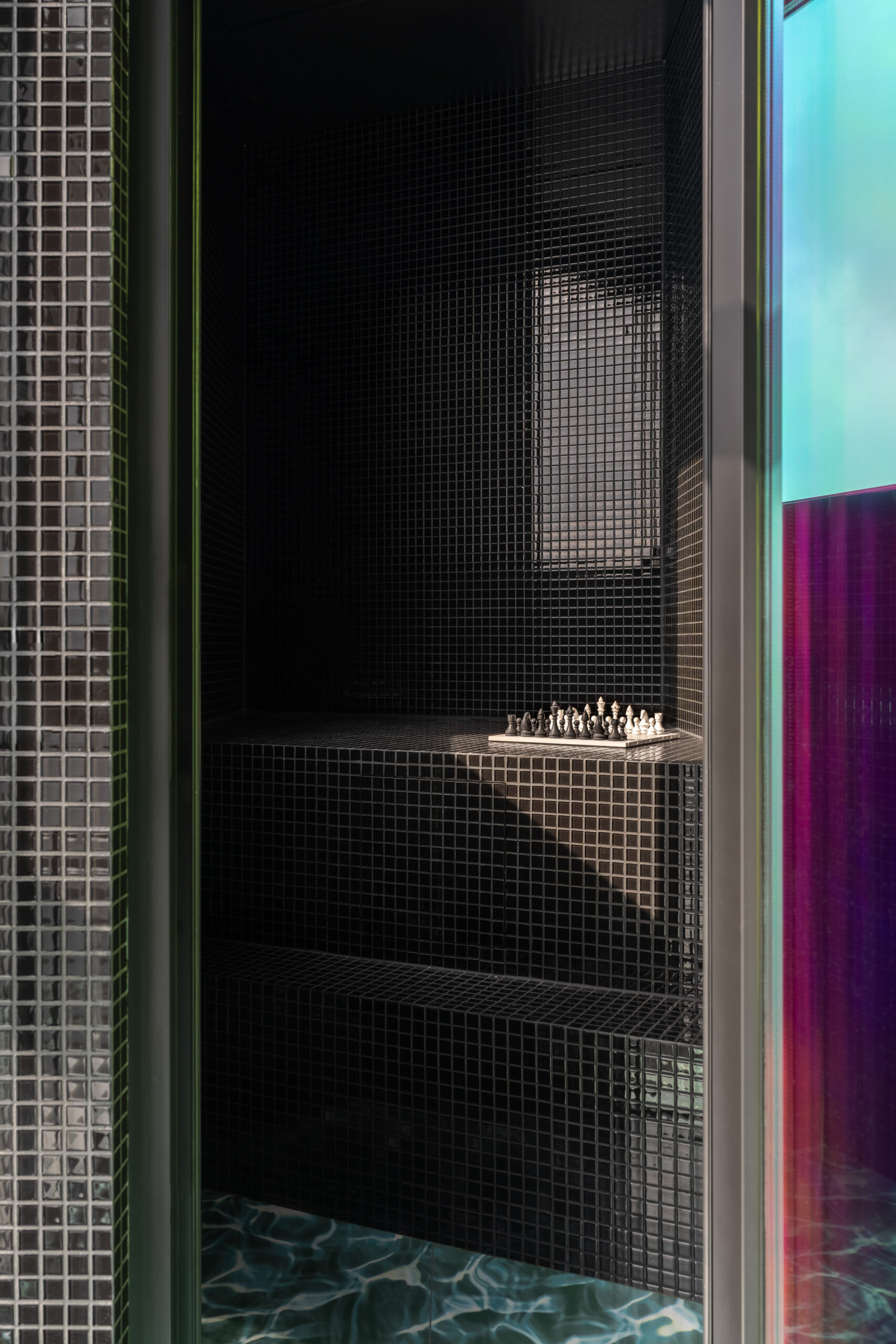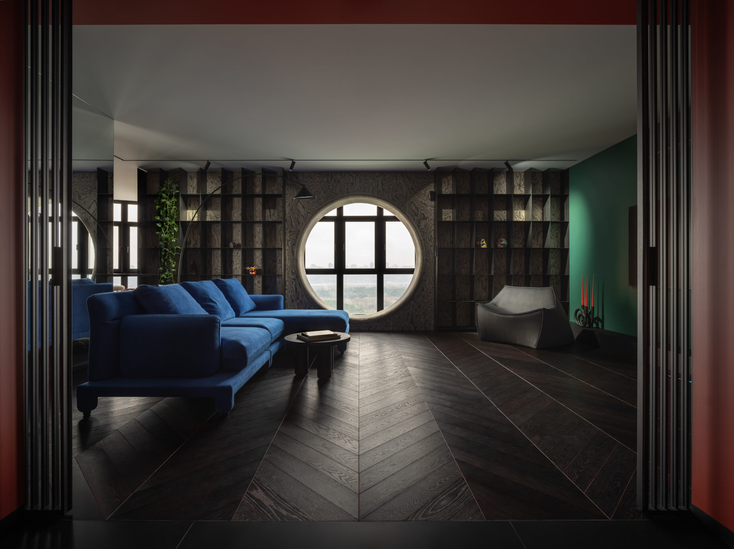 Круглий отвір у стіні вітальні немов би слугує порталом в паралельну реальність. В ній балкон квартири на 26 поверсі є зовсім не тим, чим здається. Плитка Seletti на підлозі має малюнок, що нагадує товщу води. Мозаїка на стінах та лавках-сходинках доповнює враження, що ти знаходишся в басейні.