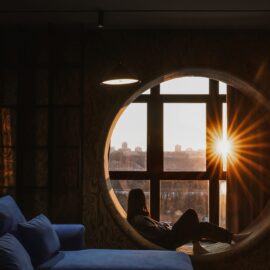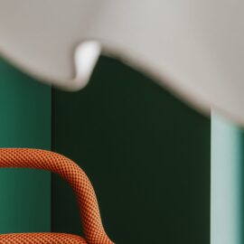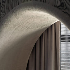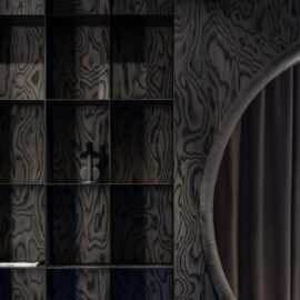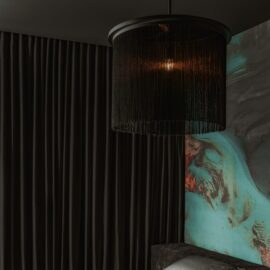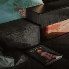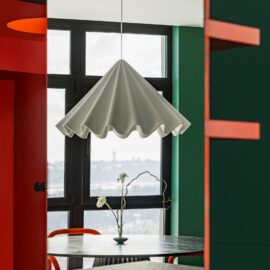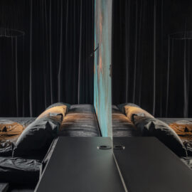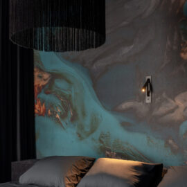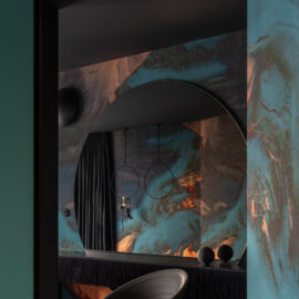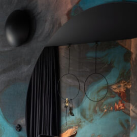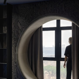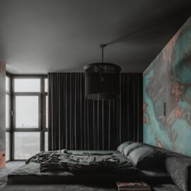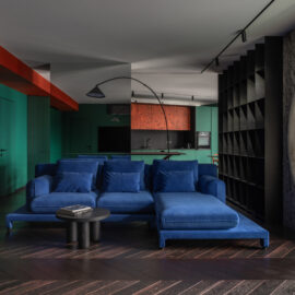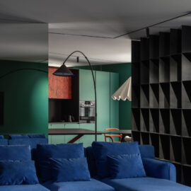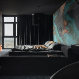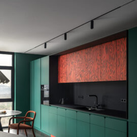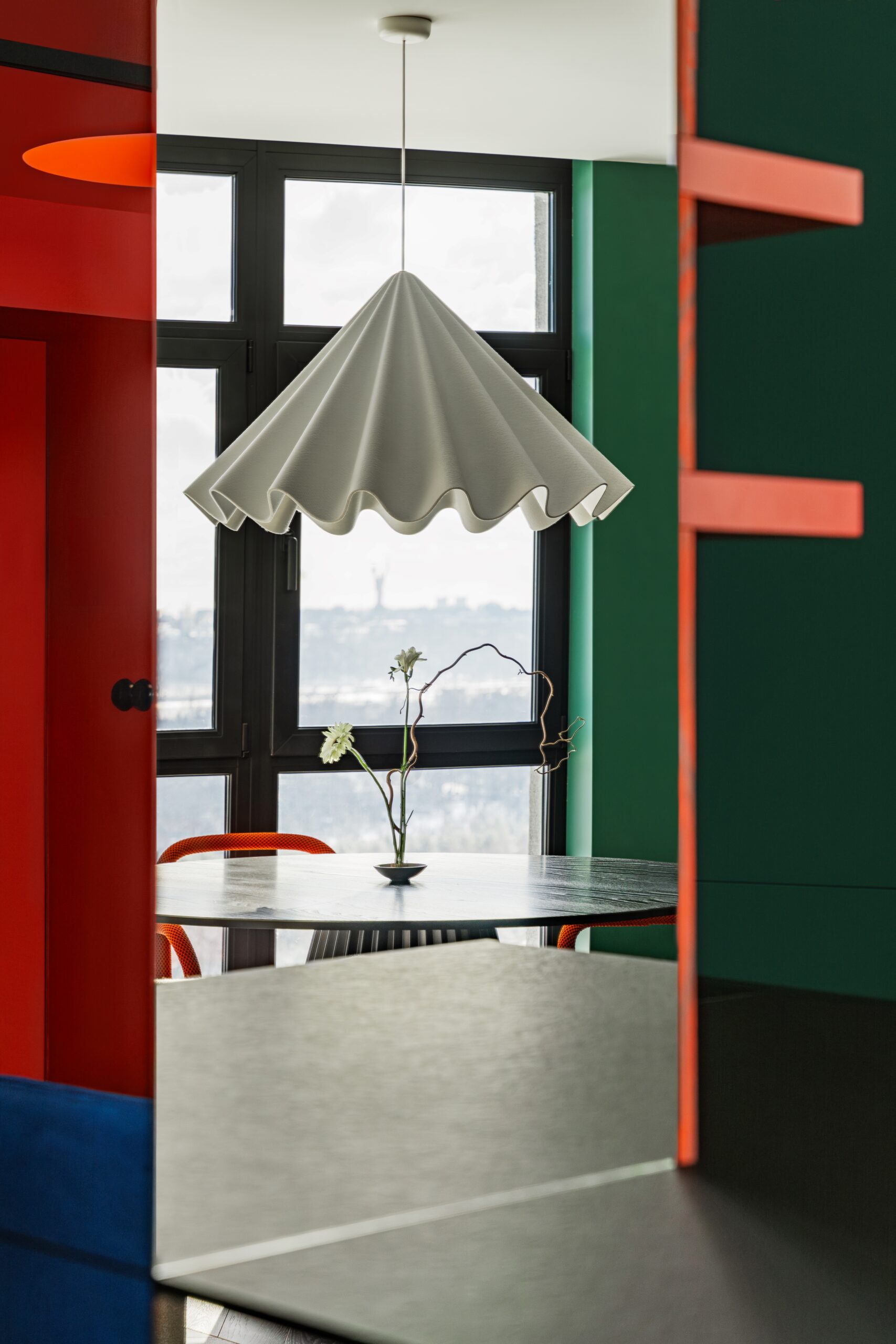 Простора однокімнатна квартира з панорамними вікнами та краєвидом на правий берег Дніпра розташована в одному з нових київських ЖК. Перед дизайнерами стояла задача створити емоційний інтер’єр для пари творчих людей та їх кота. Клієнтка, що має бекграунд у галузі фешн, прагнула втілити естетику космічного цирку, театральності та гротеску, натомість для її чоловіка було важливим мати у квартирі продумані місця для релаксу, уповільнення та розчинення у спокої. Результатом їх співпраці з дизайнерами metric bureau став простір, наповнений кольорами, сенсами та експериментальними рішеннями.