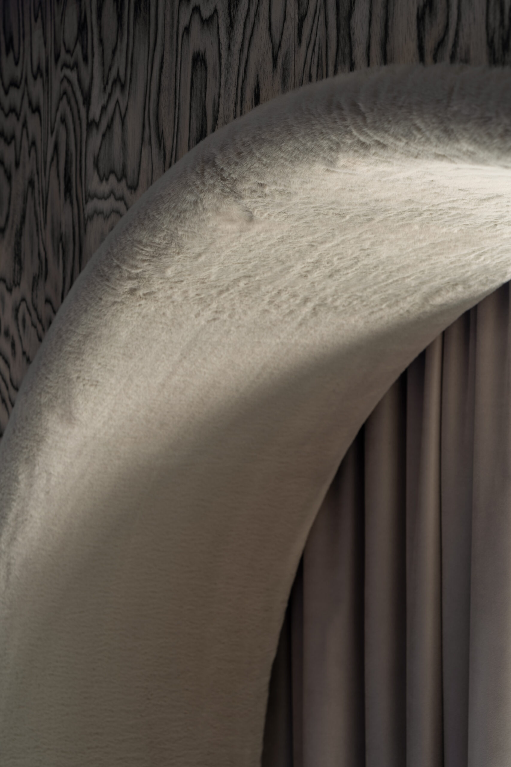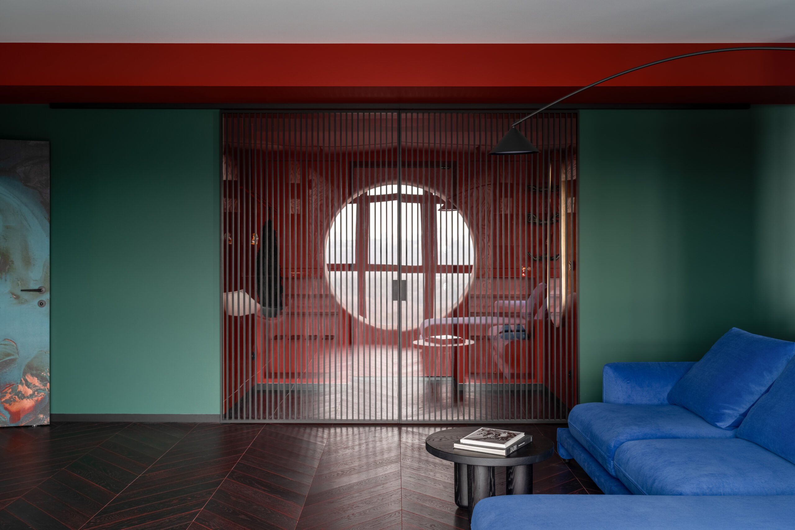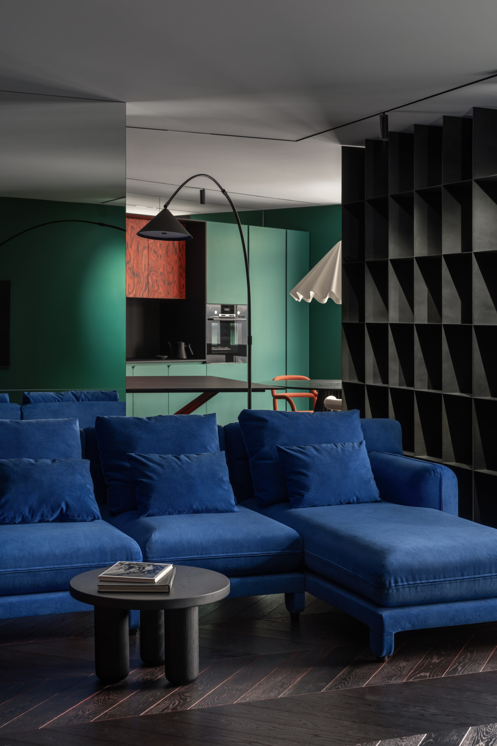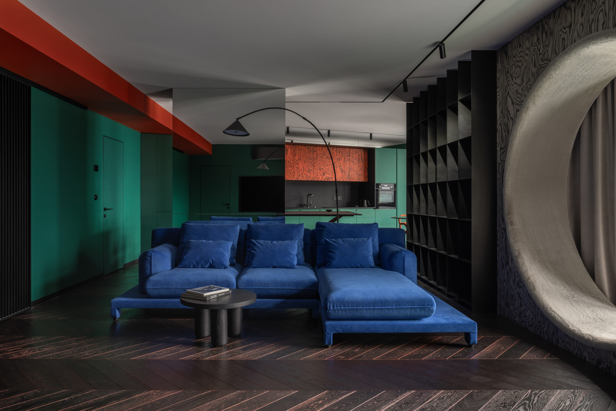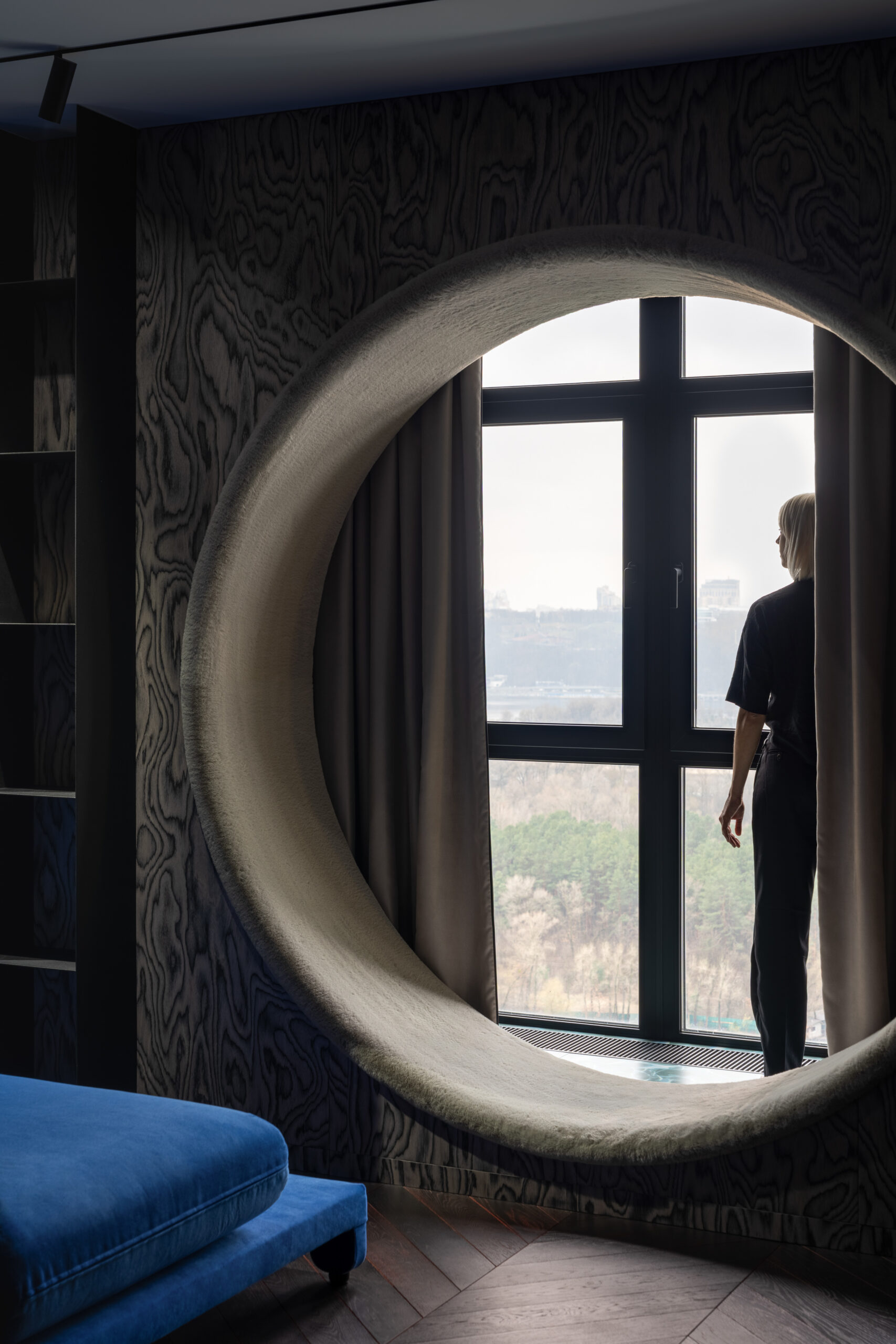 Основний колір вітальні – глибокий зелений. Головним акцентом цієї зони є великий круглий отвір у стіні (діаметром 210 см), оздоблений штучним хутром. Це коло – вісь квартири, єдиний вихід на балкон та місце для розслабленого споглядання краєвиду за вікнами. Таке рішення заміняє традиційне крісло або шезлонг і запрошує не лише бути у просторі, а й взаємодіяти з ним.
