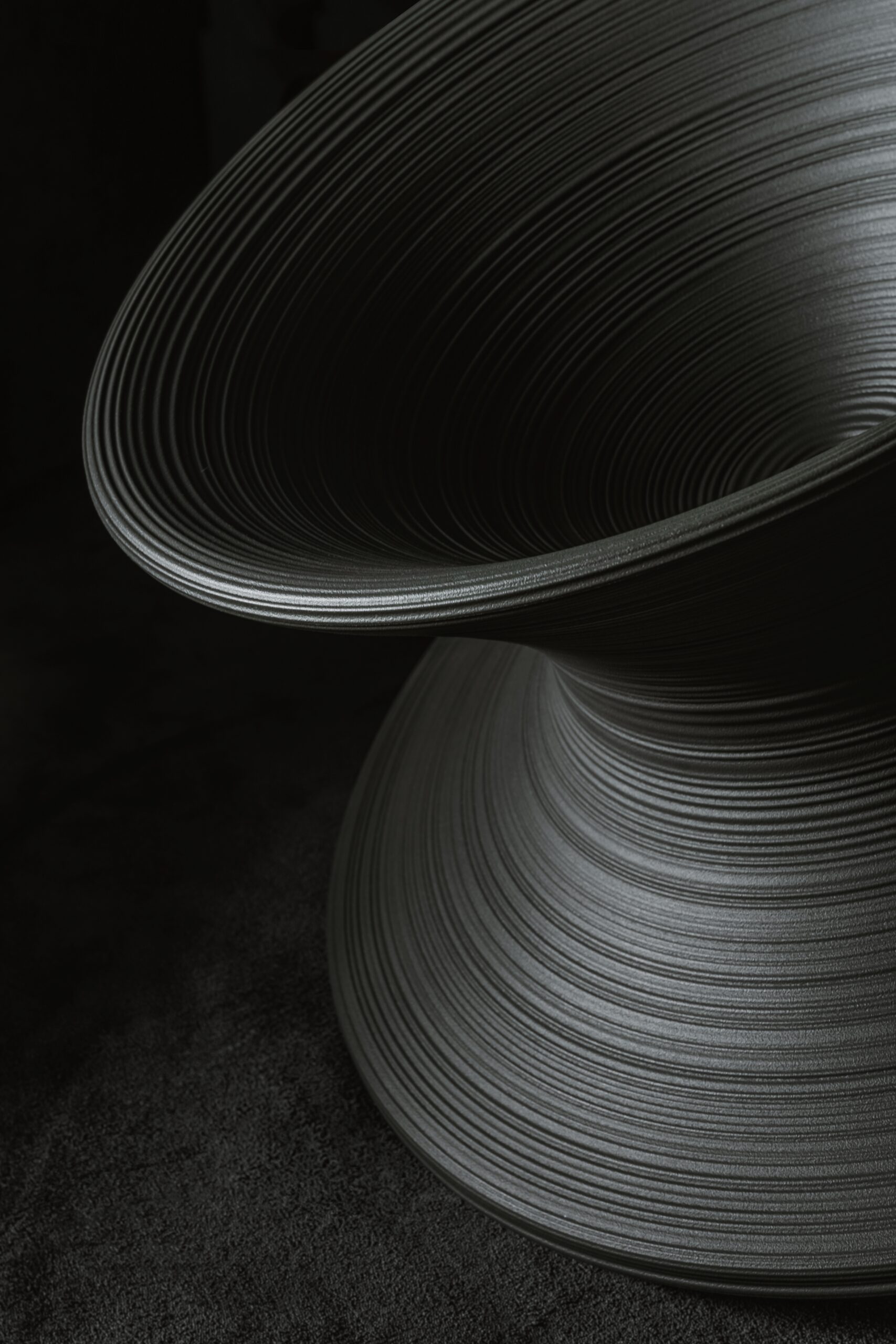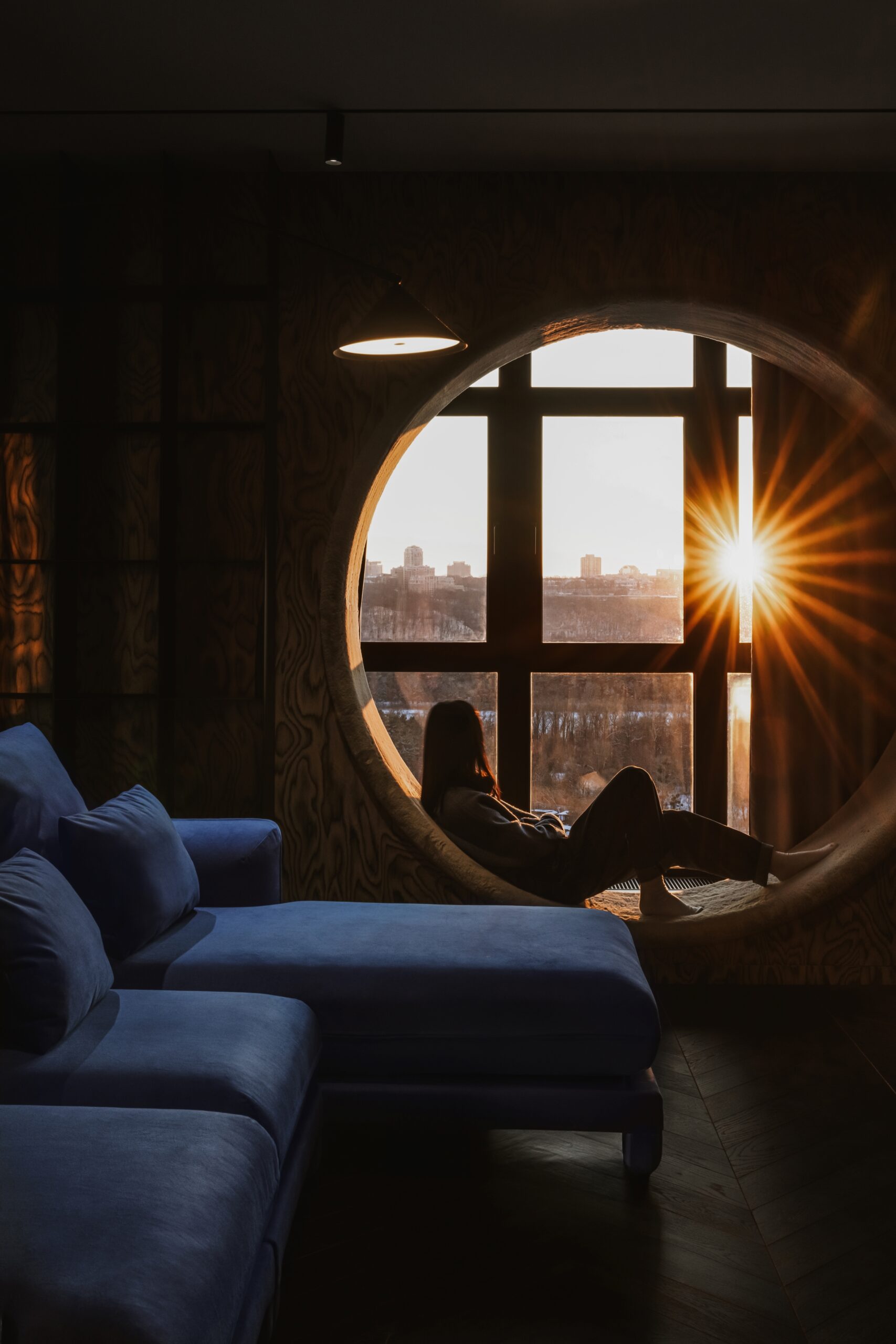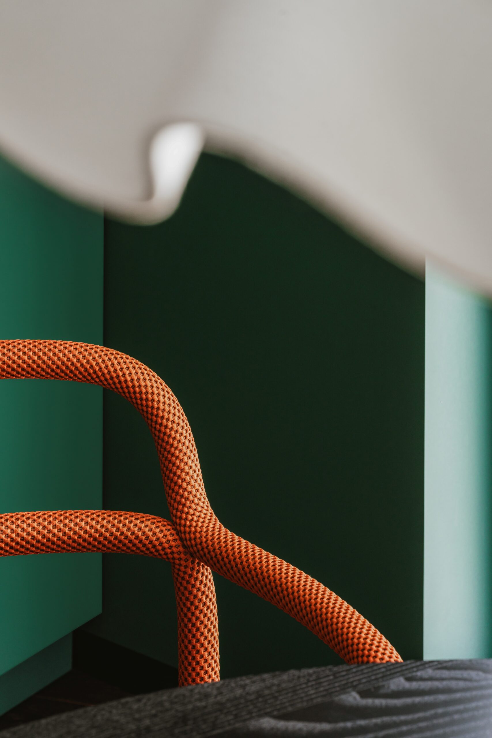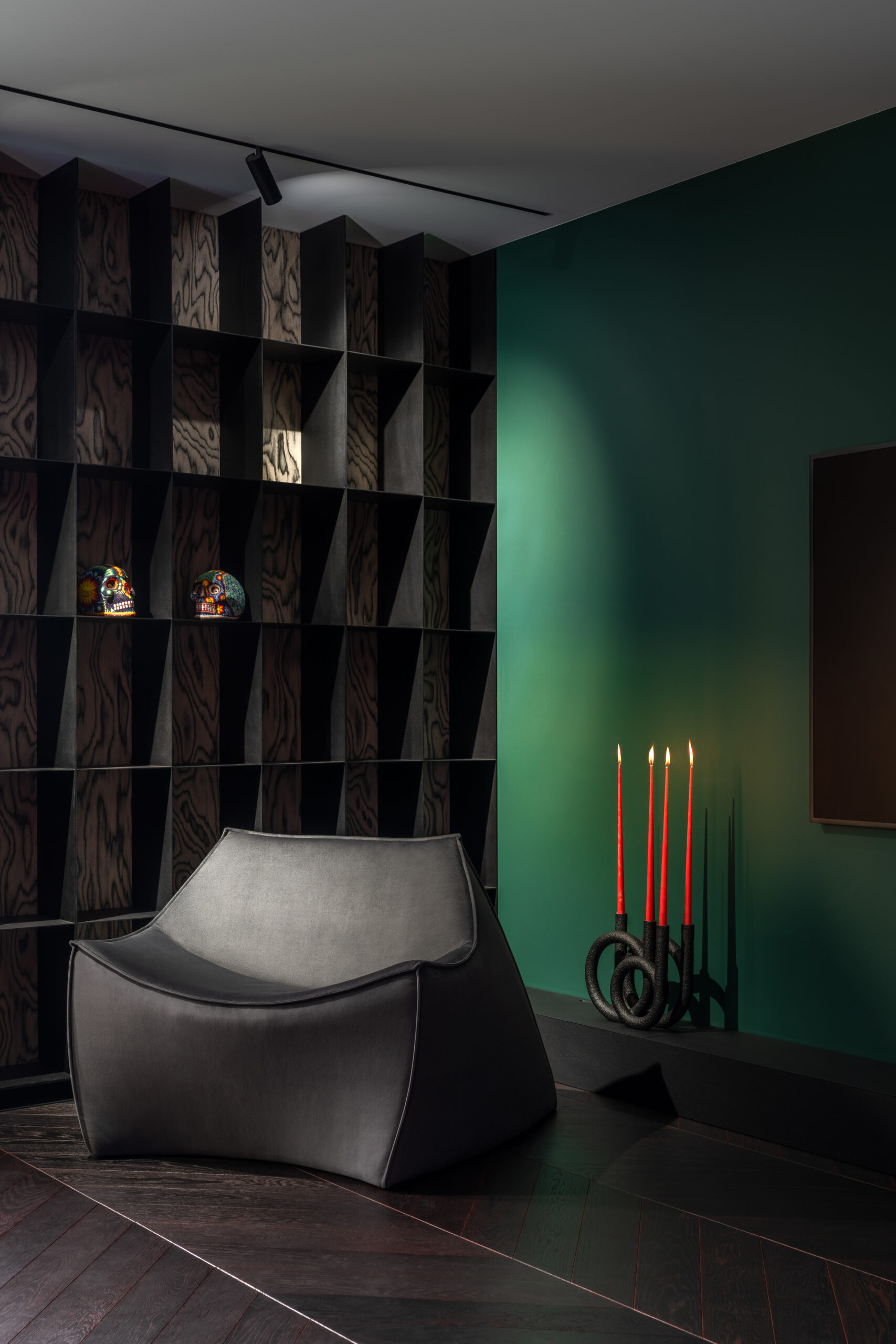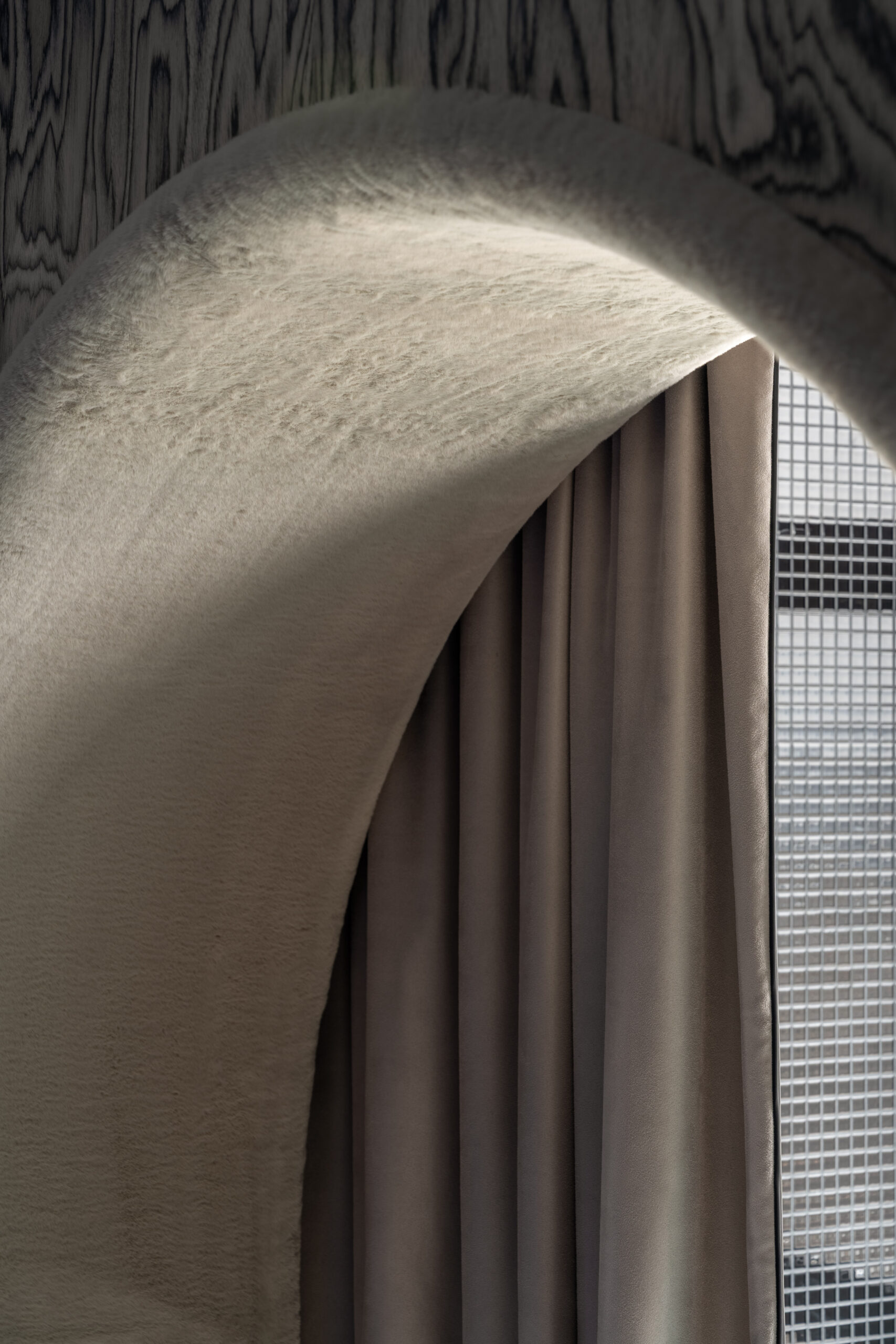Основний колір вітальні – глибокий зелений. Головним акцентом цієї зони є великий круглий отвір у стіні (діаметром 210 см), оздоблений штучним хутром. Це коло – вісь квартири, єдиний вихід на балкон та місце для розслабленого споглядання краєвиду за вікнами. Таке рішення заміняє традиційне крісло або шезлонг і запрошує не лише бути у просторі, а й взаємодіяти з ним.