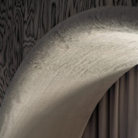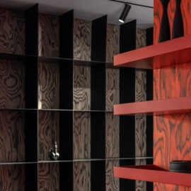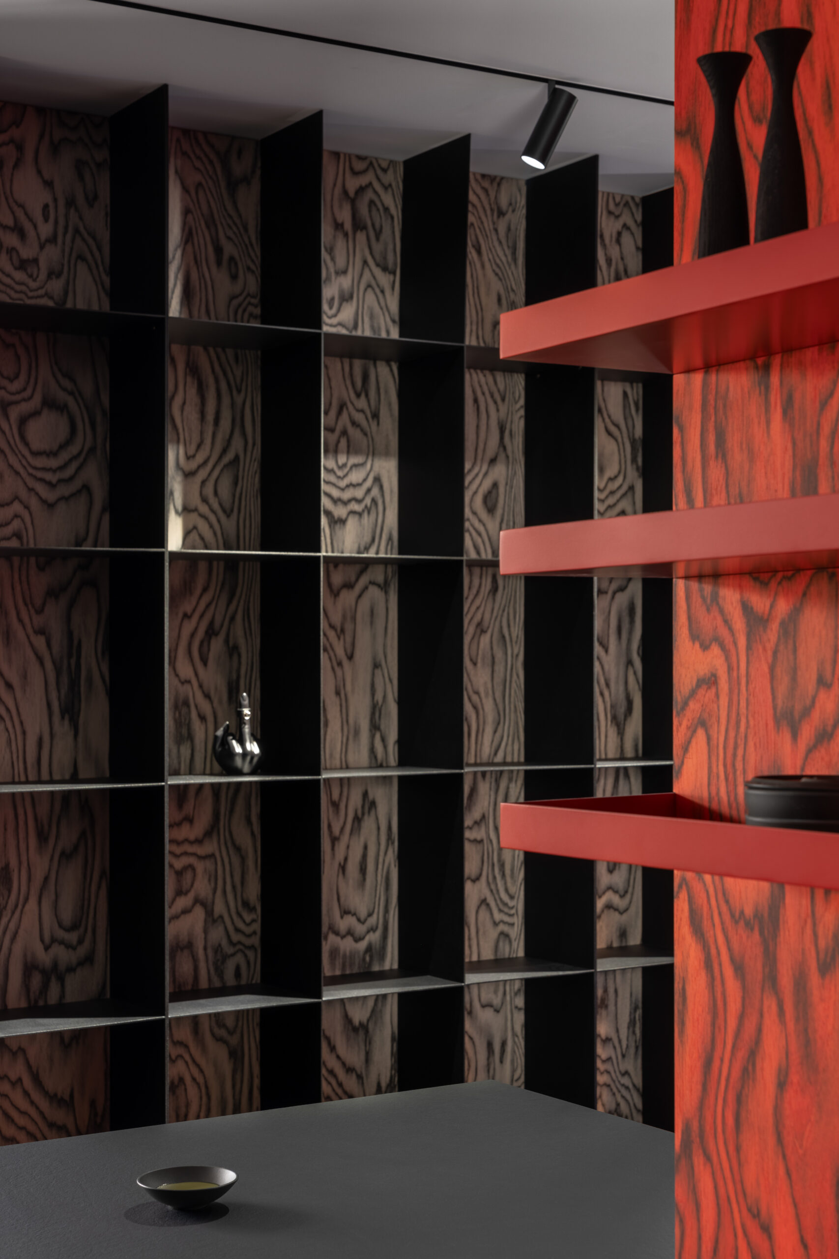 Обабіч кола розміщені металеві полиці для колекції декору та книг, якими пишається власниця квартири. Стіна за ними оздоблена шпоном Alpi з колекції, що створив для бренду легендарний Етторе Соттсасс.