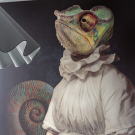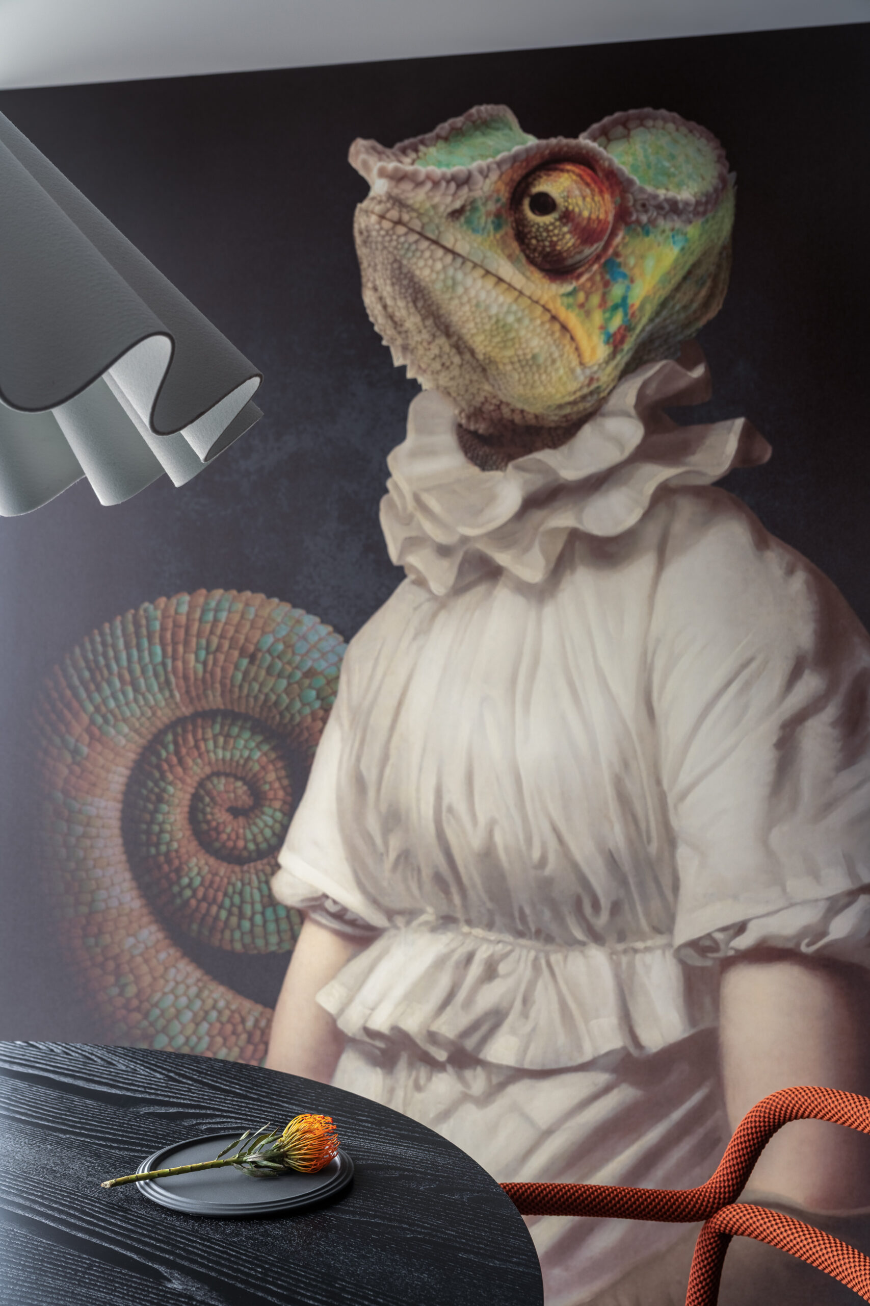 Зона кухні частково відділена від вітальні бетонним пілоном. Оздоблений дзеркалом, він став візуально легшим та менш помітним. Основним акцентом кухні є зображення ящірки у крохмальній сукні, наче з картин класичних живописців – робота українського дизайнера Валерія Кузнєцова.