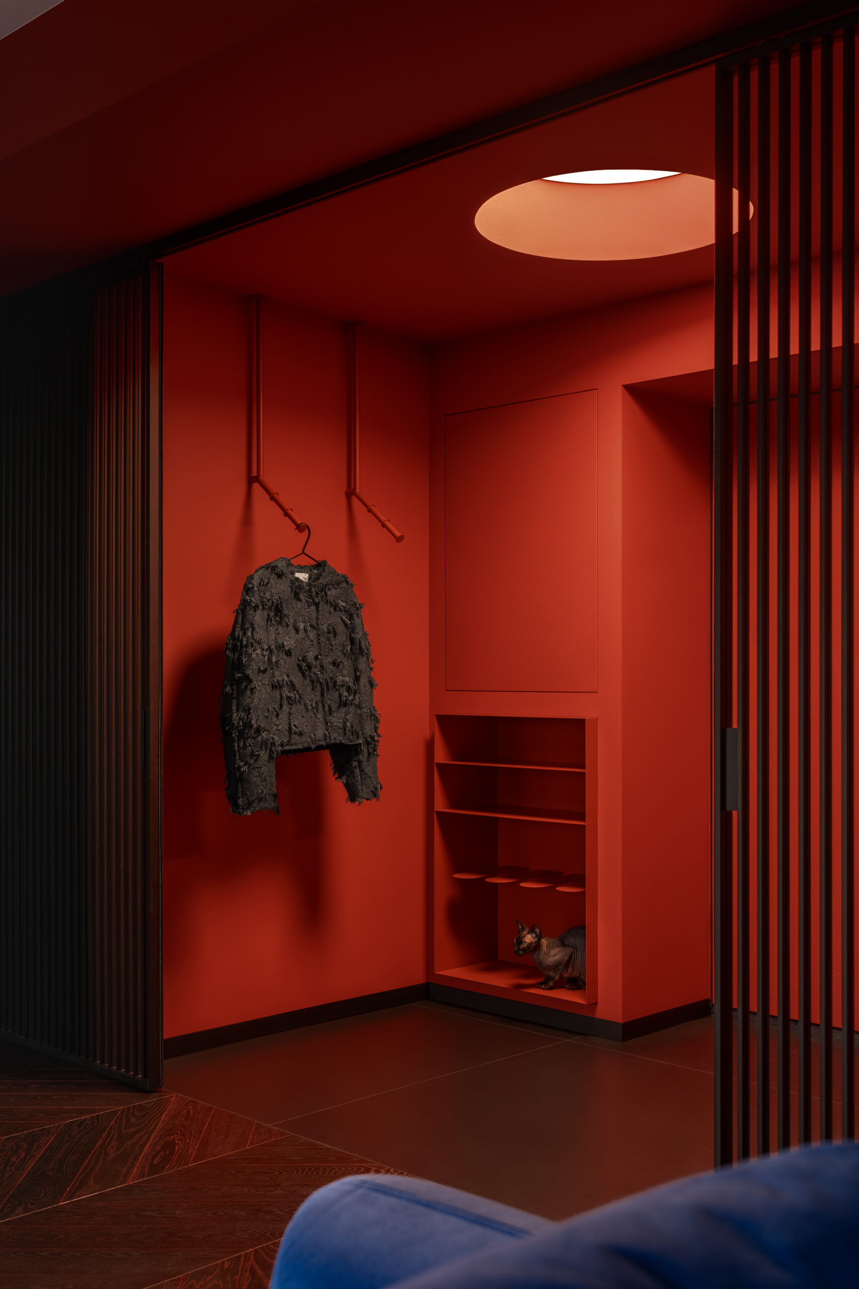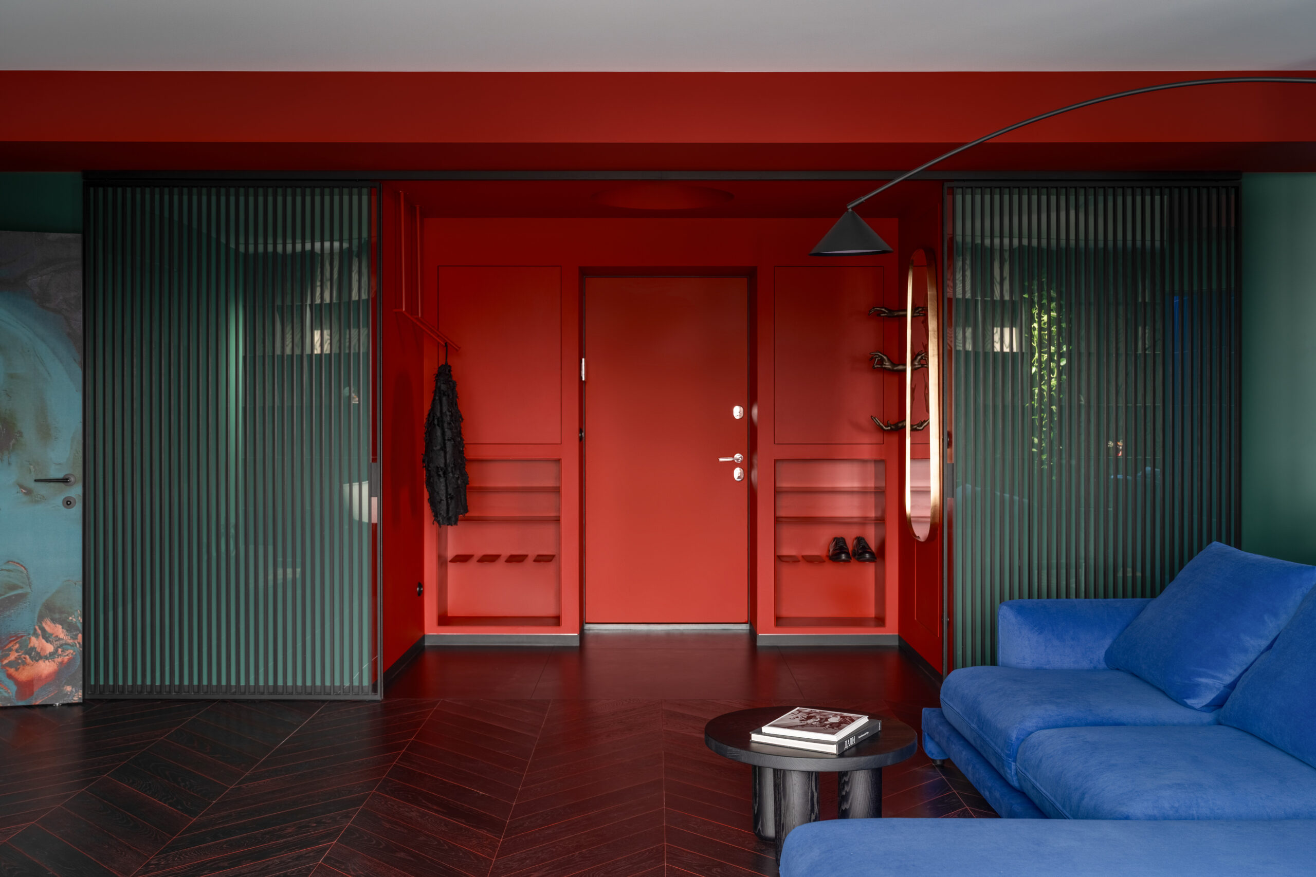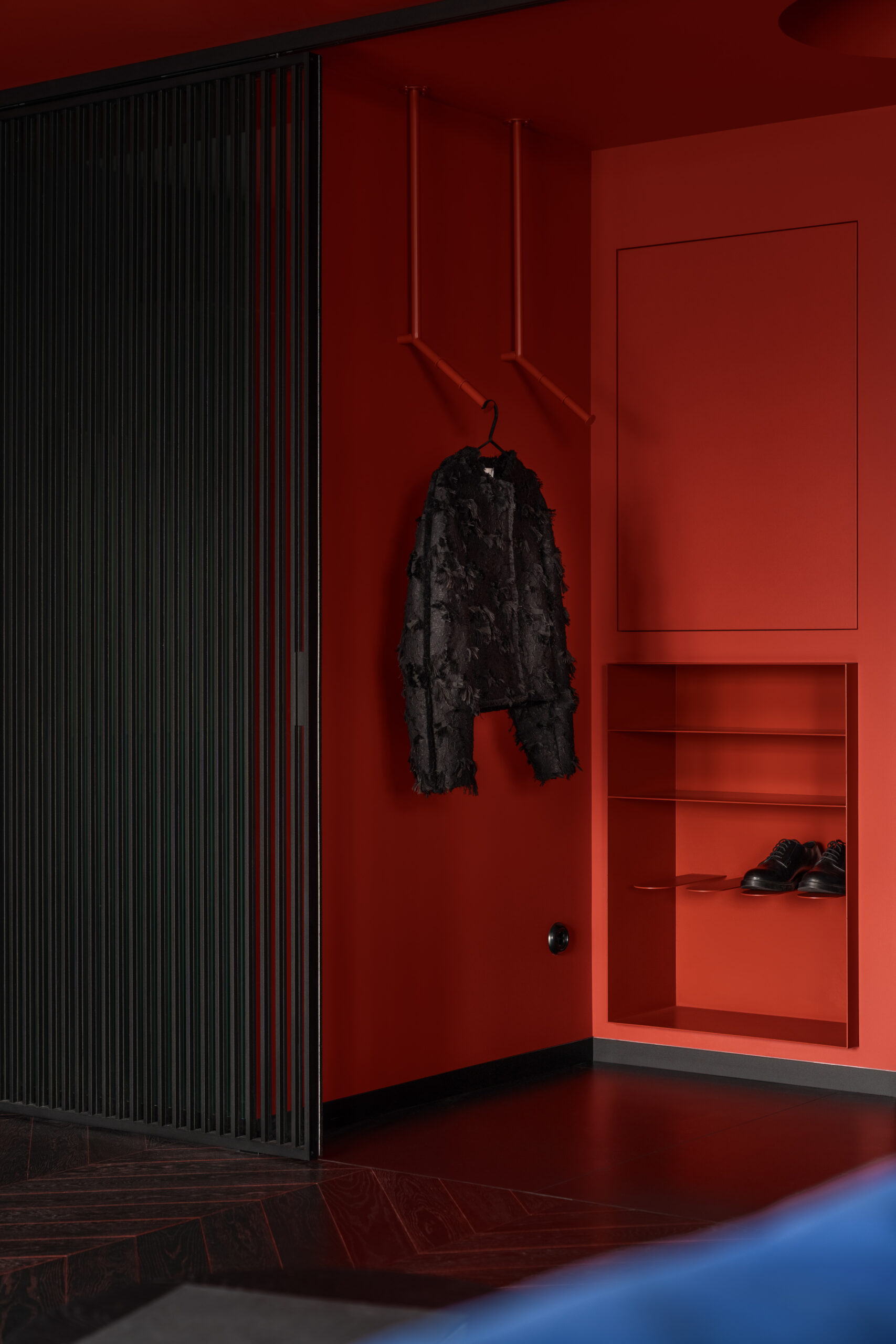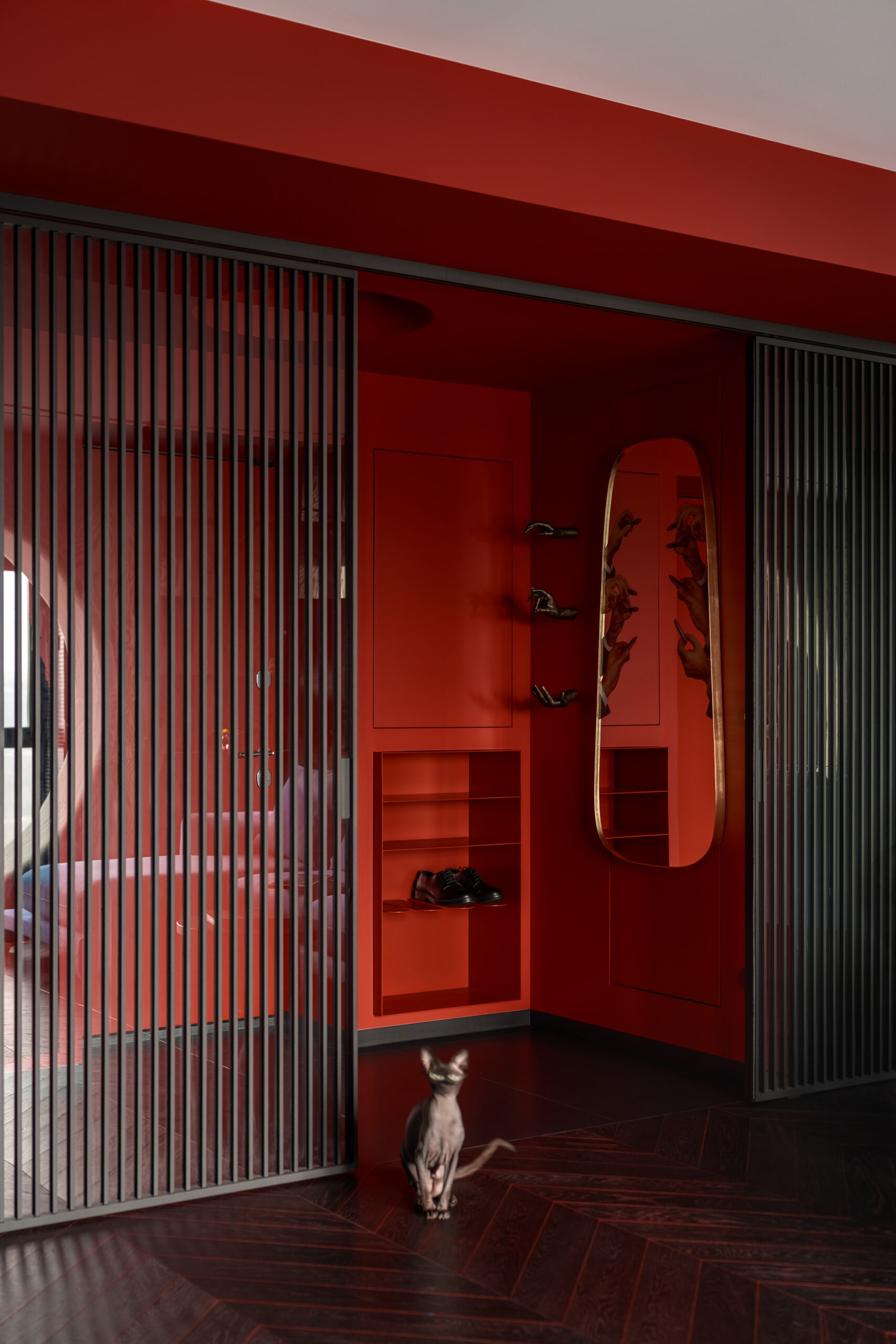 Червоний передпокій відділений від решти простору розсувною скляною перегородкою. Використання наскрізного кольору на стінах і стелі робить цю зону подібною до кімнати лялькового будинку. Металеві полиці для взуття заглиблені у стіни, дверцята над ними ведуть до технічних комунікацій. Верхній світильник, втоплений в поверхні стелі, – лаконічне та водночас футуристичне рішення.