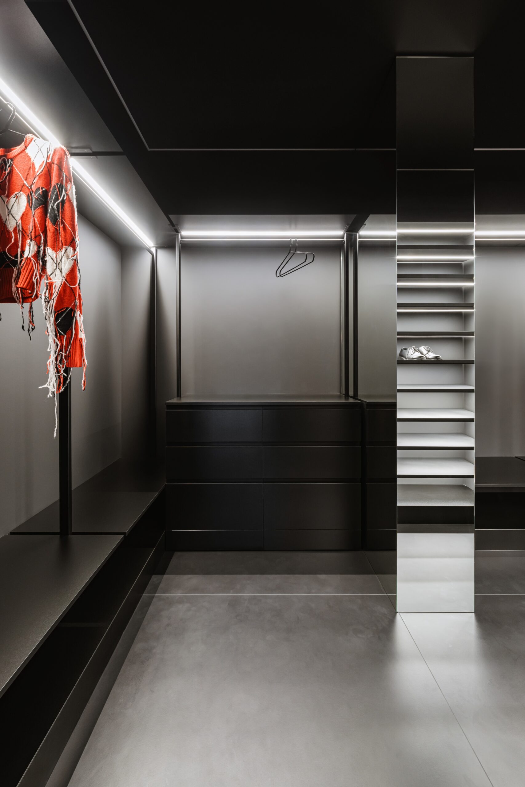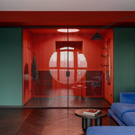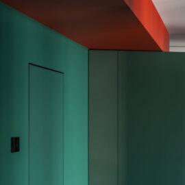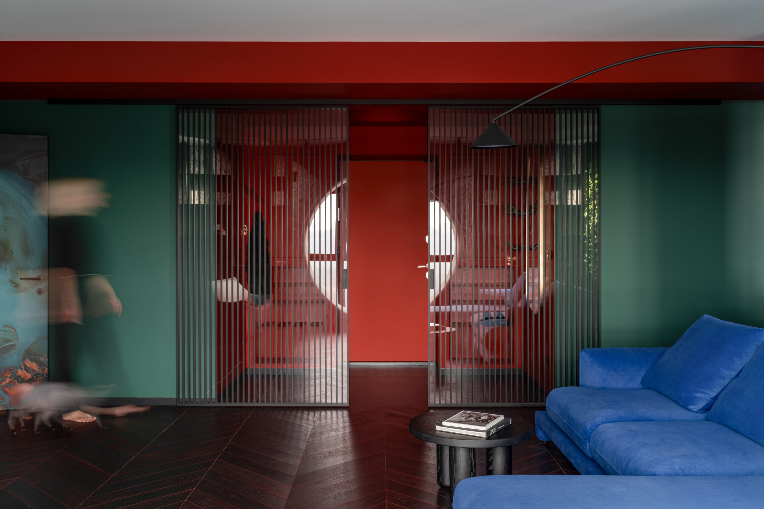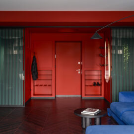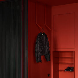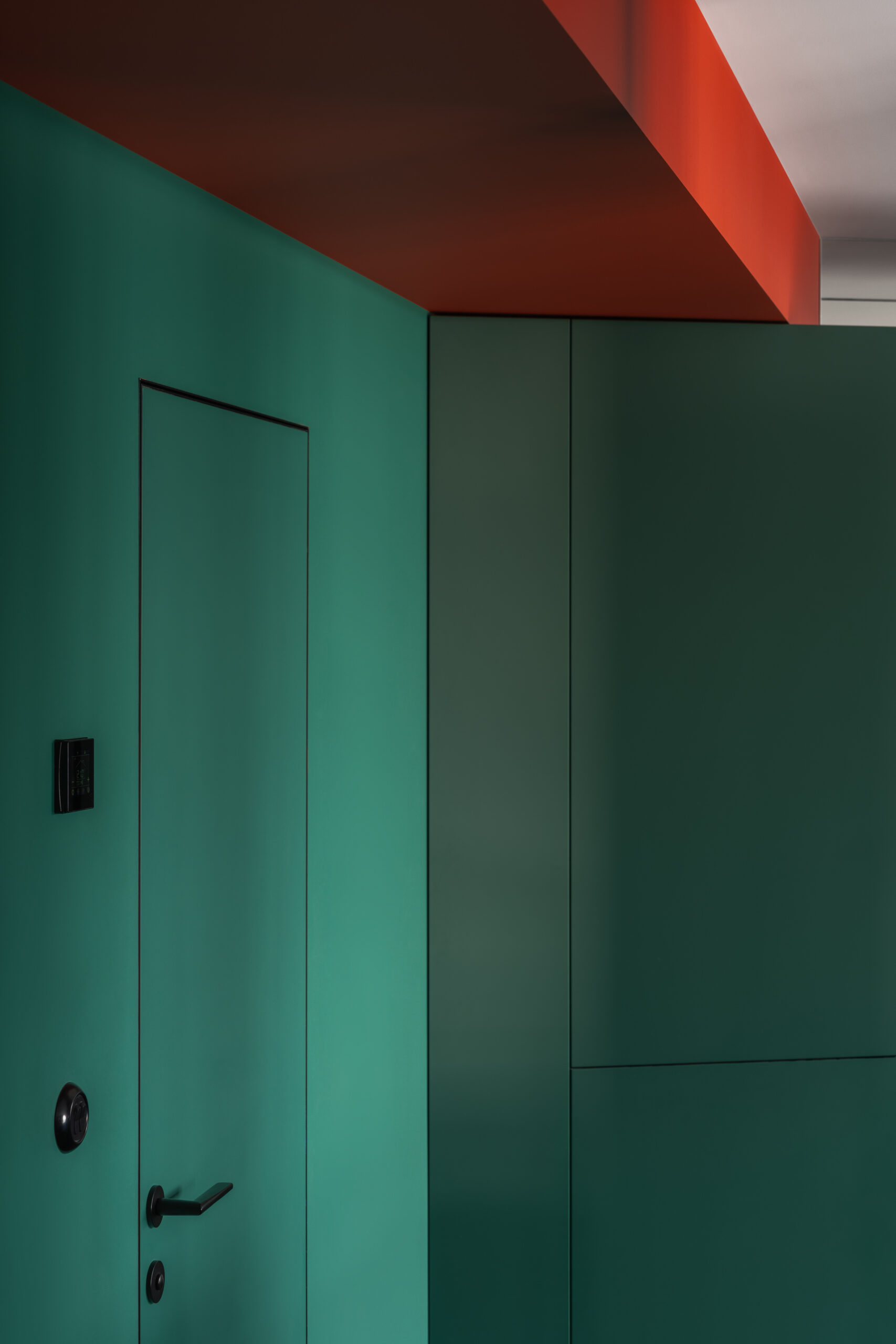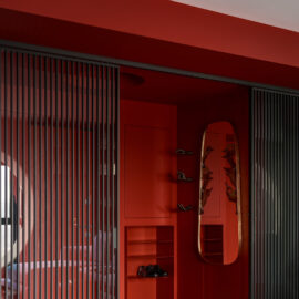 Червоний передпокій відділений від решти простору розсувною скляною перегородкою. Використання наскрізного кольору на стінах і стелі робить цю зону подібною до кімнати лялькового будинку. Металеві полиці для взуття заглиблені у стіни, дверцята над ними ведуть до технічних комунікацій. Верхній світильник, втоплений в поверхні стелі, – лаконічне та водночас футуристичне рішення.