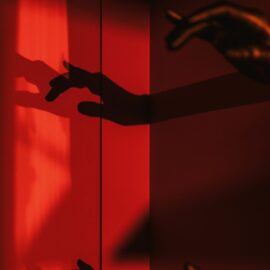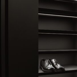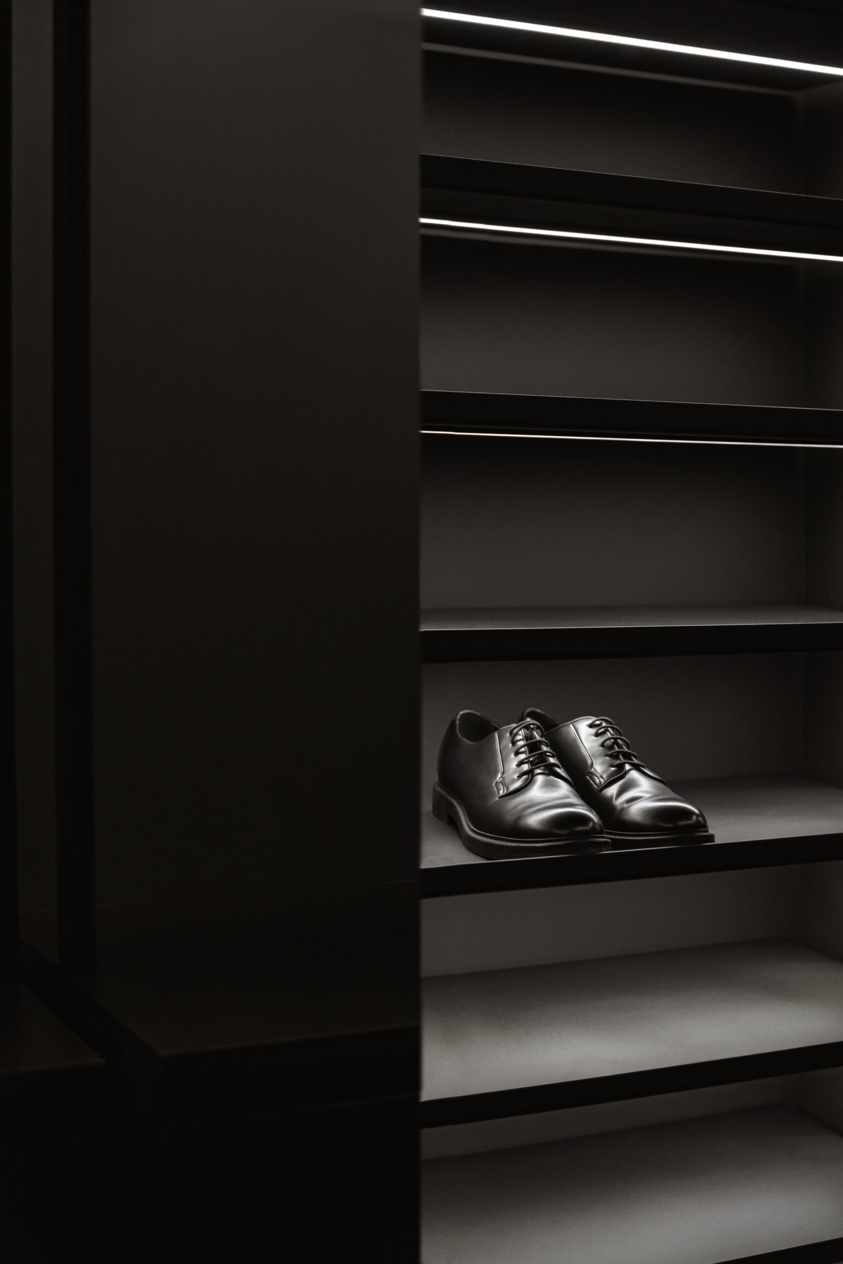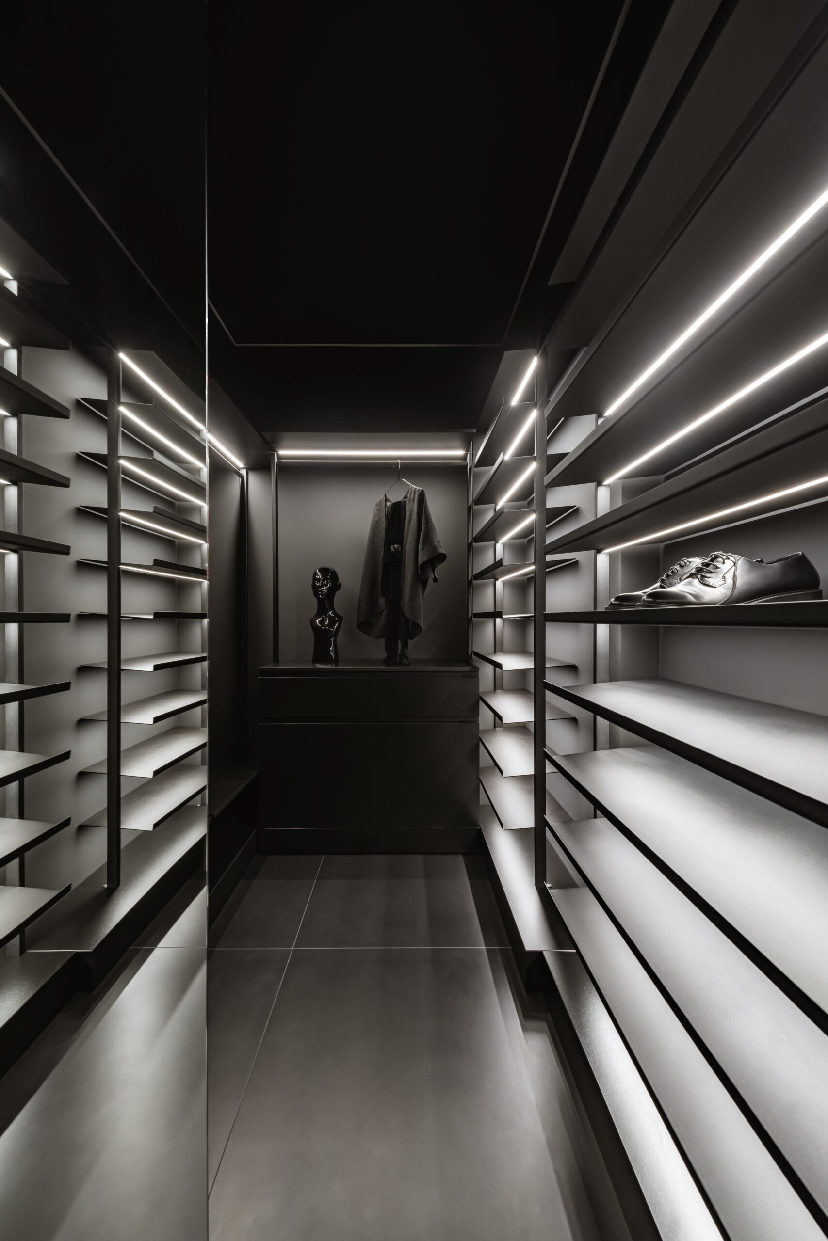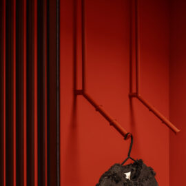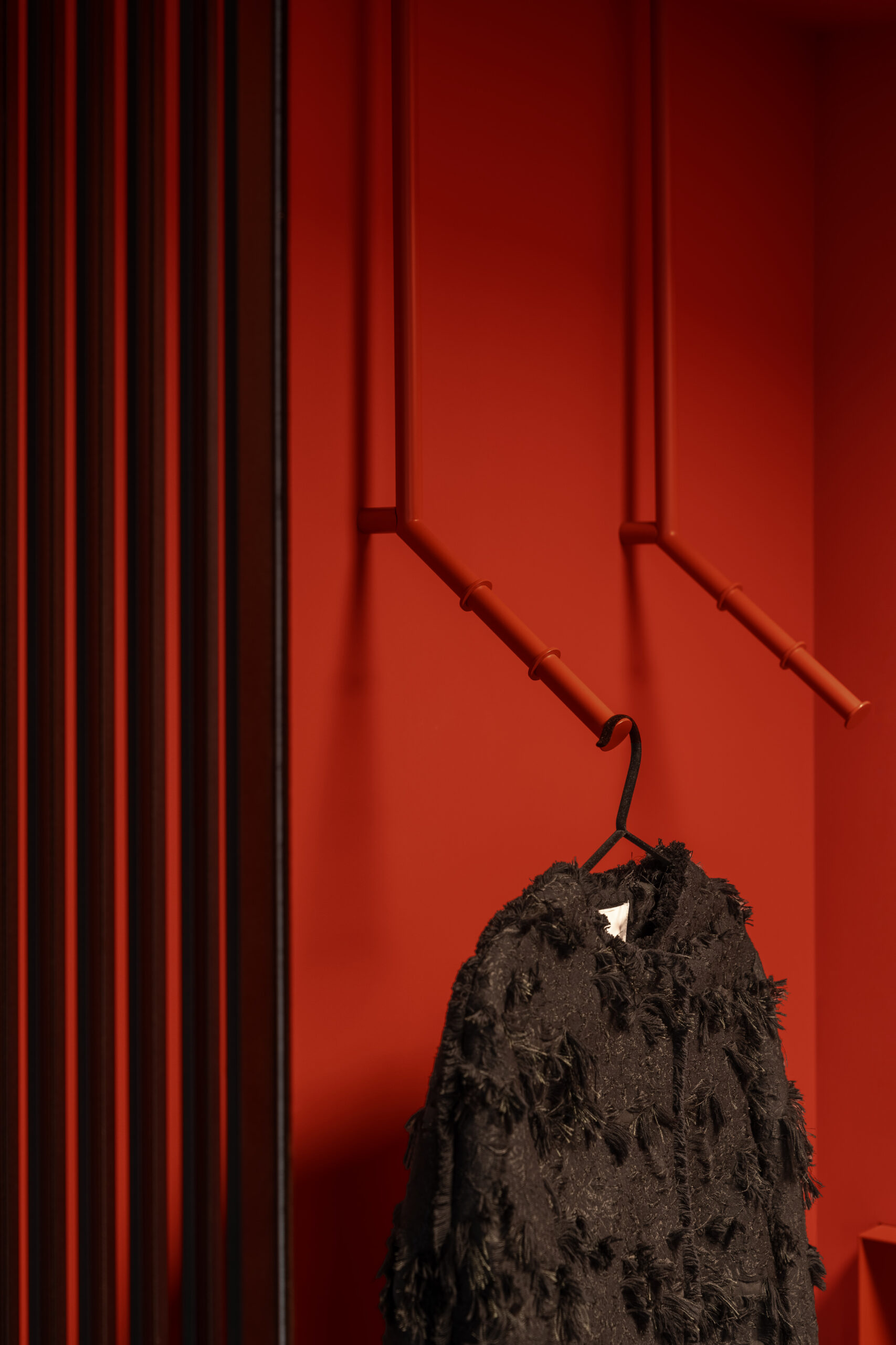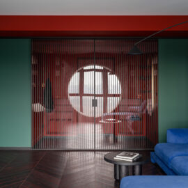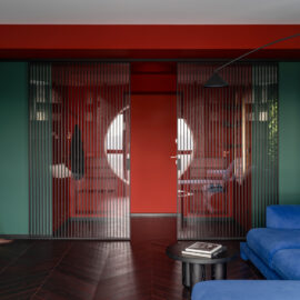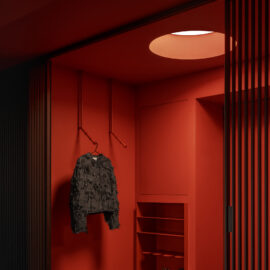 Червоний передпокій відділений від решти простору розсувною скляною перегородкою. Використання наскрізного кольору на стінах і стелі робить цю зону подібною до кімнати лялькового будинку. Металеві полиці для взуття заглиблені у стіни, дверцята над ними ведуть до технічних комунікацій. Верхній світильник, втоплений в поверхні стелі, – лаконічне та водночас футуристичне рішення.
