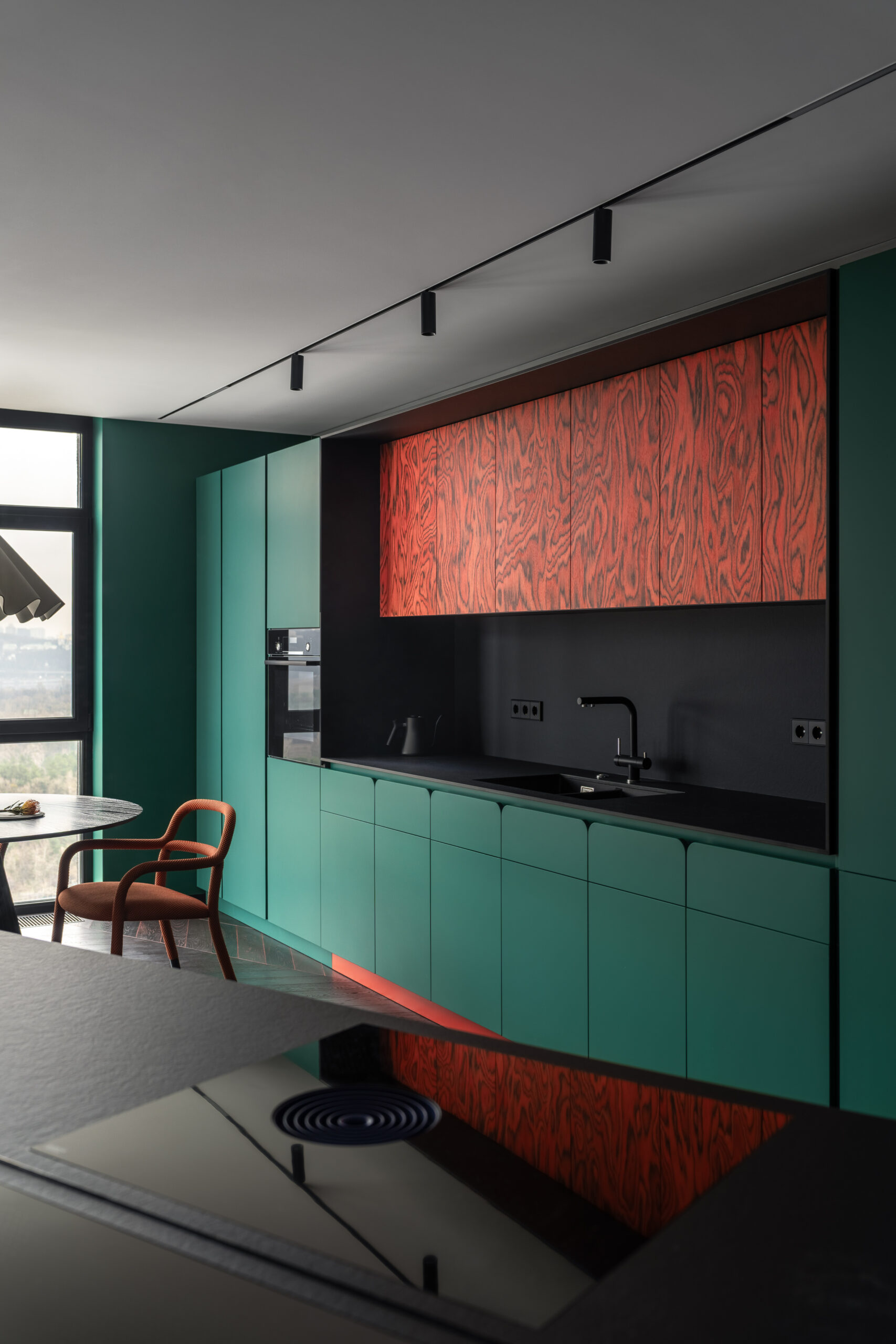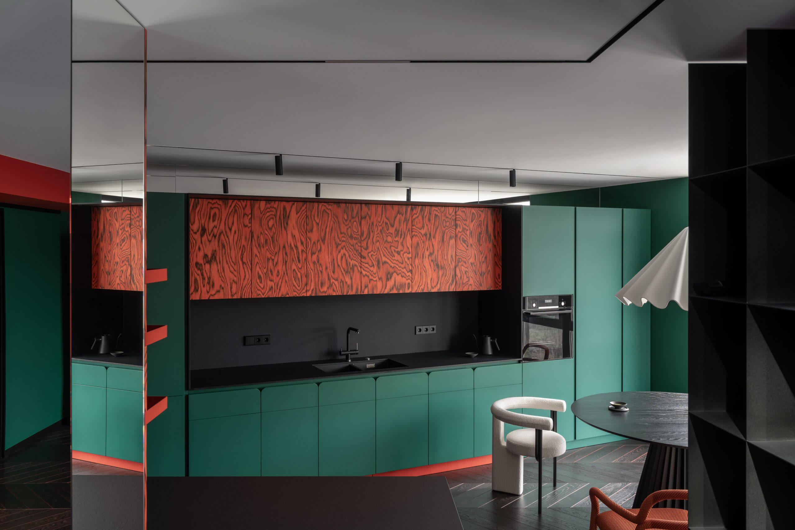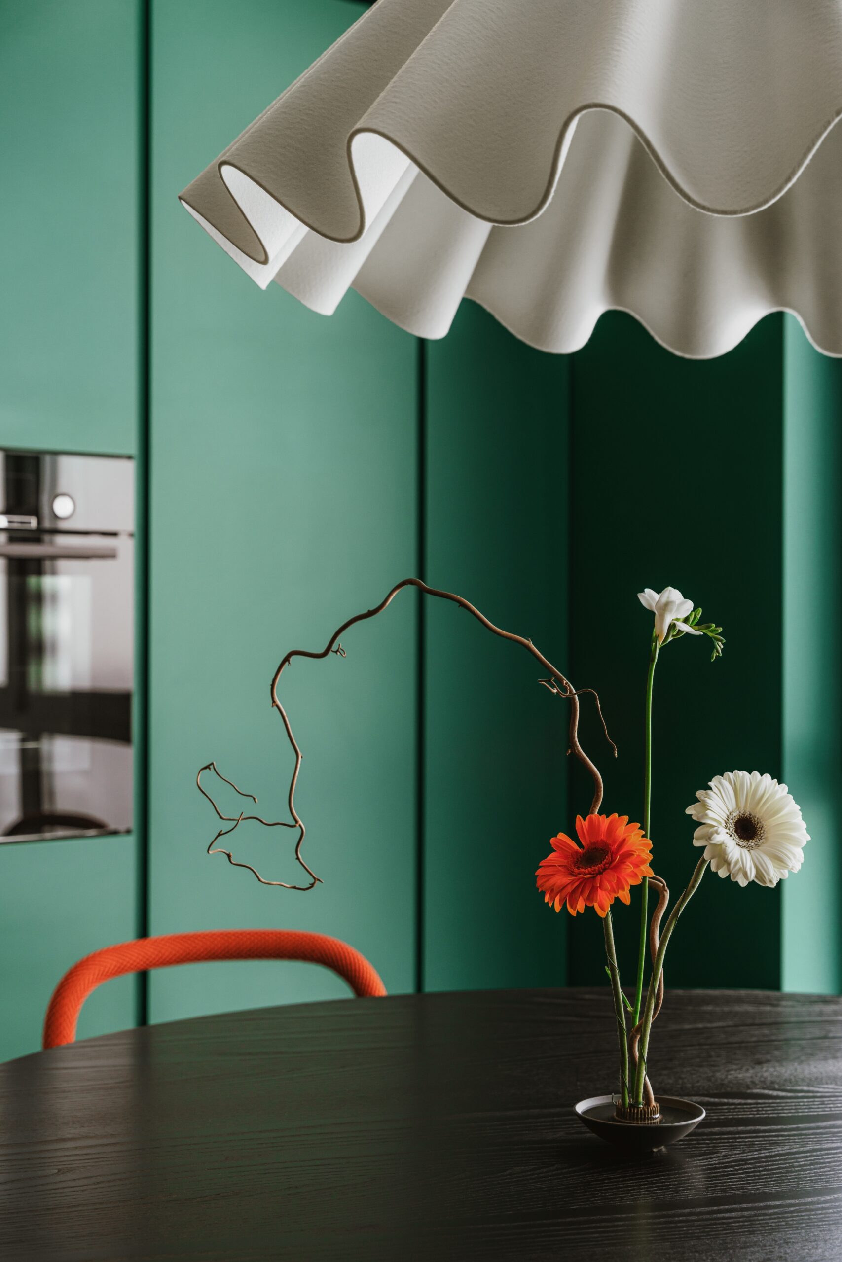 Кухонні меблі виконані в тому ж кольорі, що й стіни вітальні, щоб візуально не перевантажувати простір. Адже конструкція кухні має 6 метрів завдовжки, це дозволило інтегрувати в неї всю необхідну техніку та передбачити чимало простору для зберігання. Нижні зелені фасади мають заокруглені кути, а фасади верхніх навісних шаф оздоблені шпоном Alpi у червоному кольорі. Довкола круглого обіднього столу розміщені стільці різних моделей у червоній та білій оббивці. Над столом низько спущена масивна лампа з повсті данського бренду Audo.