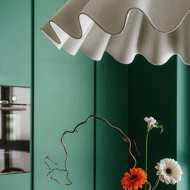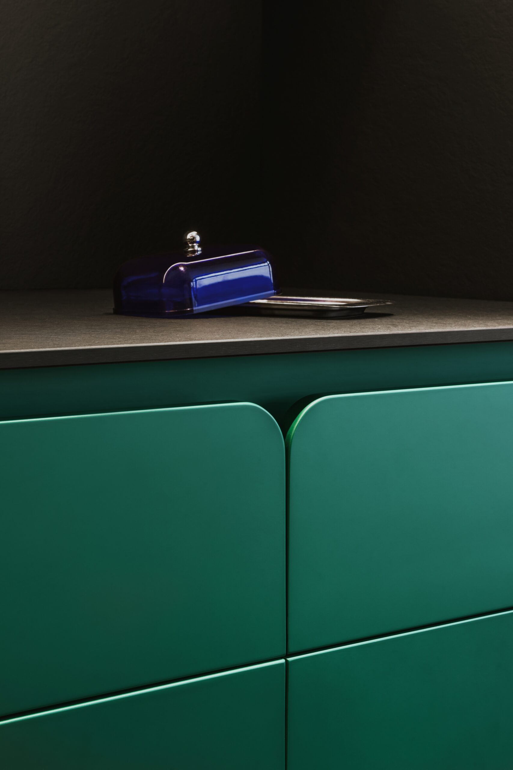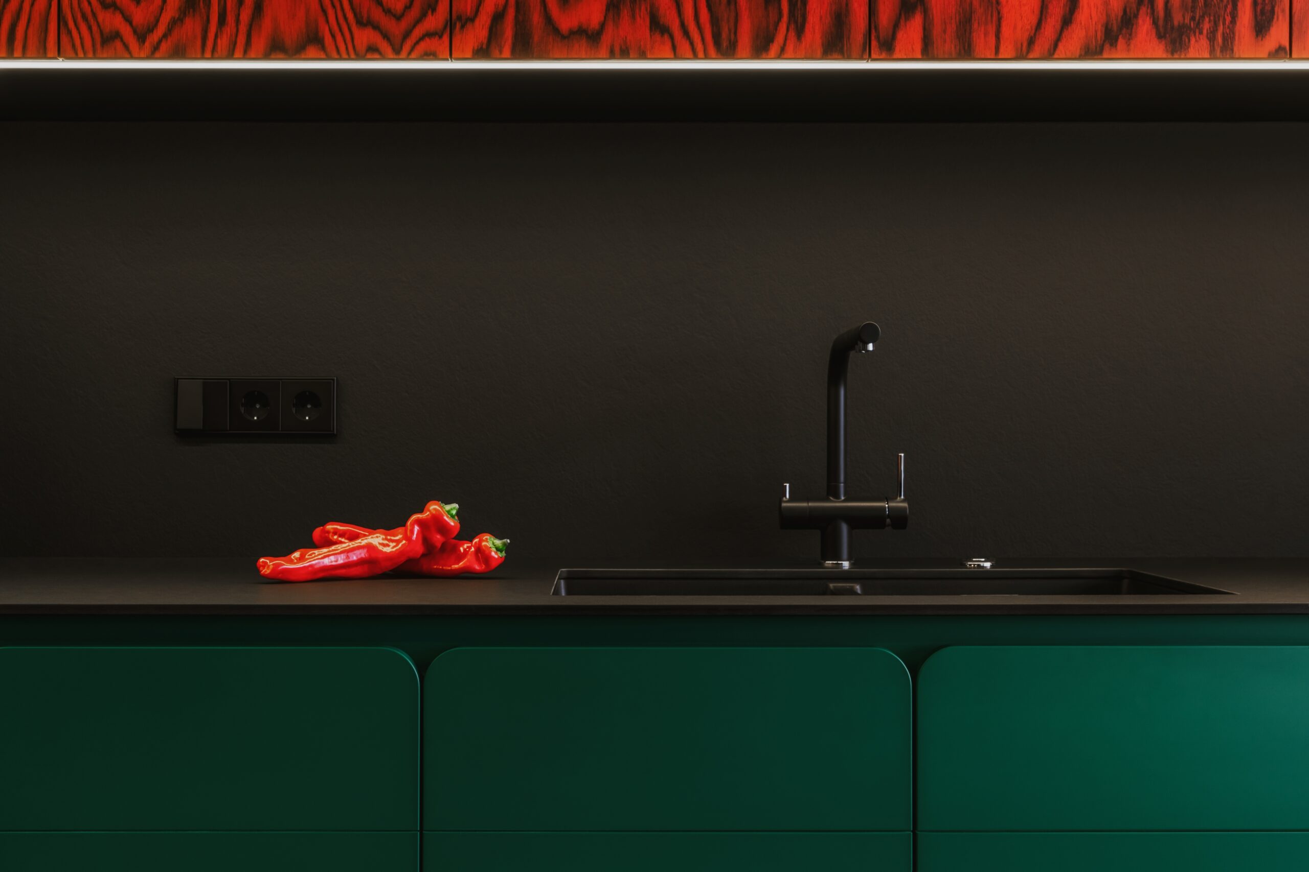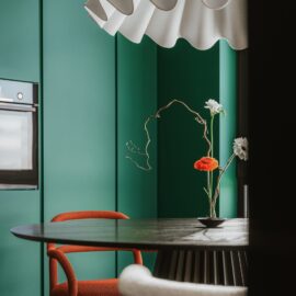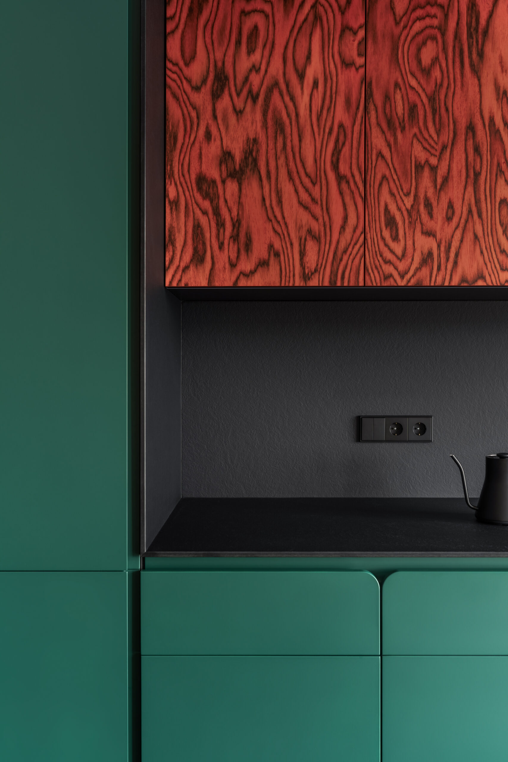 Кухонні меблі виконані в тому ж кольорі, що й стіни вітальні, щоб візуально не перевантажувати простір. Адже конструкція кухні має 6 метрів завдовжки, це дозволило інтегрувати в неї всю необхідну техніку та передбачити чимало простору для зберігання. Нижні зелені фасади мають заокруглені кути, а фасади верхніх навісних шаф оздоблені шпоном Alpi у червоному кольорі. Довкола круглого обіднього столу розміщені стільці різних моделей у червоній та білій оббивці. Над столом низько спущена масивна лампа з повсті данського бренду Audo.