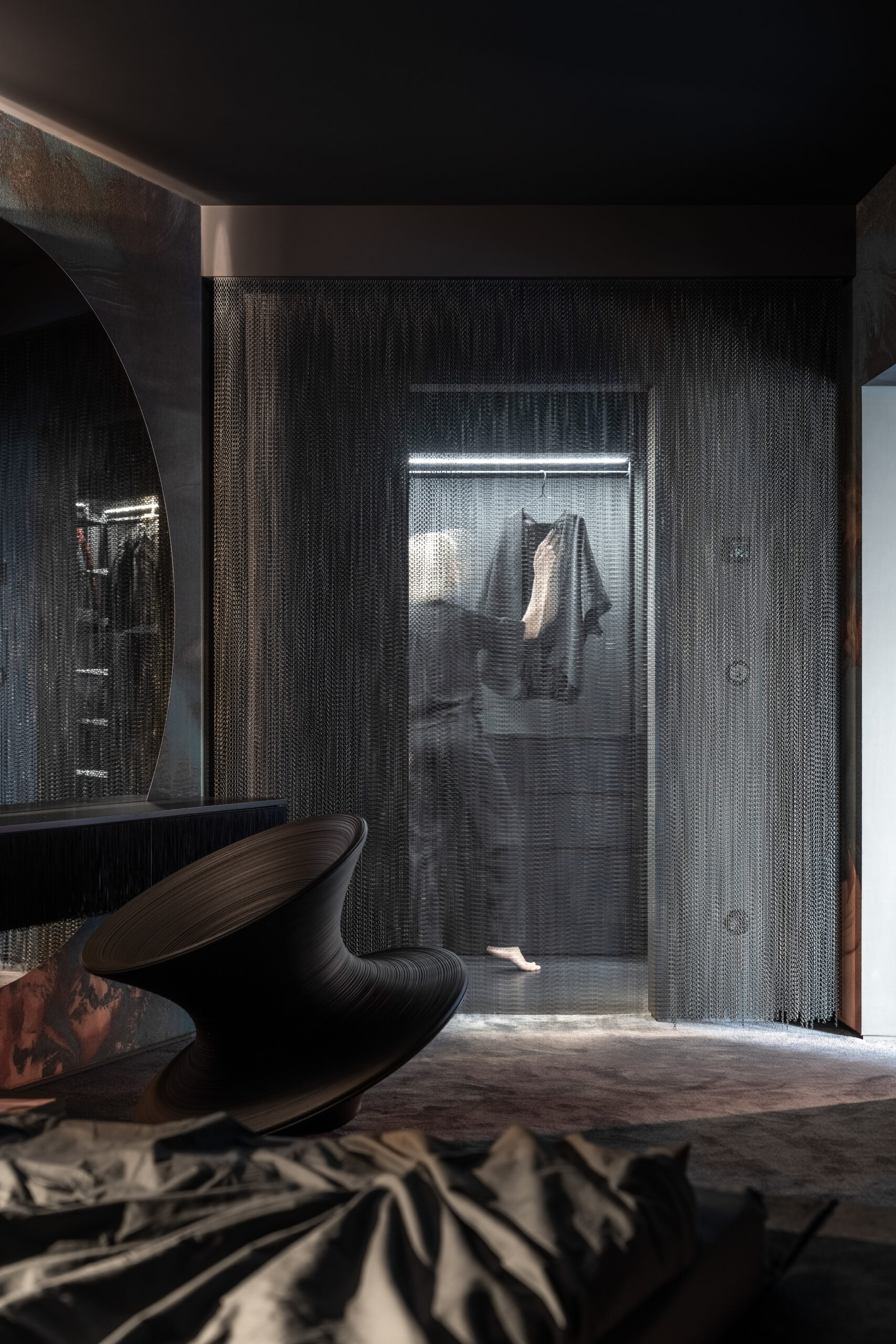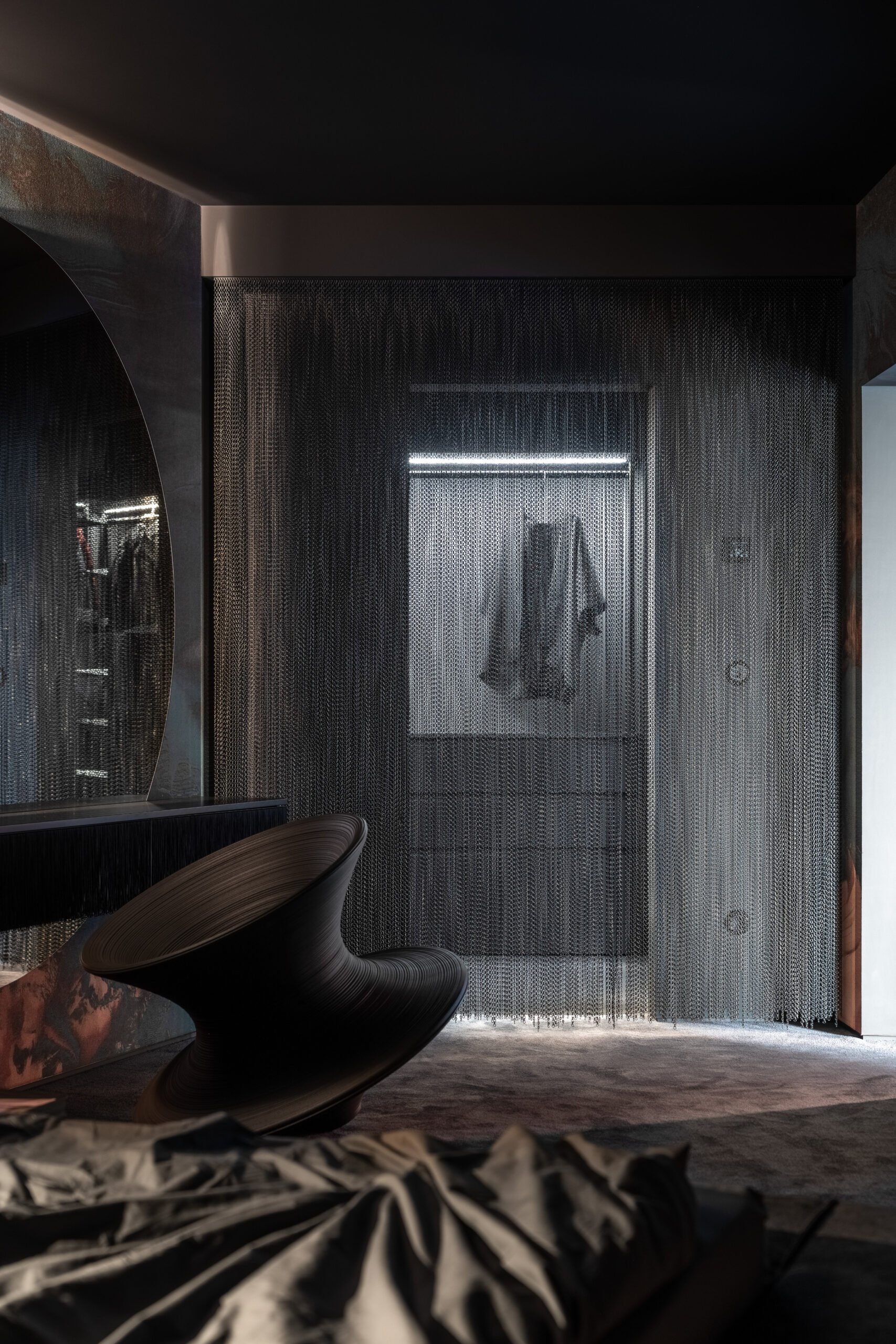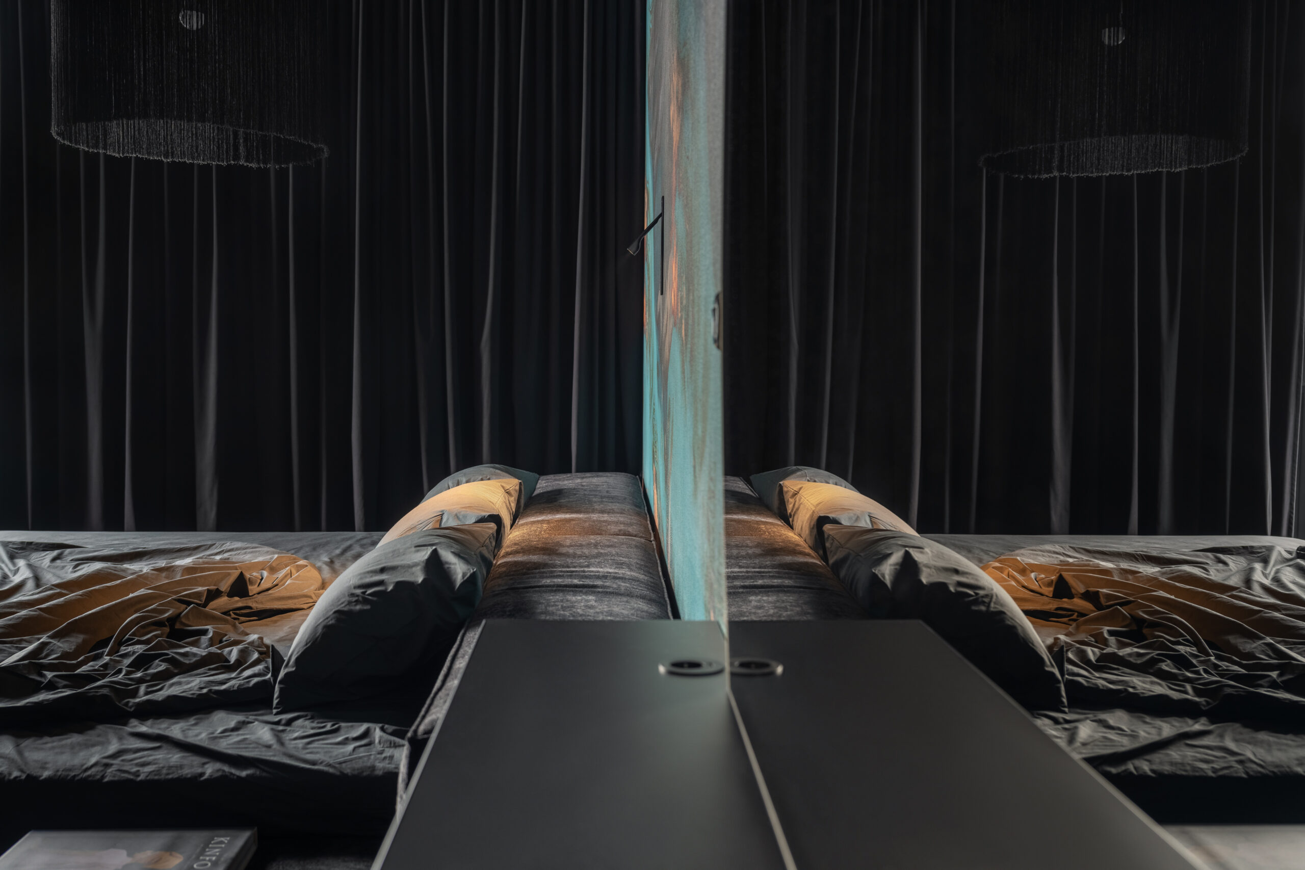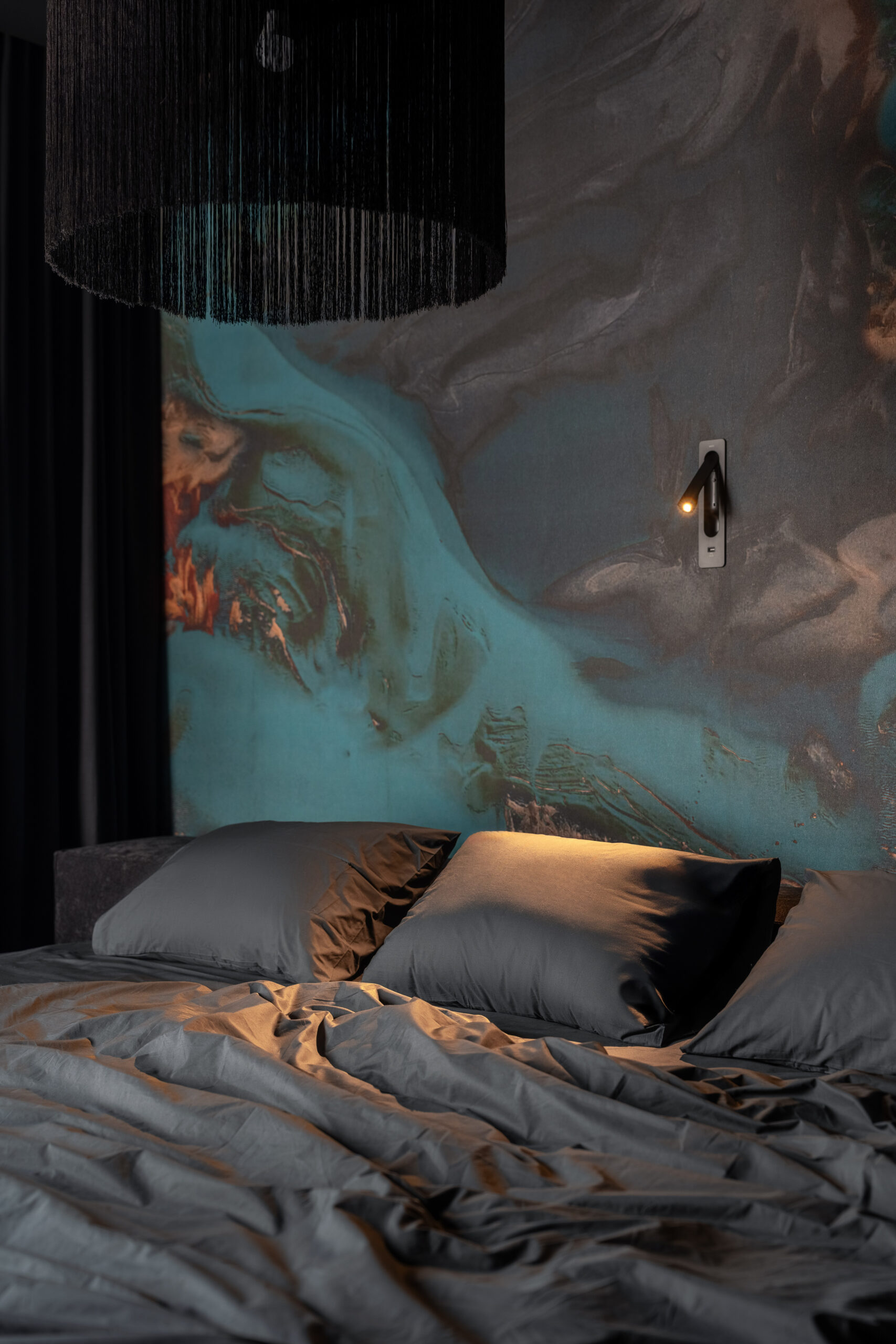 Клієнти хотіли велике ліжко у спальню. Тому спеціально під проект створили модель, площа якої 7 квадратних метрів. Настрій кімнати задають шпалери з фантазійним зображенням від італійського бренду Wall and Deko. Велике кругле дзеркало на стіні має контурну підсвітку позаду, що нагадує астрономічне явище «сонячної корони» під час затемнень. Чорна бахрома на світильниках і фасаді будуарного столу додає нотки грайливості. Дверний прохід, оздоблений металевими шторами-ланцюжками, веде в продуману гардеробну кімнату чорного кольору.