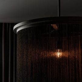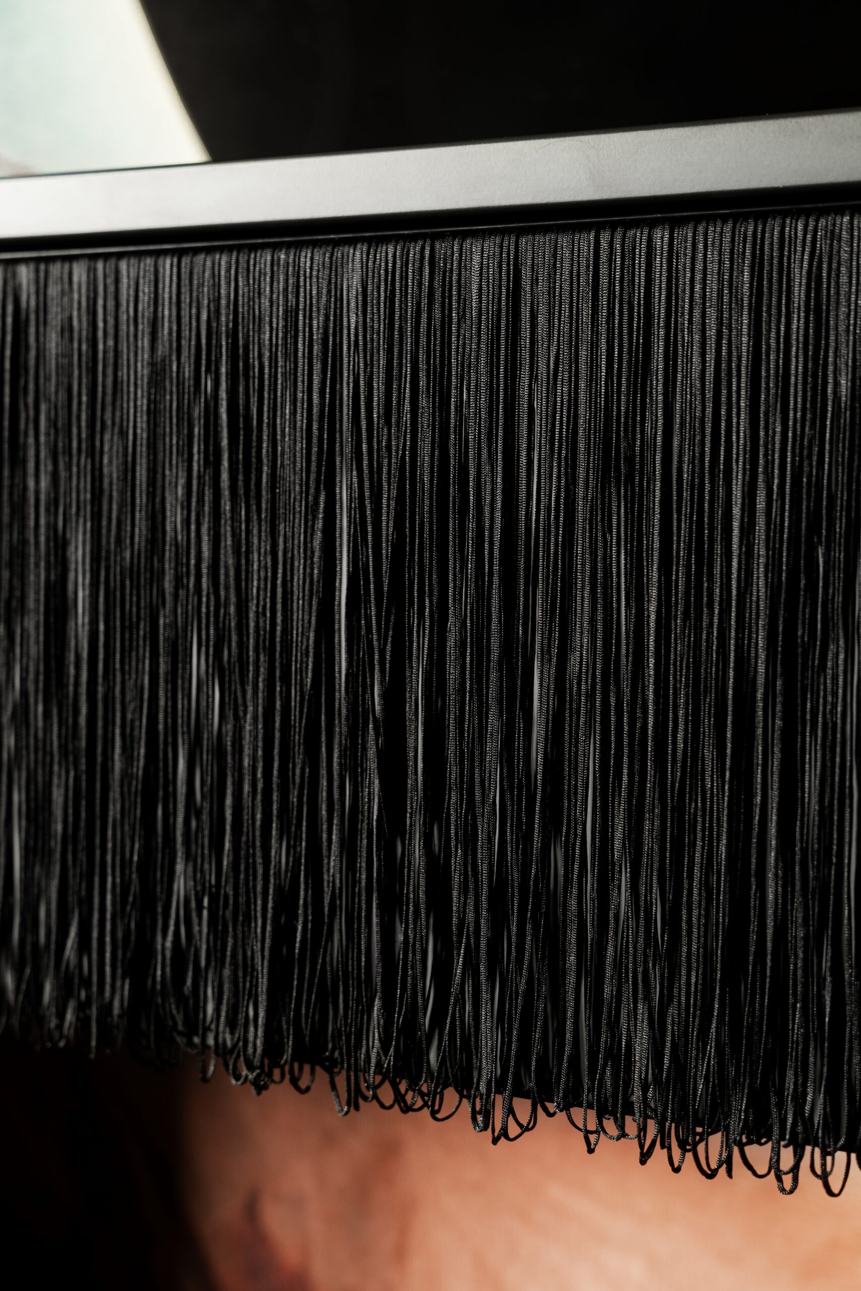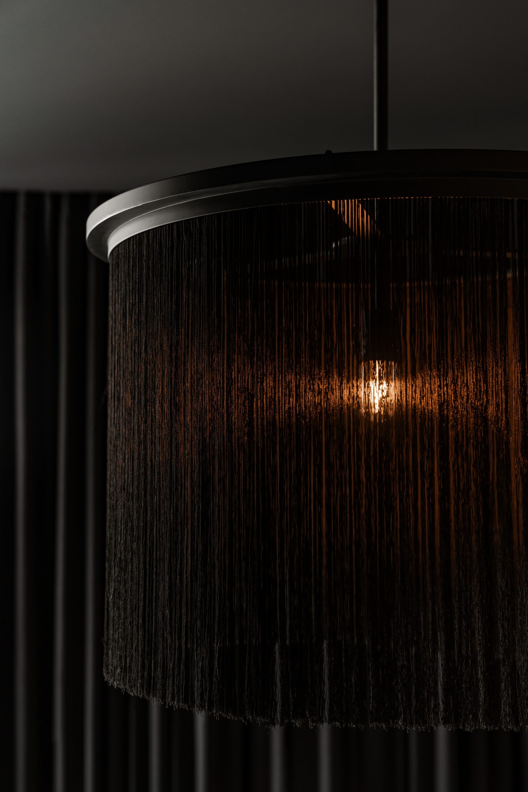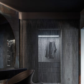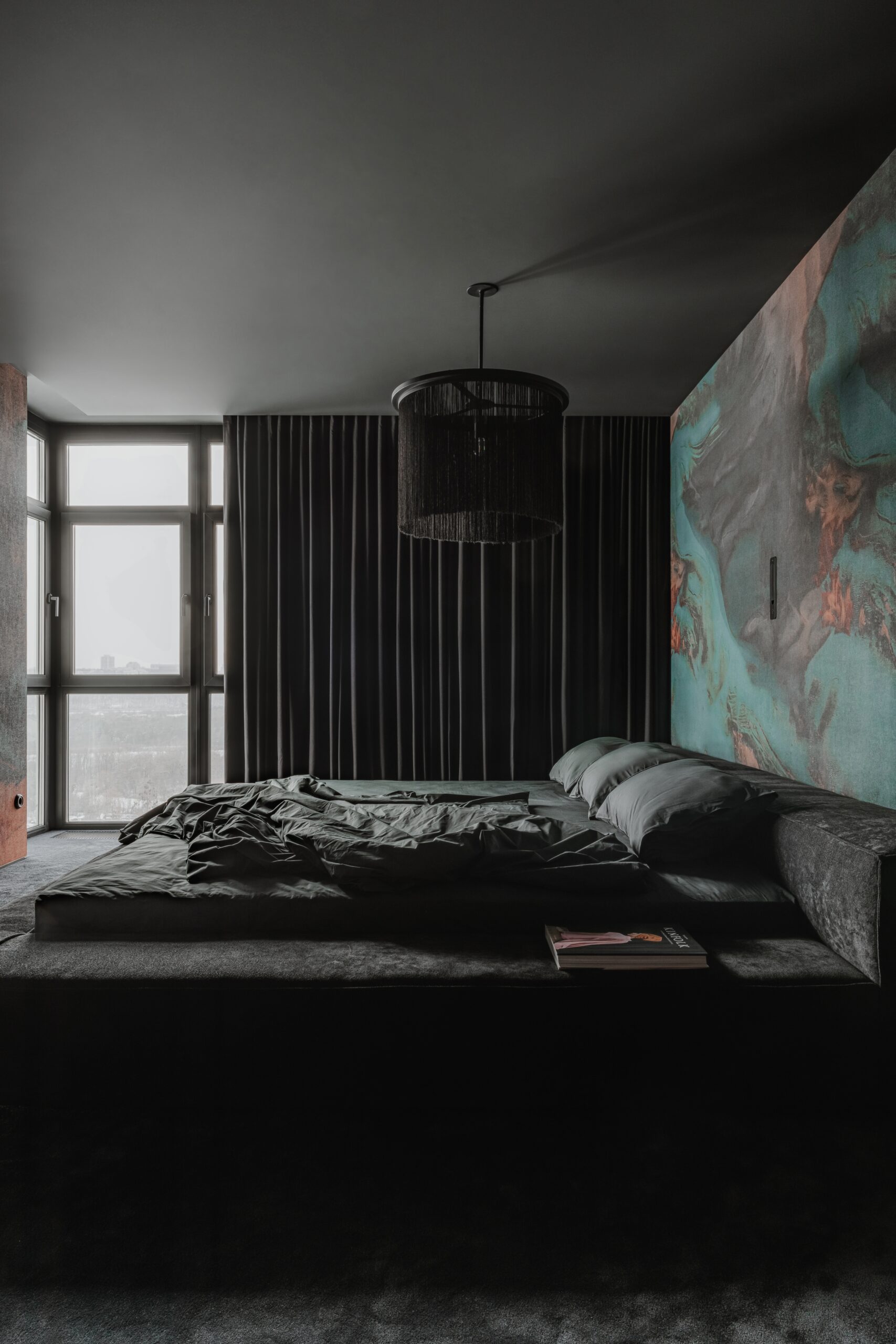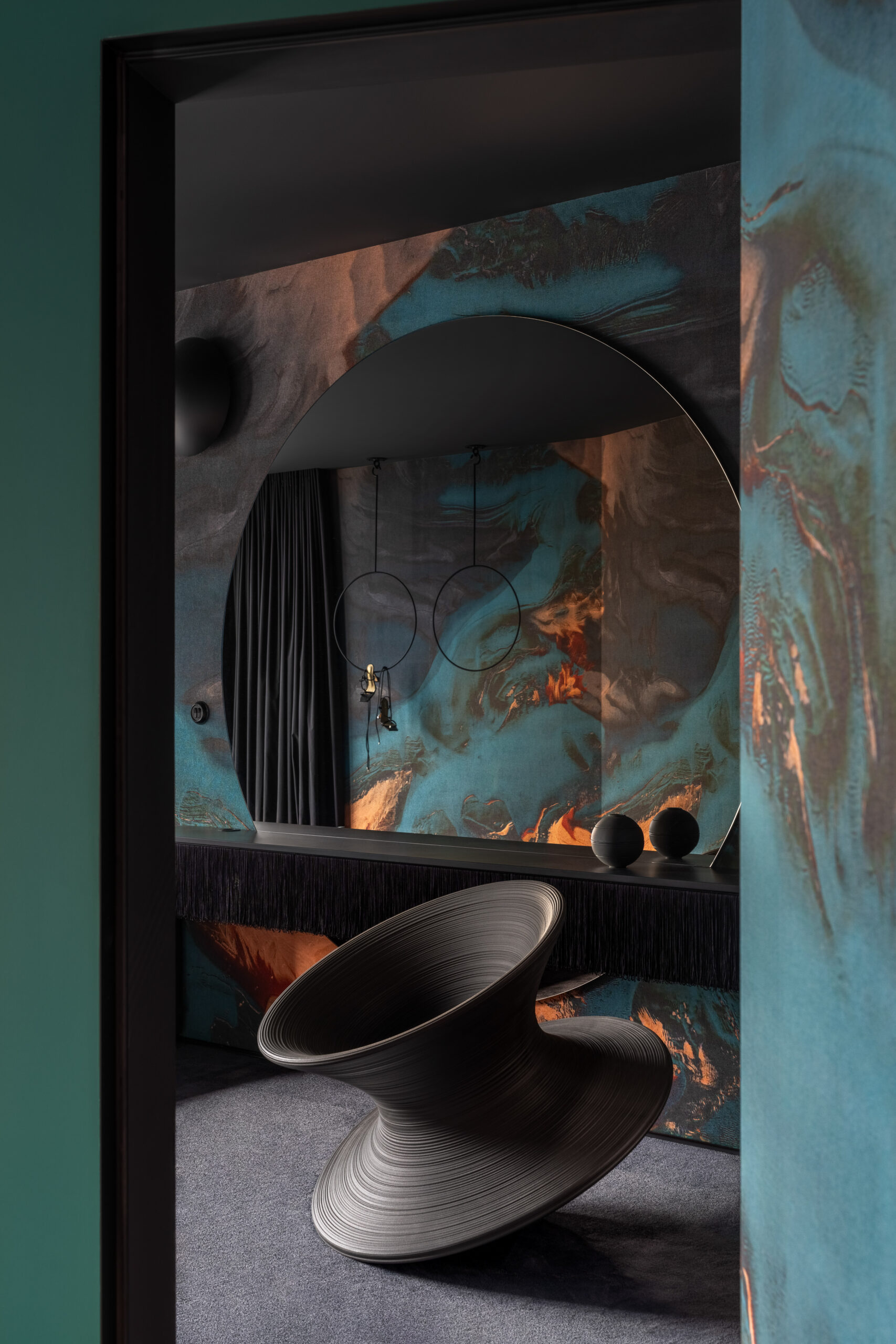 Клієнти хотіли велике ліжко у спальню. Тому спеціально під проект створили модель, площа якої 7 квадратних метрів. Настрій кімнати задають шпалери з фантазійним зображенням від італійського бренду Wall and Deko. Велике кругле дзеркало на стіні має контурну підсвітку позаду, що нагадує астрономічне явище «сонячної корони» під час затемнень. Чорна бахрома на світильниках і фасаді будуарного столу додає нотки грайливості. Дверний прохід, оздоблений металевими шторами-ланцюжками, веде в продуману гардеробну кімнату чорного кольору.