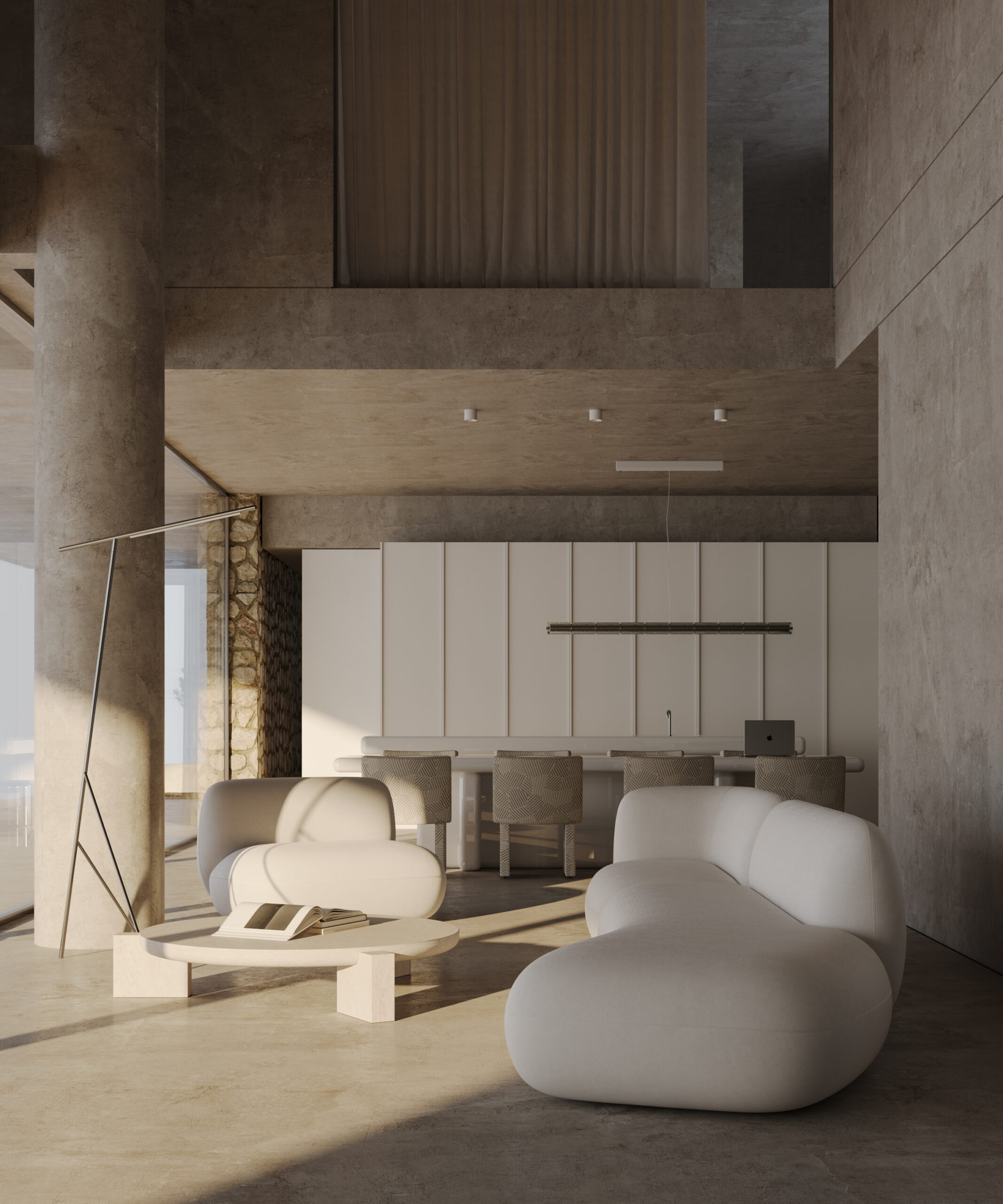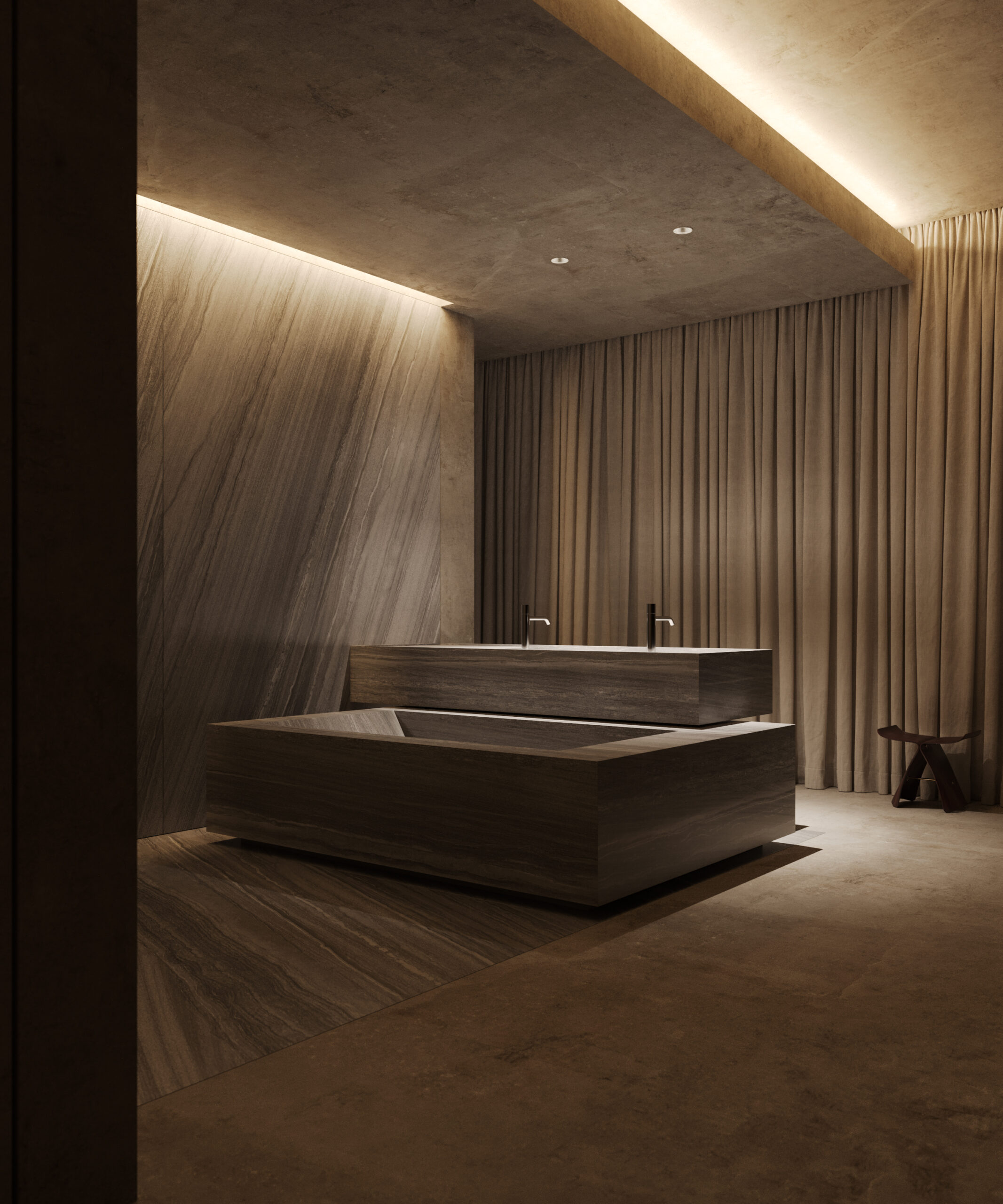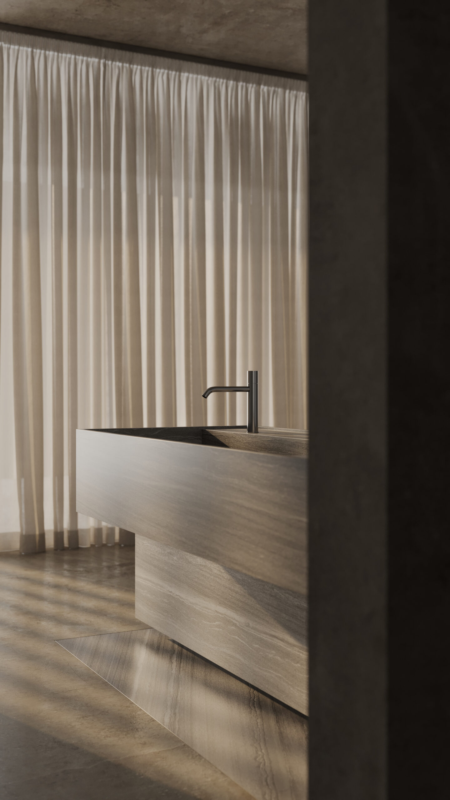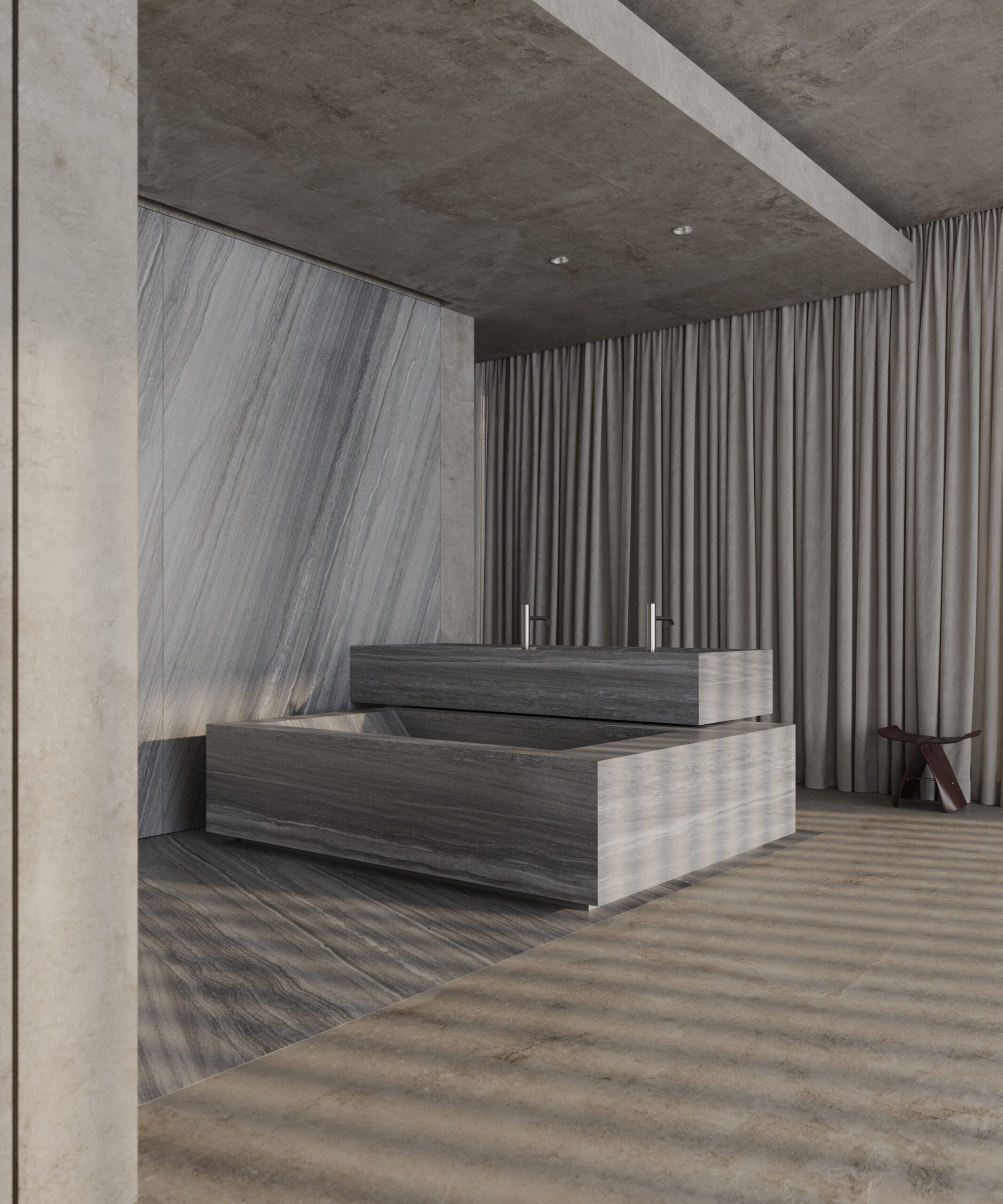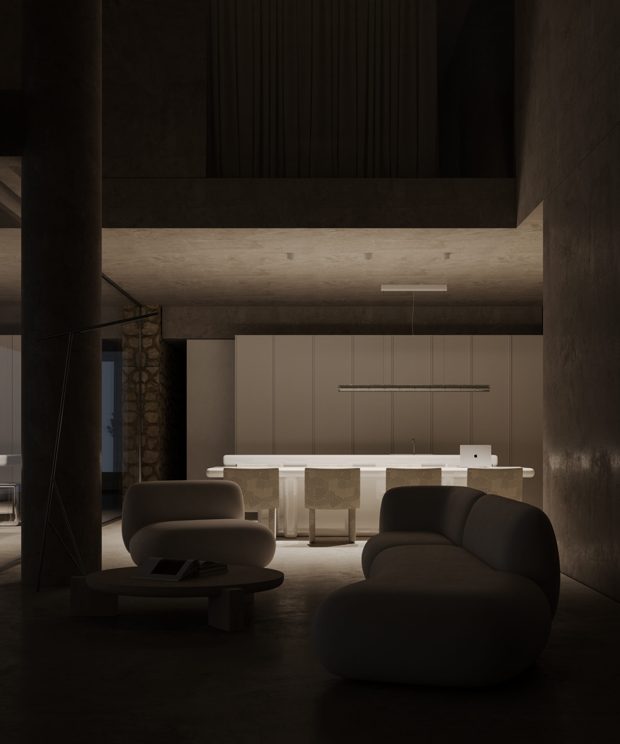 Інтер’єр побудований на балансі природних текстур і вивіреної елегантності. Сірий мармур, білі глянцеві поверхні, м’які тактильні тканини та жива зелень формують світлу, спокійну й водночас затишну атмосферу. Друге світло, світлові портали та делікатне освітлення підкреслюють відчуття повітряності й простору.