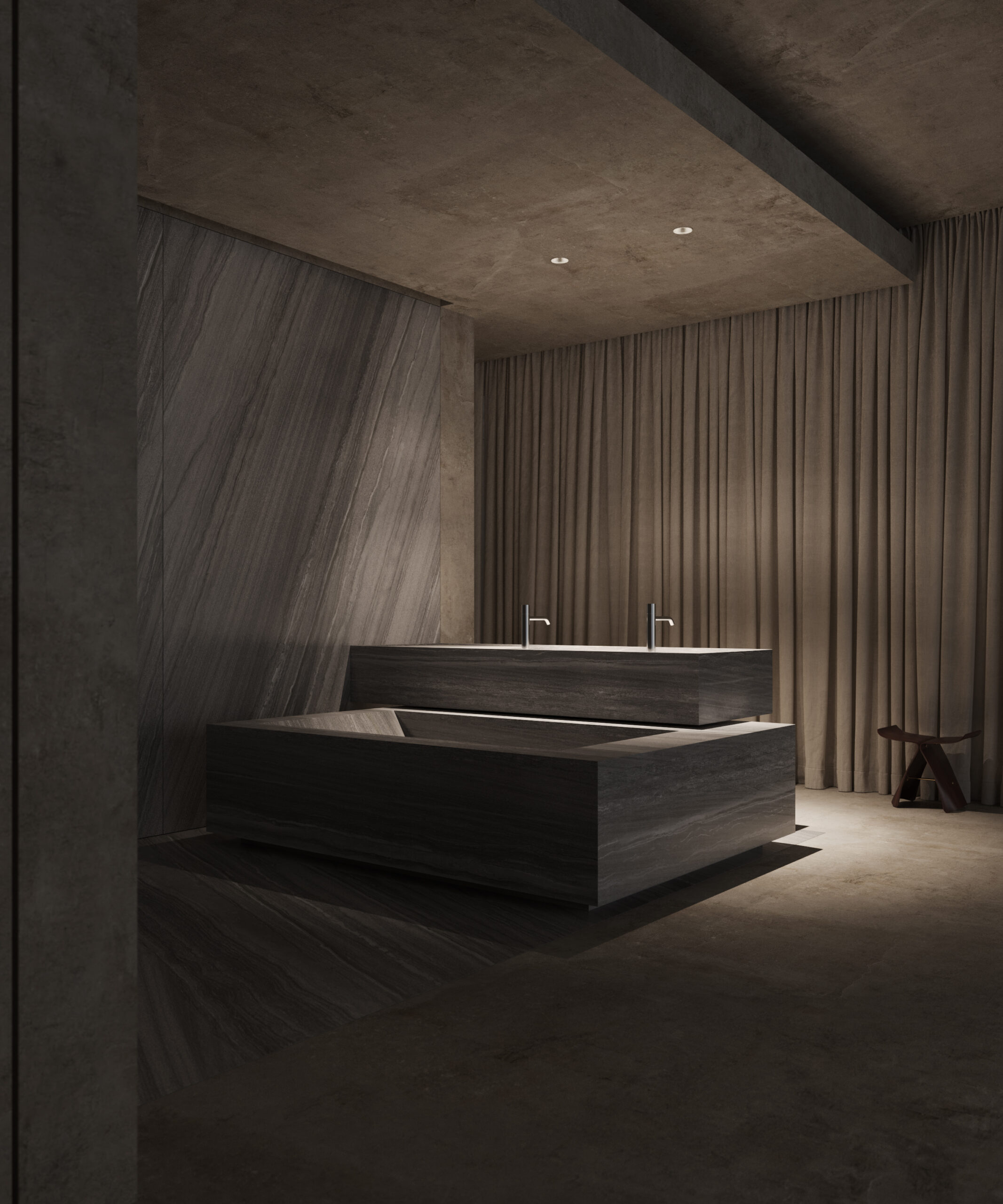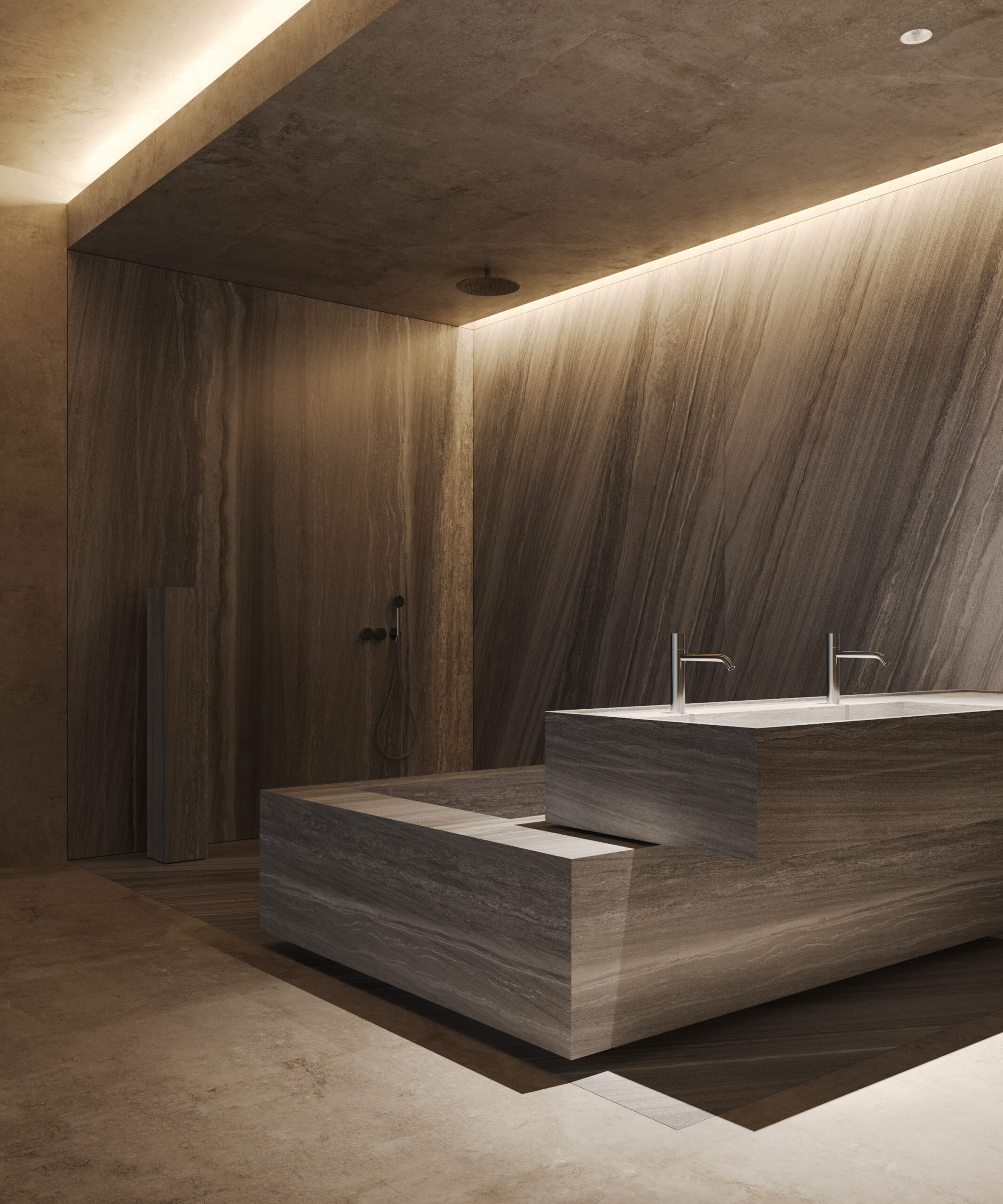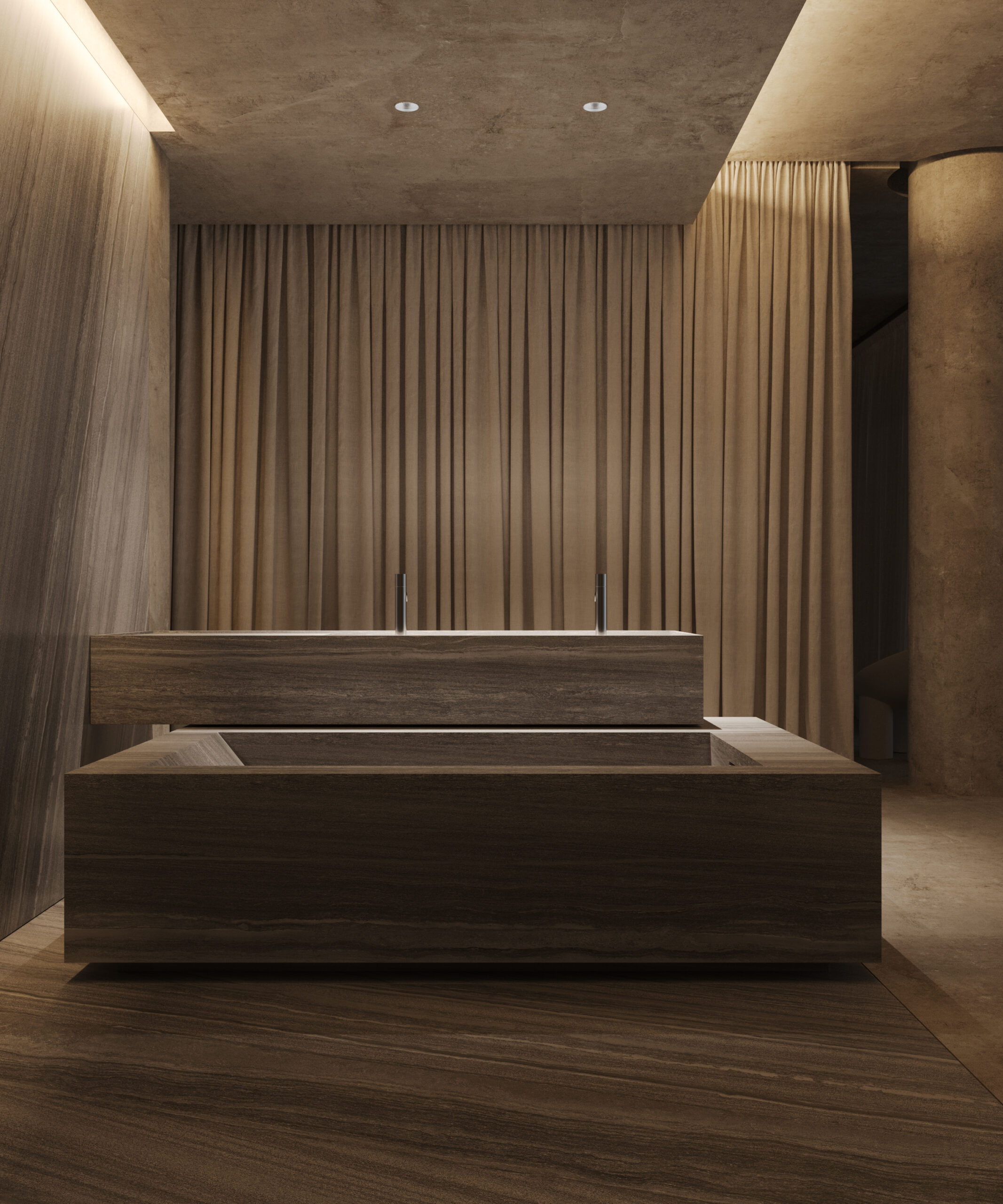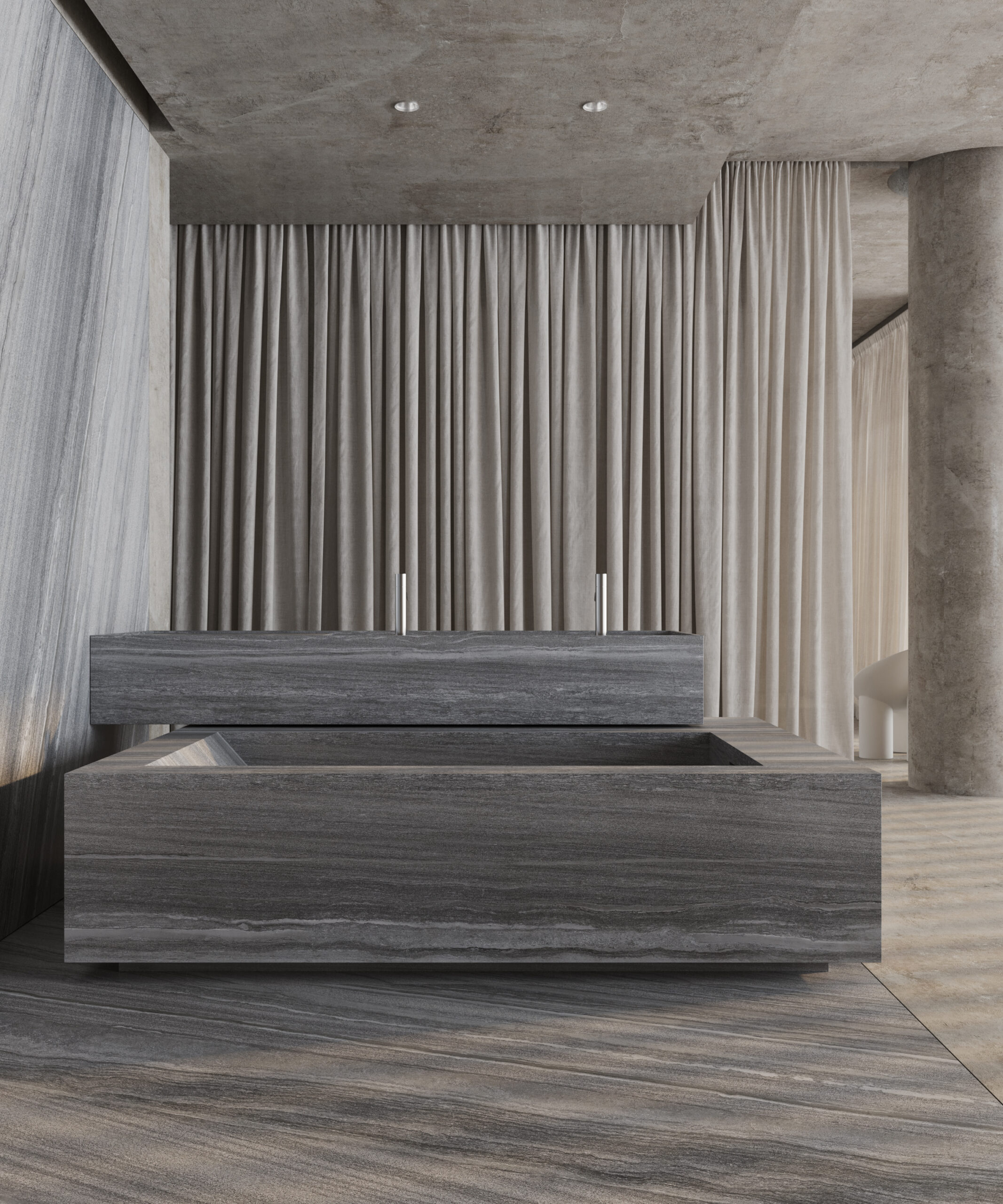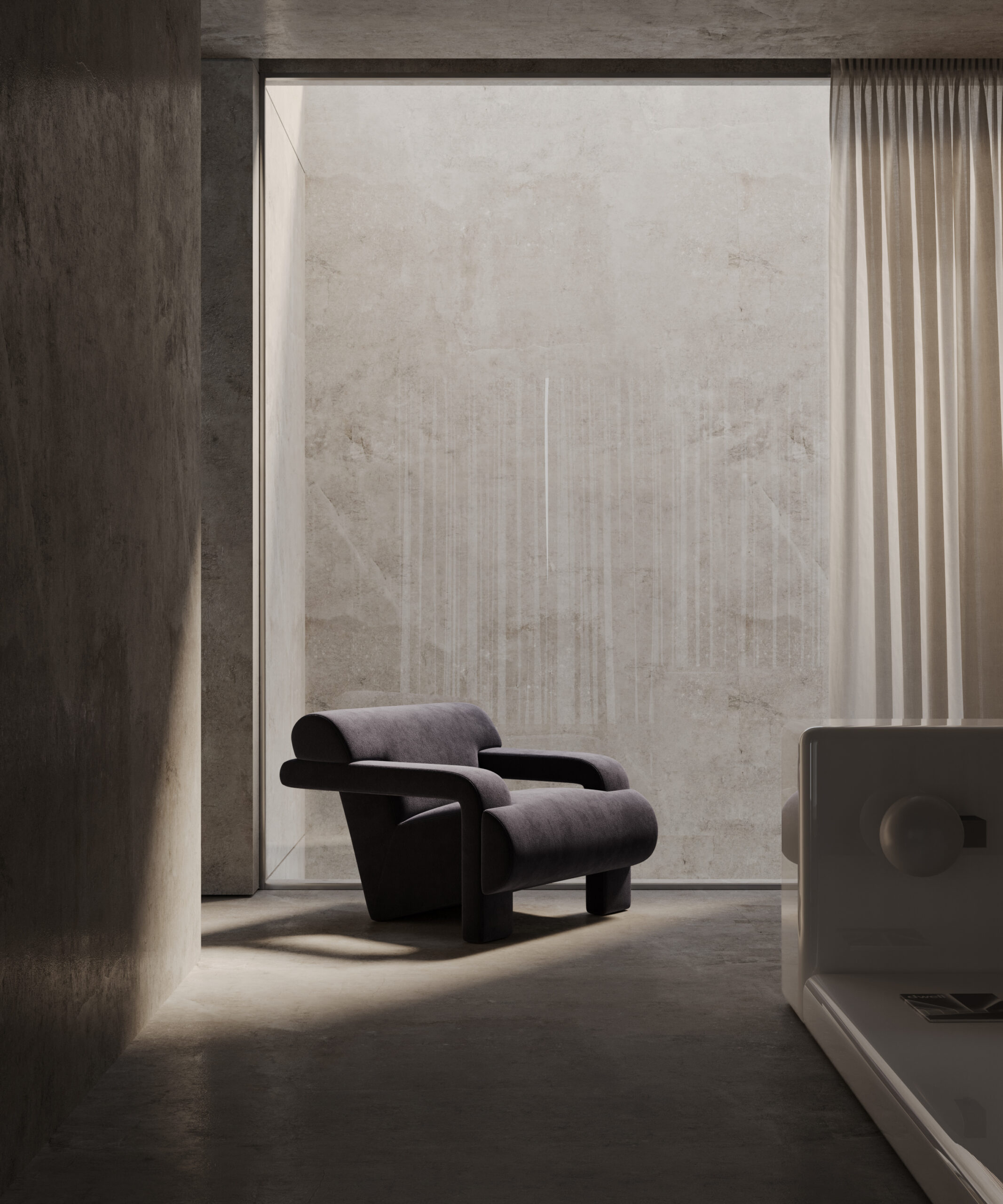 Інтер’єр побудований на балансі природних текстур і вивіреної елегантності. Сірий мармур, білі глянцеві поверхні, м’які тактильні тканини та жива зелень формують світлу, спокійну й водночас затишну атмосферу. Друге світло, світлові портали та делікатне освітлення підкреслюють відчуття повітряності й простору.