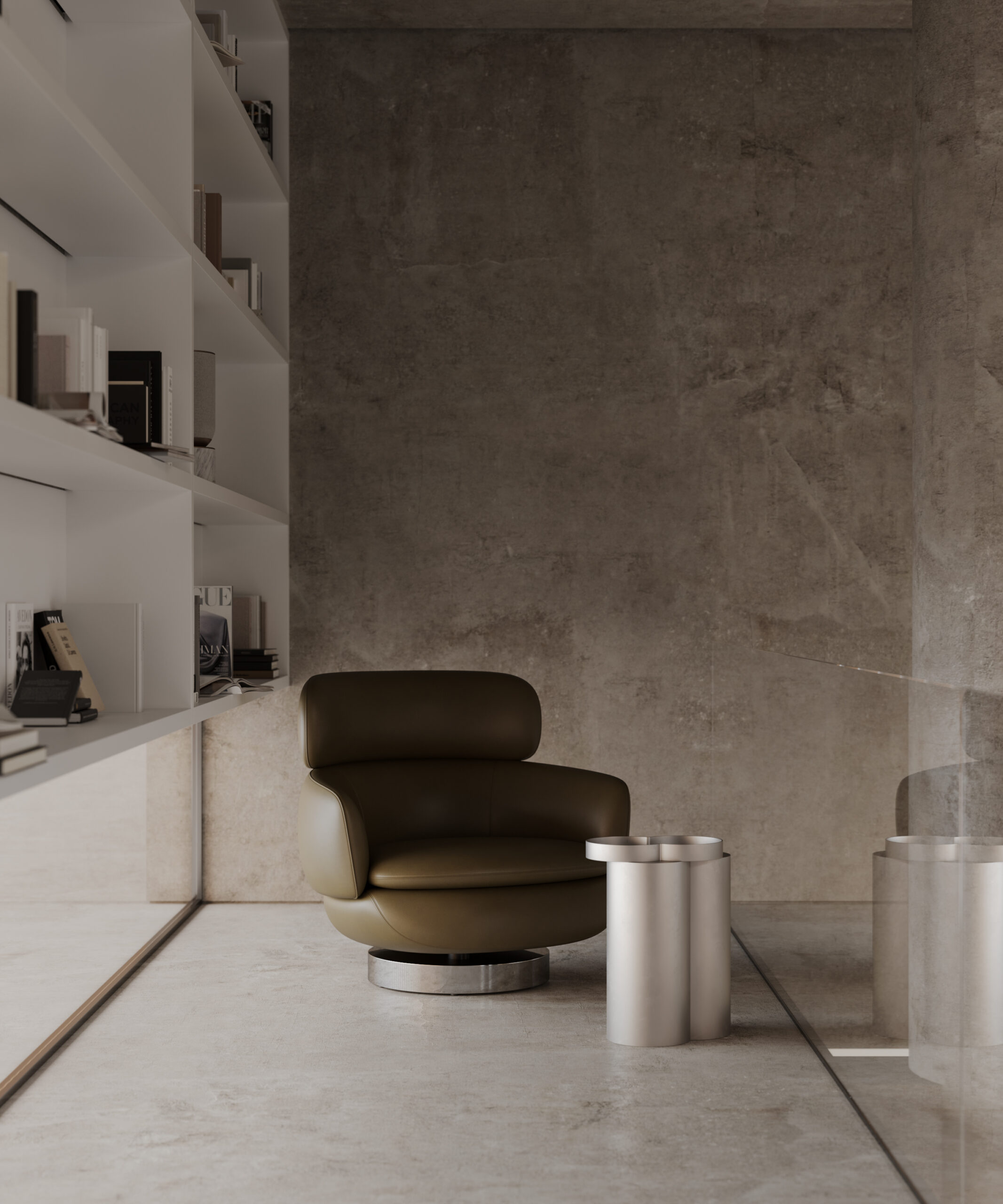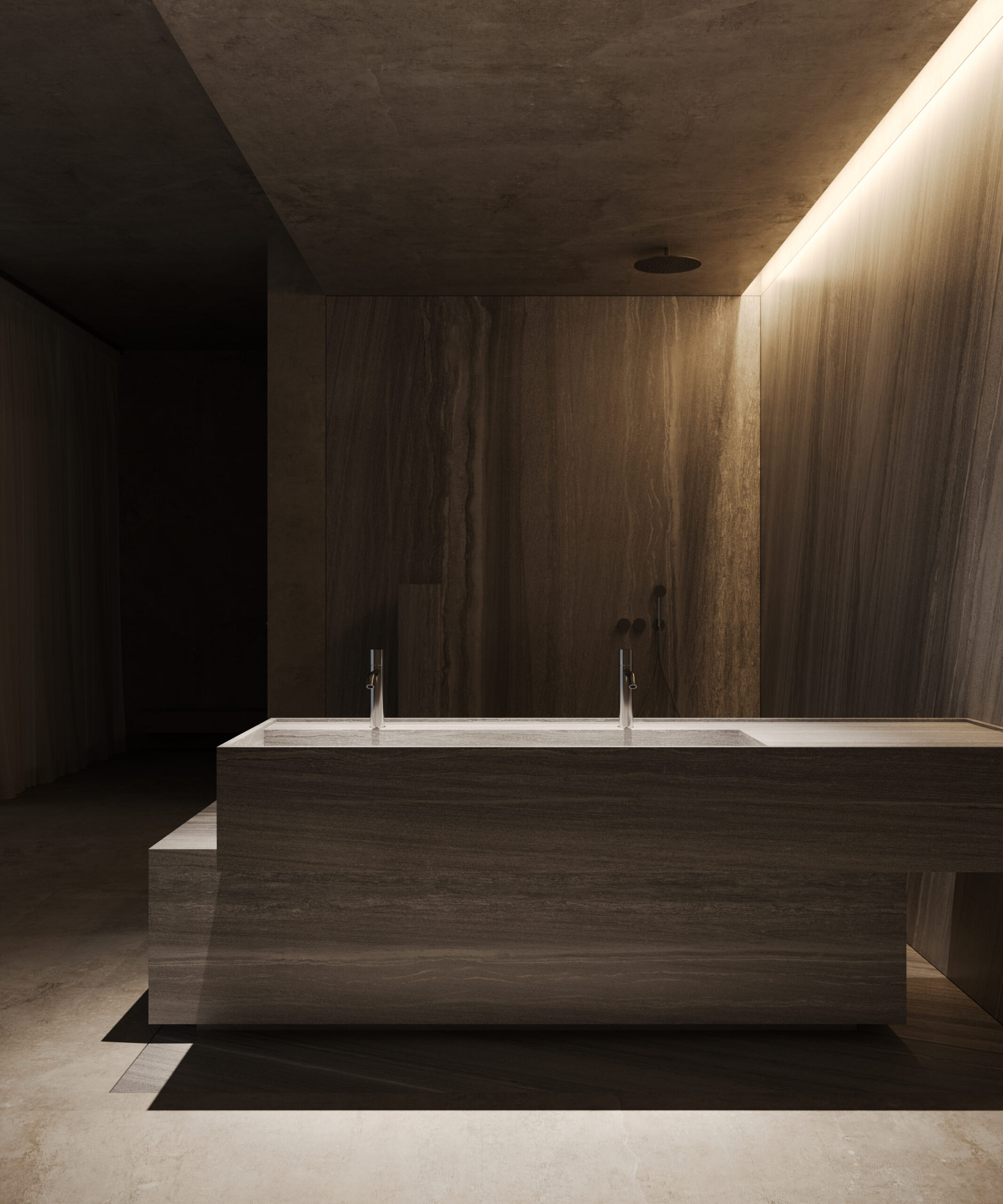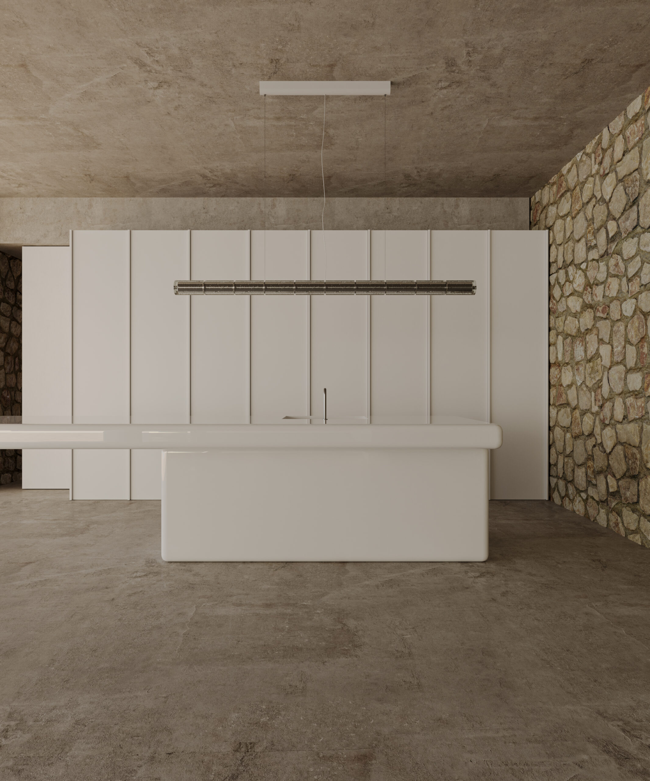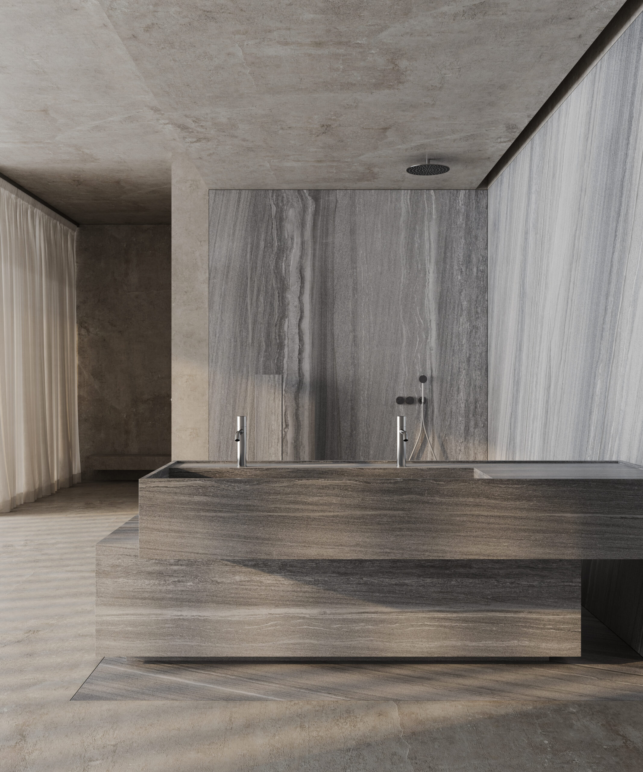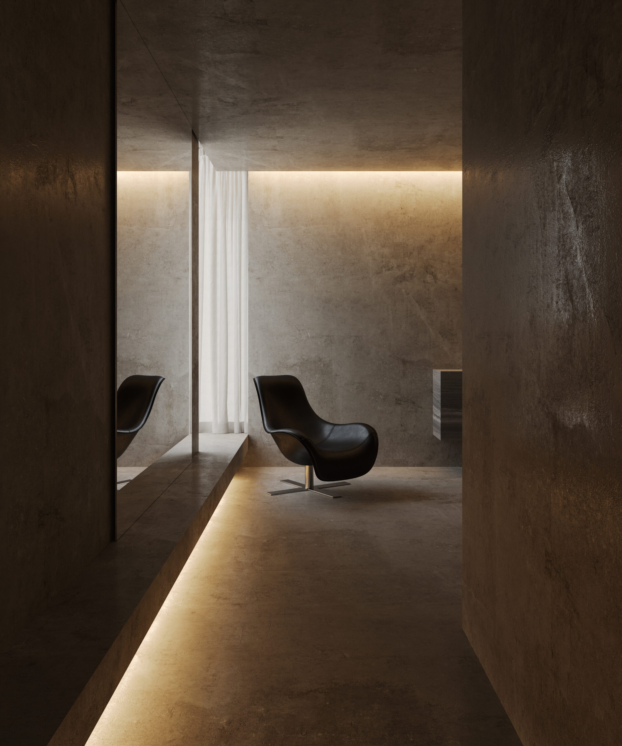 Інтер’єр побудований на балансі природних текстур і вивіреної елегантності. Сірий мармур, білі глянцеві поверхні, м’які тактильні тканини та жива зелень формують світлу, спокійну й водночас затишну атмосферу. Друге світло, світлові портали та делікатне освітлення підкреслюють відчуття повітряності й простору.