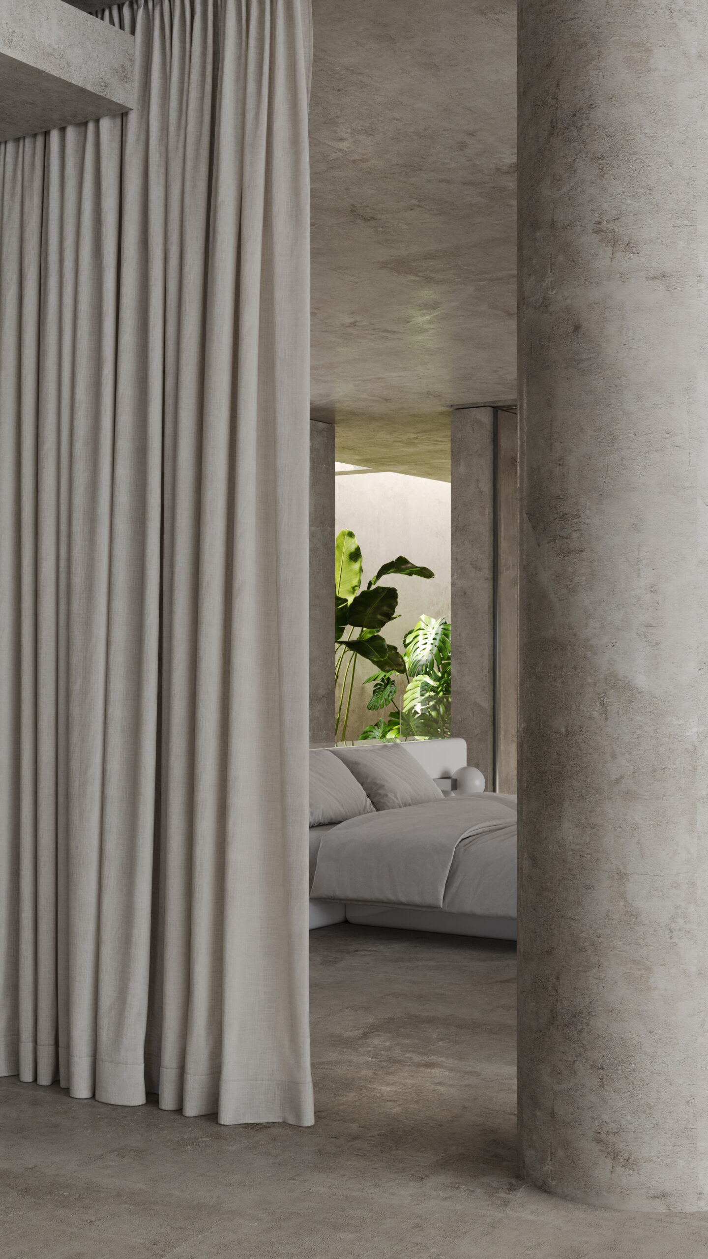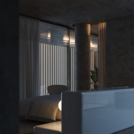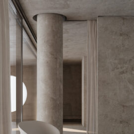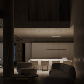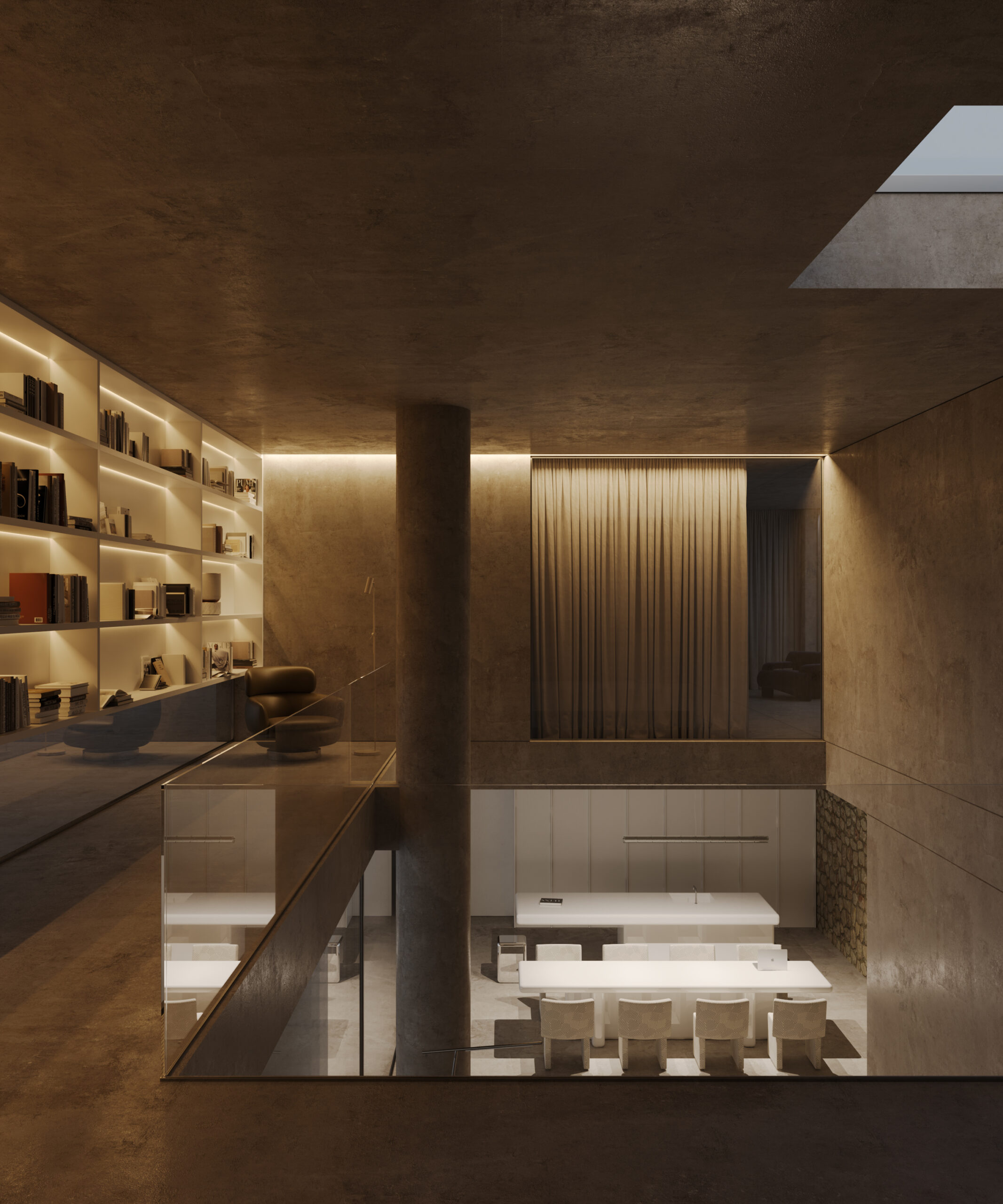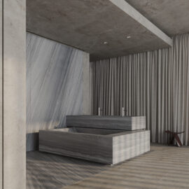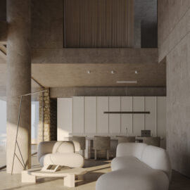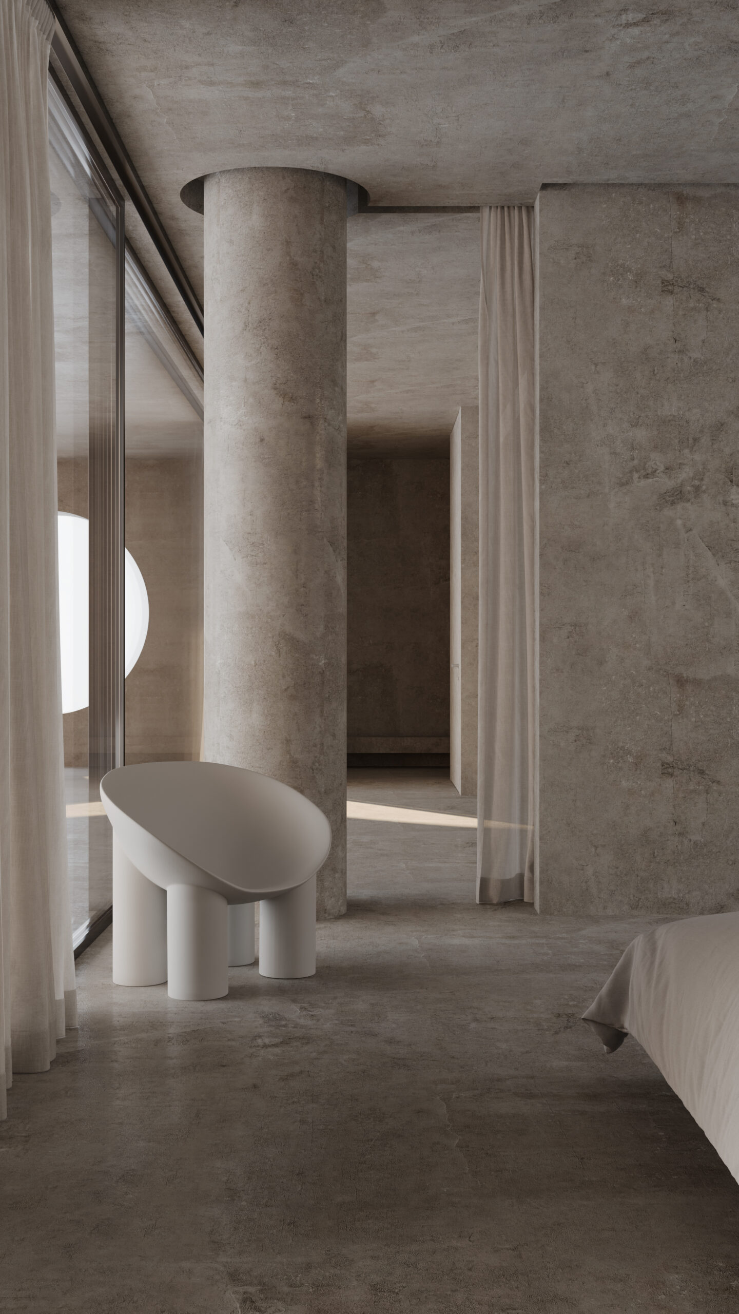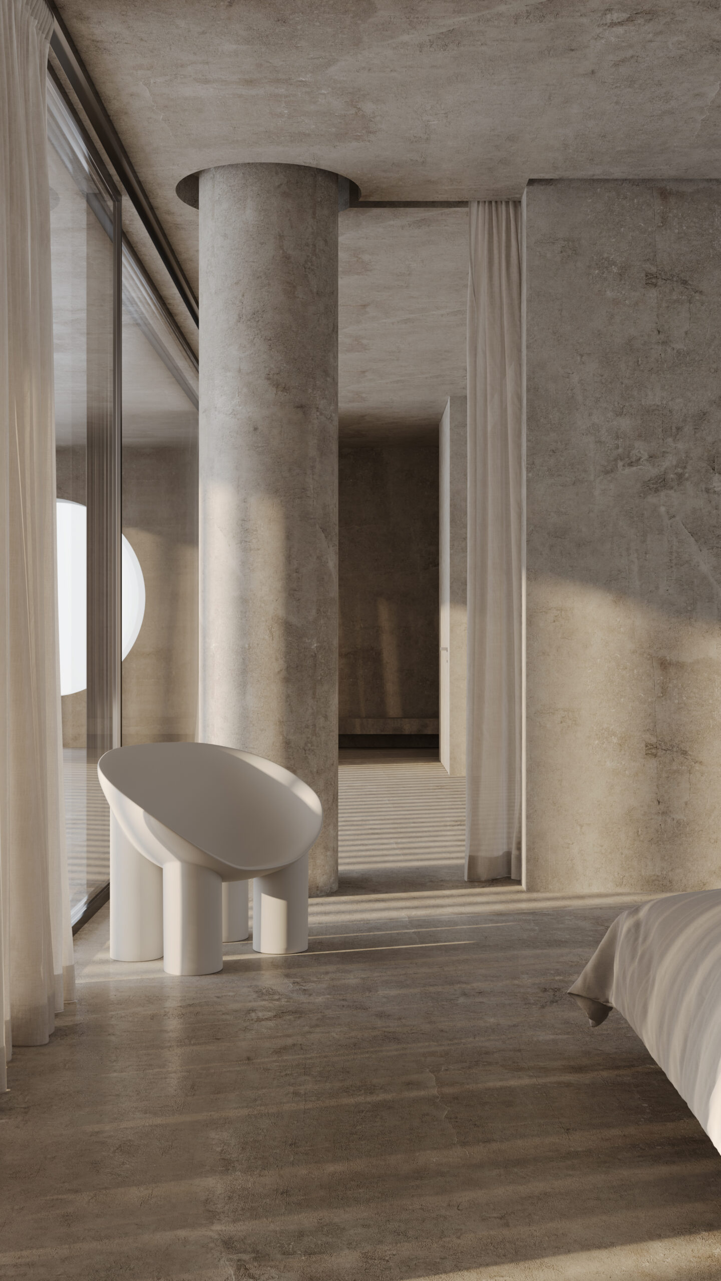 Інтер’єр побудований на балансі природних текстур і вивіреної елегантності. Сірий мармур, білі глянцеві поверхні, м’які тактильні тканини та жива зелень формують світлу, спокійну й водночас затишну атмосферу. Друге світло, світлові портали та делікатне освітлення підкреслюють відчуття повітряності й простору.