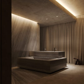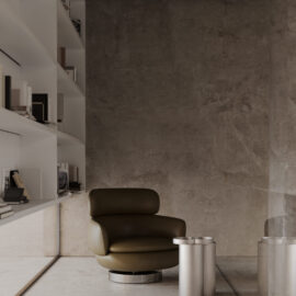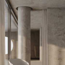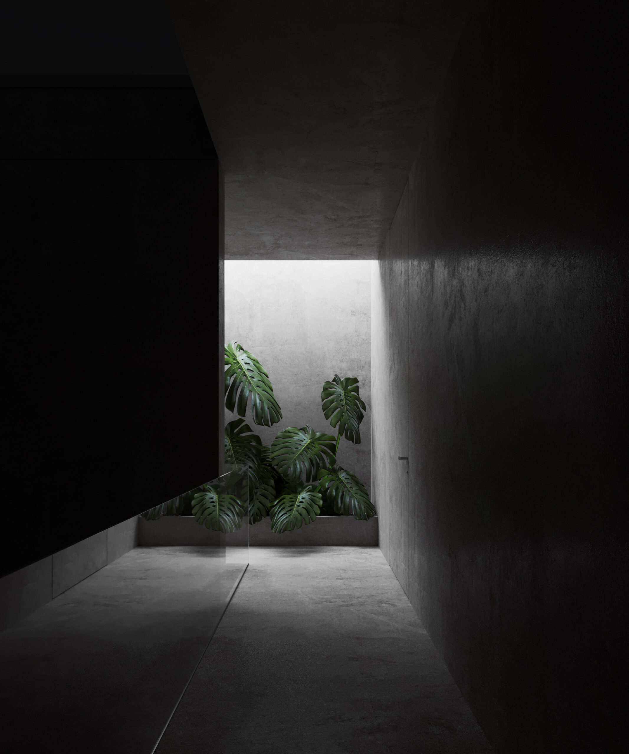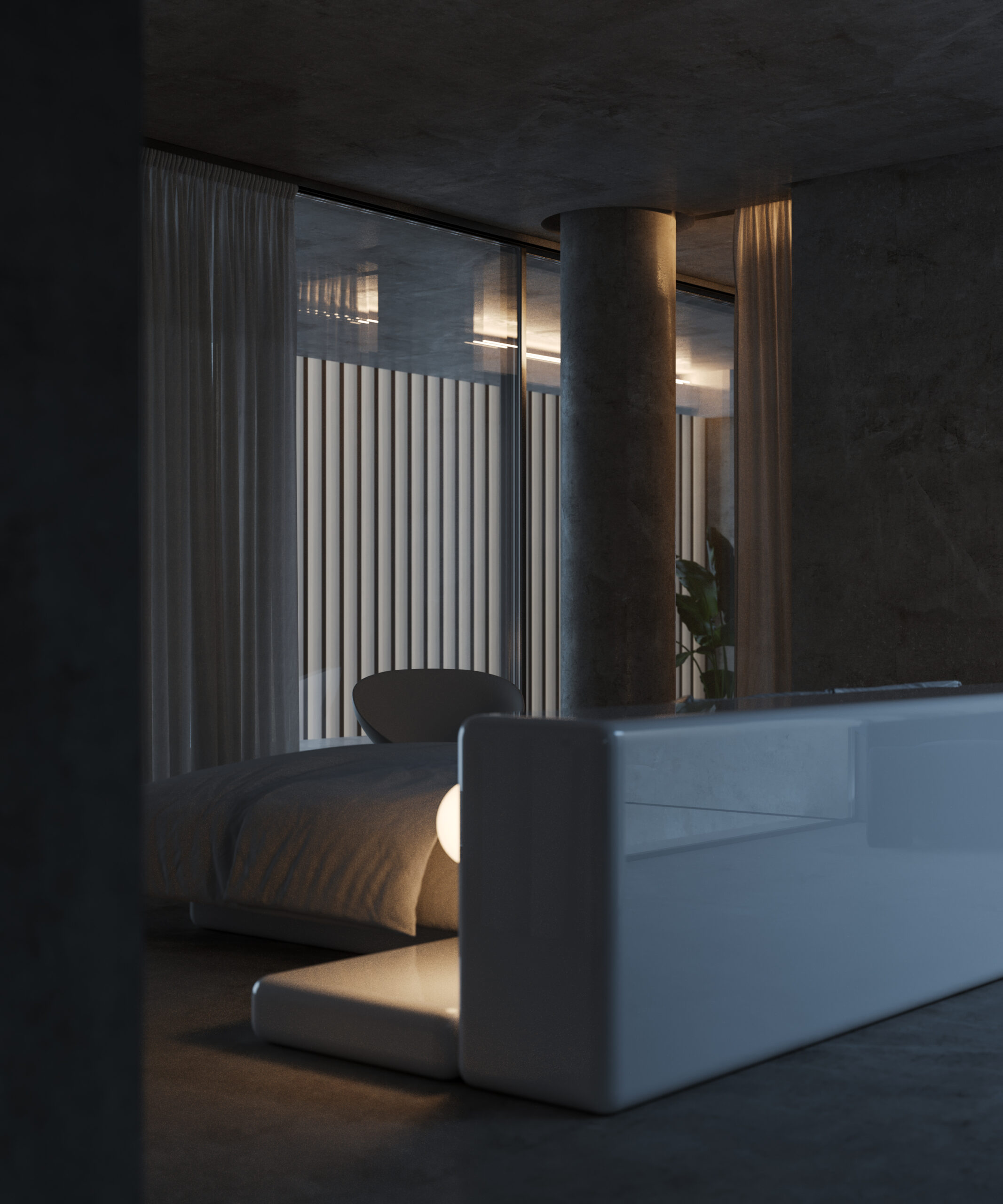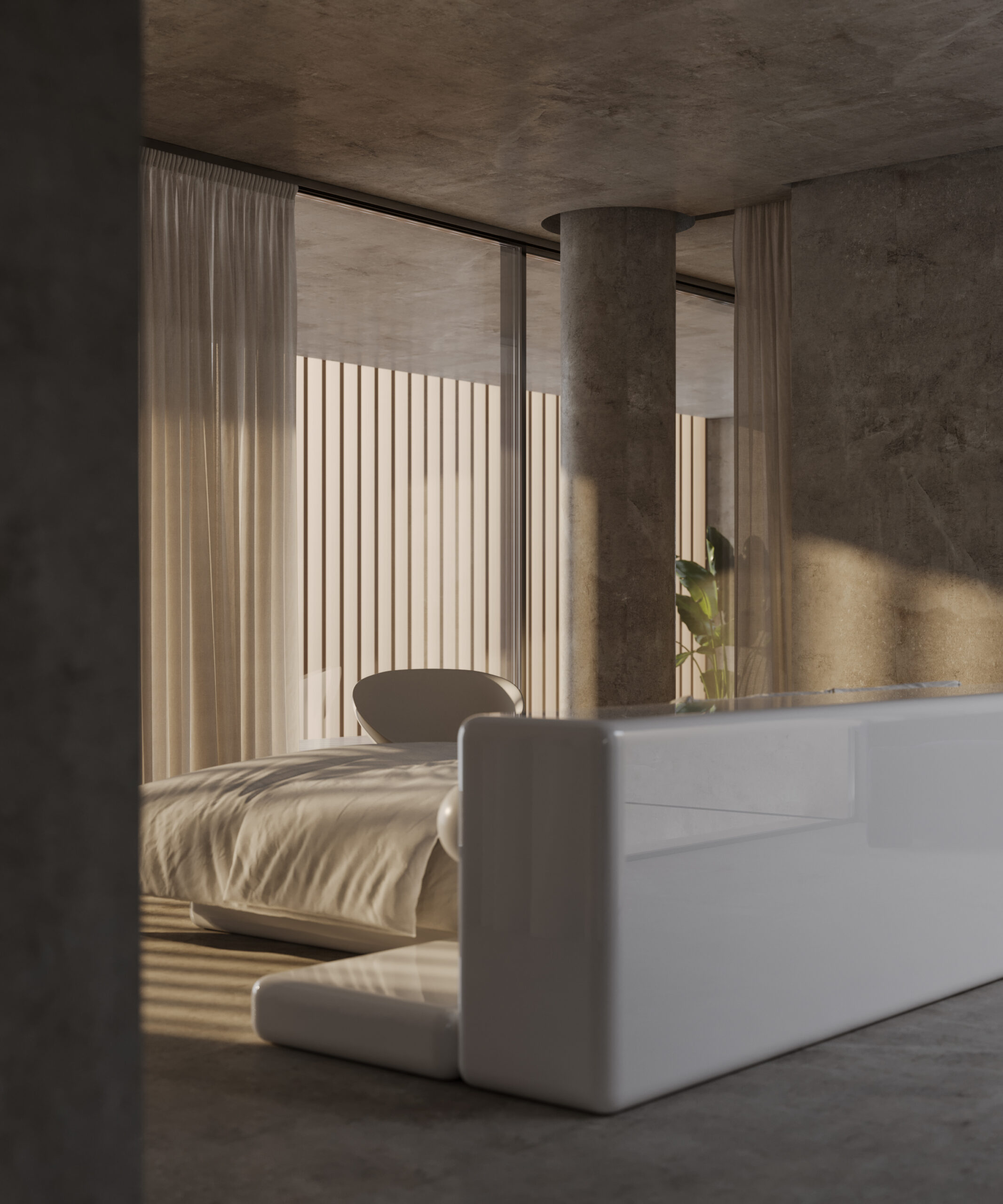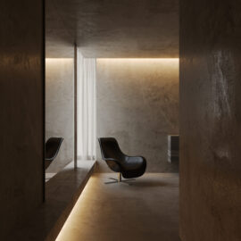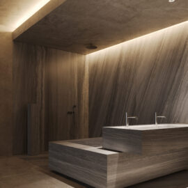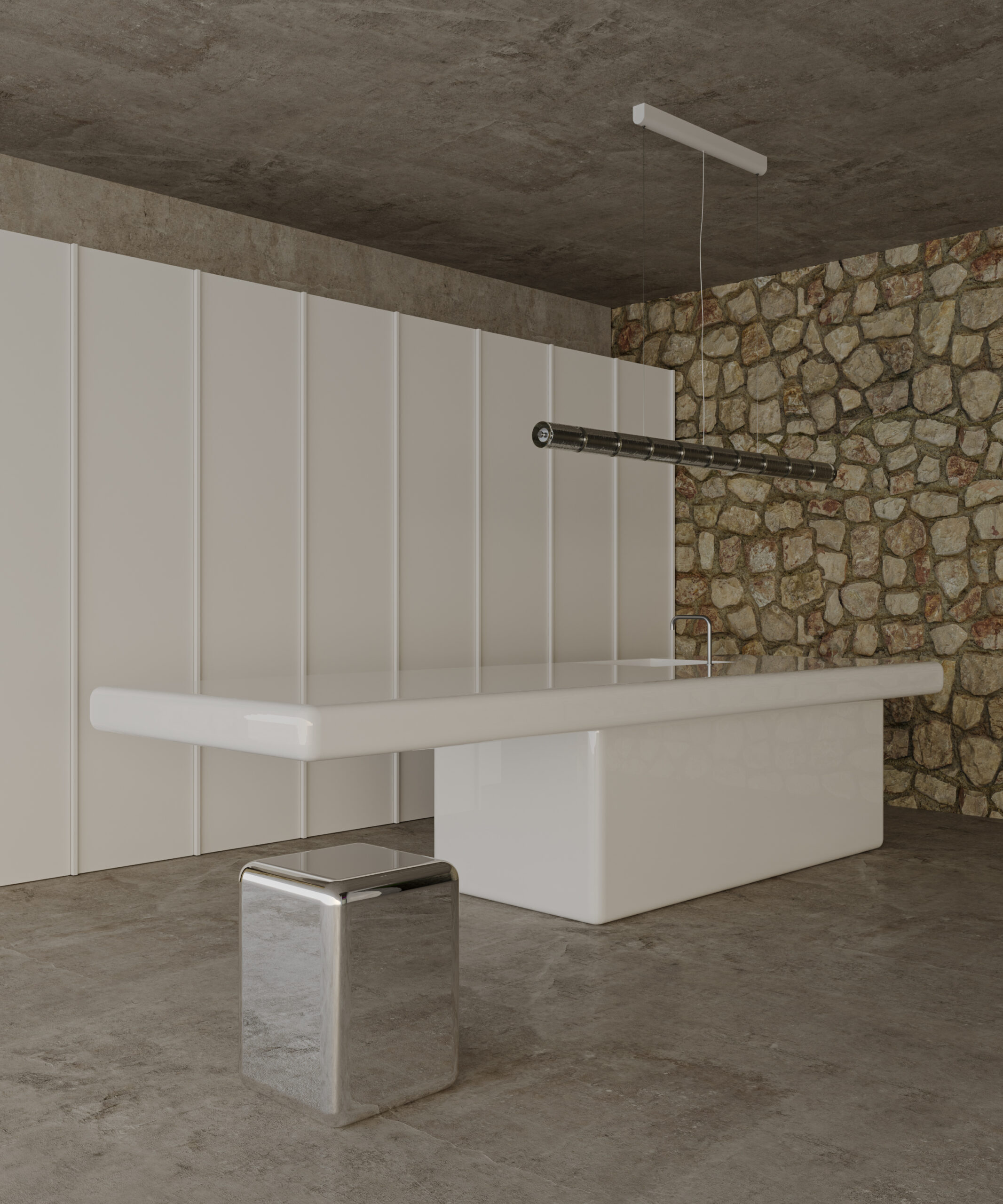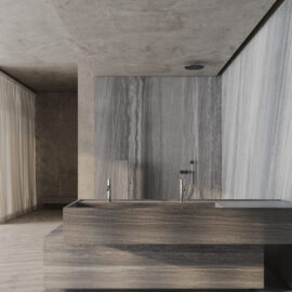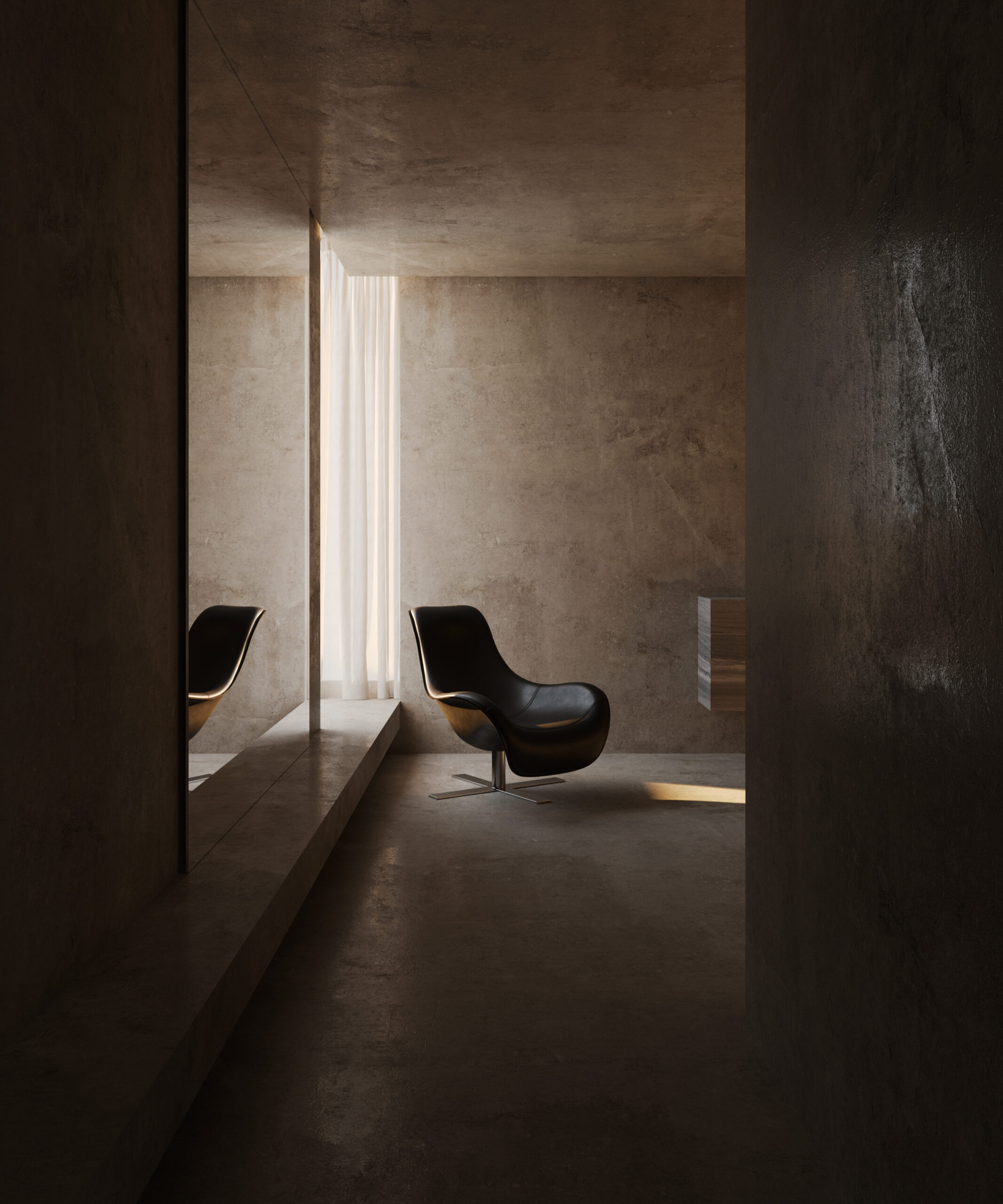 Інтер’єр побудований на балансі природних текстур і вивіреної елегантності. Сірий мармур, білі глянцеві поверхні, м’які тактильні тканини та жива зелень формують світлу, спокійну й водночас затишну атмосферу. Друге світло, світлові портали та делікатне освітлення підкреслюють відчуття повітряності й простору.
