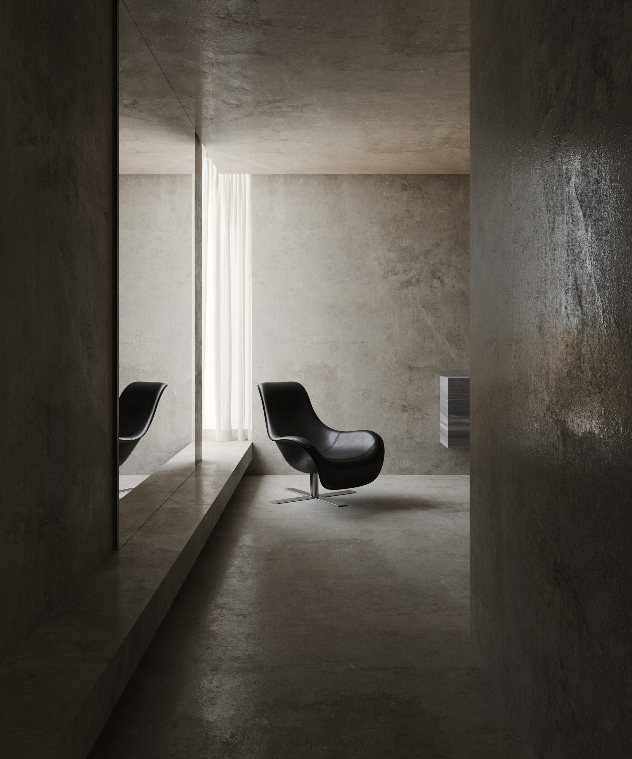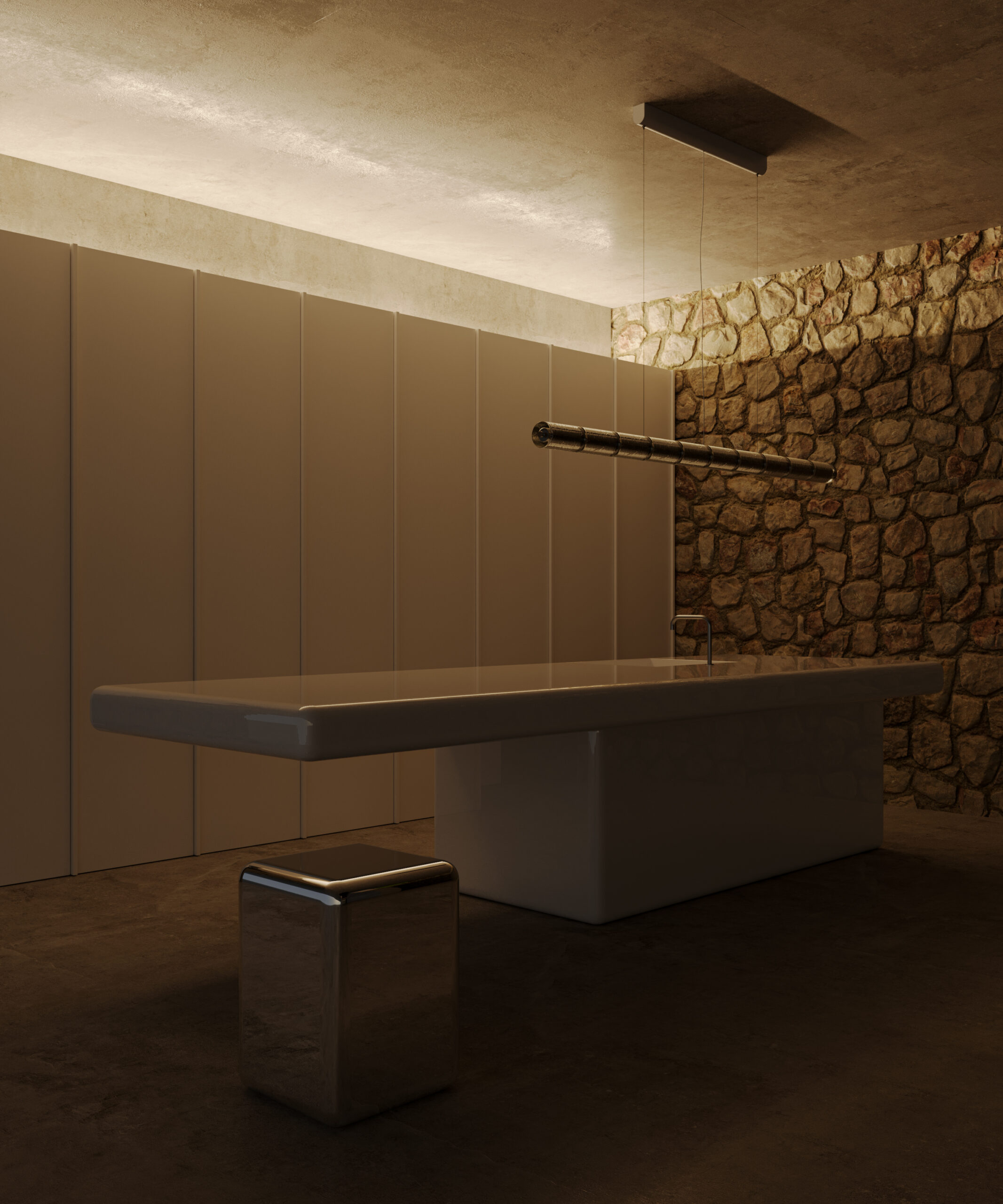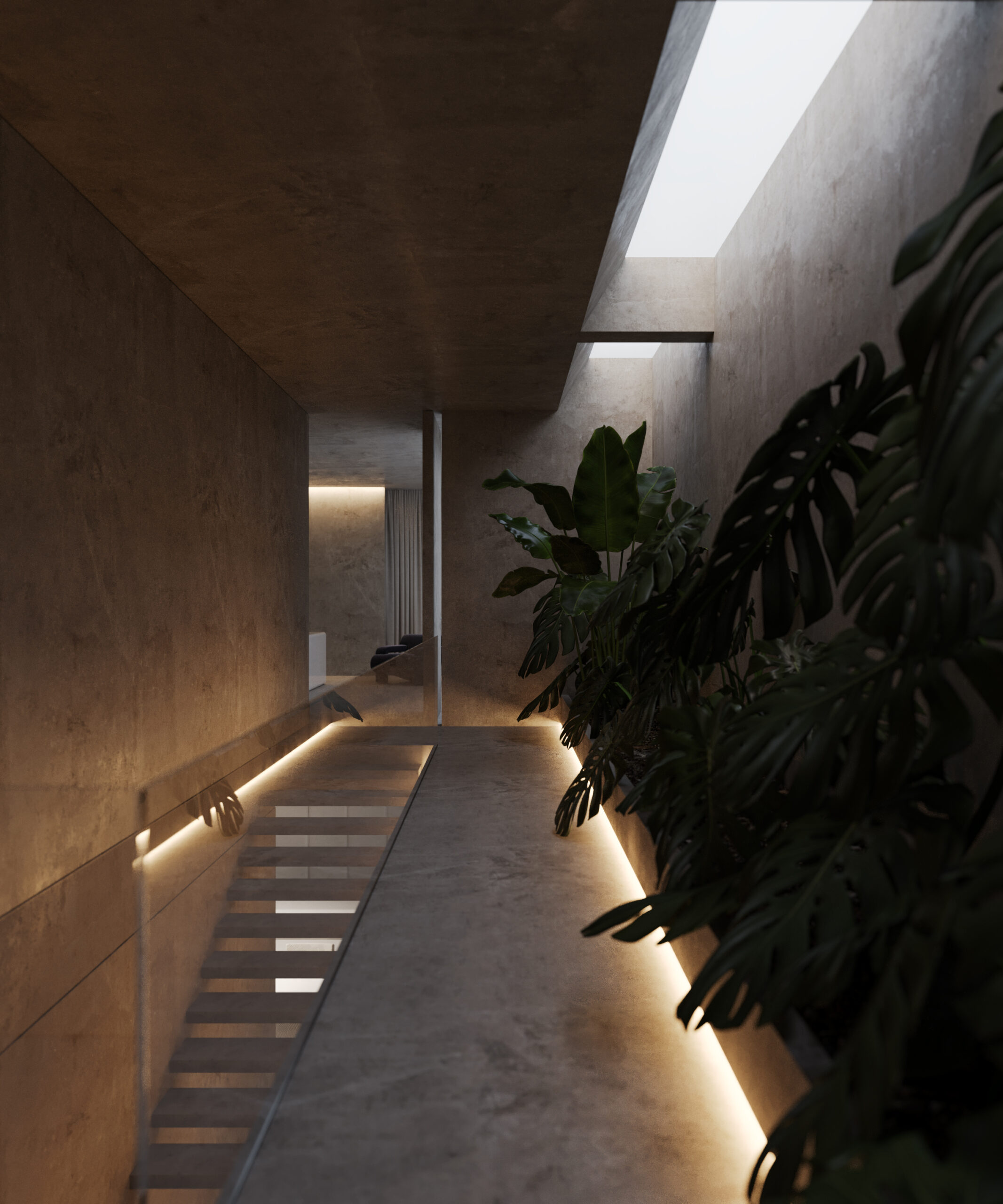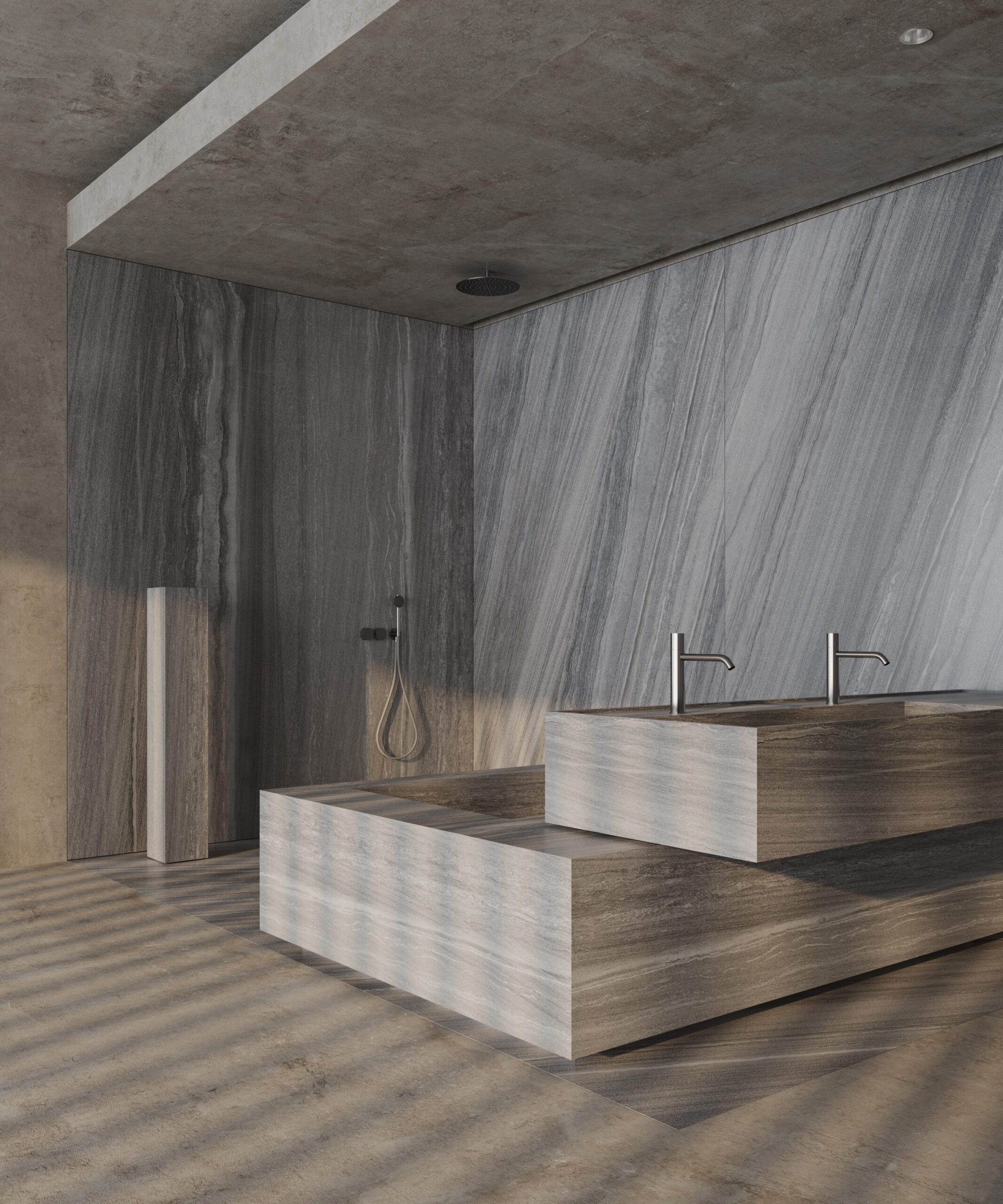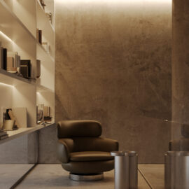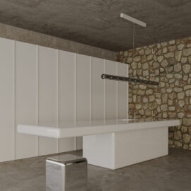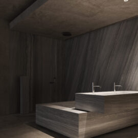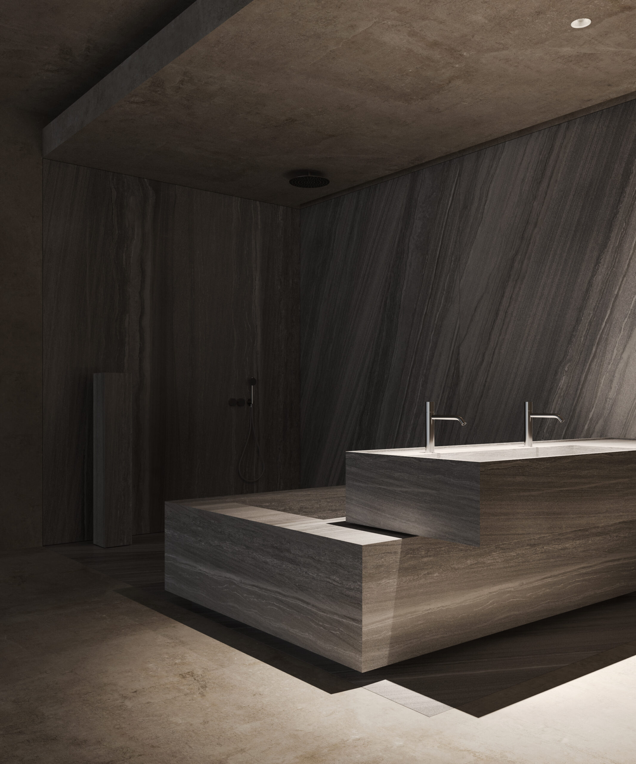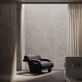 Інтер’єр побудований на балансі природних текстур і вивіреної елегантності. Сірий мармур, білі глянцеві поверхні, м’які тактильні тканини та жива зелень формують світлу, спокійну й водночас затишну атмосферу. Друге світло, світлові портали та делікатне освітлення підкреслюють відчуття повітряності й простору.