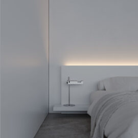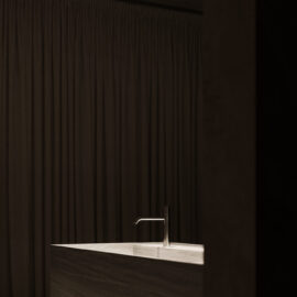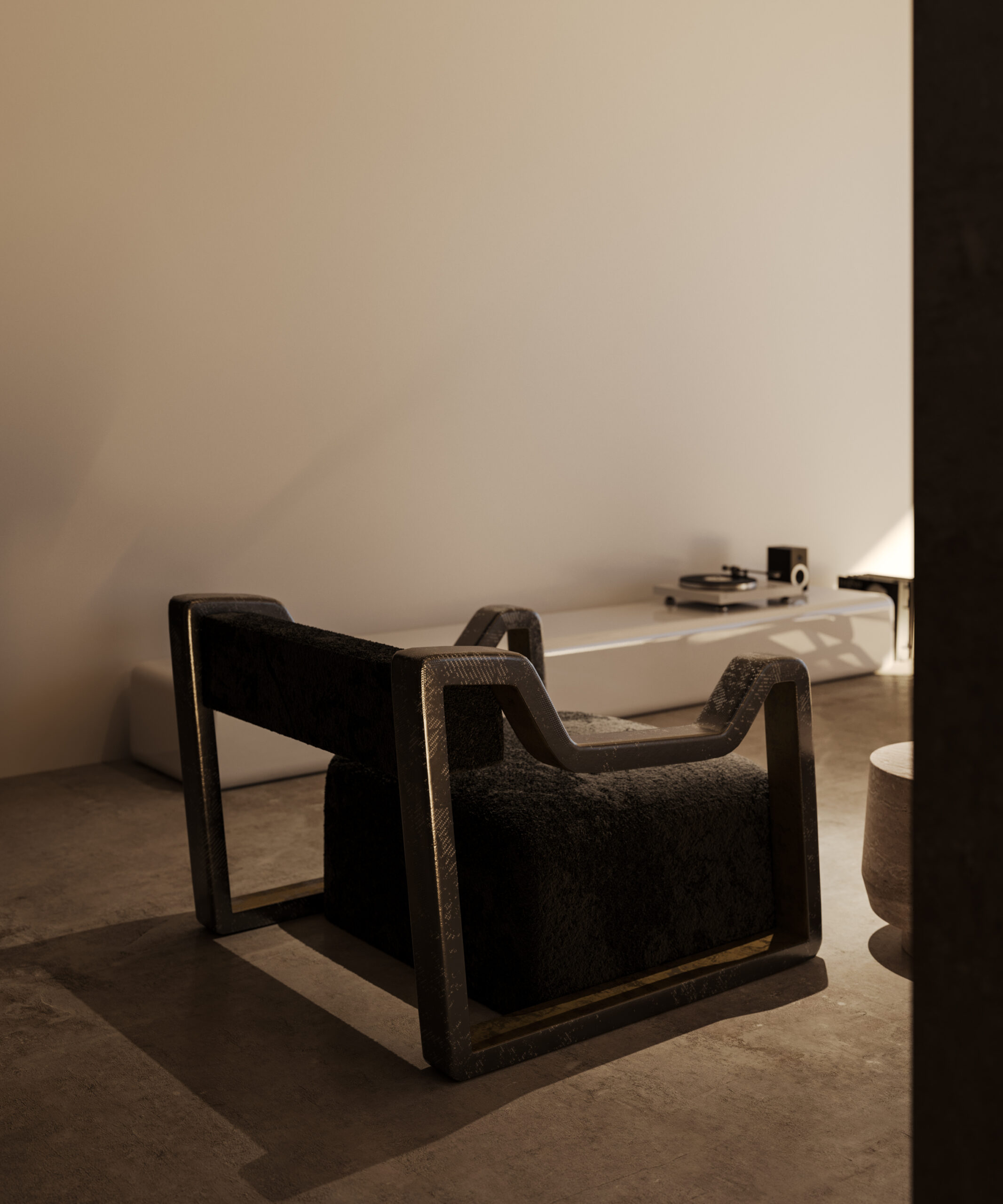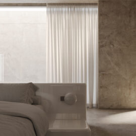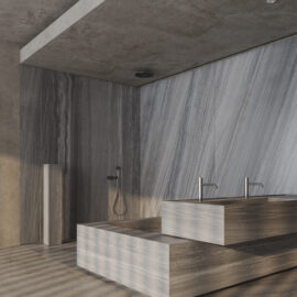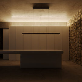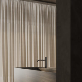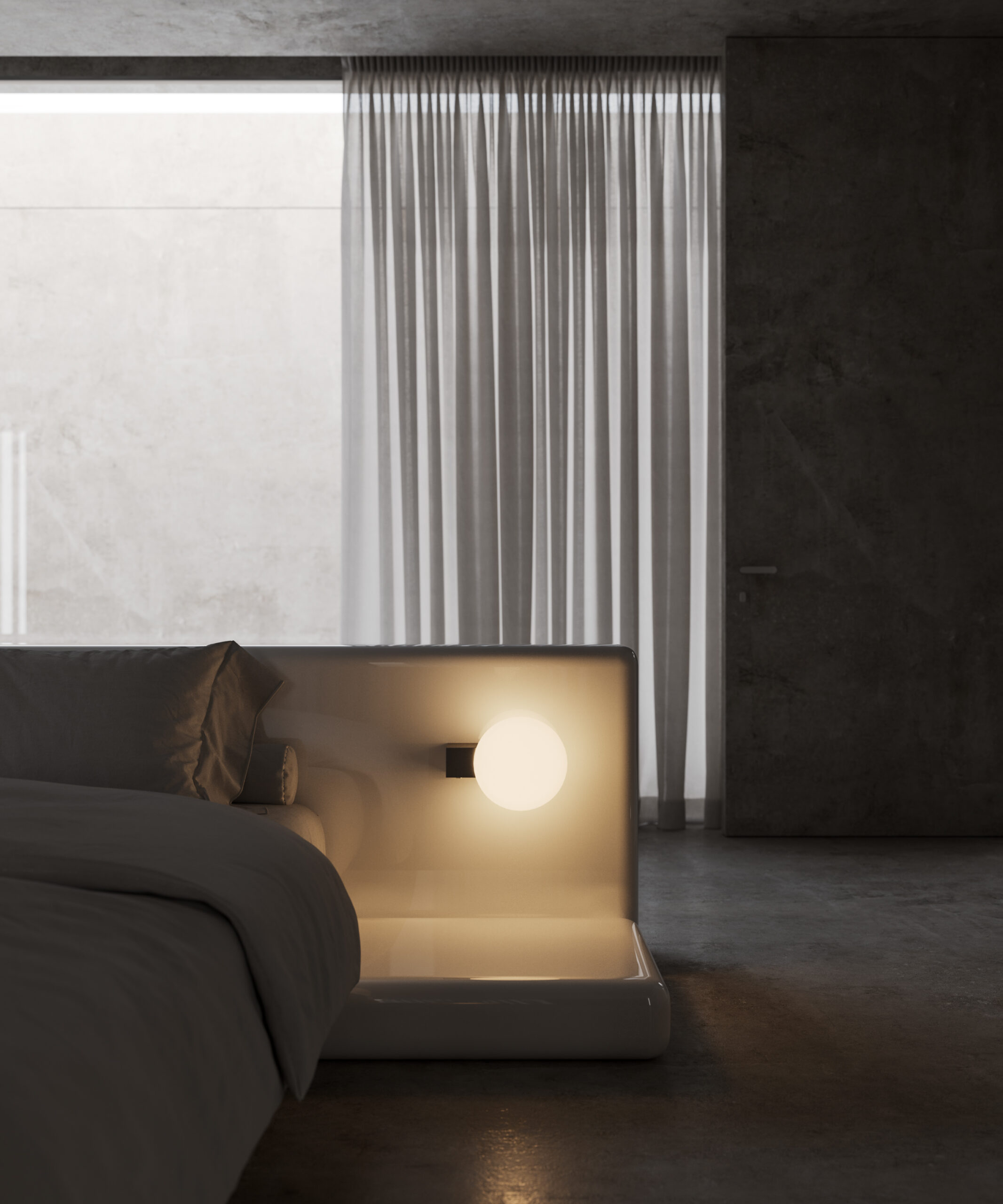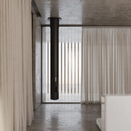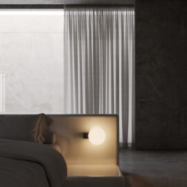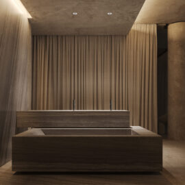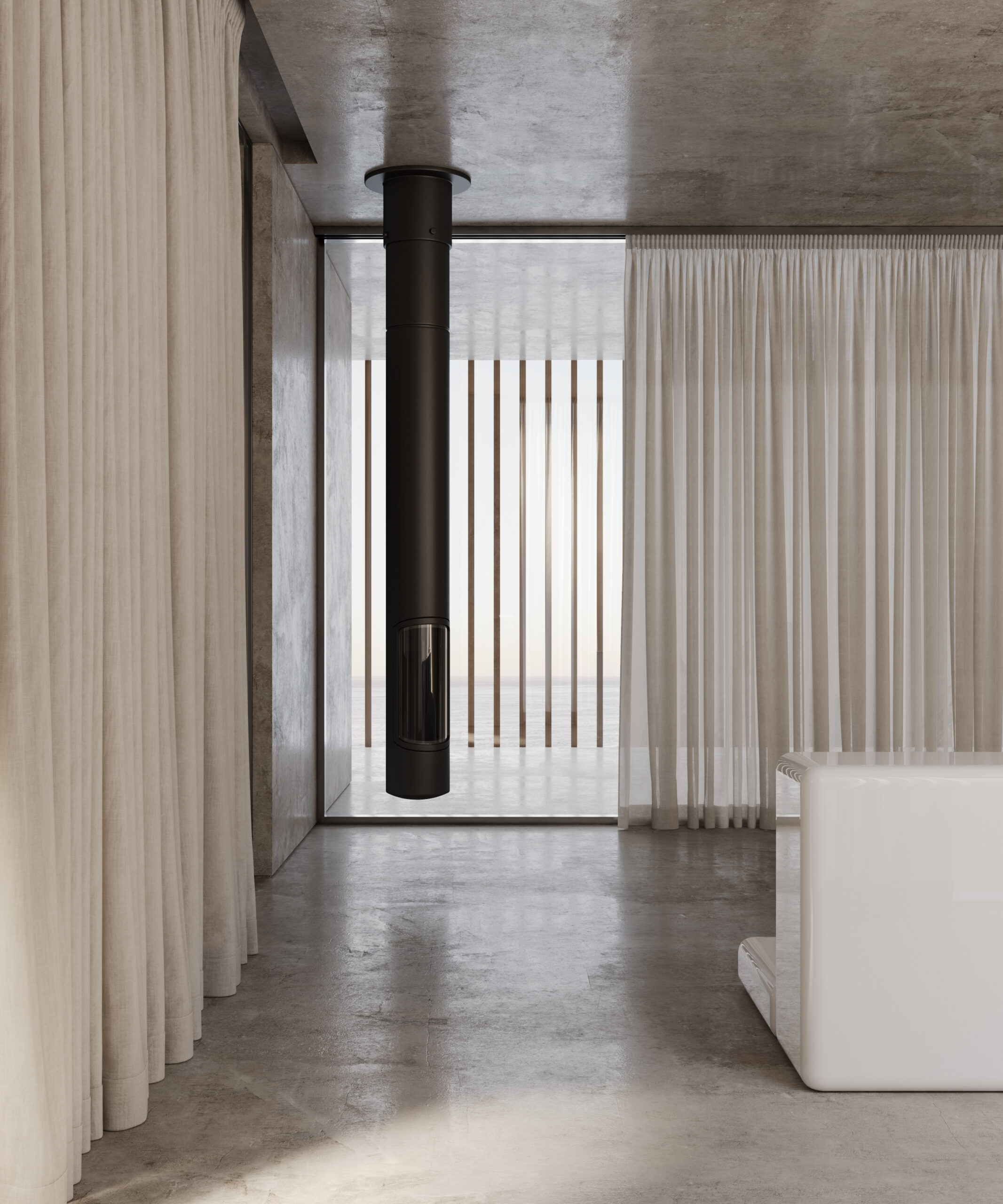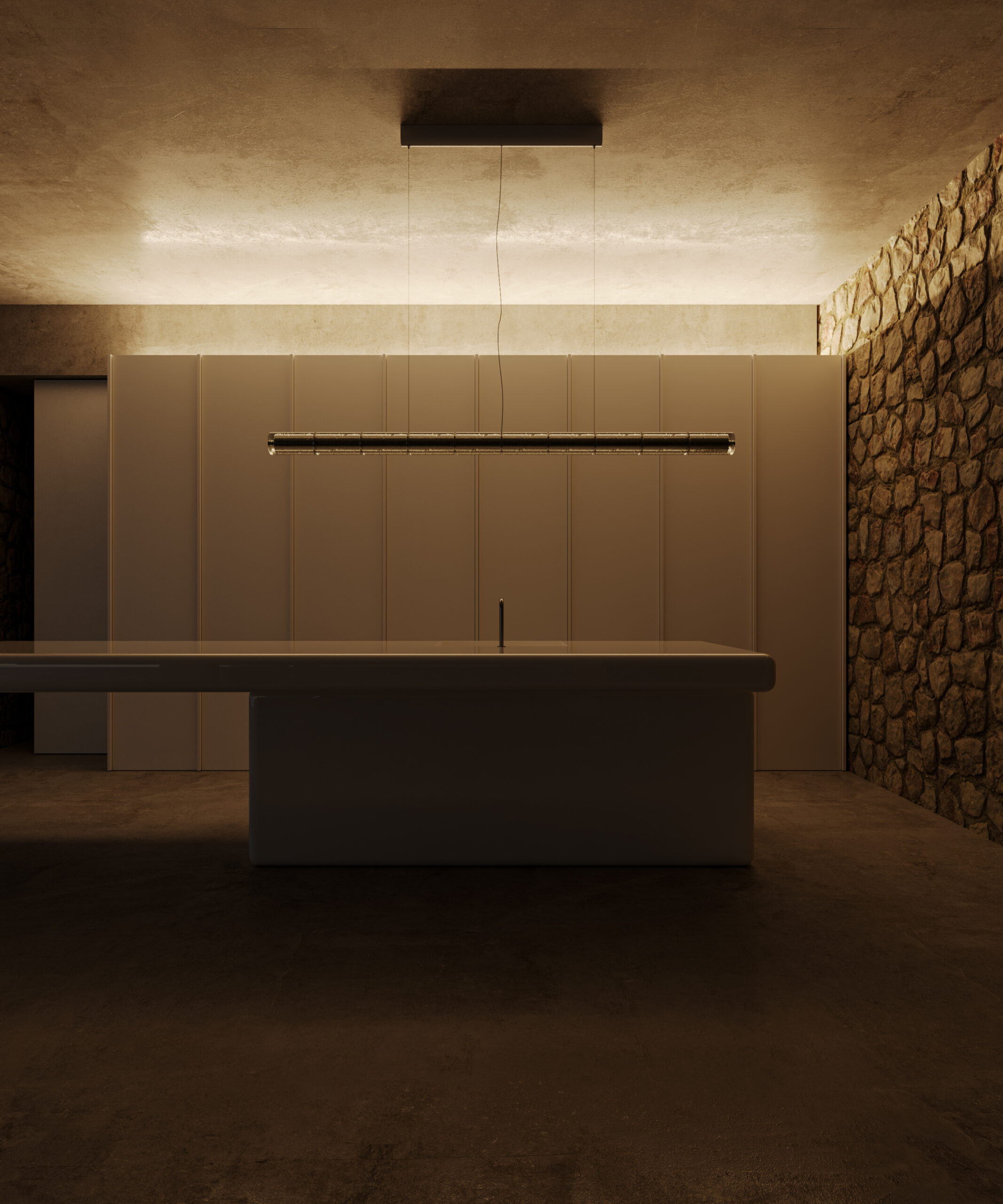 Інтер’єр побудований на балансі природних текстур і вивіреної елегантності. Сірий мармур, білі глянцеві поверхні, м’які тактильні тканини та жива зелень формують світлу, спокійну й водночас затишну атмосферу. Друге світло, світлові портали та делікатне освітлення підкреслюють відчуття повітряності й простору.
