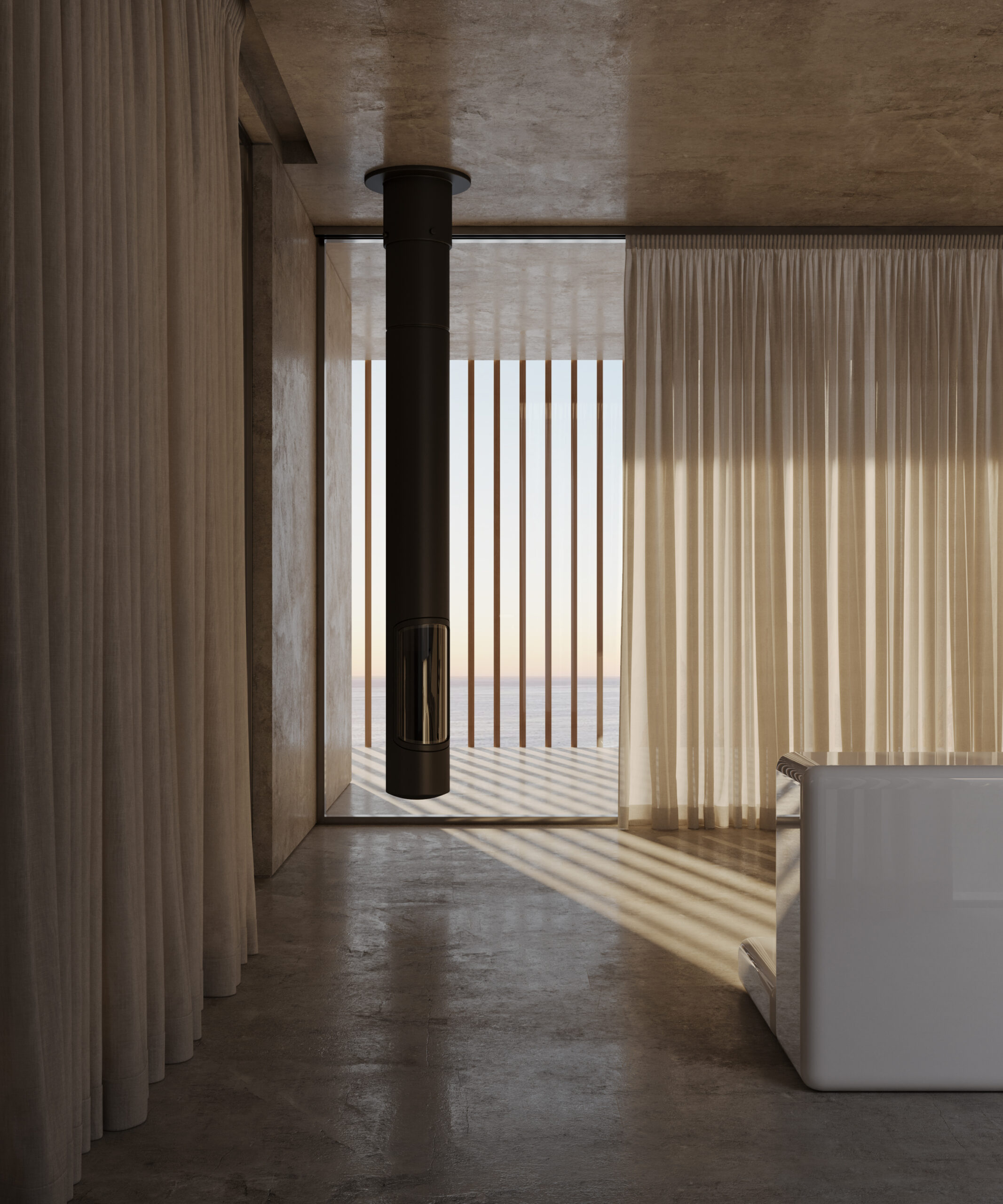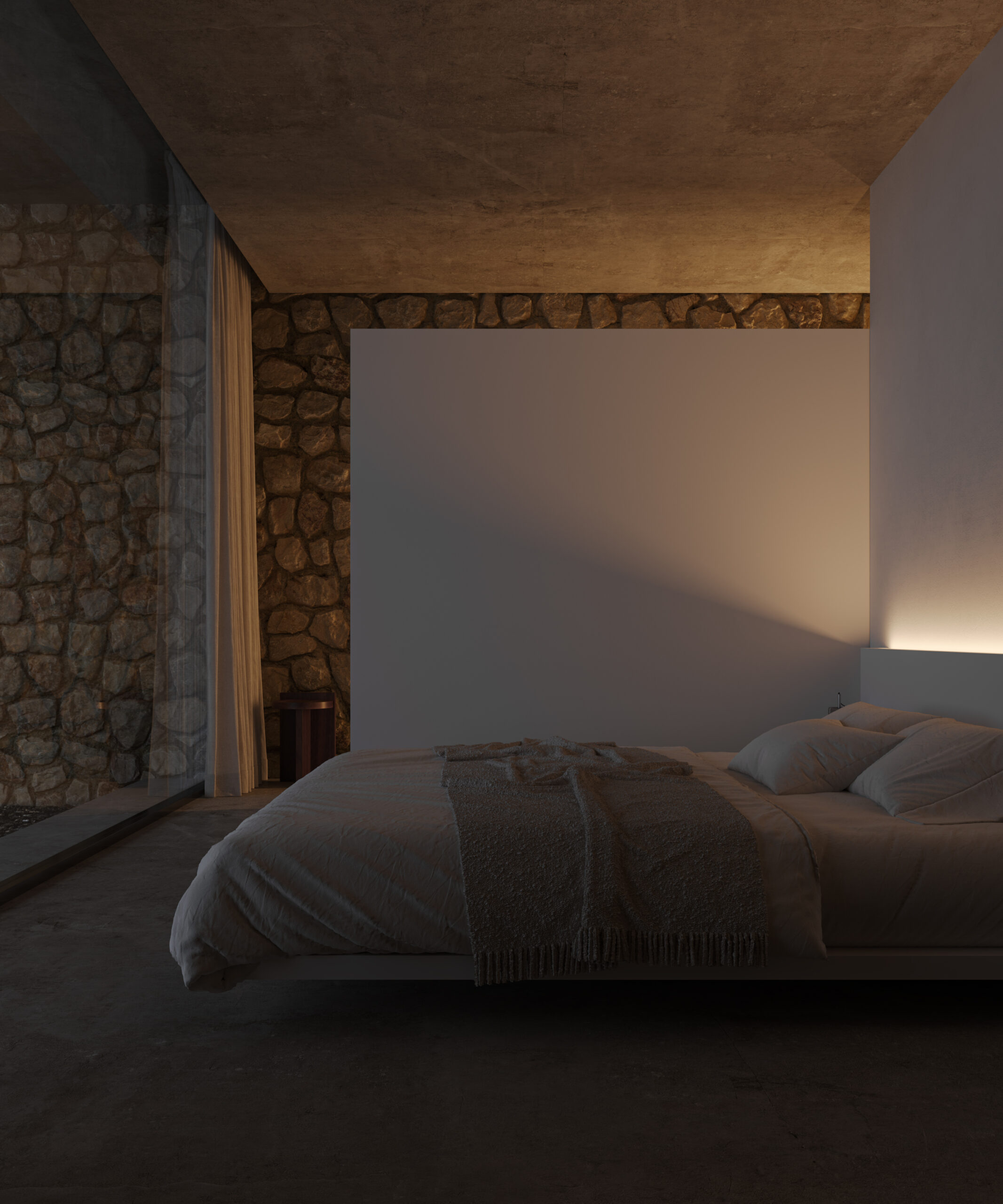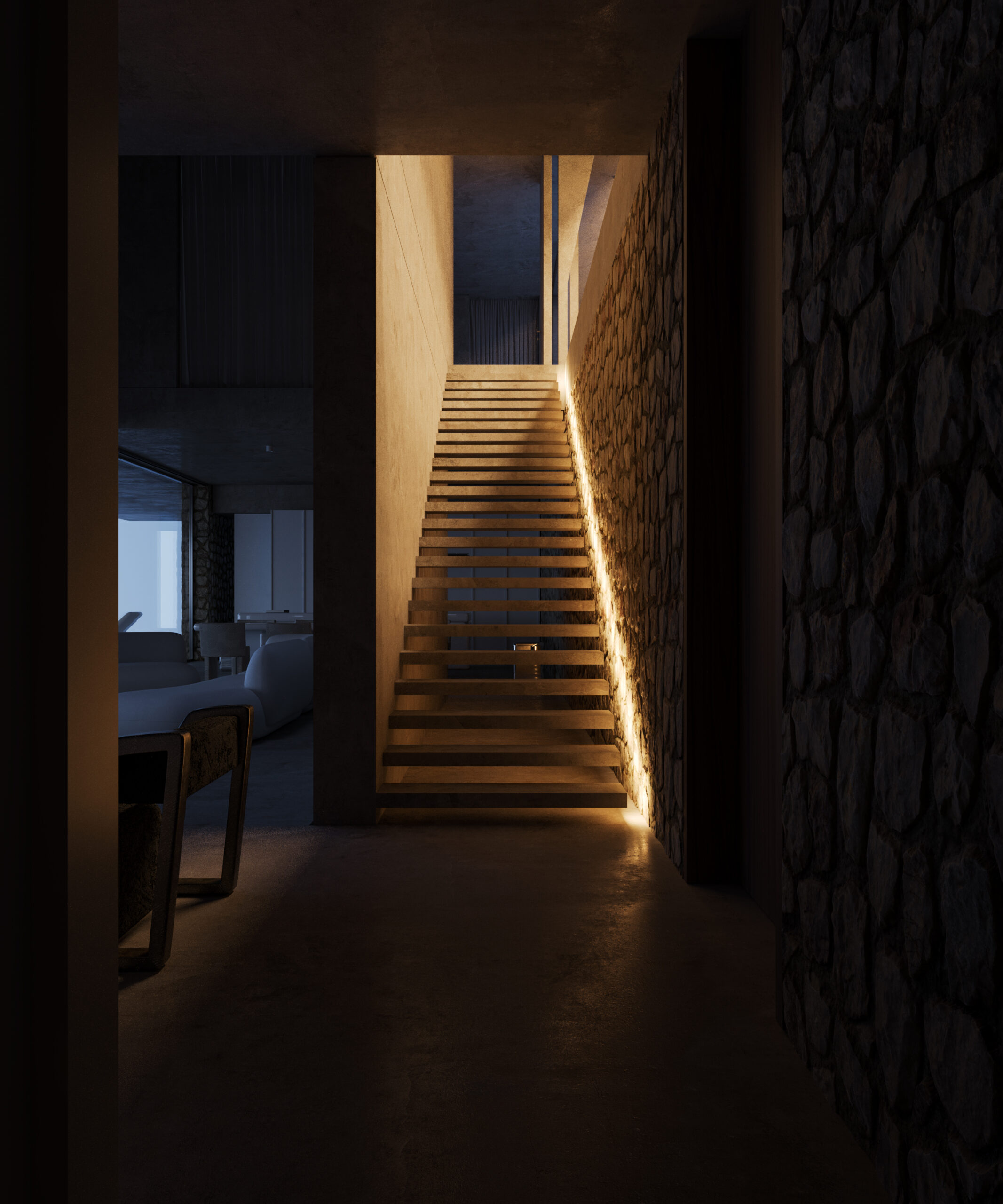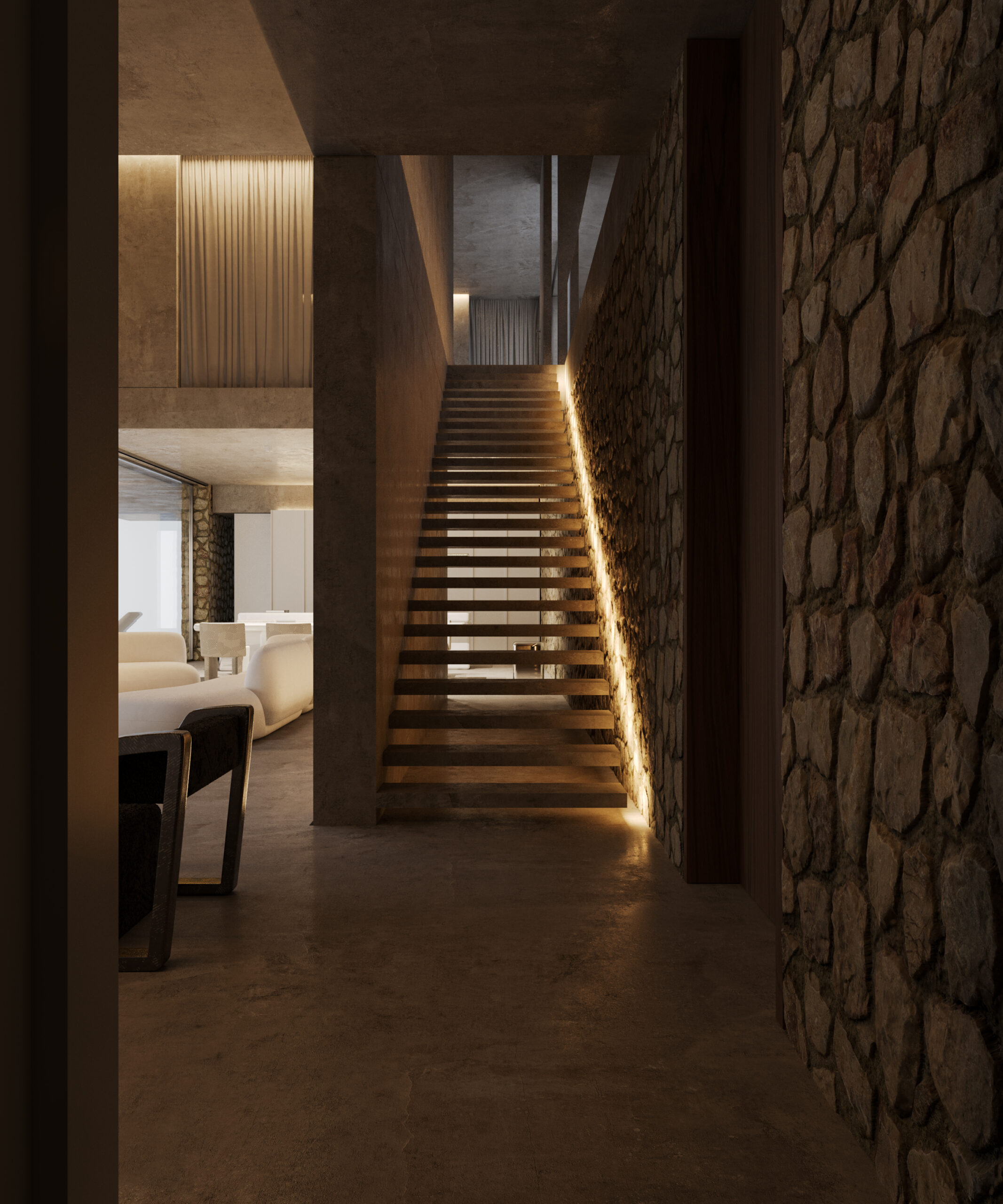 Функціонально будинок включає чотири спальні, простору спільну зону, бібліотеку та відкриту терасу з краєвидом на океан і гірський ландшафт. Усі рішення — від планування до вибору матеріалів — підпорядковані головному принципу: повазі до місця та його візуальної ідентичності.