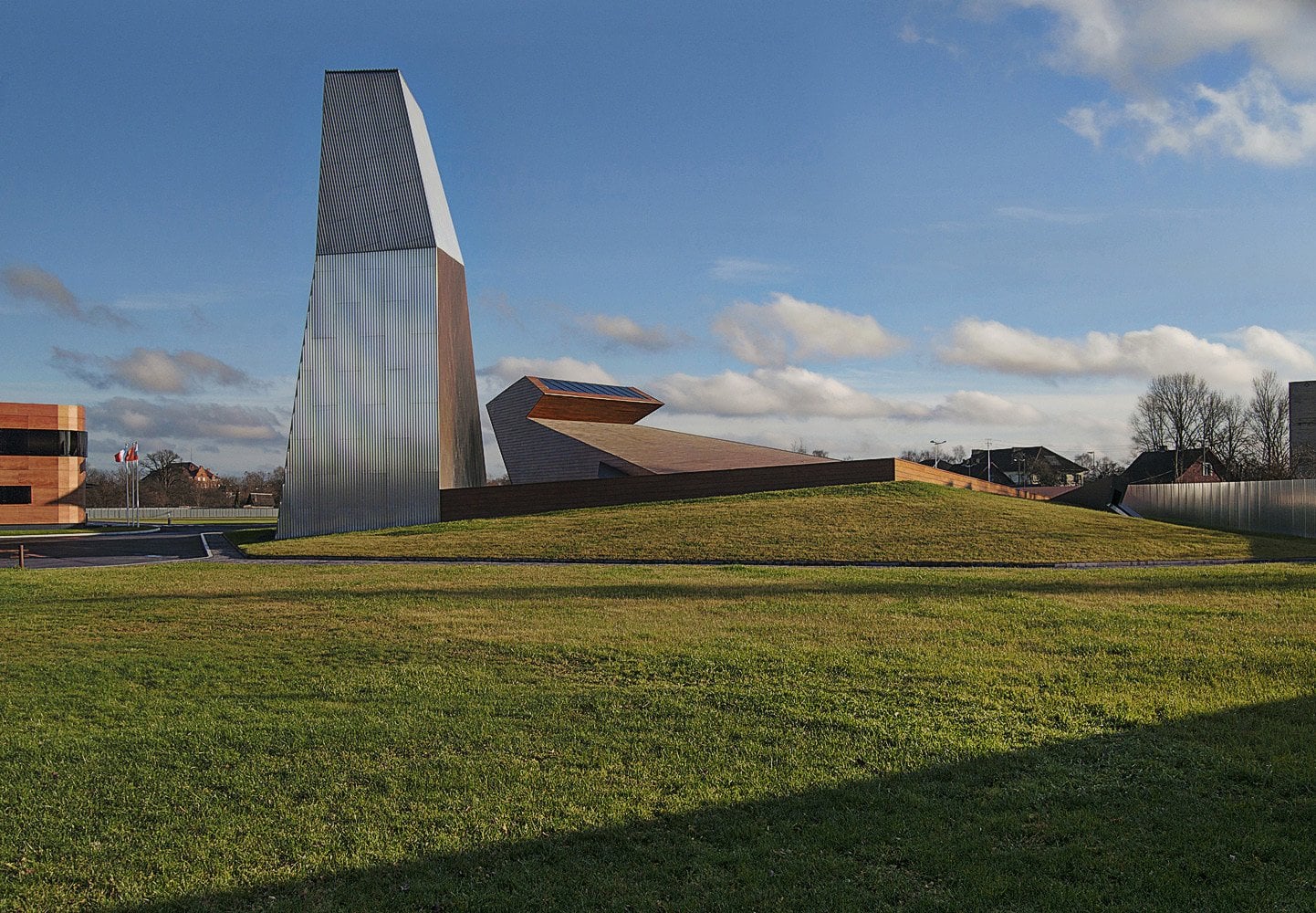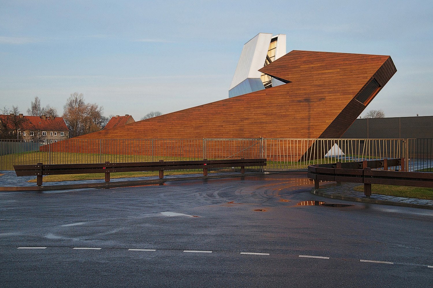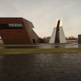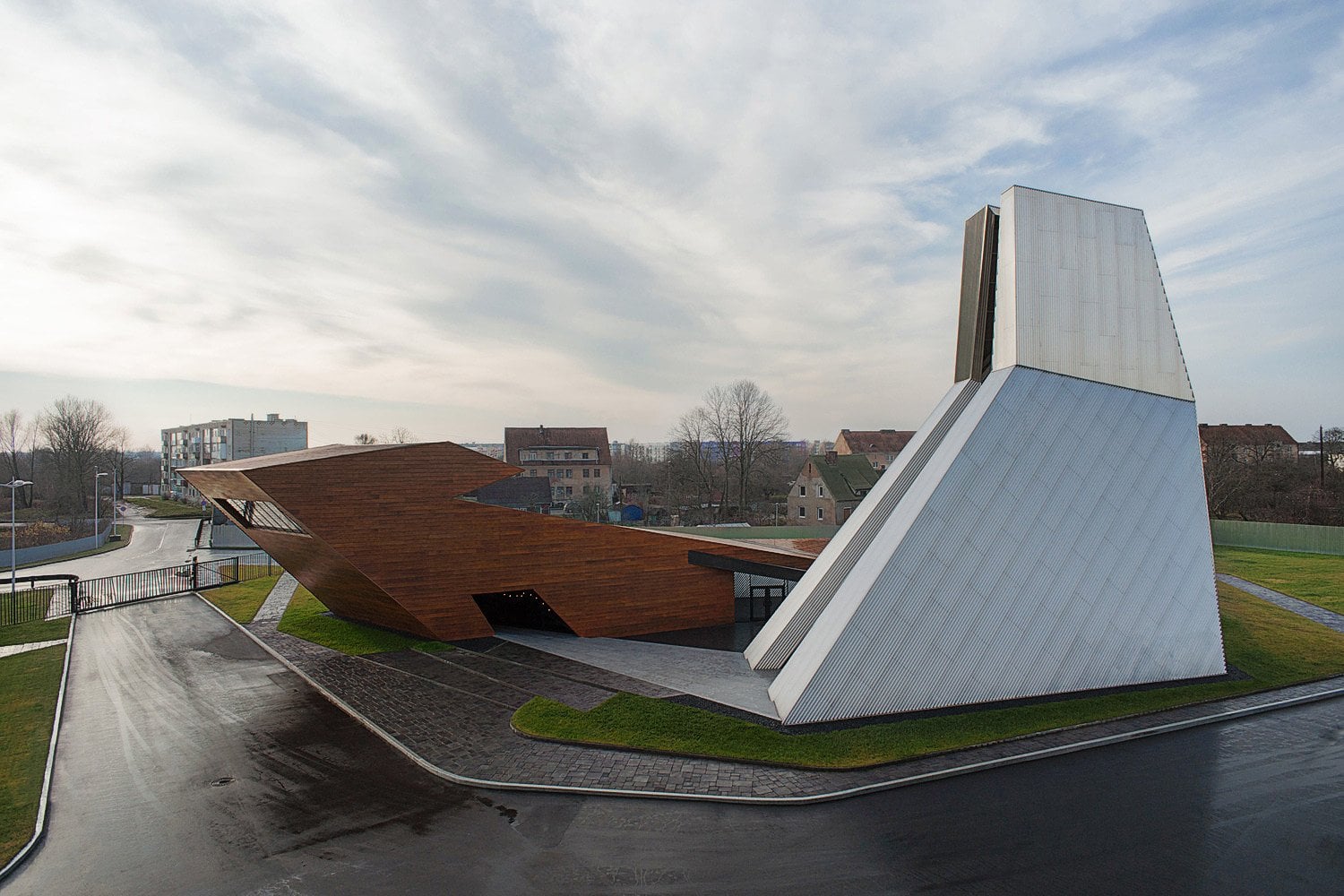 Черняховск был серьезно поврежден во время Второй мировой войны, поэтому здание самого завода, где изготавливается бренди, было построено на пустом участке рядом с железной дорогой. Изначально задача состояла в том, чтобы построить склад, который помимо своей основной функции служил бы еще и общественным пространством для проведения презентаций и мероприятий. Этот объект должен был демонстрировать важную роль винокуренного завода в жизни небольшого города. Благодаря детальной проработке проекта задача свелась к созданию очень символического архитектурного ансамбля.