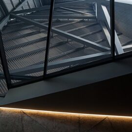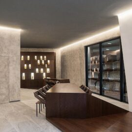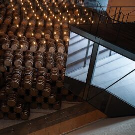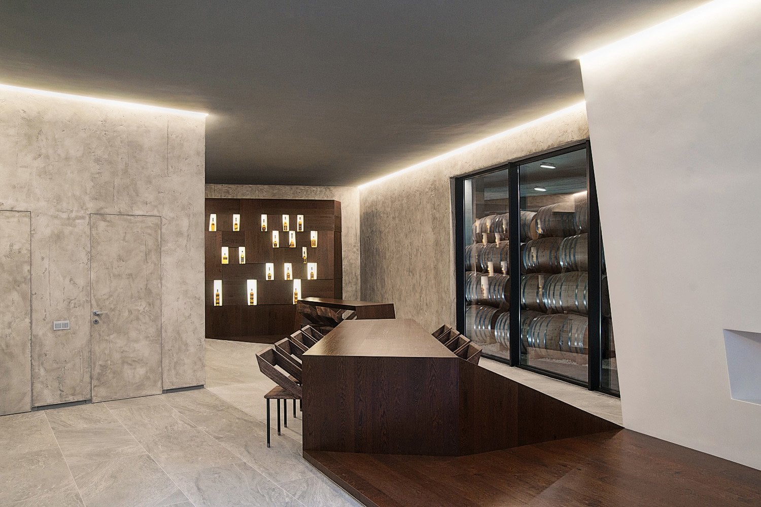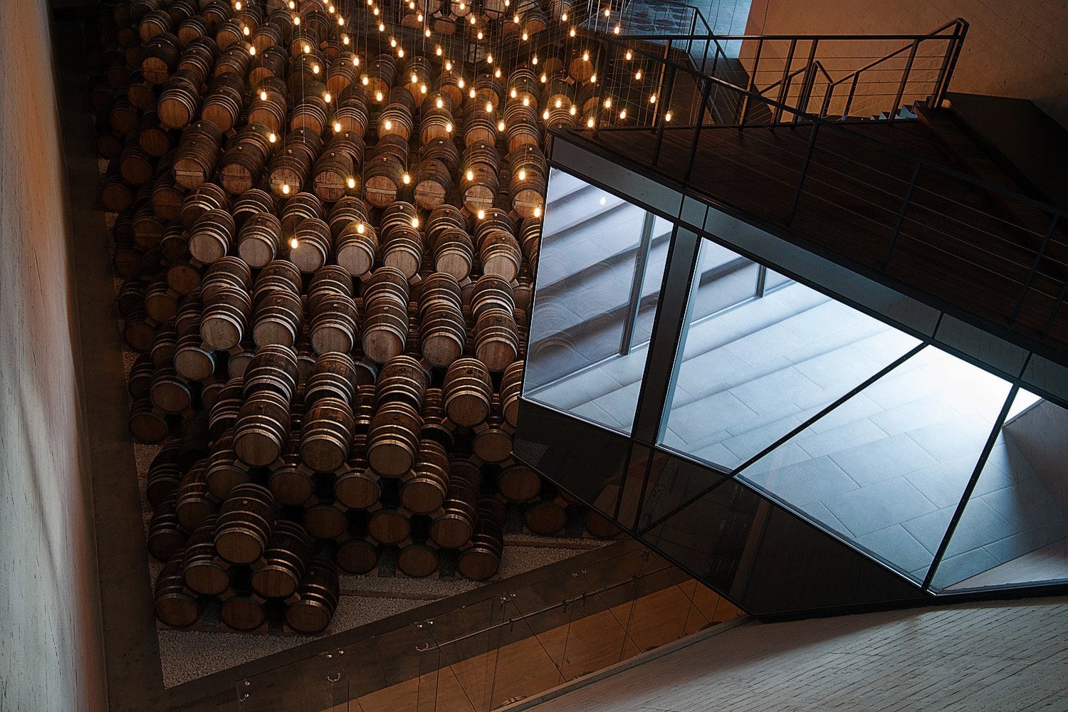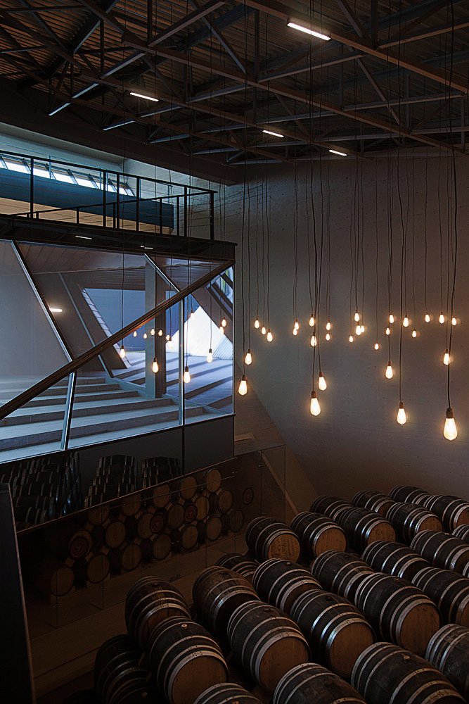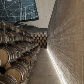 Интерьер представляет собой лаконичное пространство с простыми линиями, подчеркивающими функции склада. Декоративными элементами здесь являются бочки с бренди, расставленные стройными рядами, задающими помещению ритм.