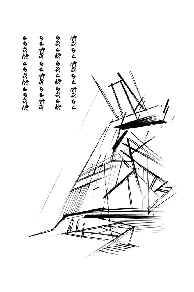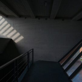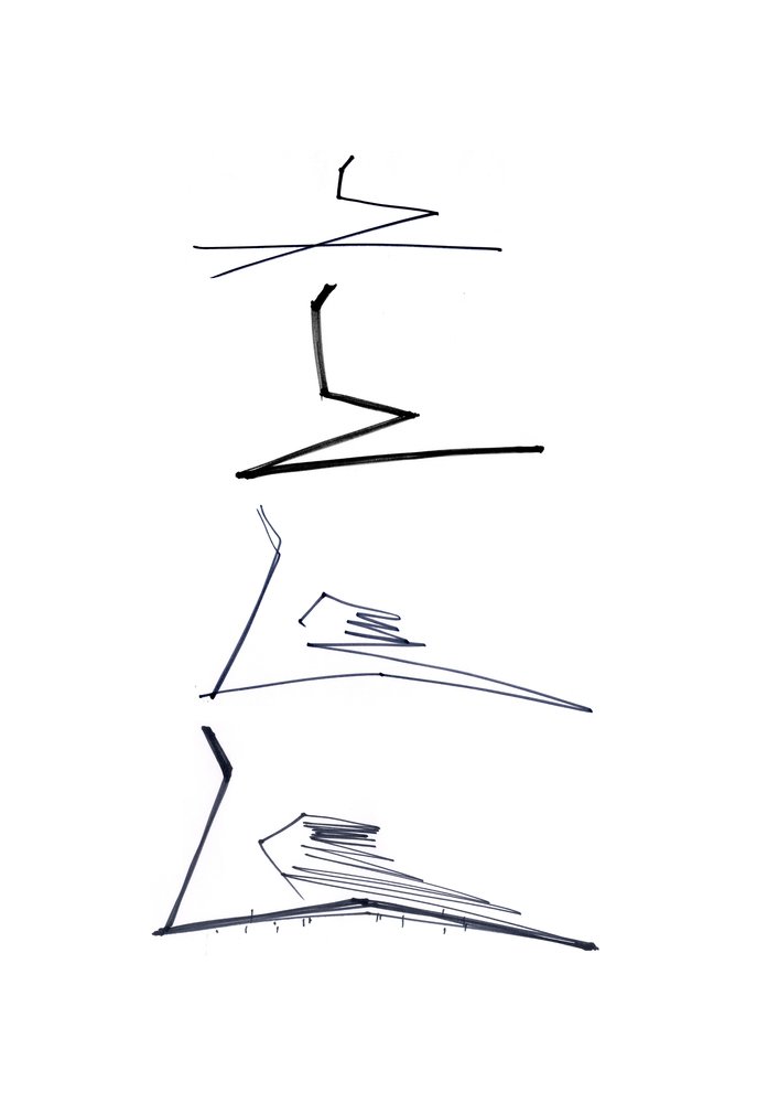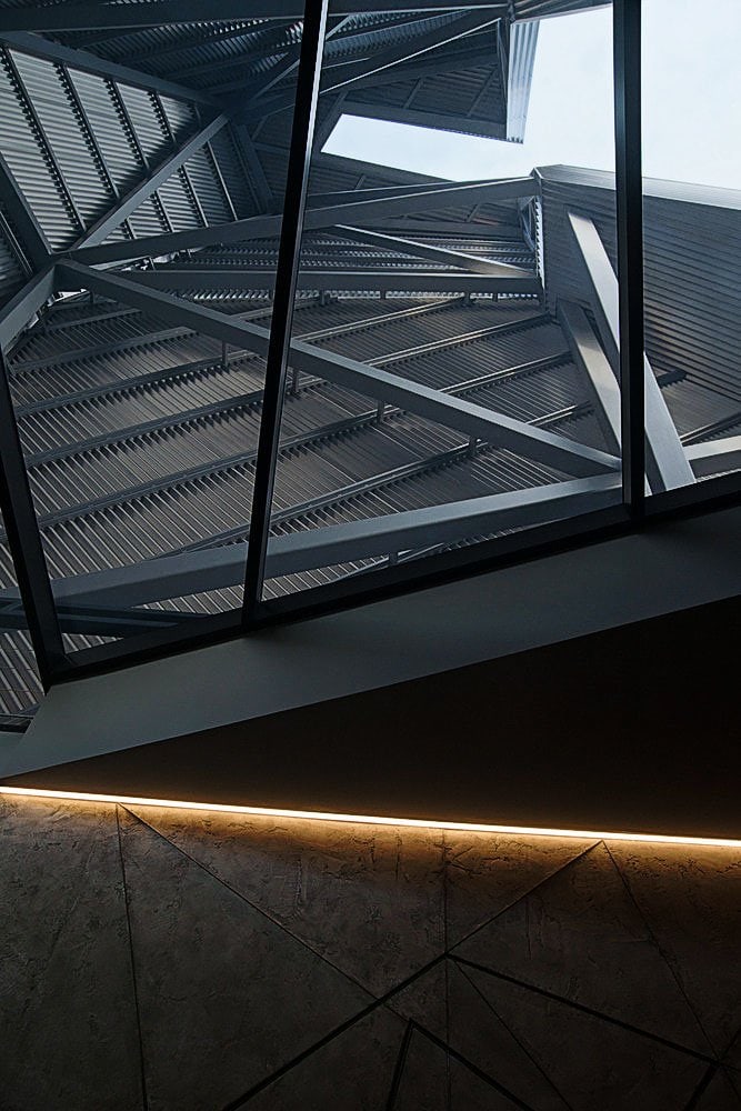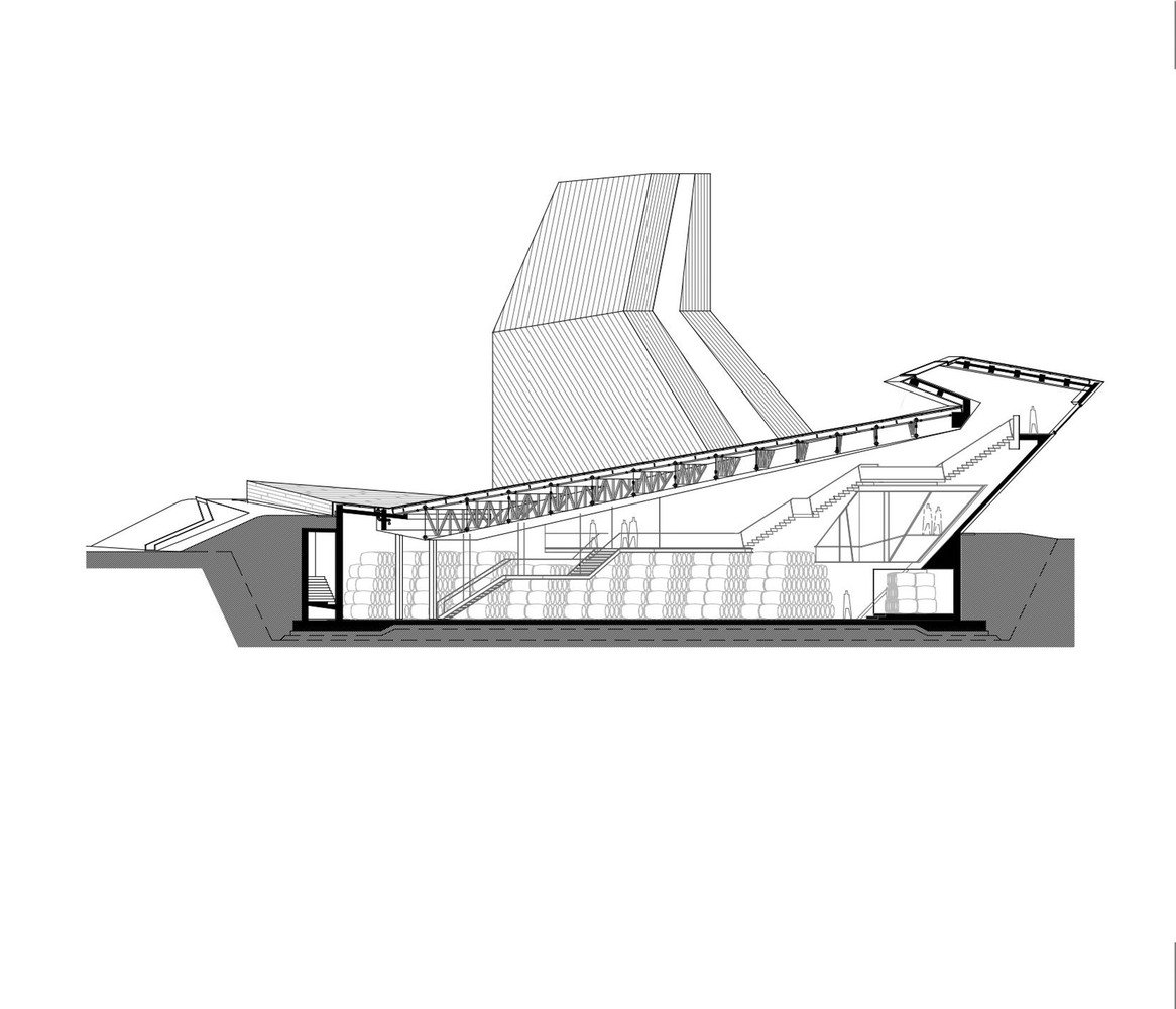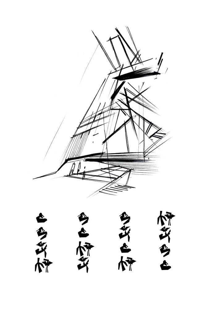Низкое деревянное здание, служащее складом, вызывает образ Земли, которая «порождает новую жизнь». Оно плотно привязано к поверхности, как будто вырастая из нее и визуально защищает комплекс. Это знак Инь, глубокий, низкий, внутренний, женский. Высокий белый объём второго здания, отделанного металлическими панелями, как будто тянется к небу и читается, как нечто внешнее, мужское – знак Ян. Он приоткрыт и в его нижнюю часть проникает лестница, как продолжение внешней площадки из светлого камня, тянущейся от входа здания, отделанного деревом.