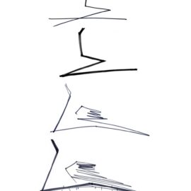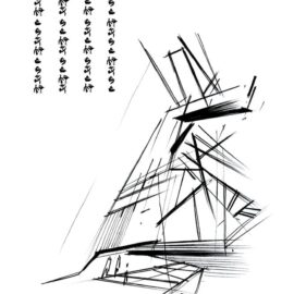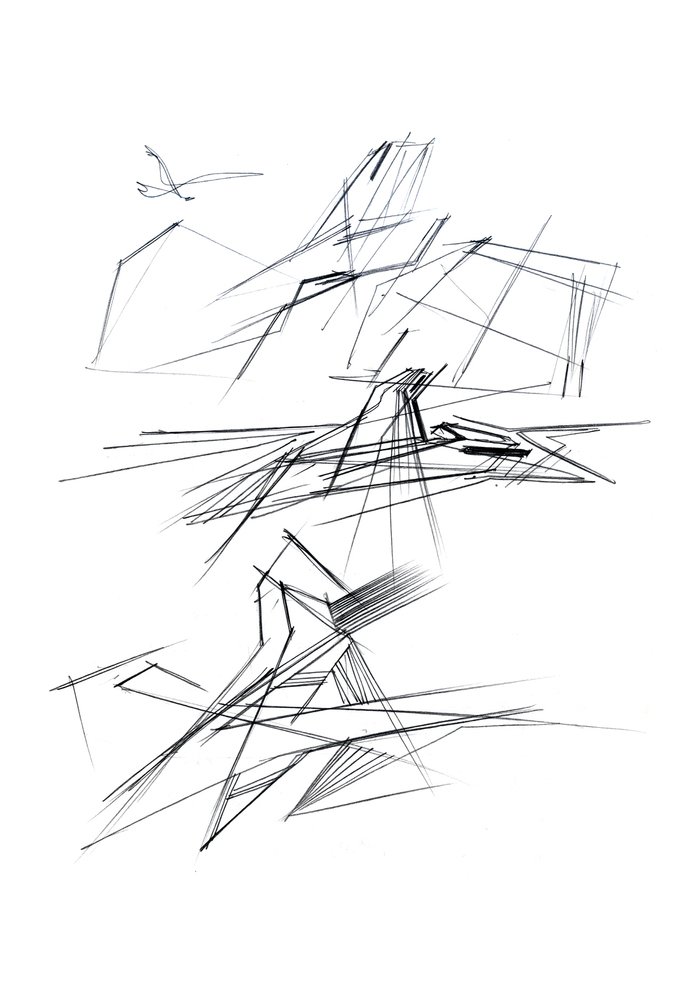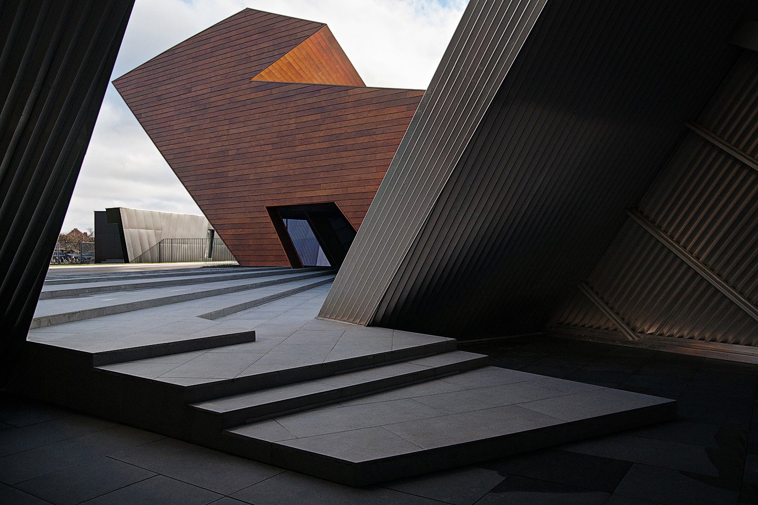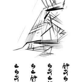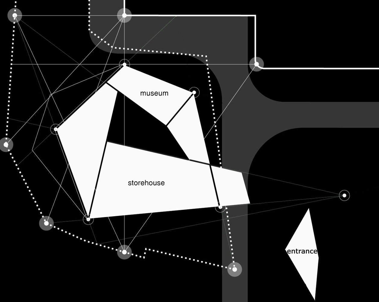 Низкое деревянное здание, служащее складом, вызывает образ Земли, которая «порождает новую жизнь». Оно плотно привязано к поверхности, как будто вырастая из нее и визуально защищает комплекс. Это знак Инь, глубокий, низкий, внутренний, женский. Высокий белый объём второго здания, отделанного металлическими панелями, как будто тянется к небу и читается, как нечто внешнее, мужское – знак Ян. Он приоткрыт и в его нижнюю часть проникает лестница, как продолжение внешней площадки из светлого камня, тянущейся от входа здания, отделанного деревом.